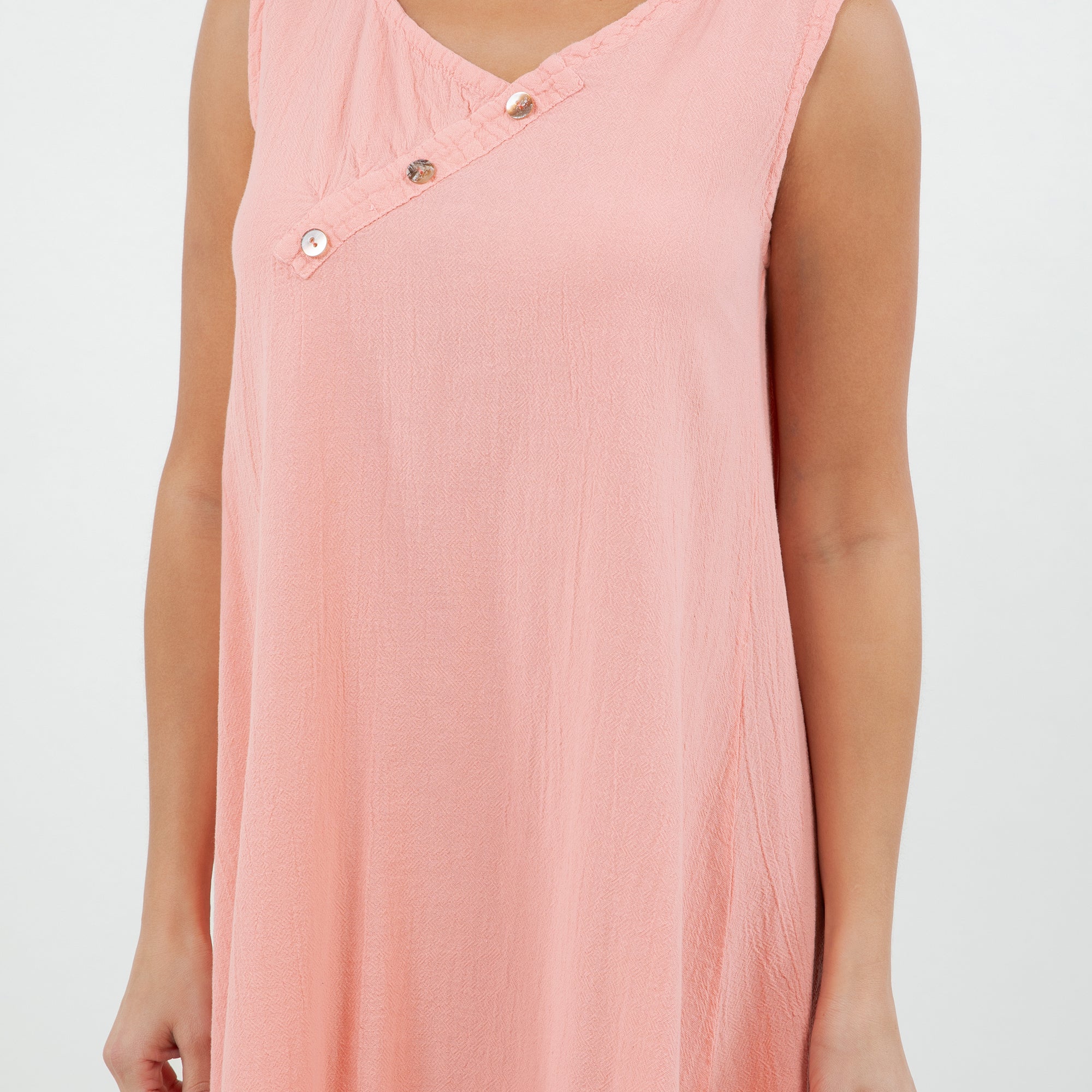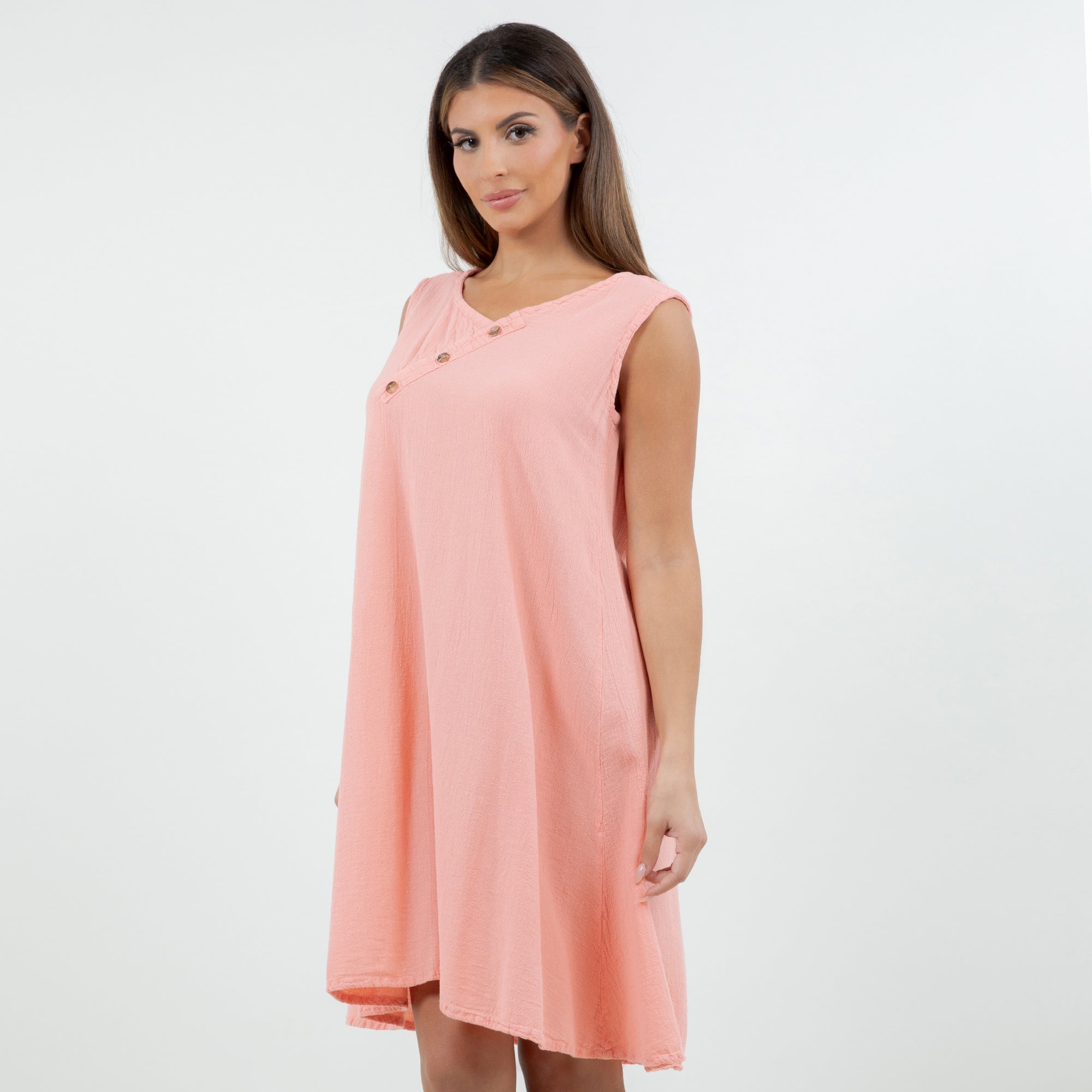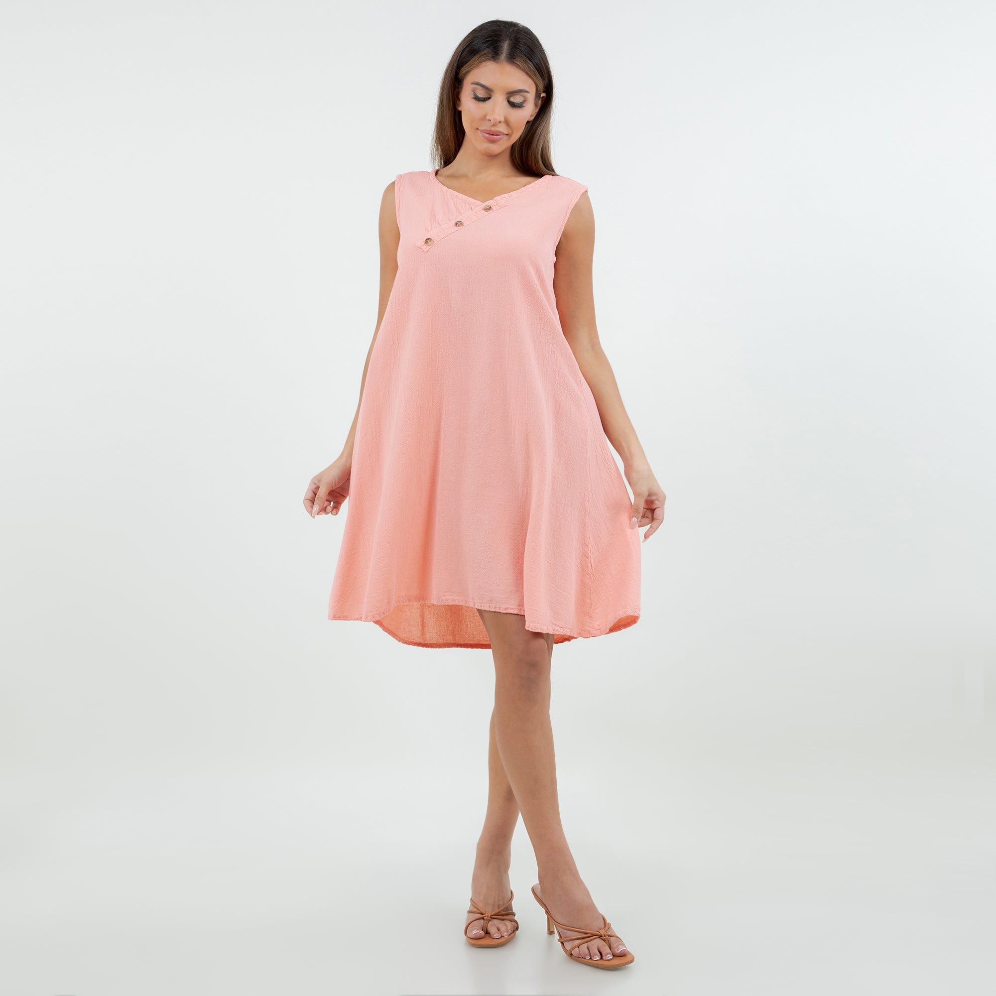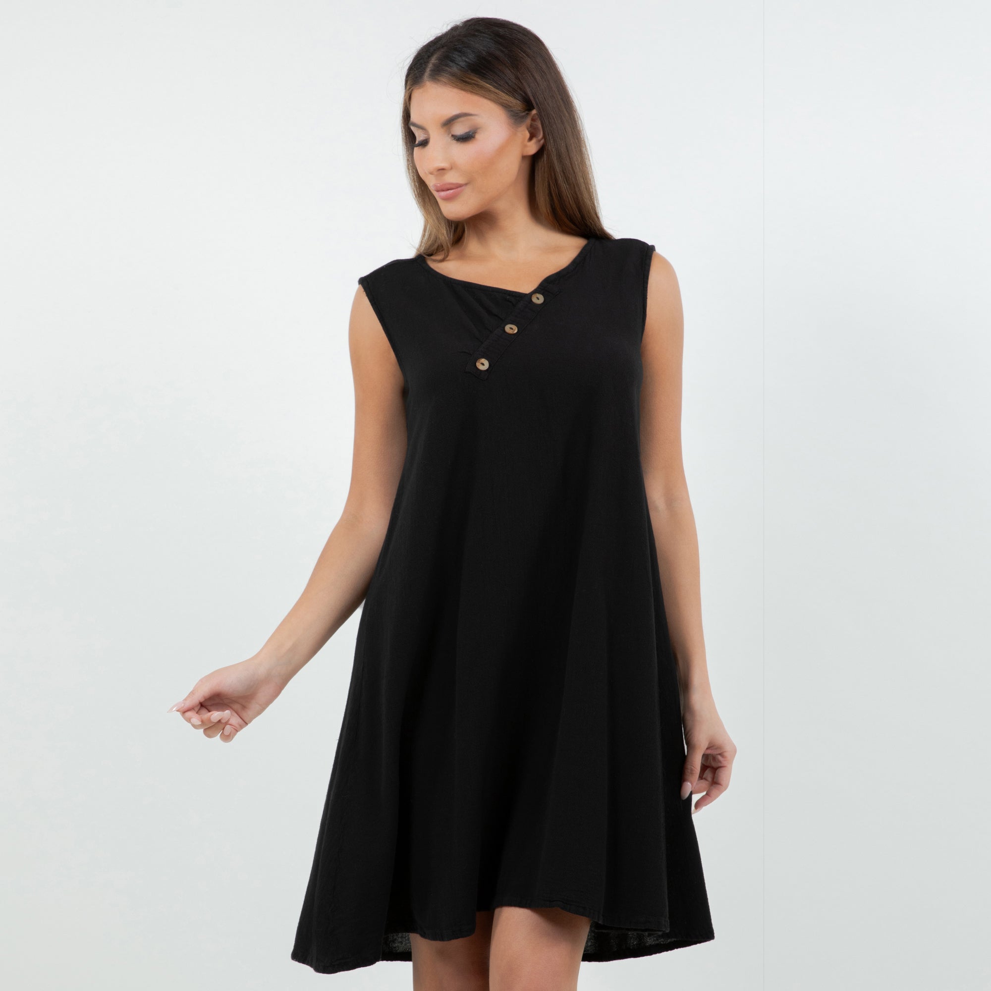 Beautiful sleeveless dress decorated with buttons on the v-neckline. Sophisticated and simple. Perfect to wear with sandals during the day or with heels for a night out.