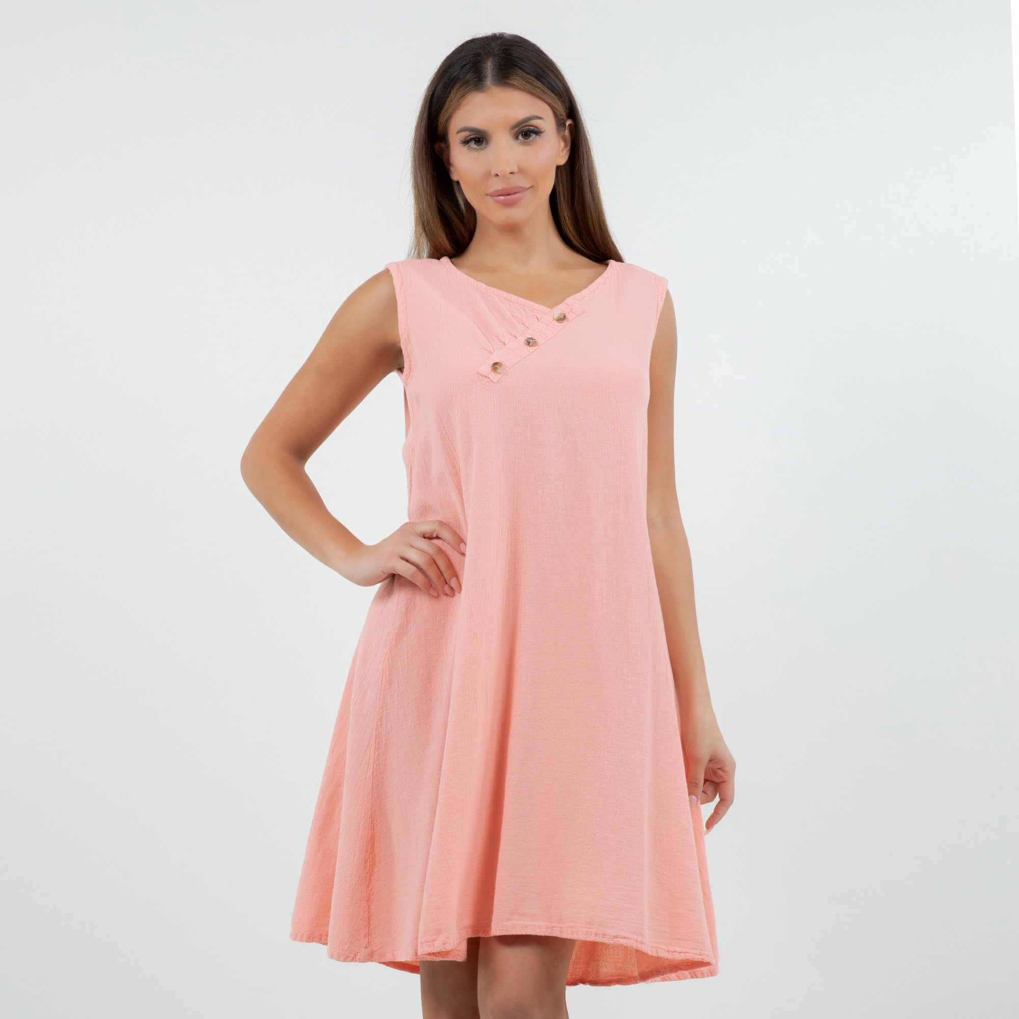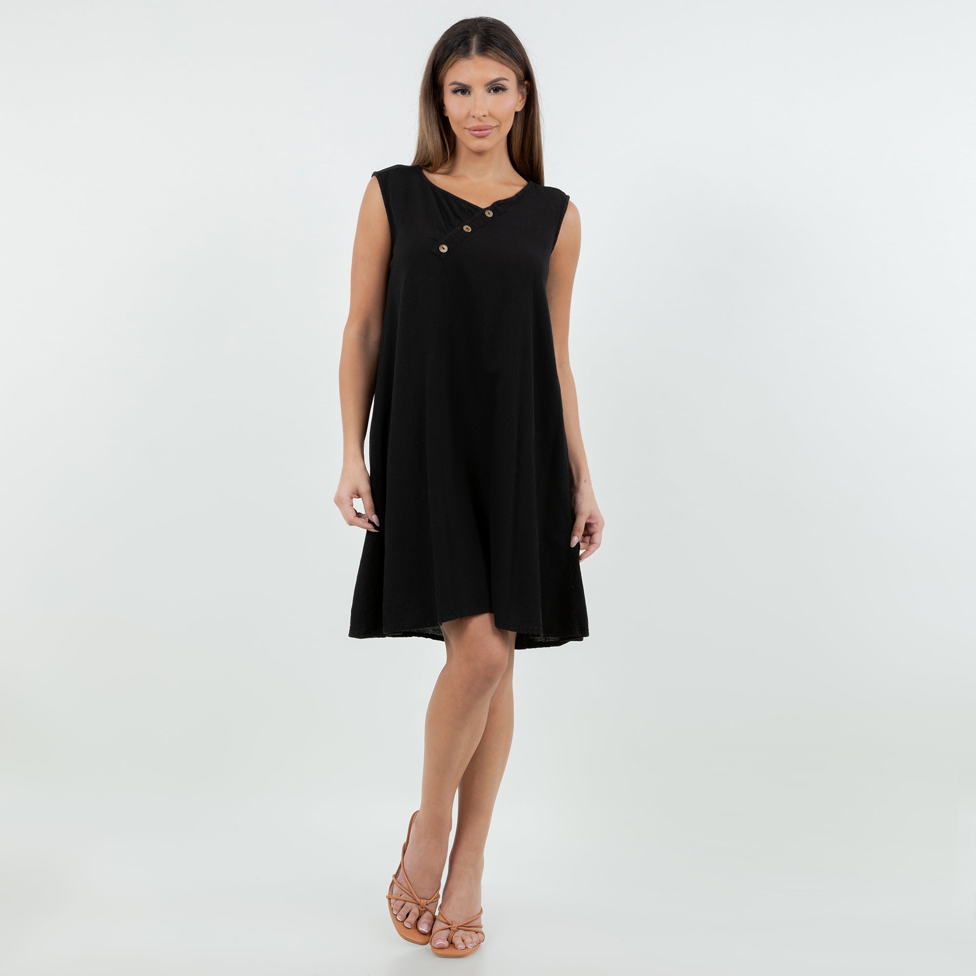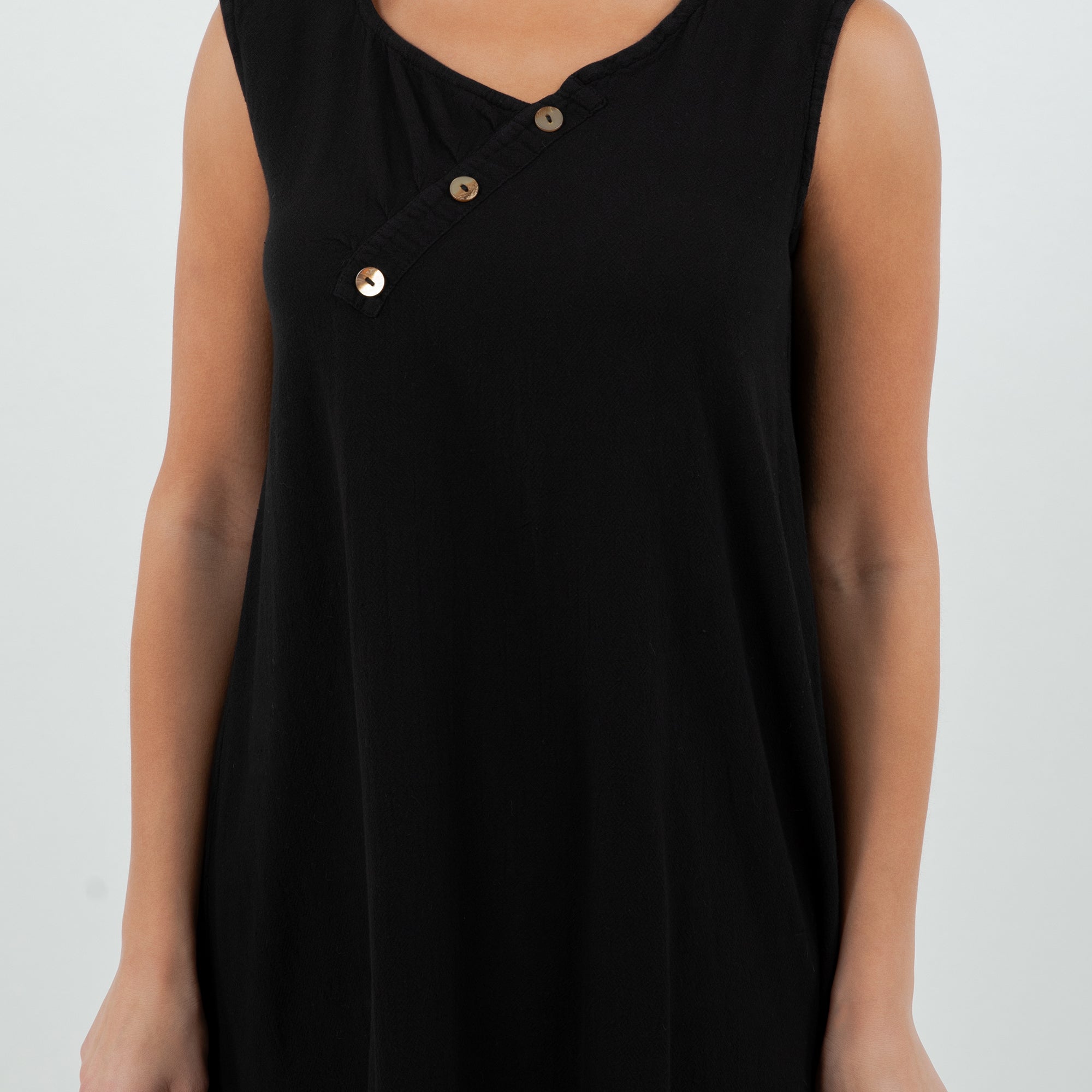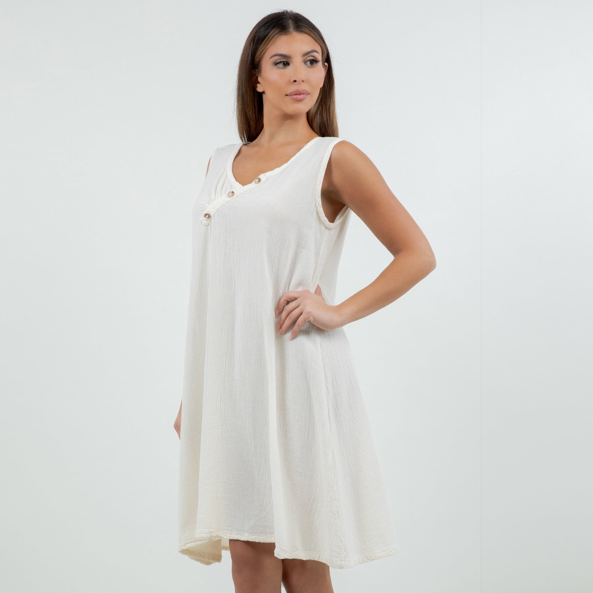 Beautiful sleeveless dress decorated with buttons on the v-neckline. Sophisticated and simple. Perfect to wear with sandals during the day or with heels for a night out.