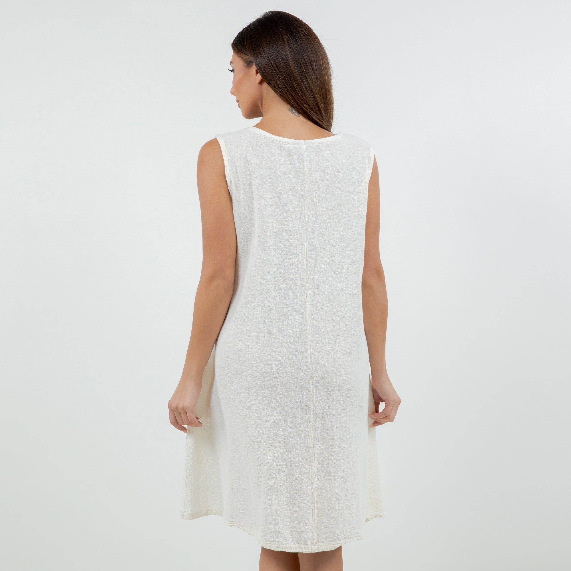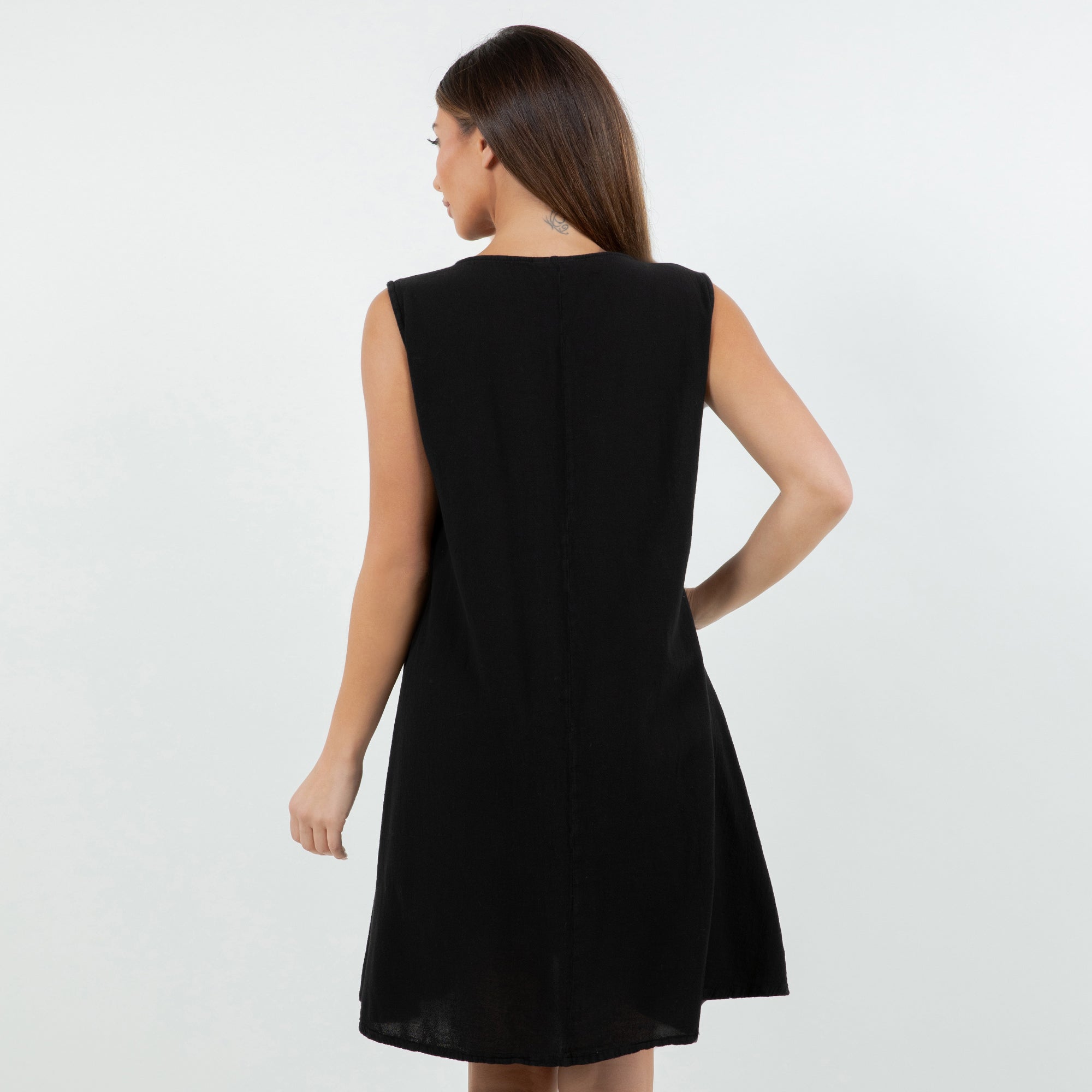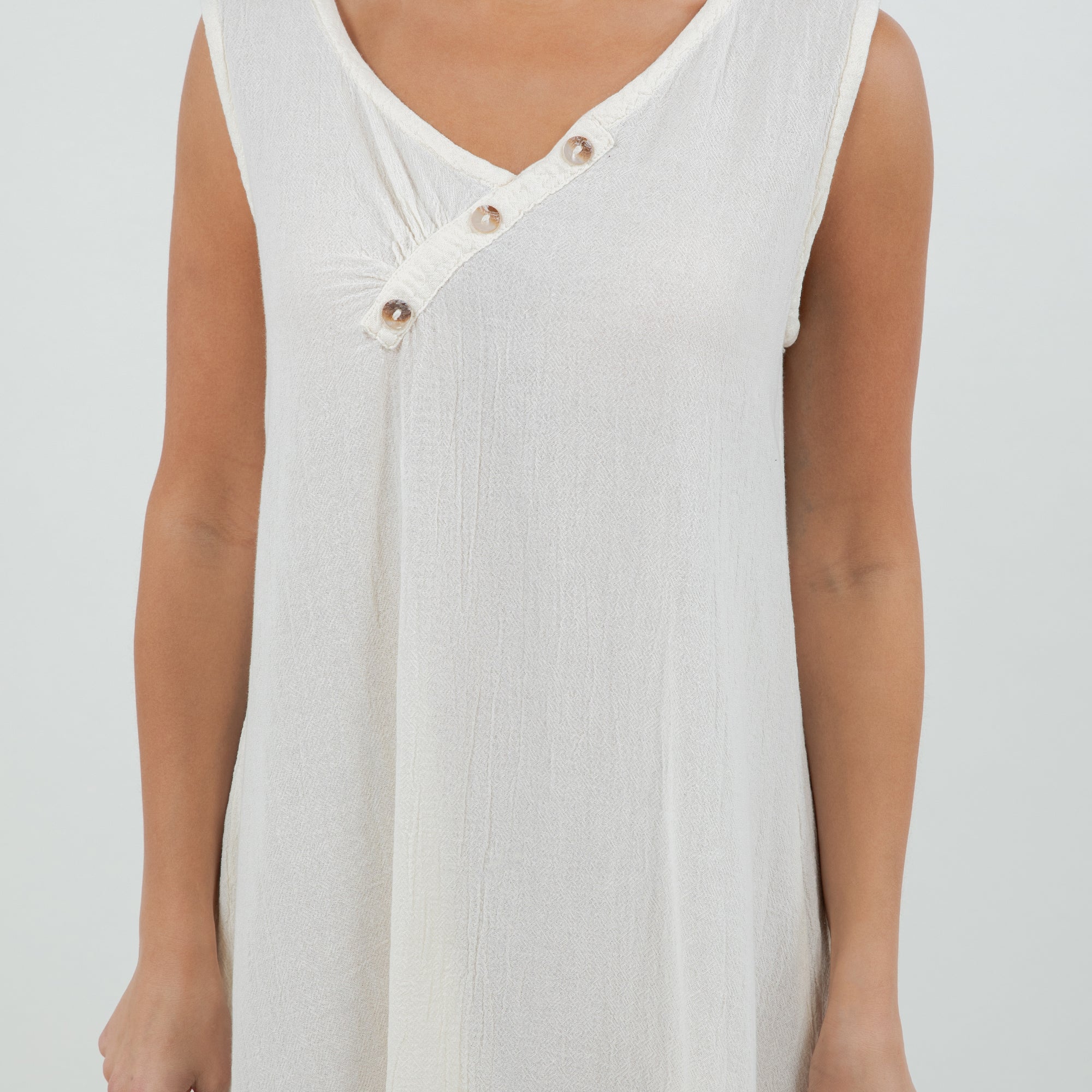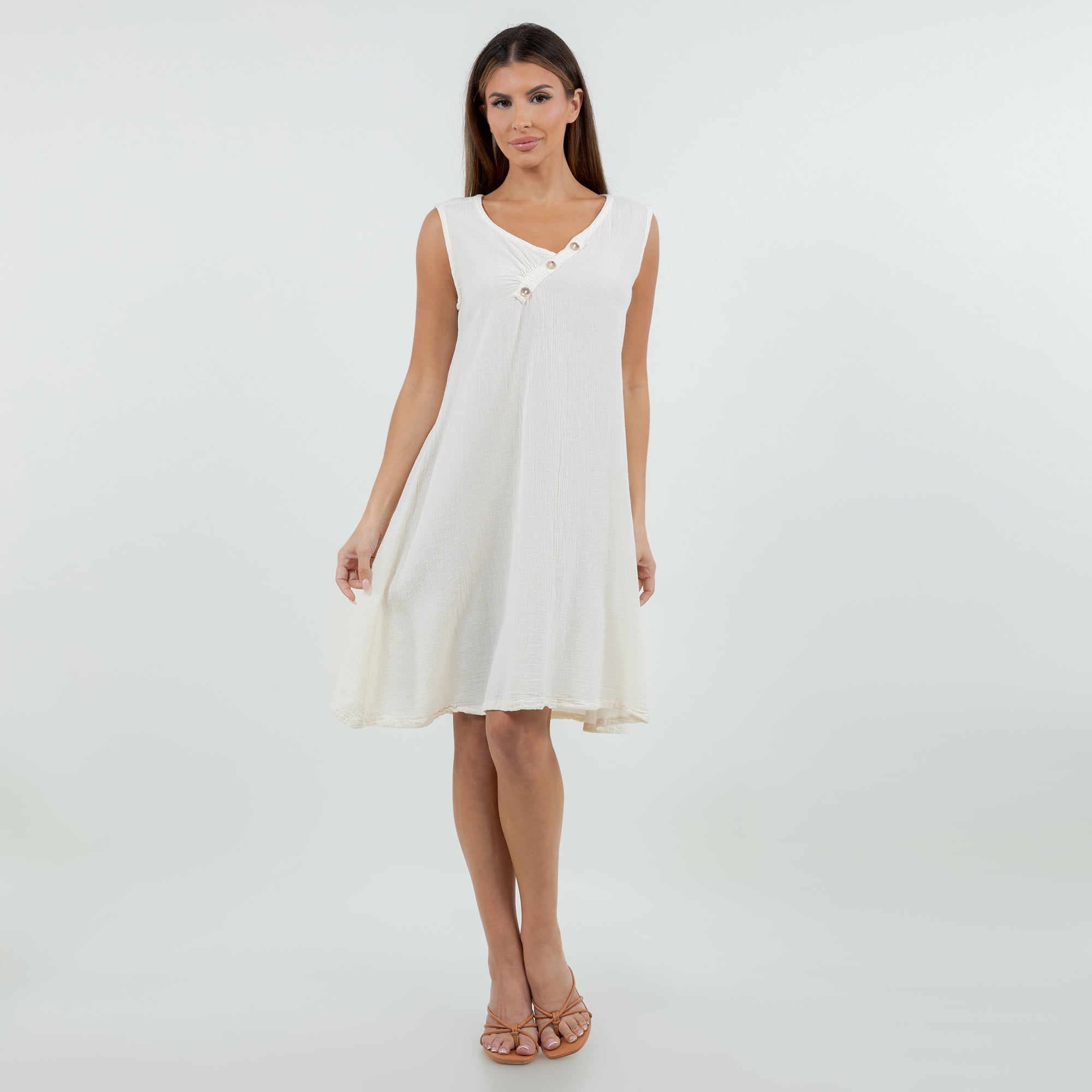 Beautiful sleeveless dress decorated with buttons on the v-neckline. Sophisticated and simple. Perfect to wear with sandals during the day or with heels for a night out.