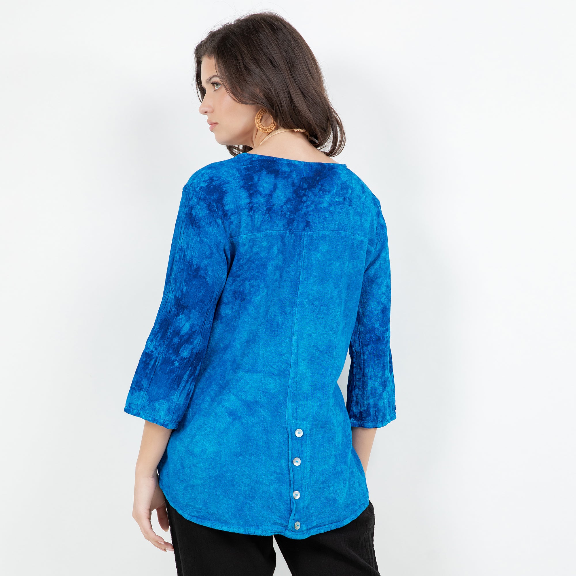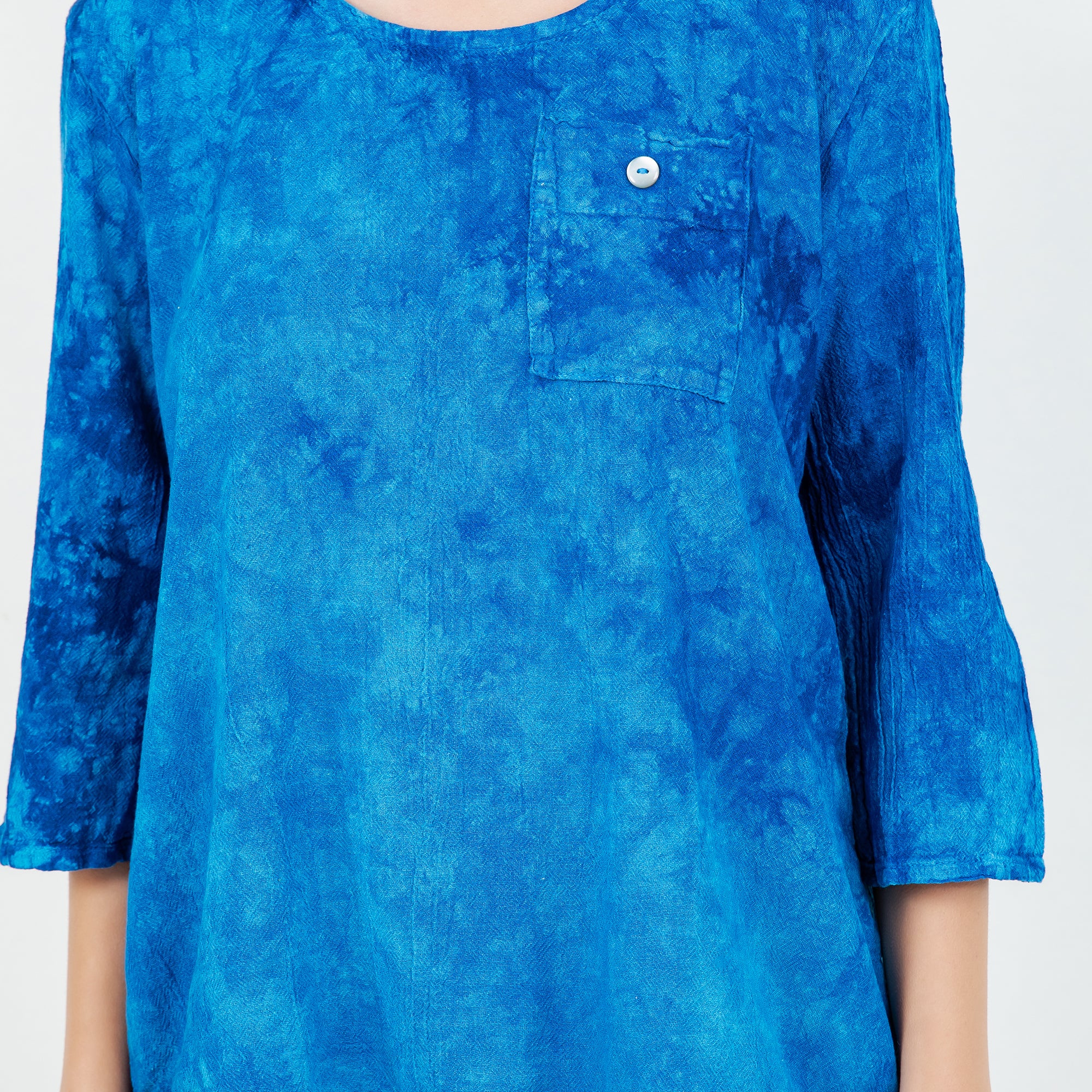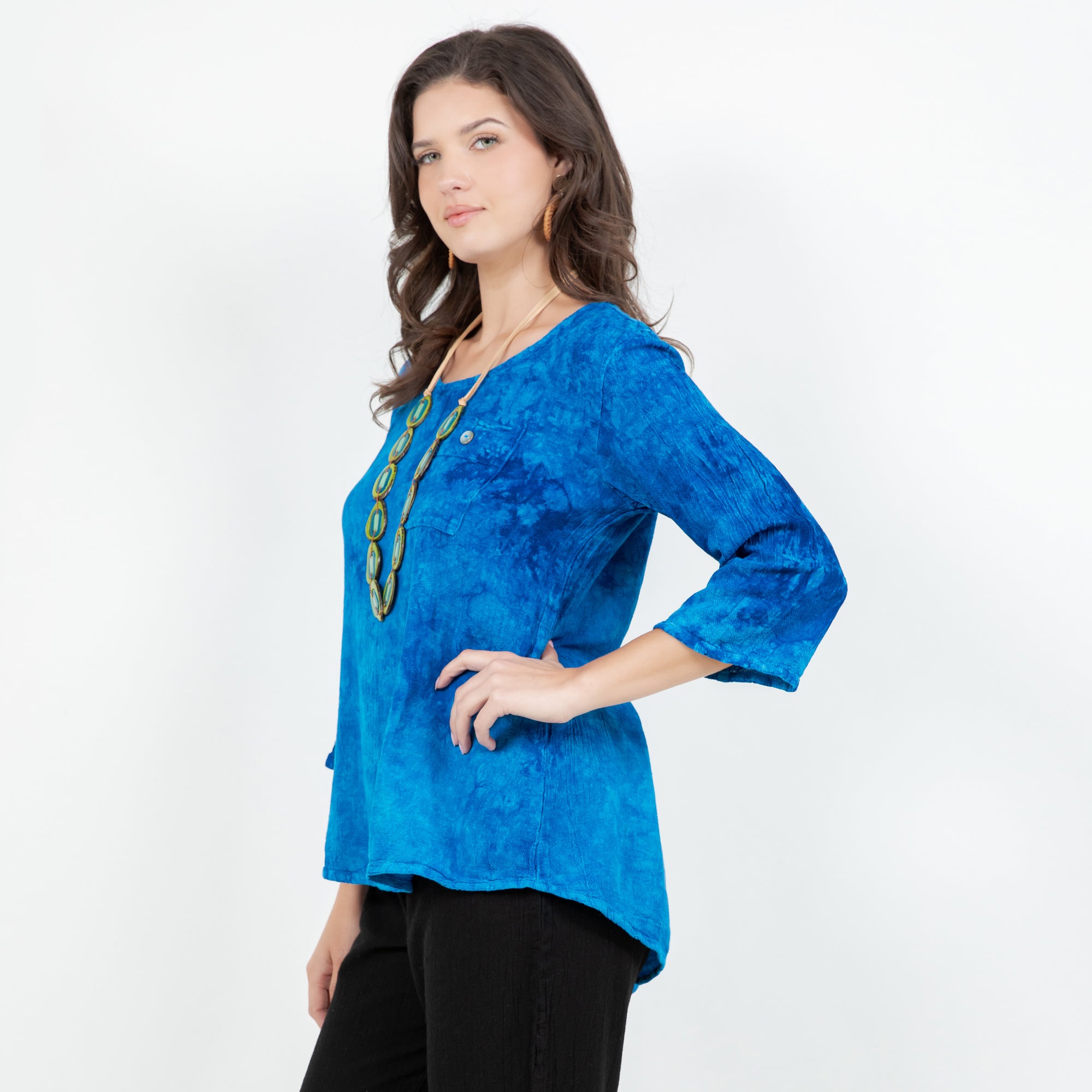 A 3/4 sleeve lightly scoop tuxedo tail top. Leah features a buttoned chest pocket, as well as a drop length back with 4 vertical accent buttons down the bottom center.