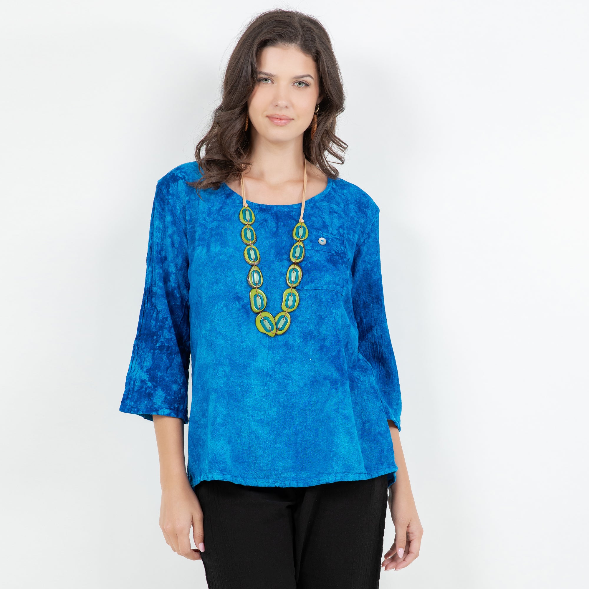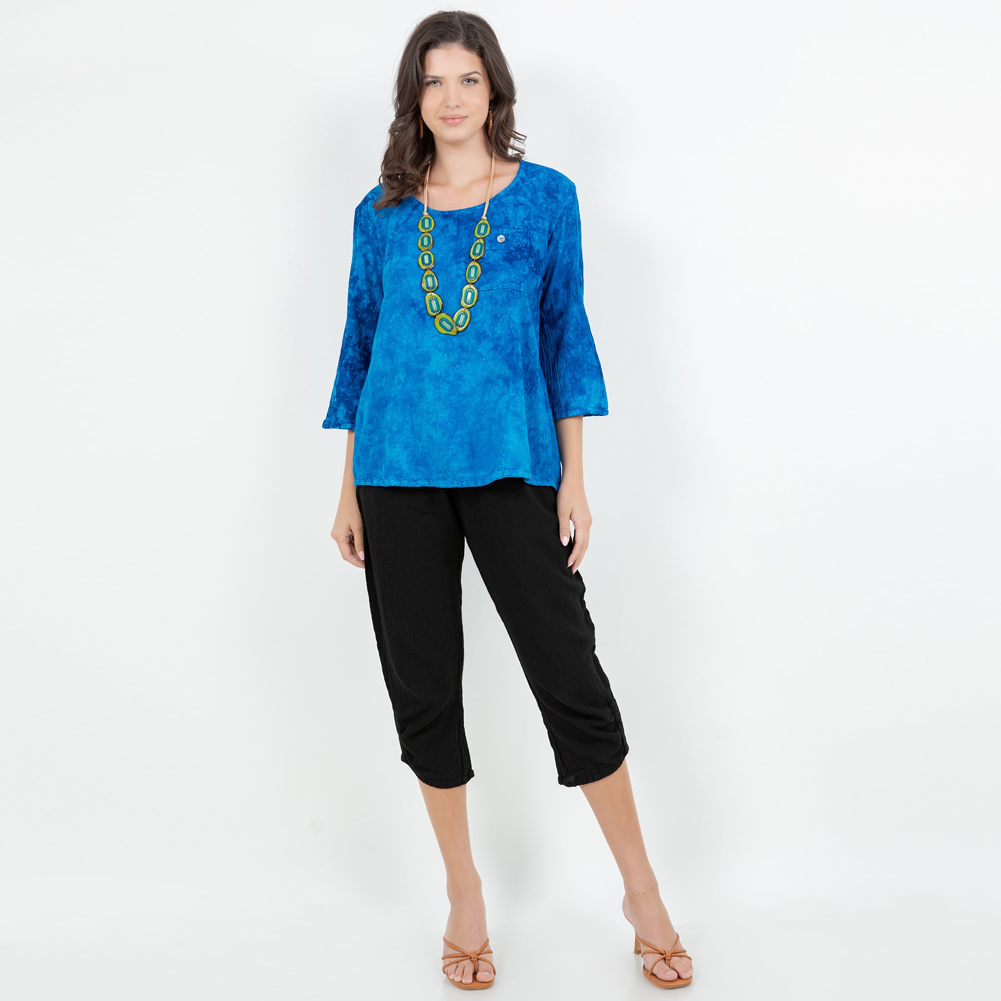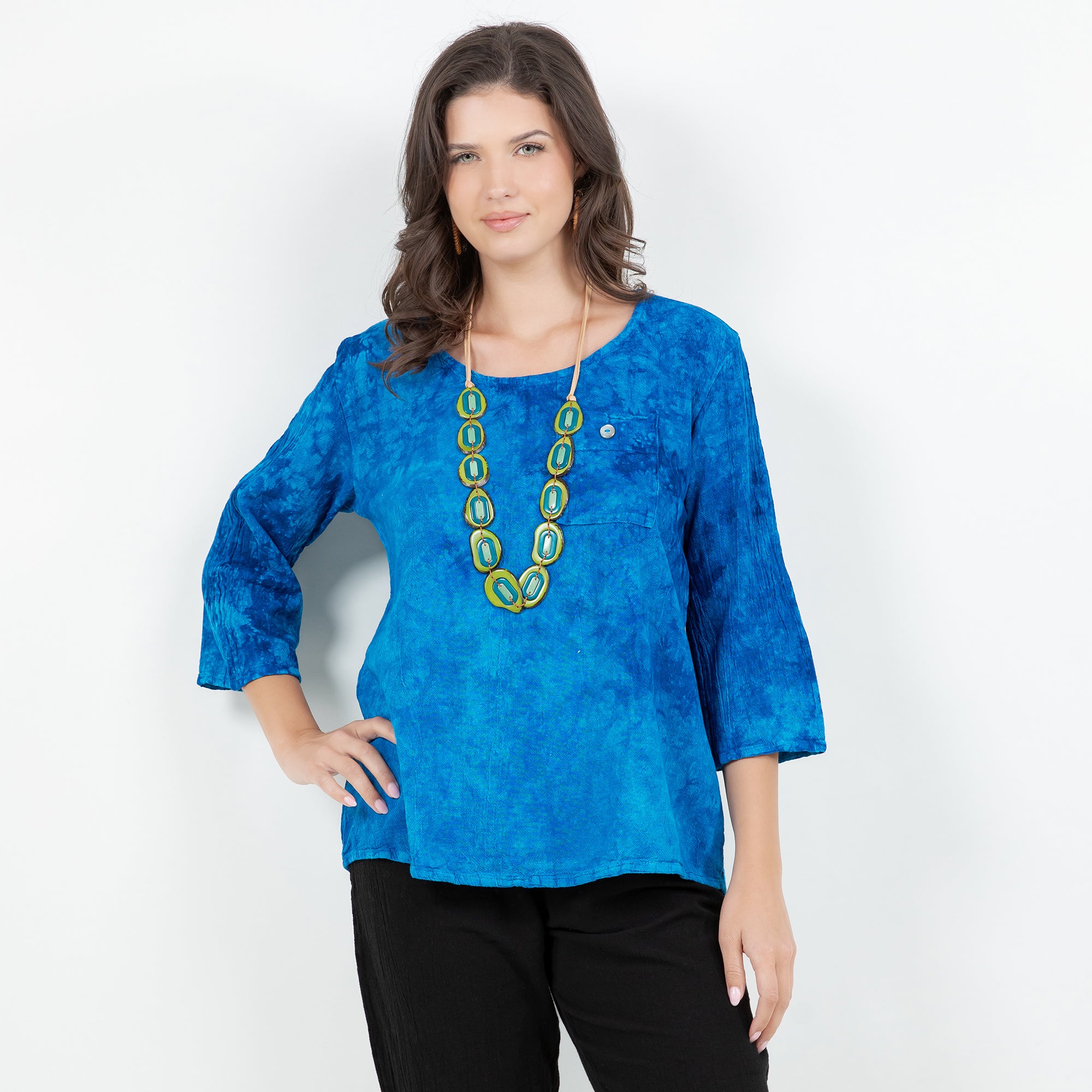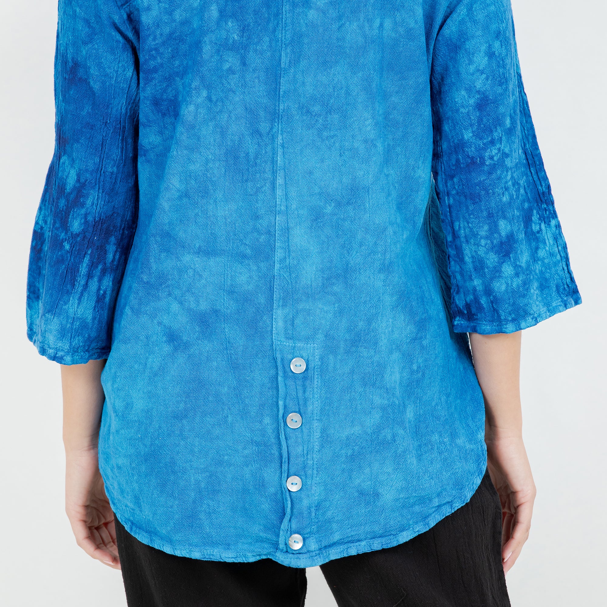A 3/4 sleeve lightly scoop tuxedo tail top. Leah features a buttoned chest pocket, as well as a drop length back with 4 vertical accent buttons down the bottom center.