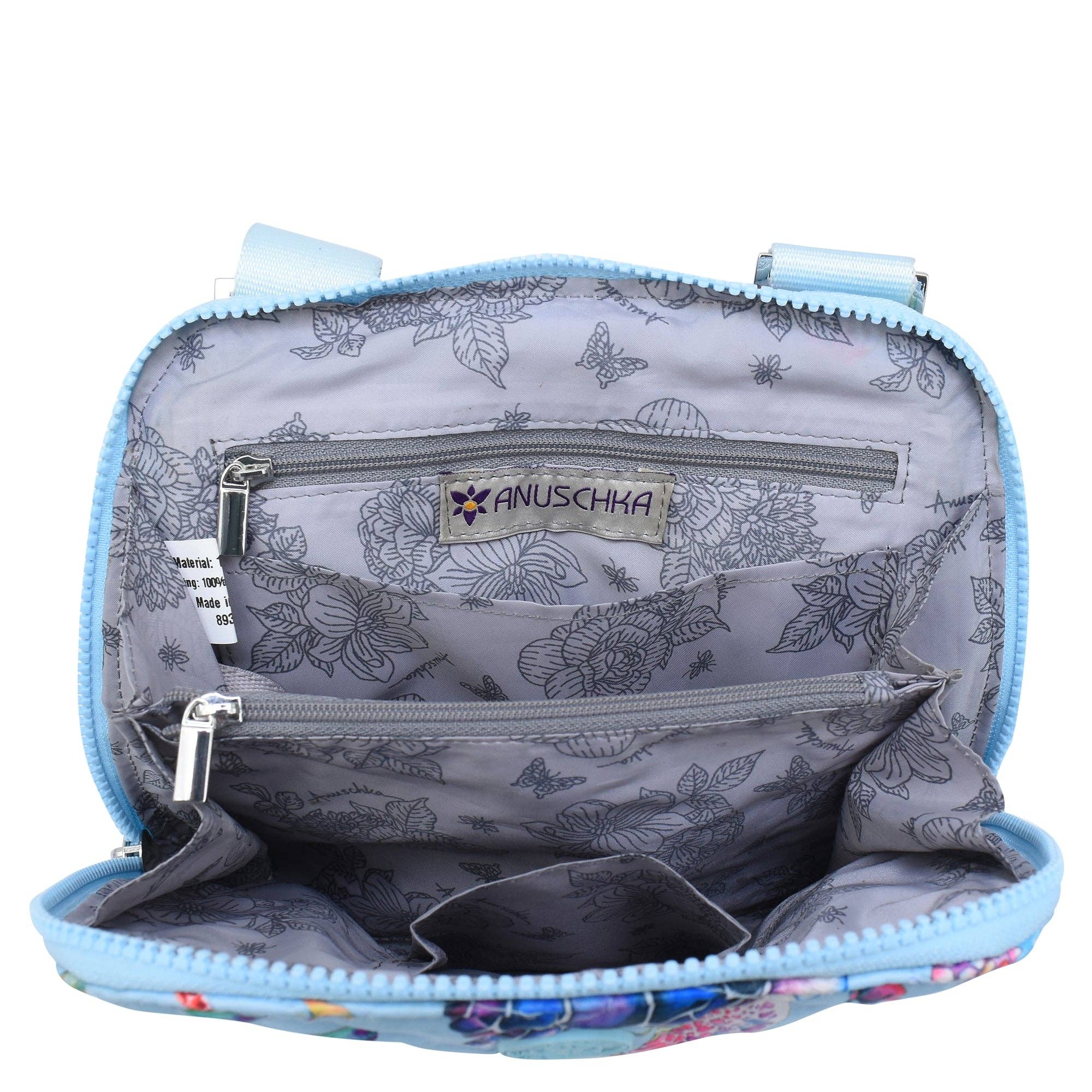 Inside one central zippered partition pocket, one zippered wall pocket and one cell pocket.