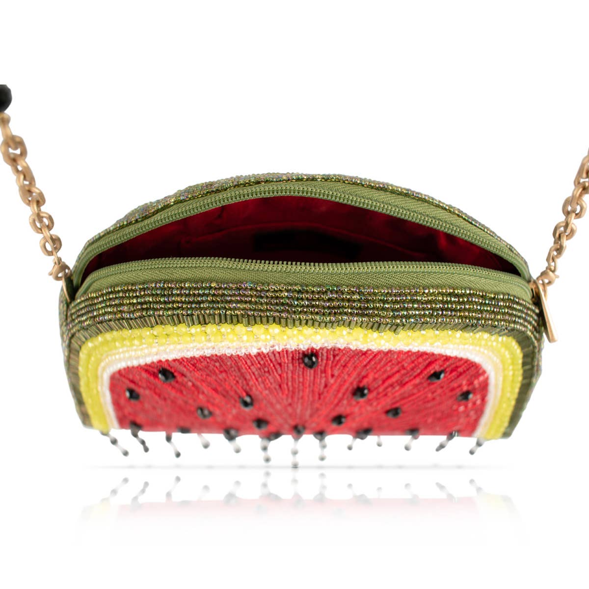 Sweet and delicious year round, this beaded watermelon bag adds a juicy pop of fun to any outfit. Designed with sparkling red beads, vibrant green trim, and playful dangling “seeds,” it also features a surprisingly roomy interior—this purse is perfect for carrying all your essentials with fresh, fruity flair.