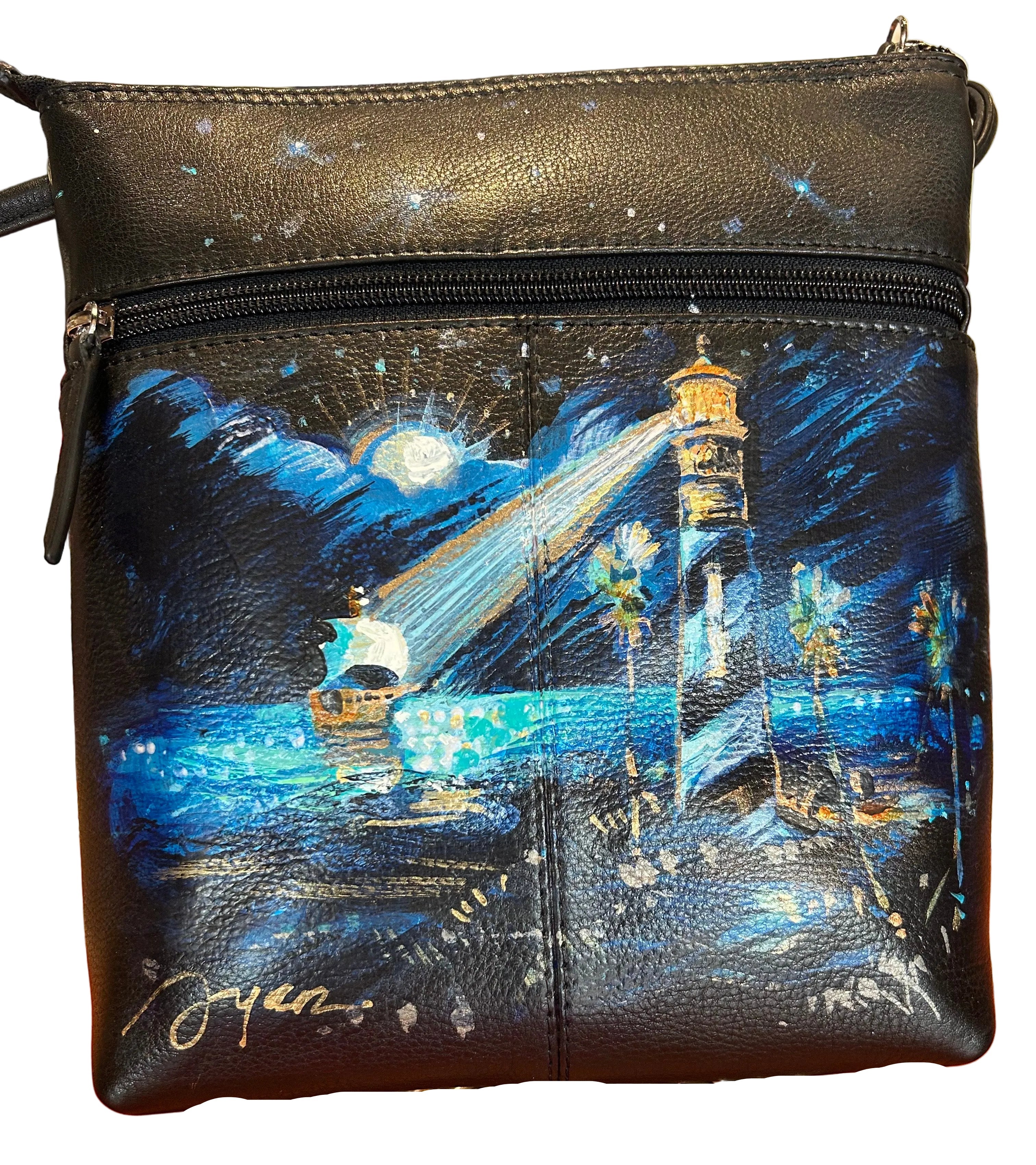 Hand painted leather purse detailed with a lighthouse and waves. REID protected with adjustable straps.