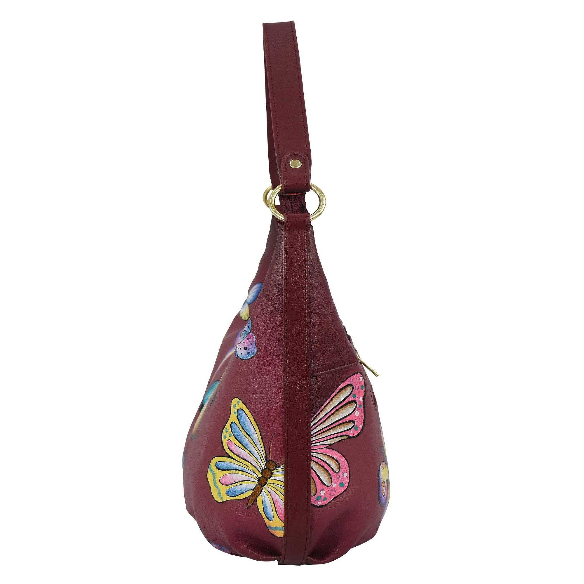 Hand painted original artwork. Genuine leather exterior and trim. Top zip entry. One zippered wall pocket. One open wall pocket. Two multipurpose pockets with gusset. Rear full length zippered pocket. Slip in cell pocket. Shoulder strap with 9” drop.