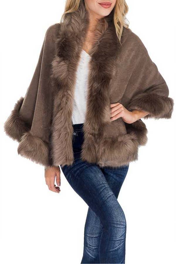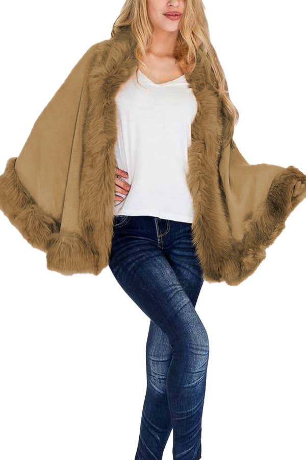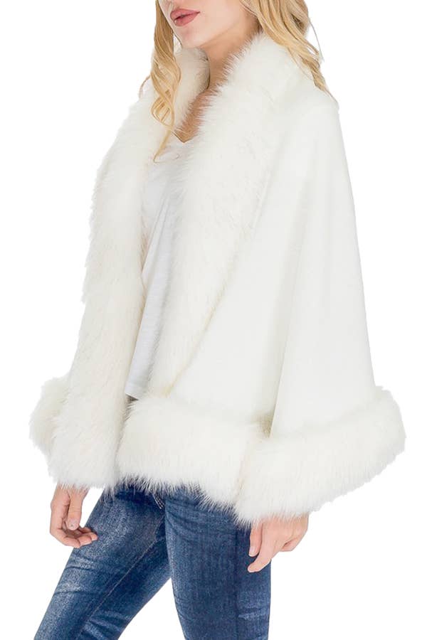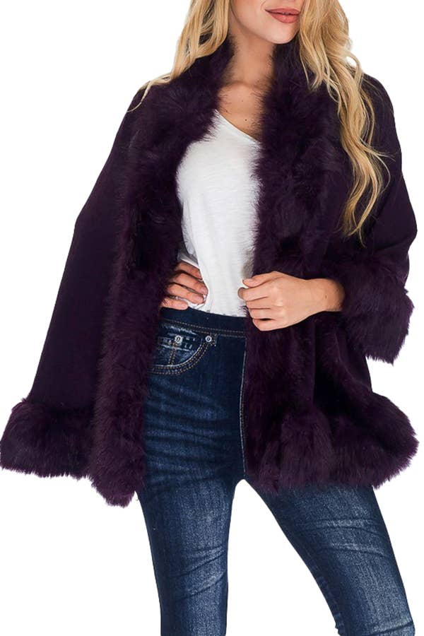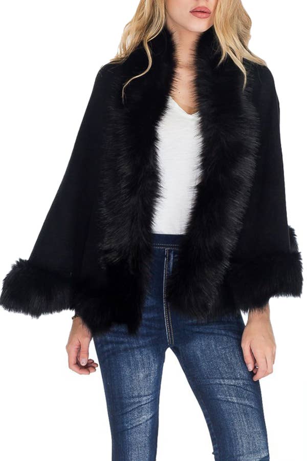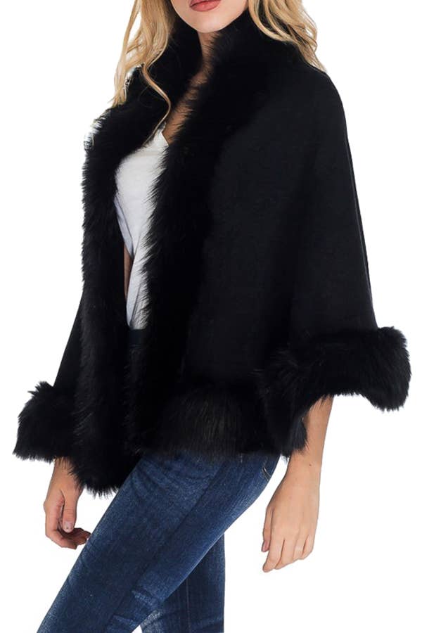 Solid Color Lux Faux Fur Trim Open Silhouette Cape Poncho One size fits most: Size range S-3XL