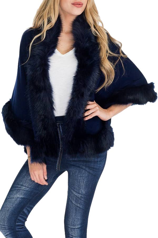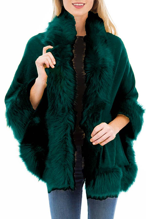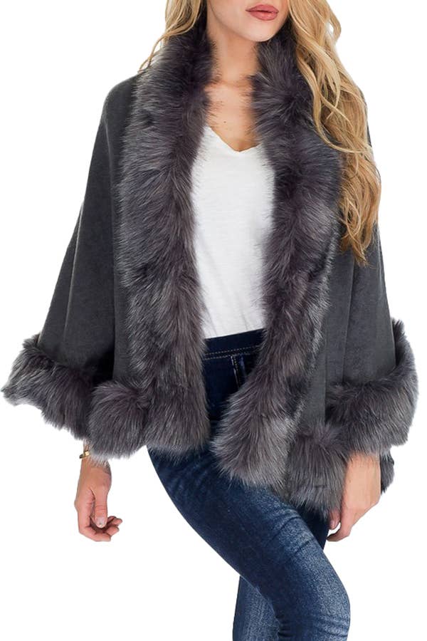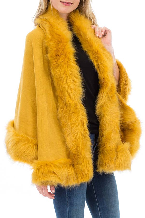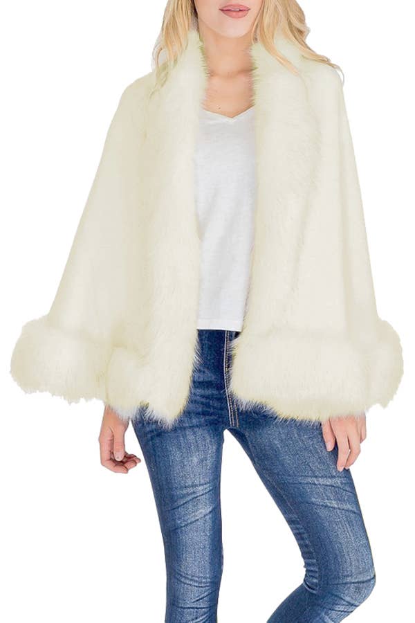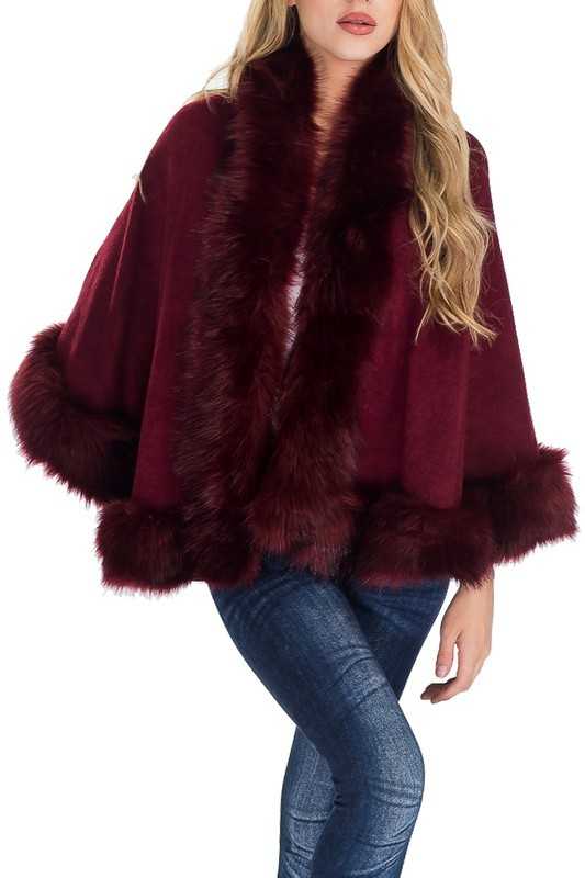 Solid Color Lux Faux Fur Trim Open Silhouette Cape Poncho One size fits most: Size range S-3XL