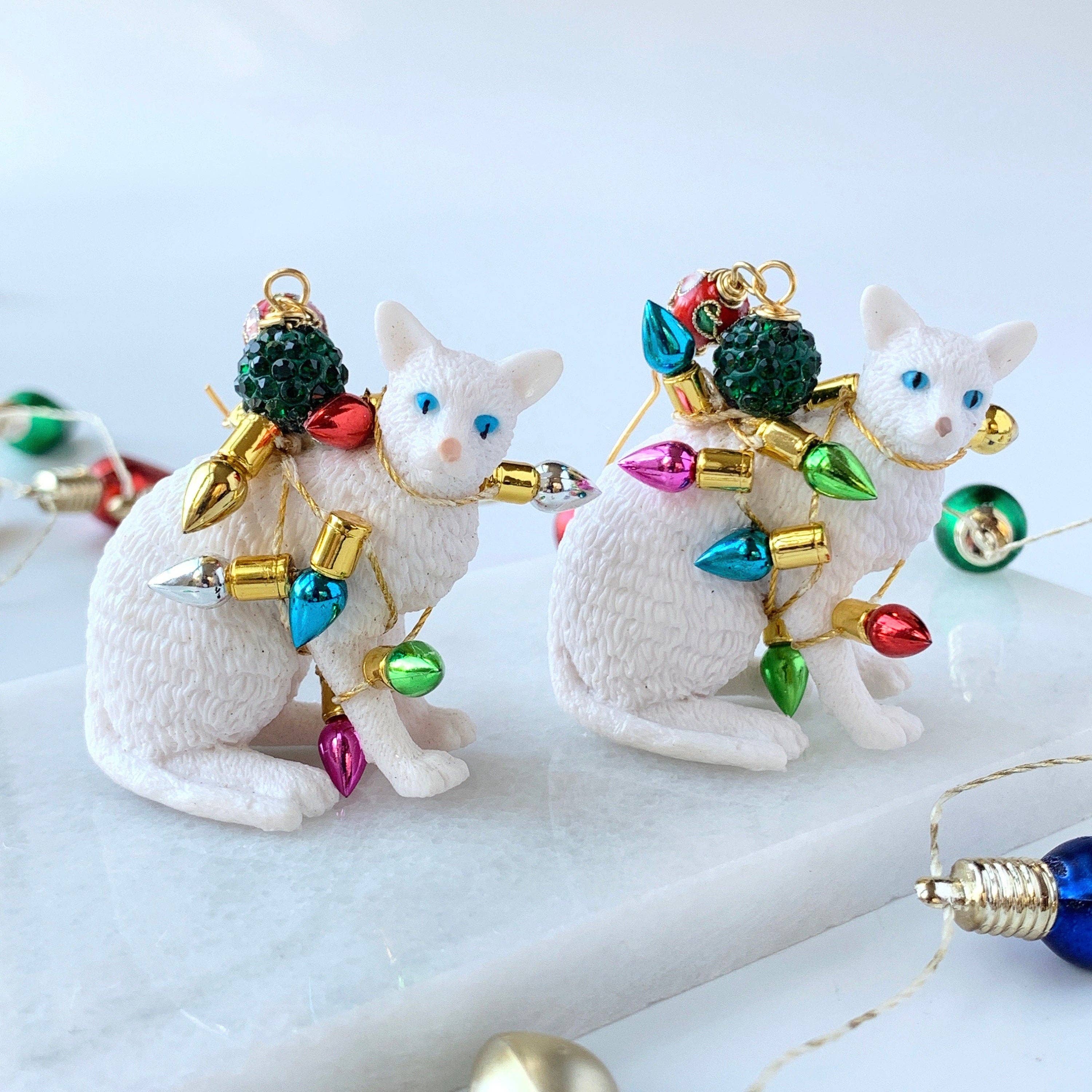 Quirky and fun holiday cat earrings to compliment that ugly sweater at a sweater party! Miniature white cats tangled up in miniature Christmas bulb lights, topped with a hunter green rhinestone pave to add sparkle and floral enamel cloisonné to bring sophistication. Unique design and crazy fun holiday statement earrings to get you in the festive holiday spirit! Gold-plated, nickel-free ear wires. Fun for the holiday season or anytime you want a conversation-starting statement piece! Makes a great gift for a cat lover, cat sitter, cat mom, groomer, or something special to treat yourself!