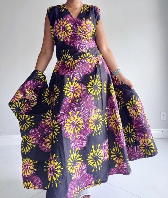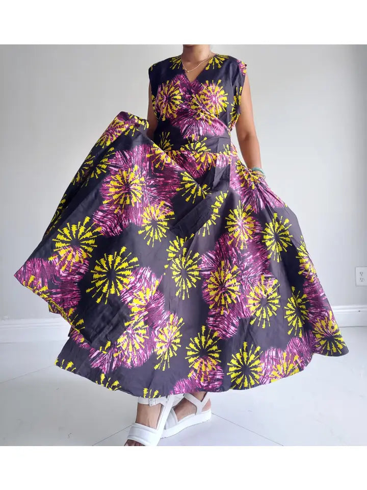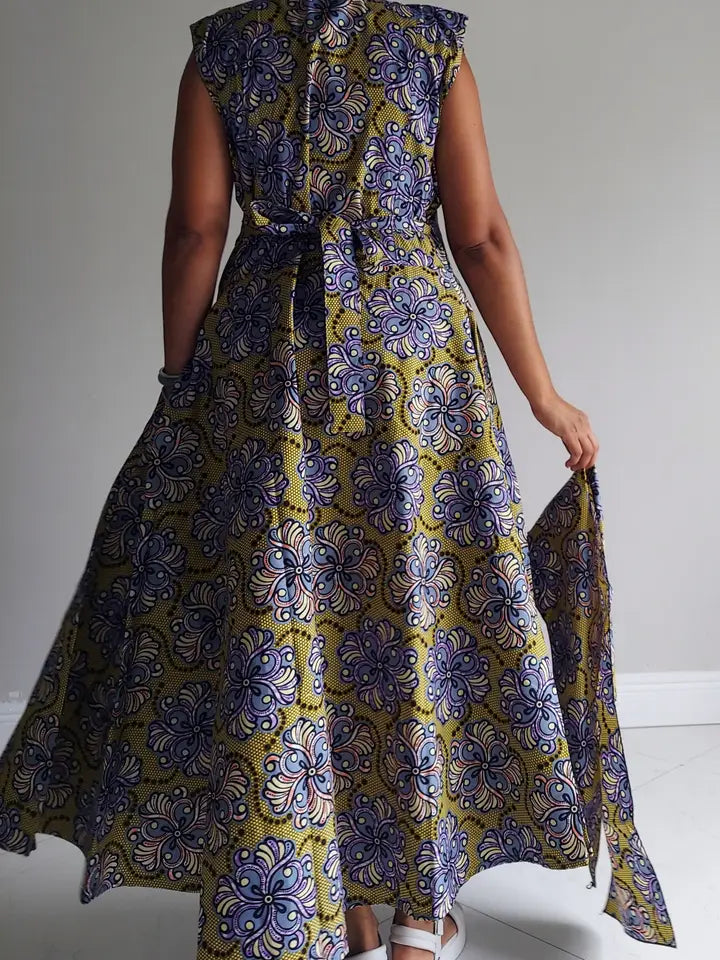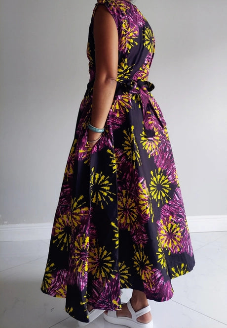Beautiful women's long wrap dresses. Featuring a V-neckline and sleeveless design. The wrap-around style ties at the back for a customizable fit and includes convenient side pockets.