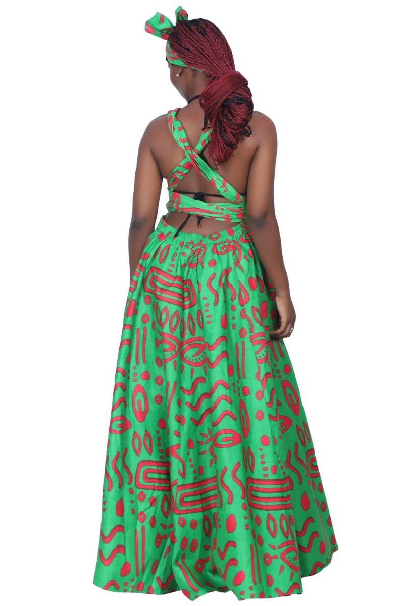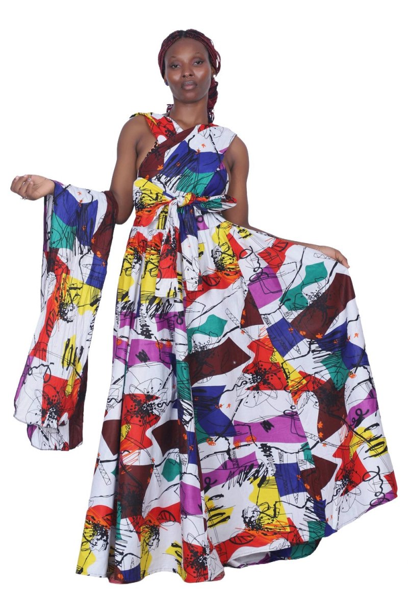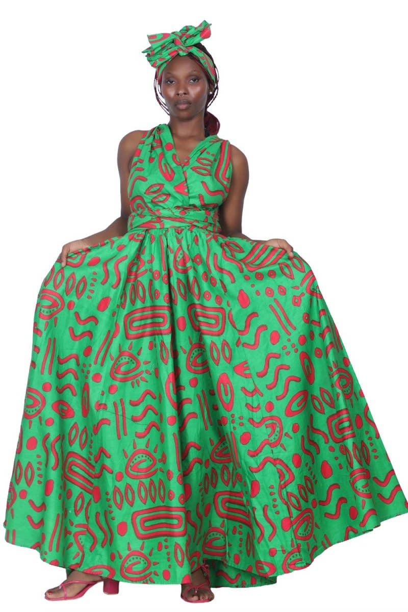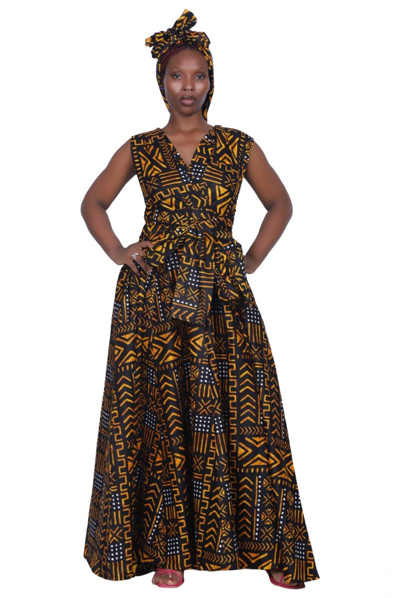 Features: Full-length maxi dress Sleeveless design with V-neckline Defined waist with adjustable tie Bold African-inspired geometric print Flowy, wide skirt for added elegance.