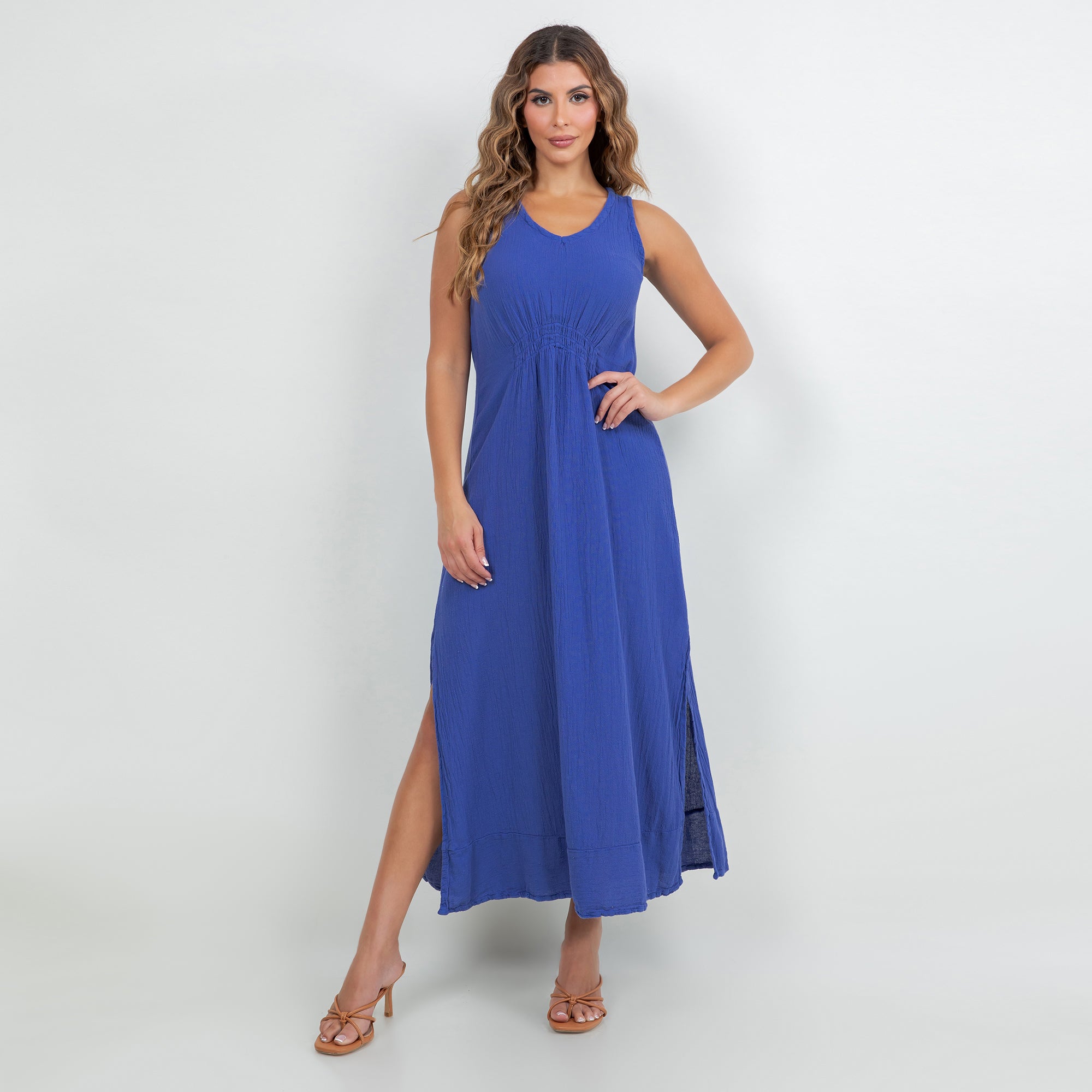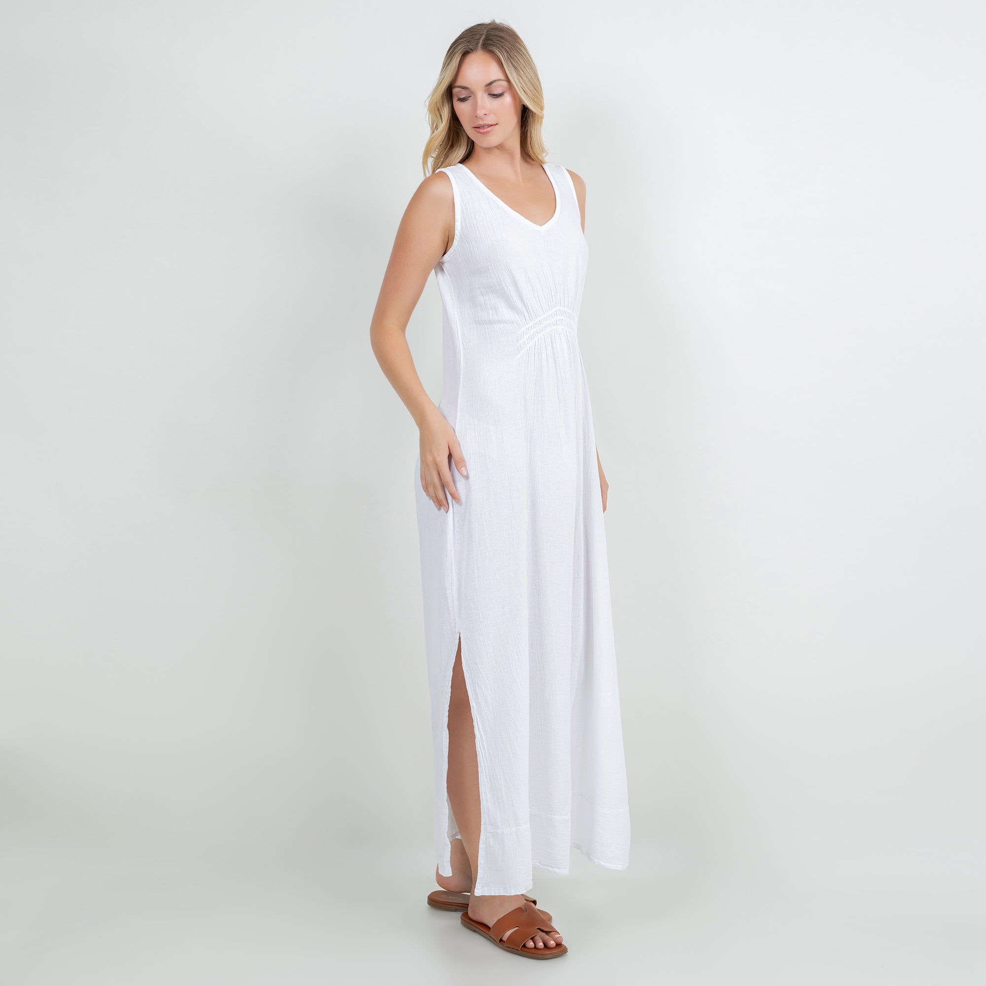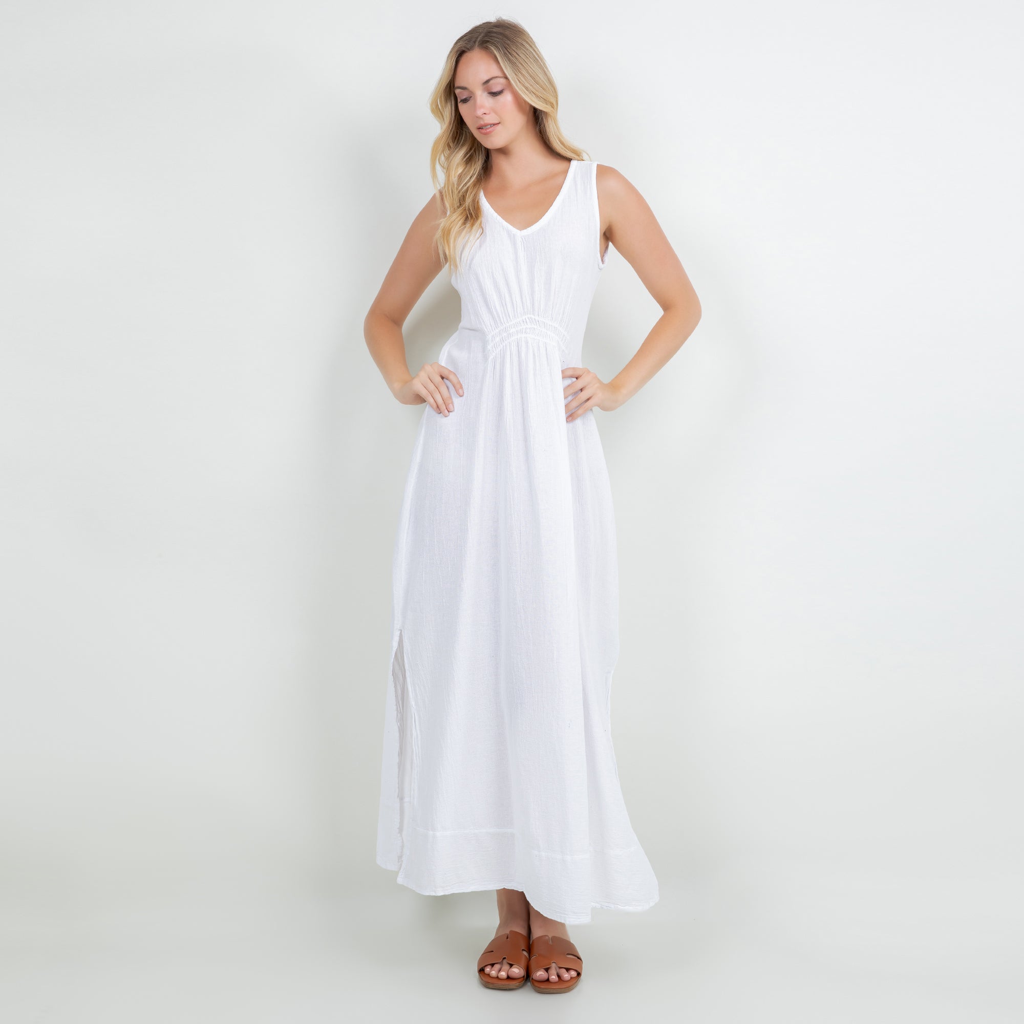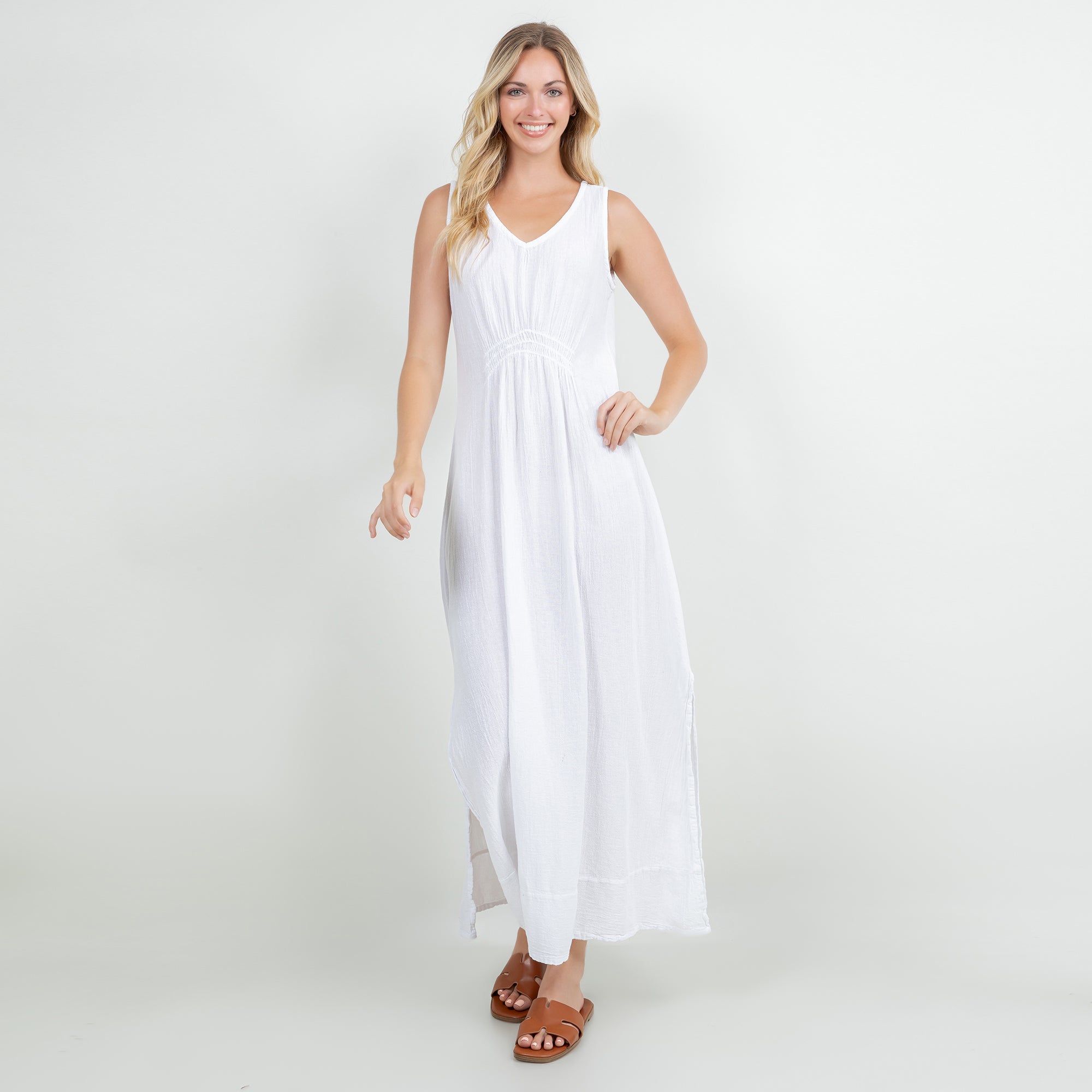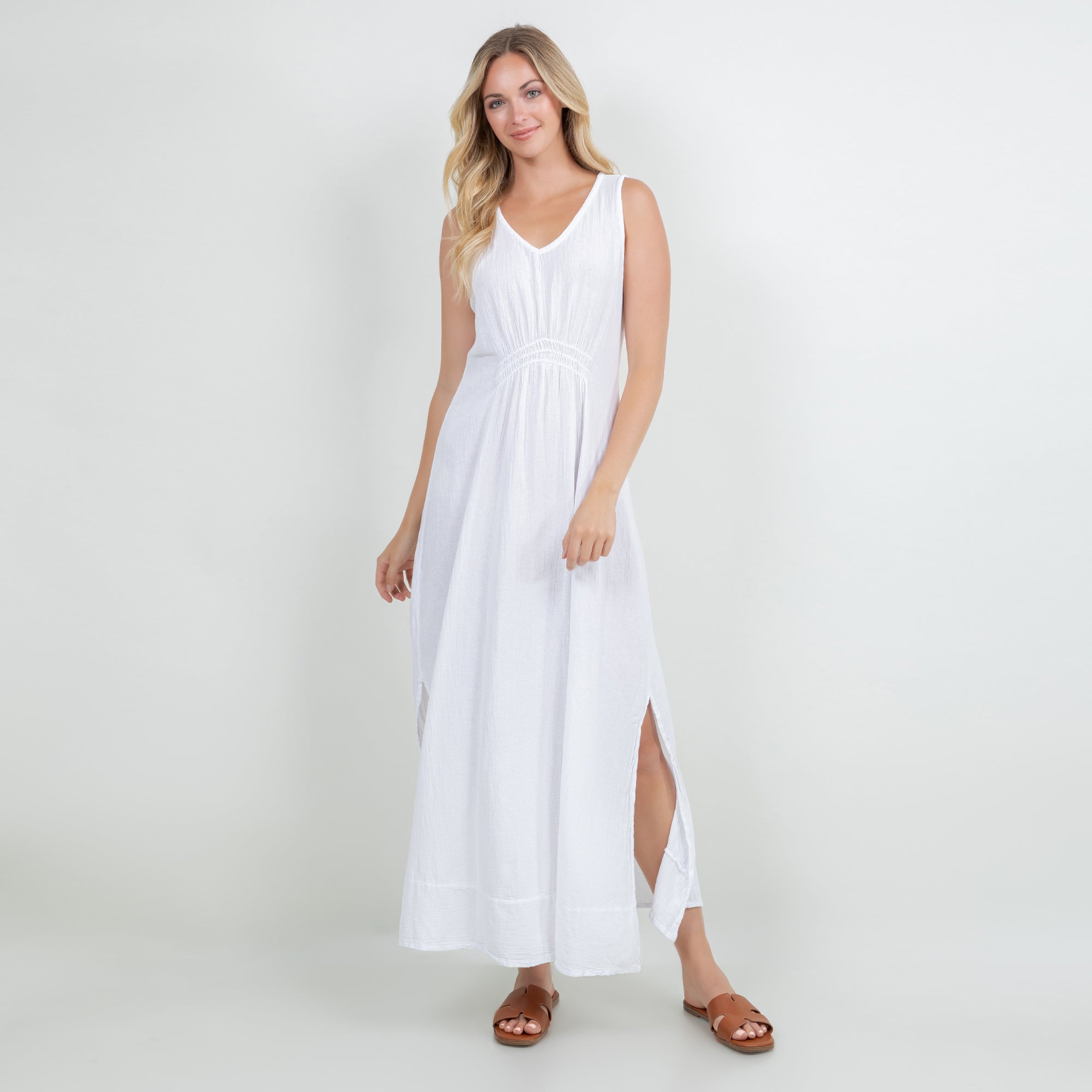 This sleeveless, full-length dress features a scoop neck, ruched bodice, and knee-high slits up both sides for a look that goes from day to night with ease! - 100% Cotton Gauze Ruched Dress