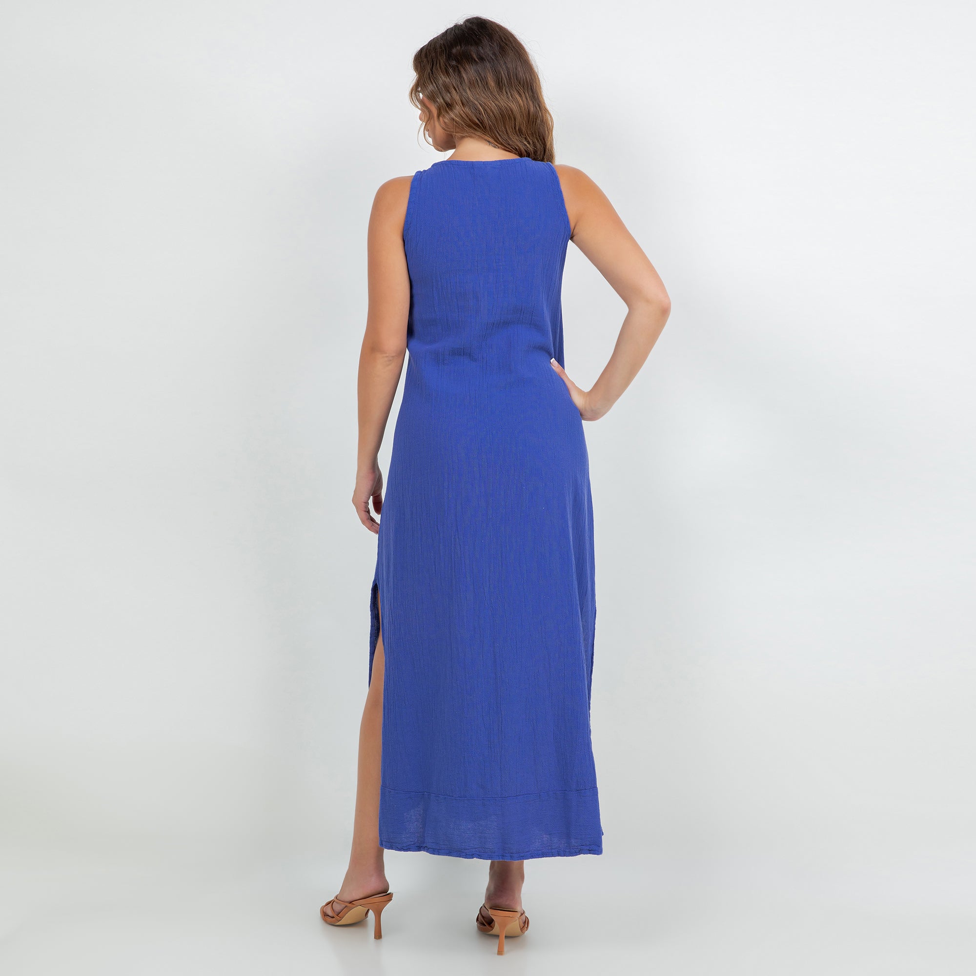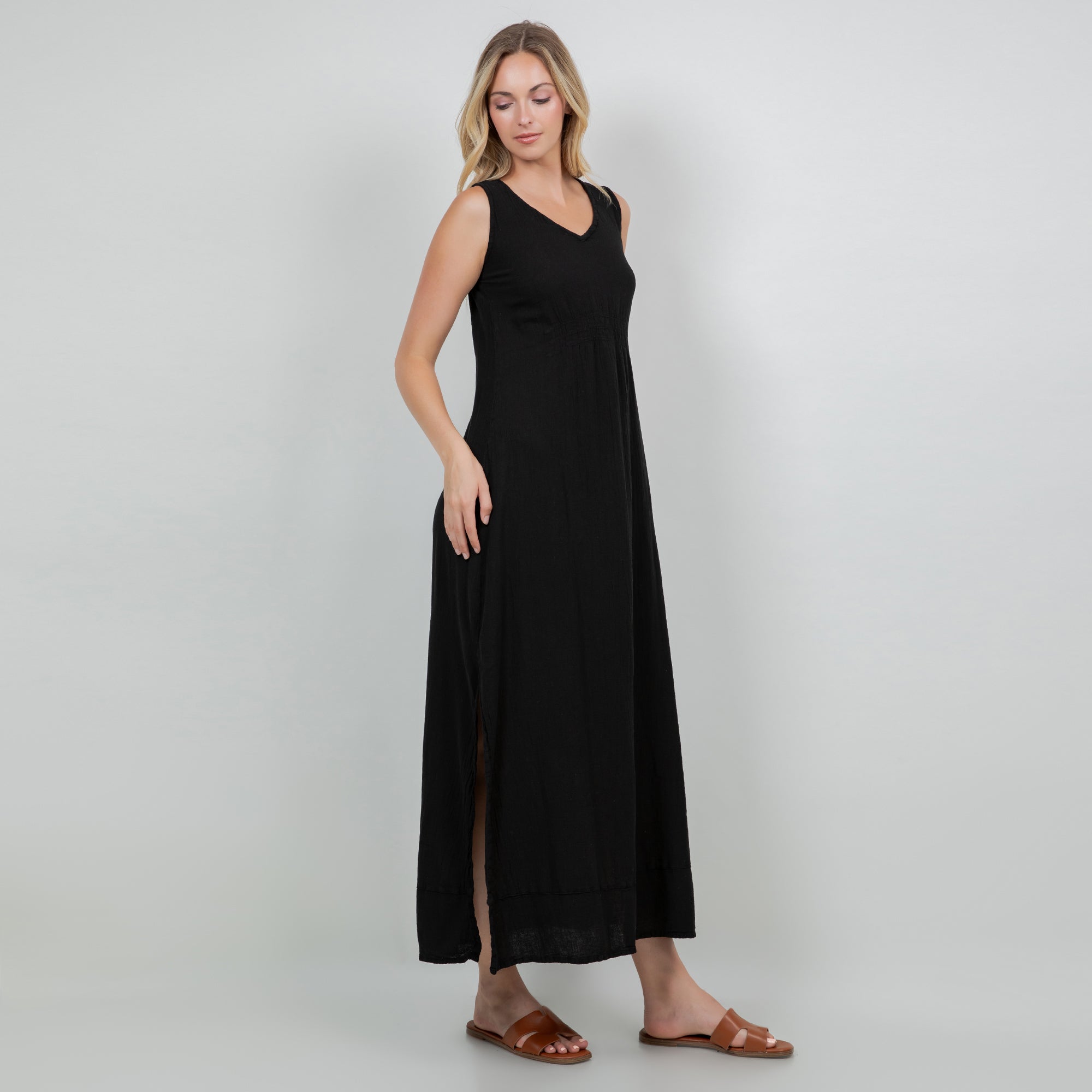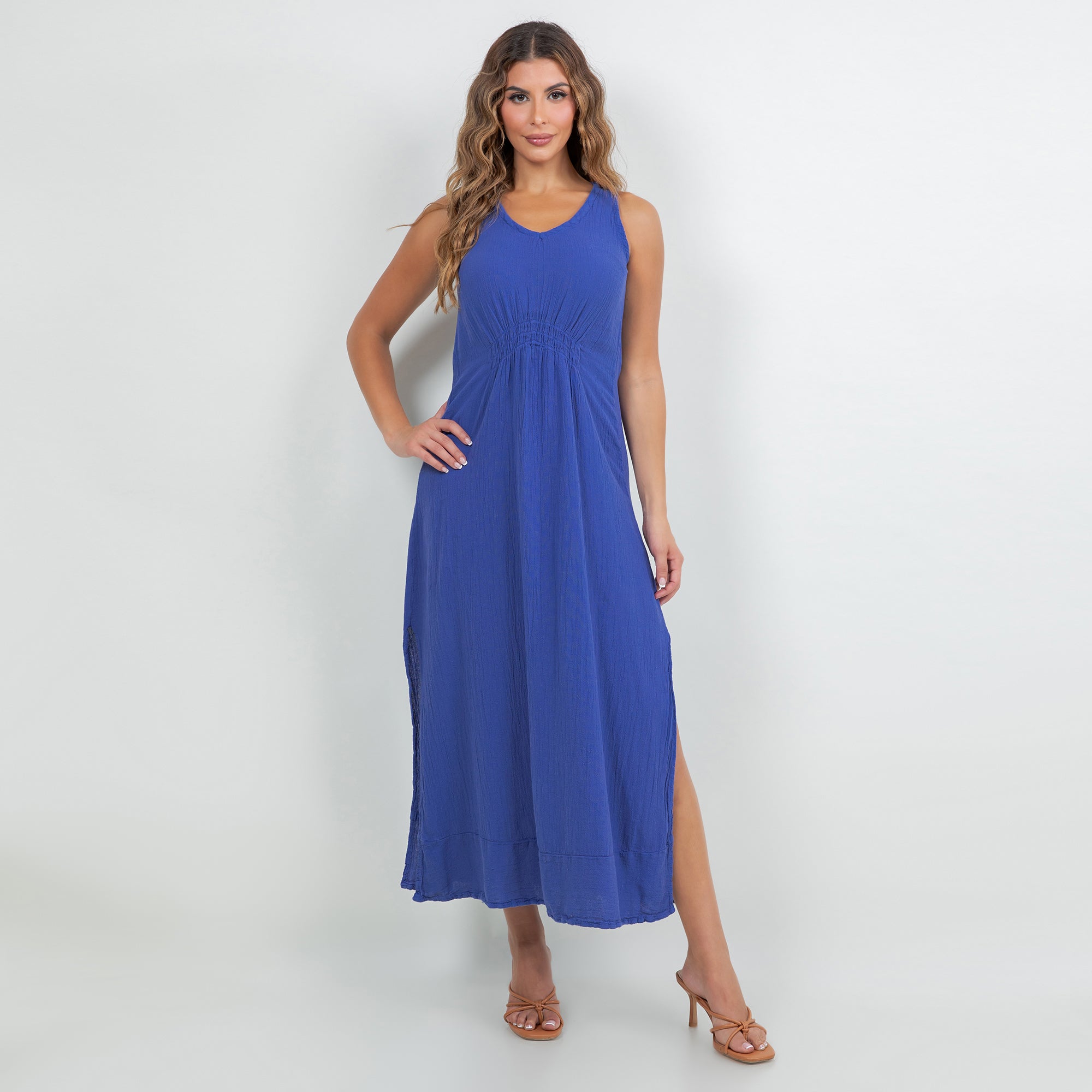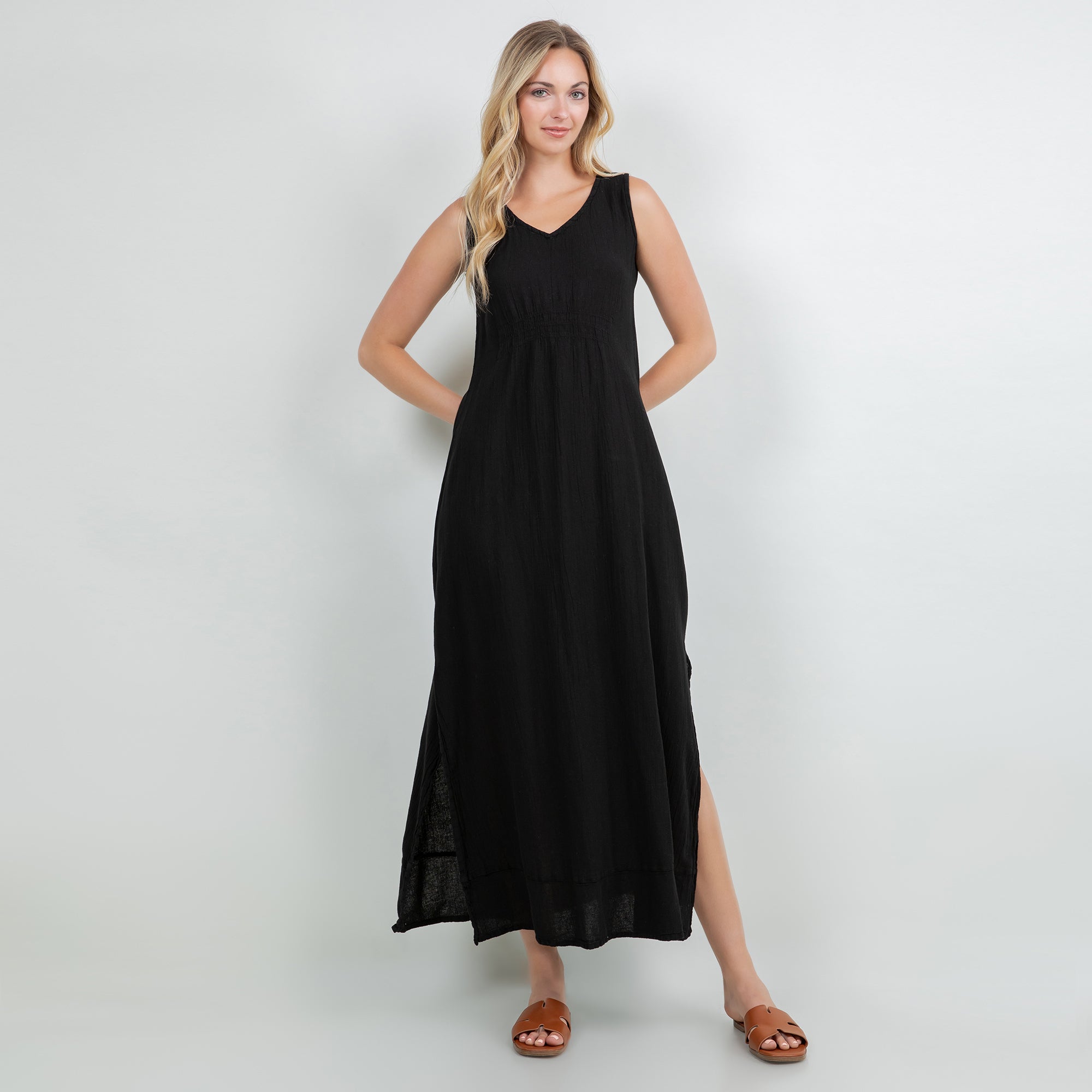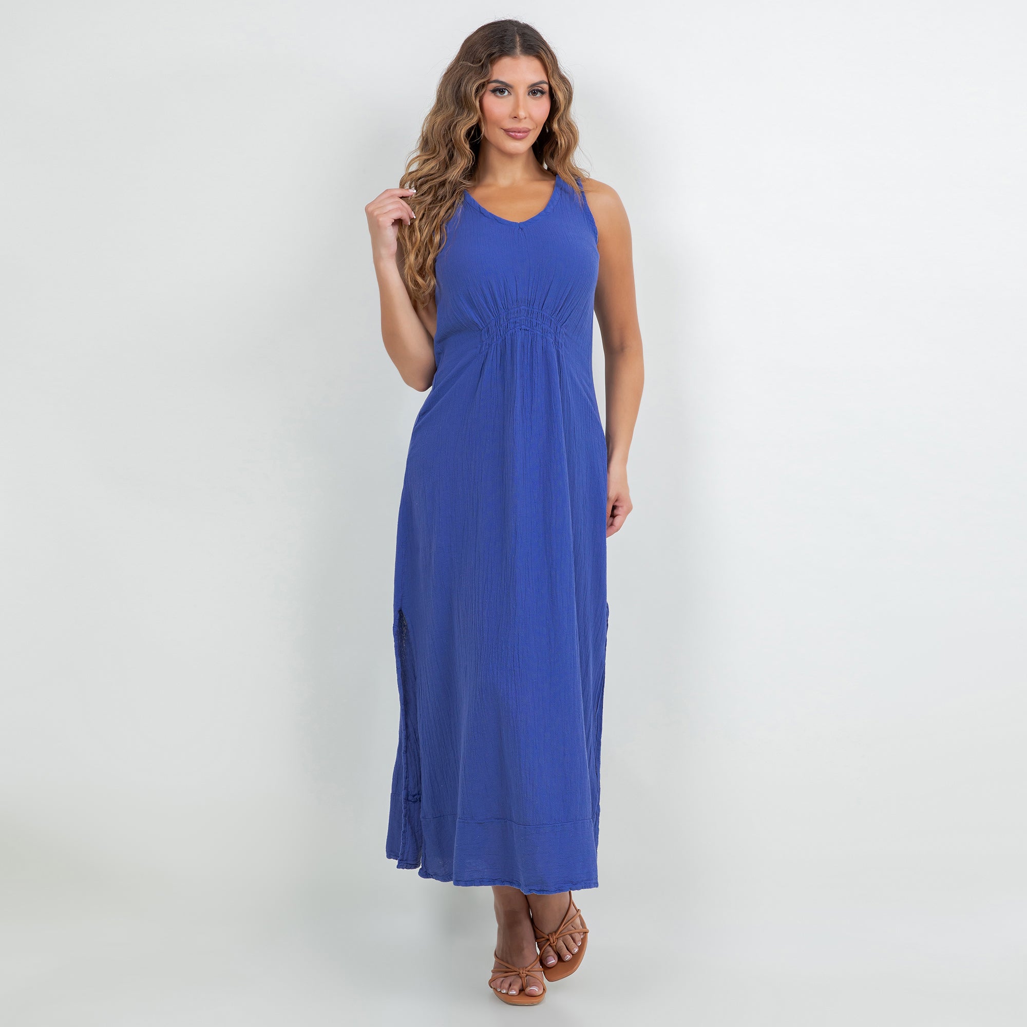 This sleeveless, full-length dress features a scoop neck, ruched bodice, and knee-high slits up both sides for a look that goes from day to night with ease! - 100% Cotton Gauze Ruched Dress