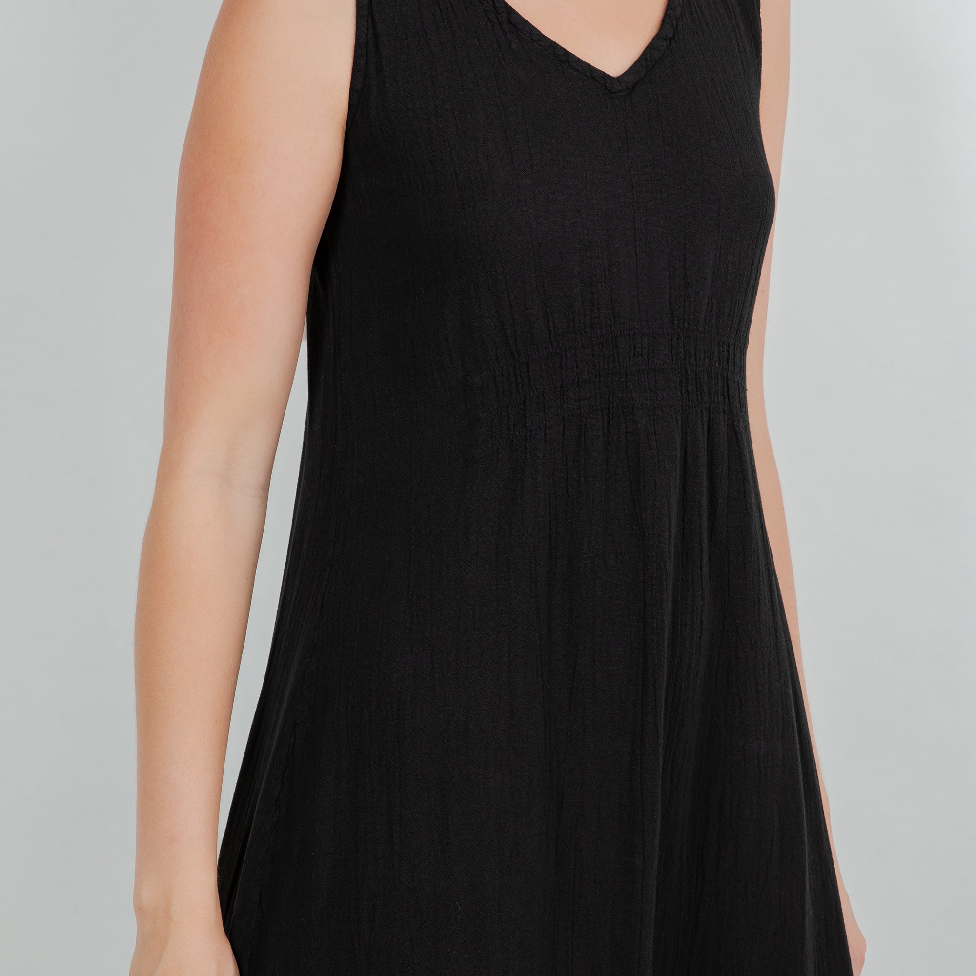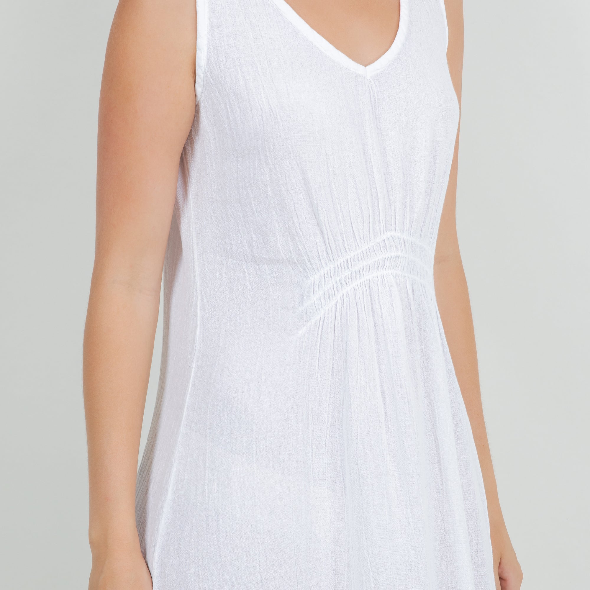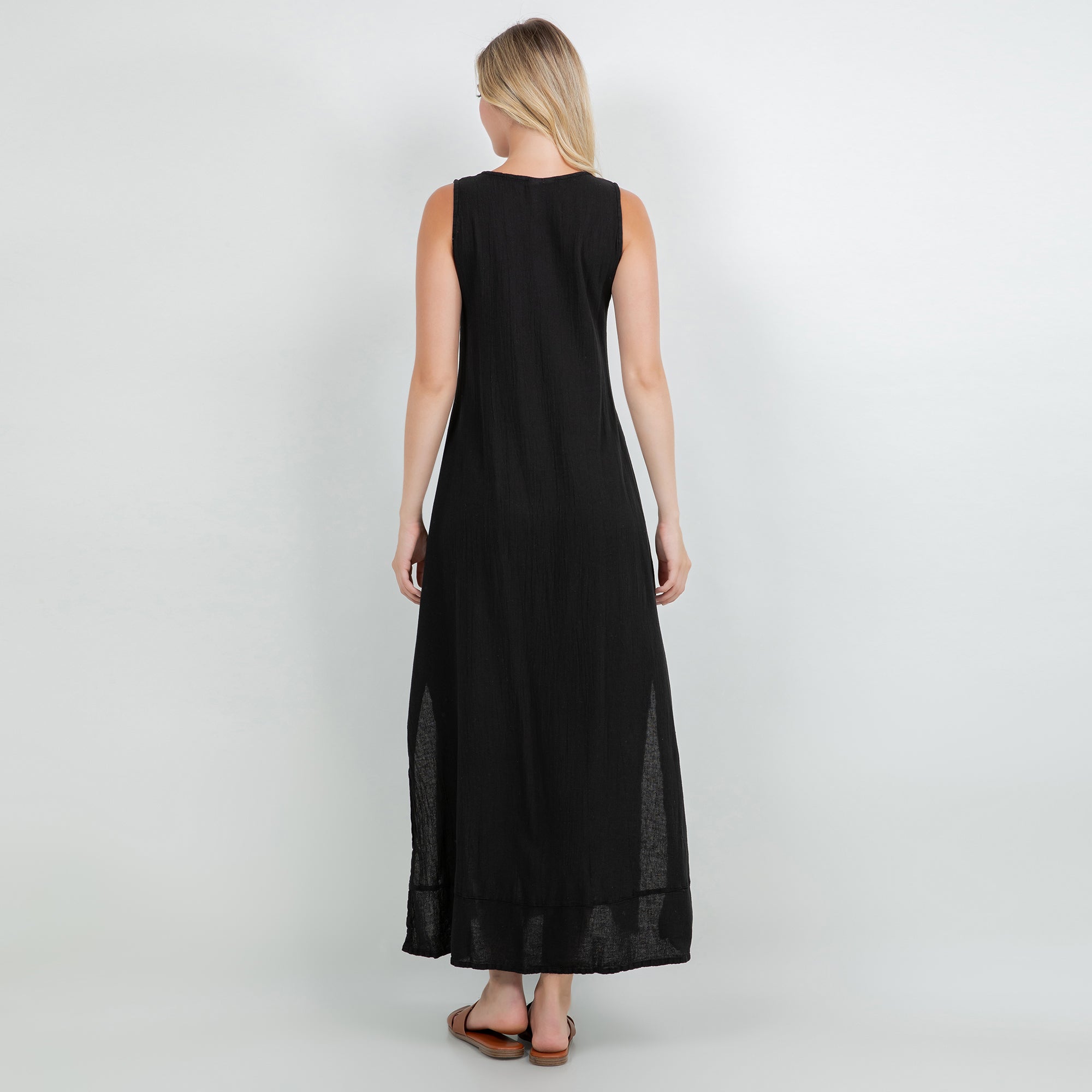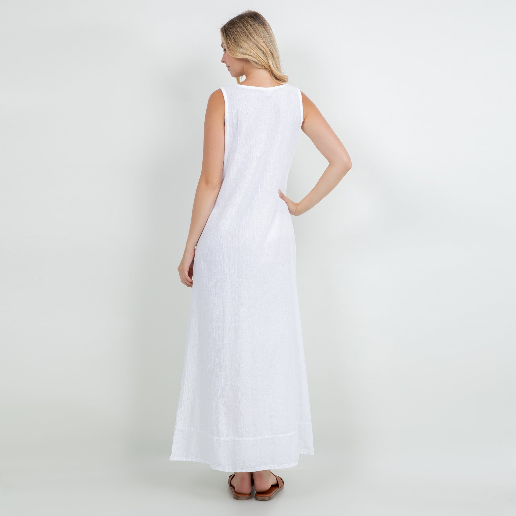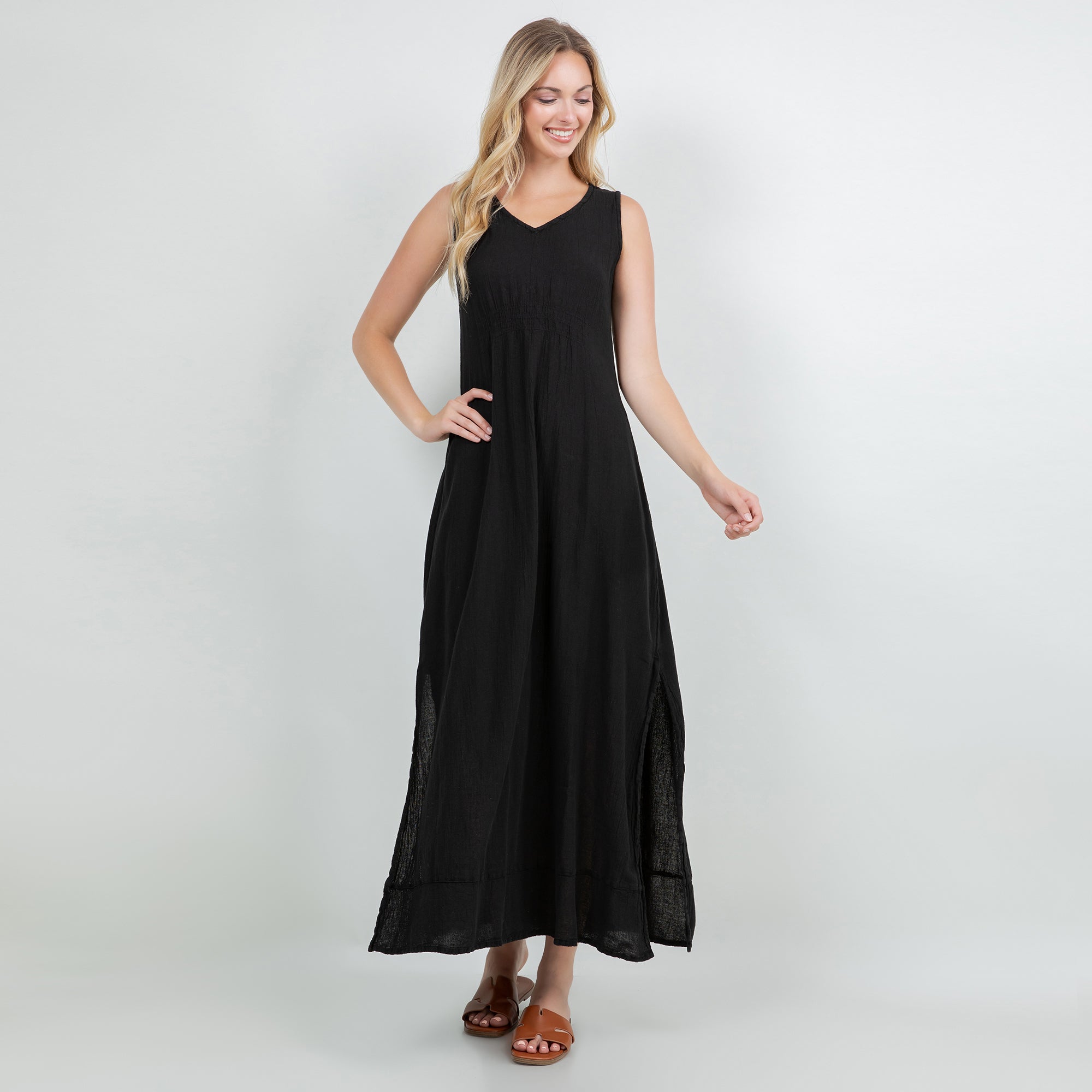 This sleeveless, full-length dress features a scoop neck, ruched bodice, and knee-high slits up both sides for a look that goes from day to night with ease! - 100% Cotton Gauze Ruched Dress