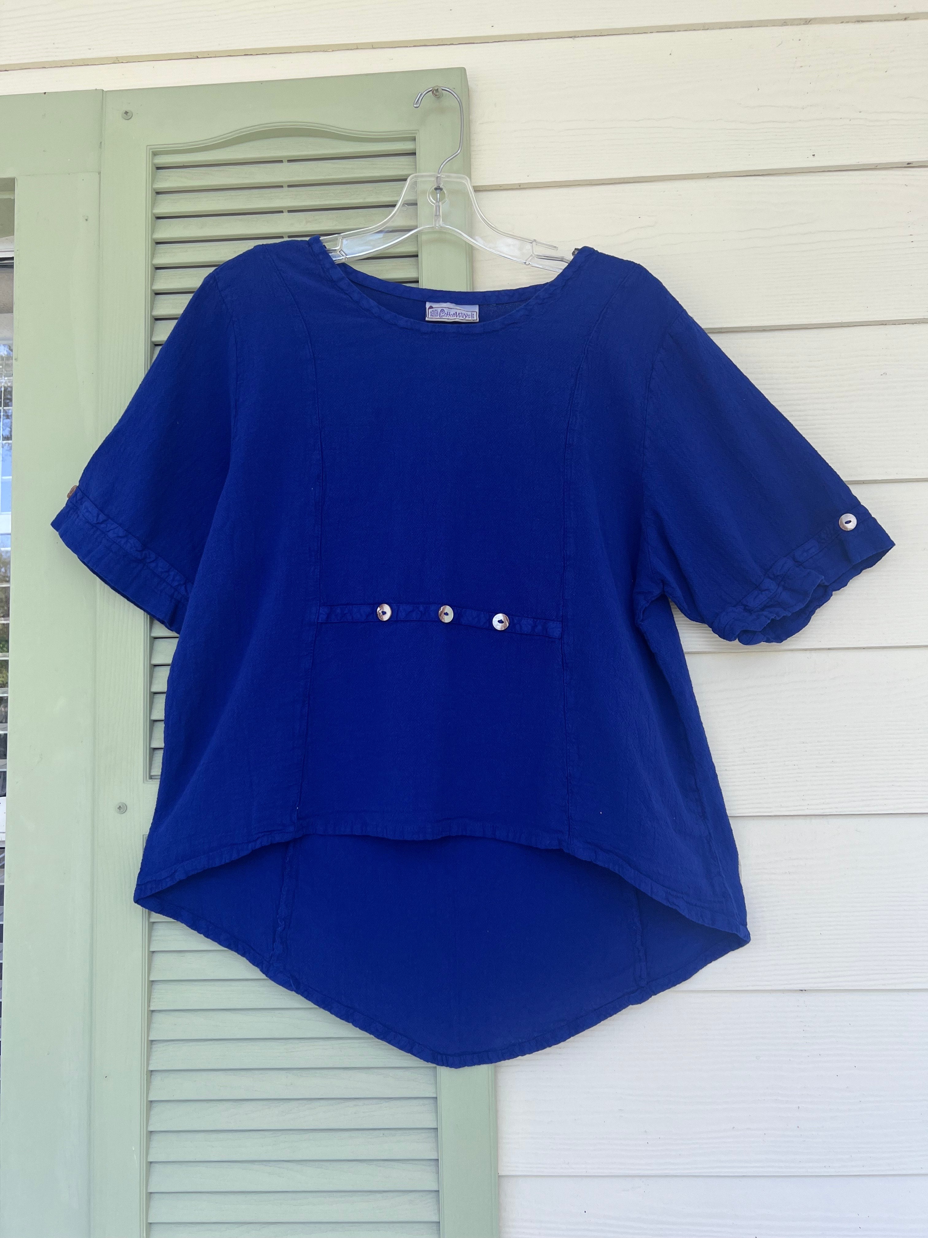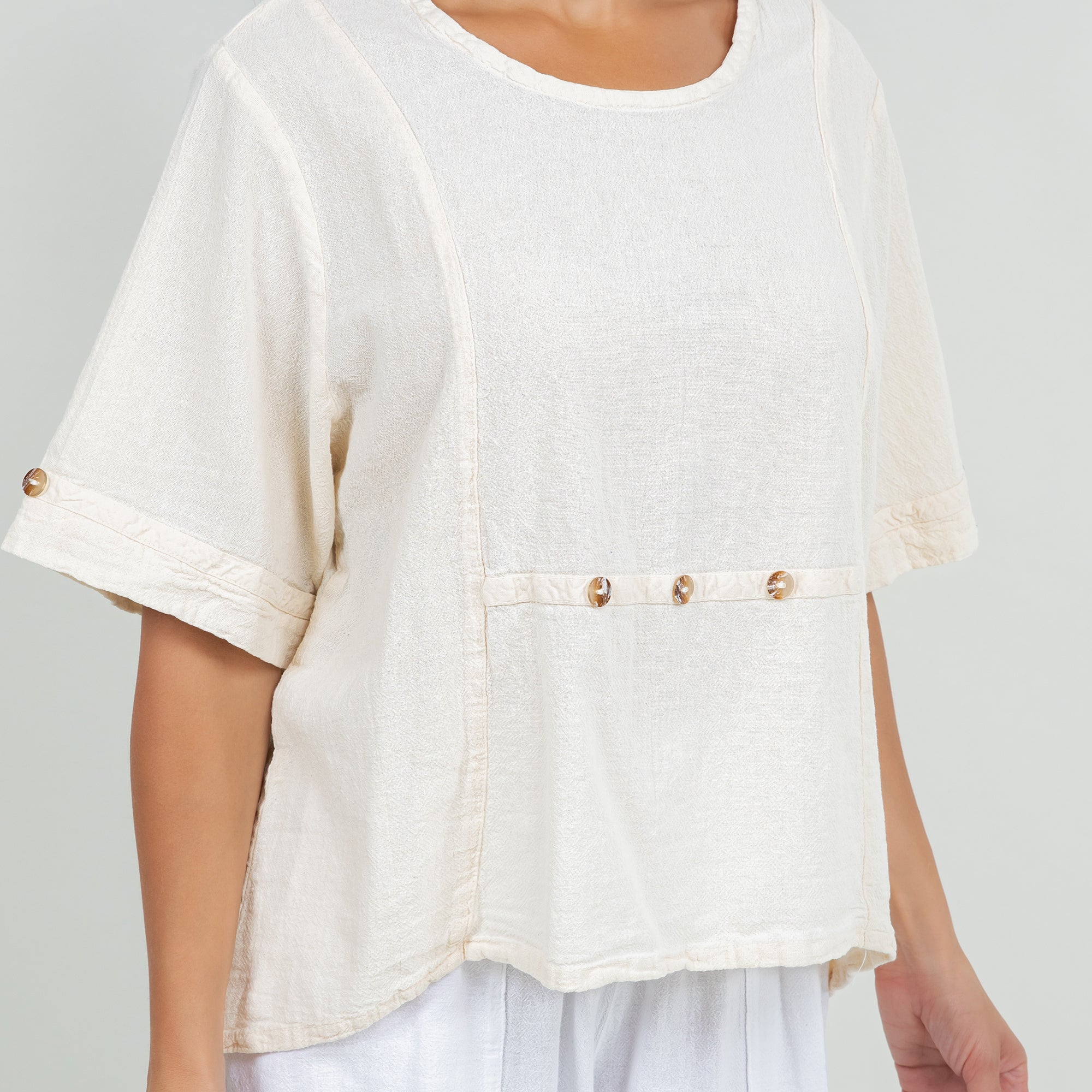 The Kira top is detailed with stitching down the front and buttons. With 4" sleeves and a half up half down hem, it makes this style perfect for an adorable casual look. Would look fabulous paired with Frankie pants!