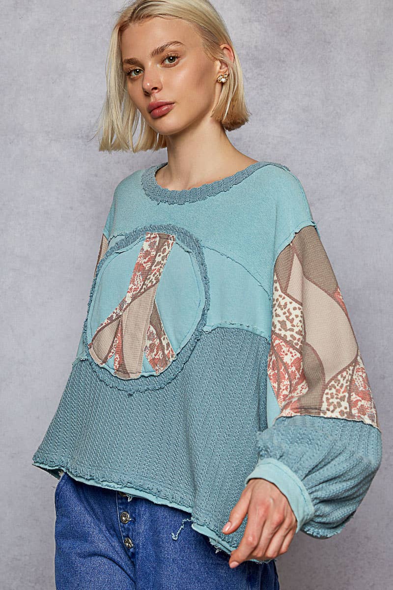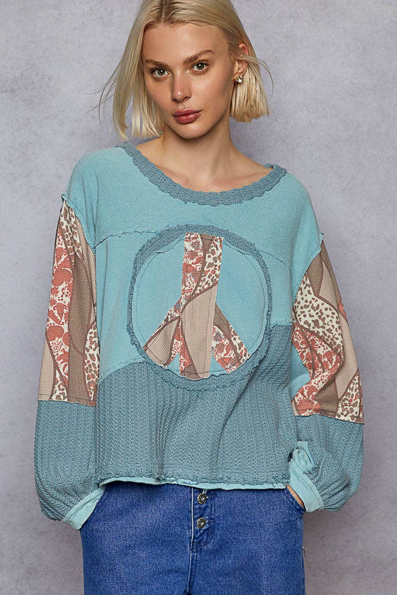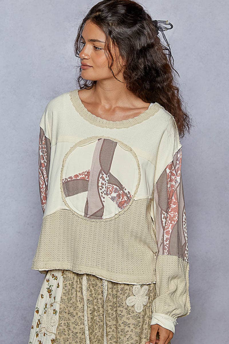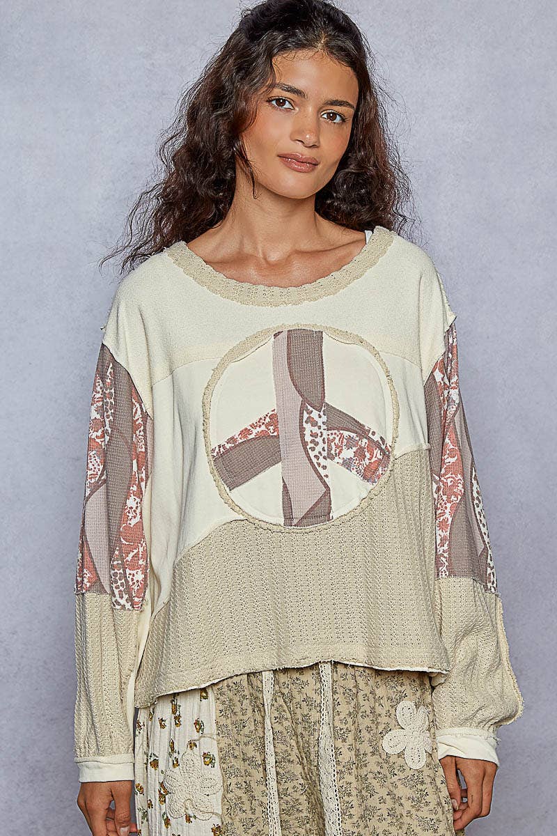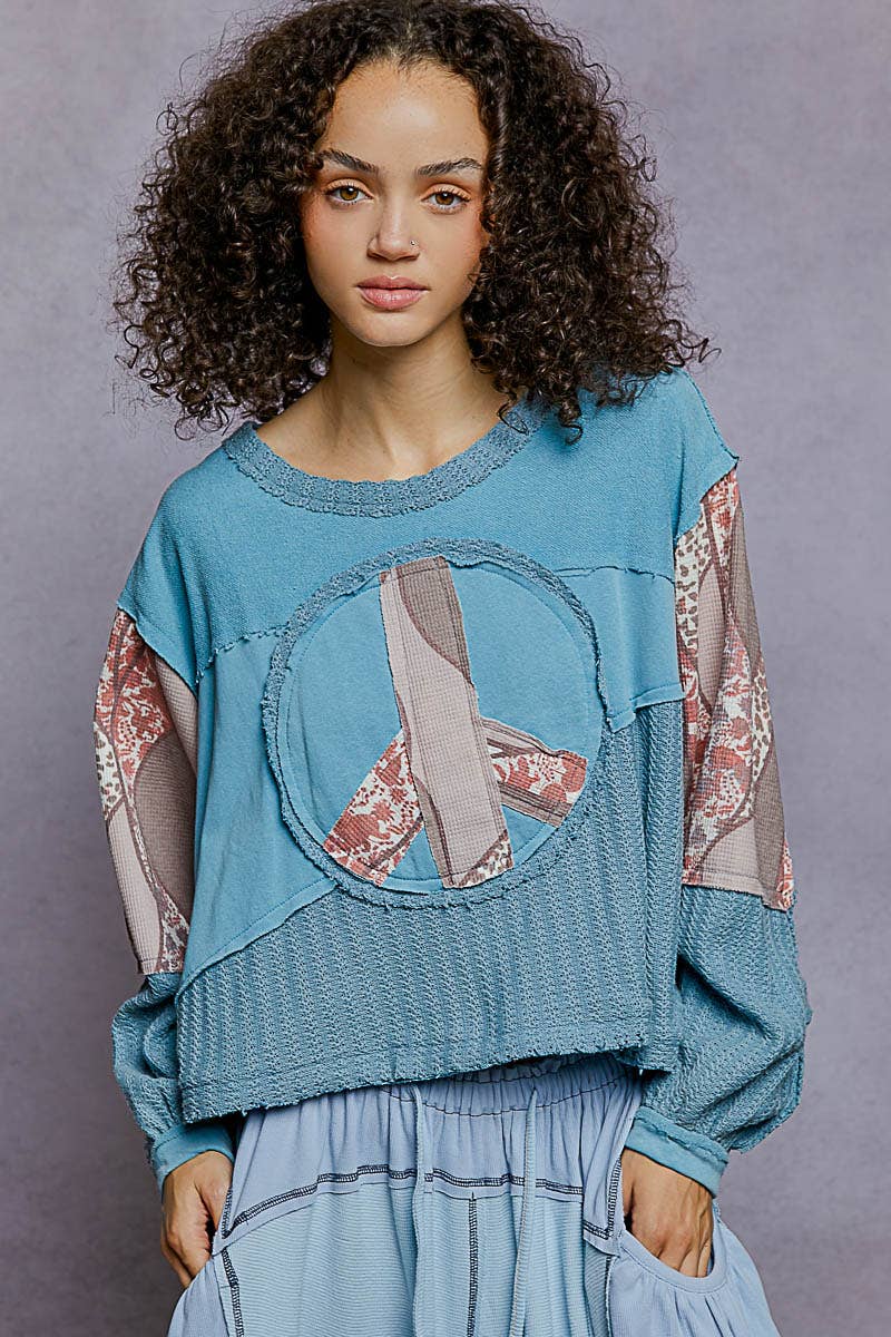 Designed in round neck long sleeve oversized fit French terry top, printed thermal, cut and sew pullover sweater with peace emblem patch work and frayed edge details.