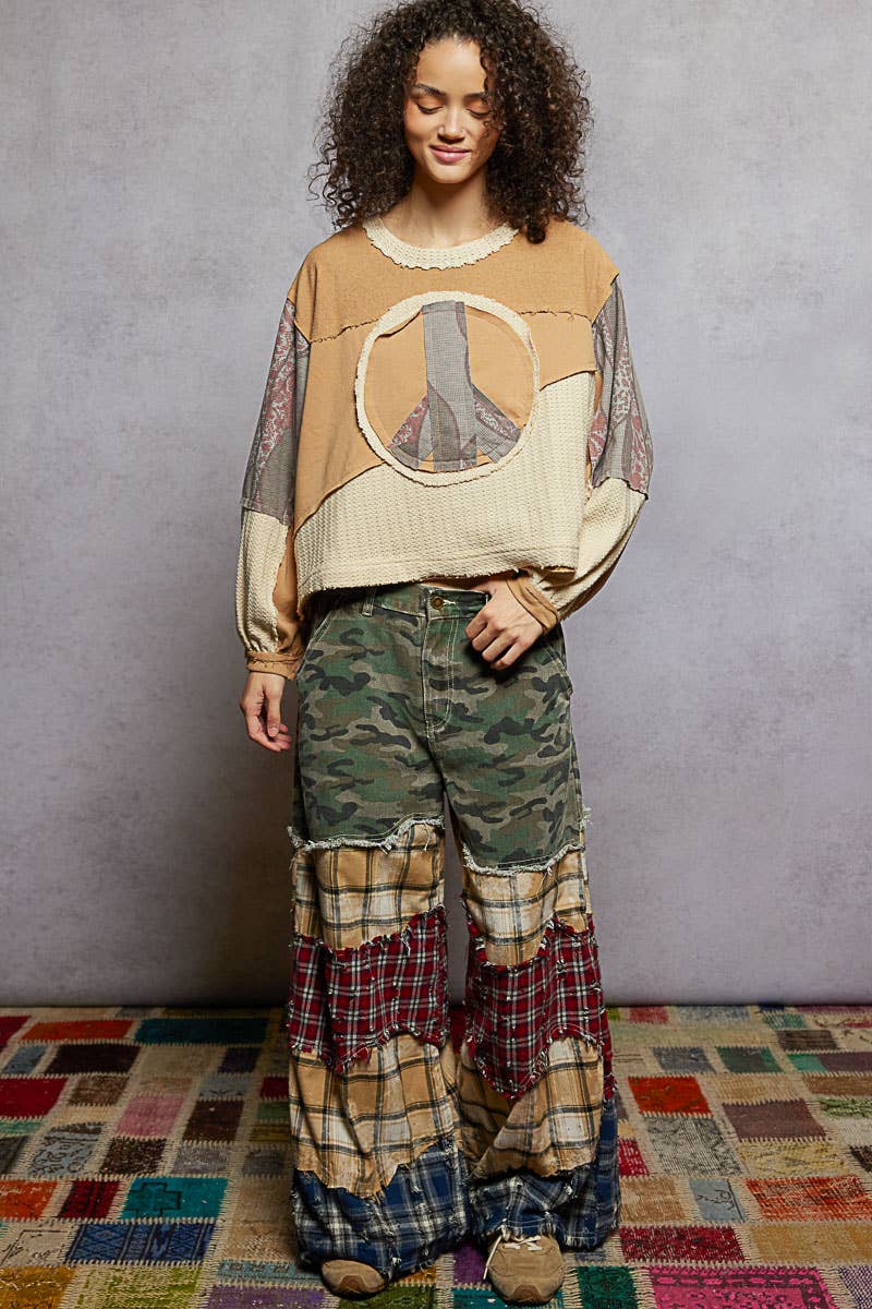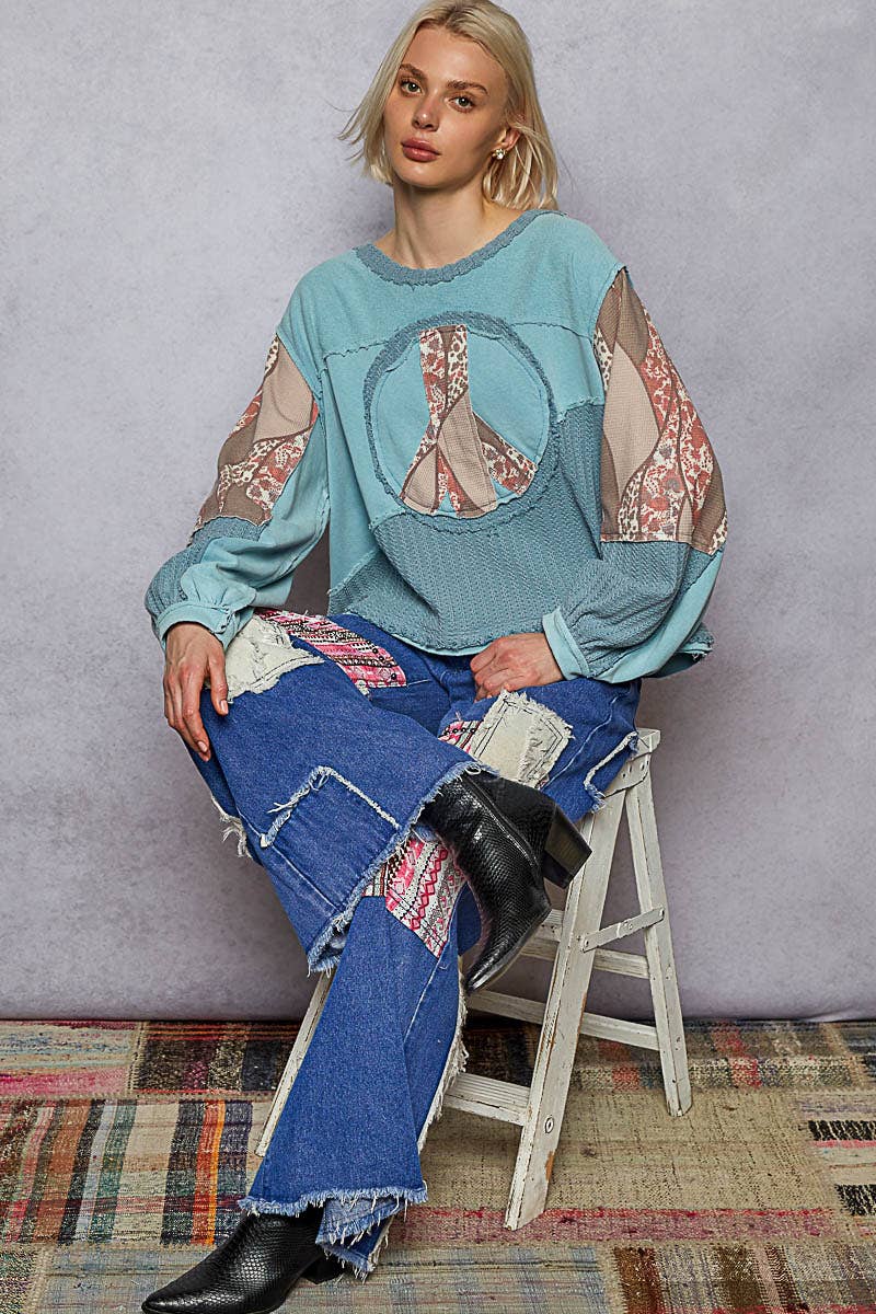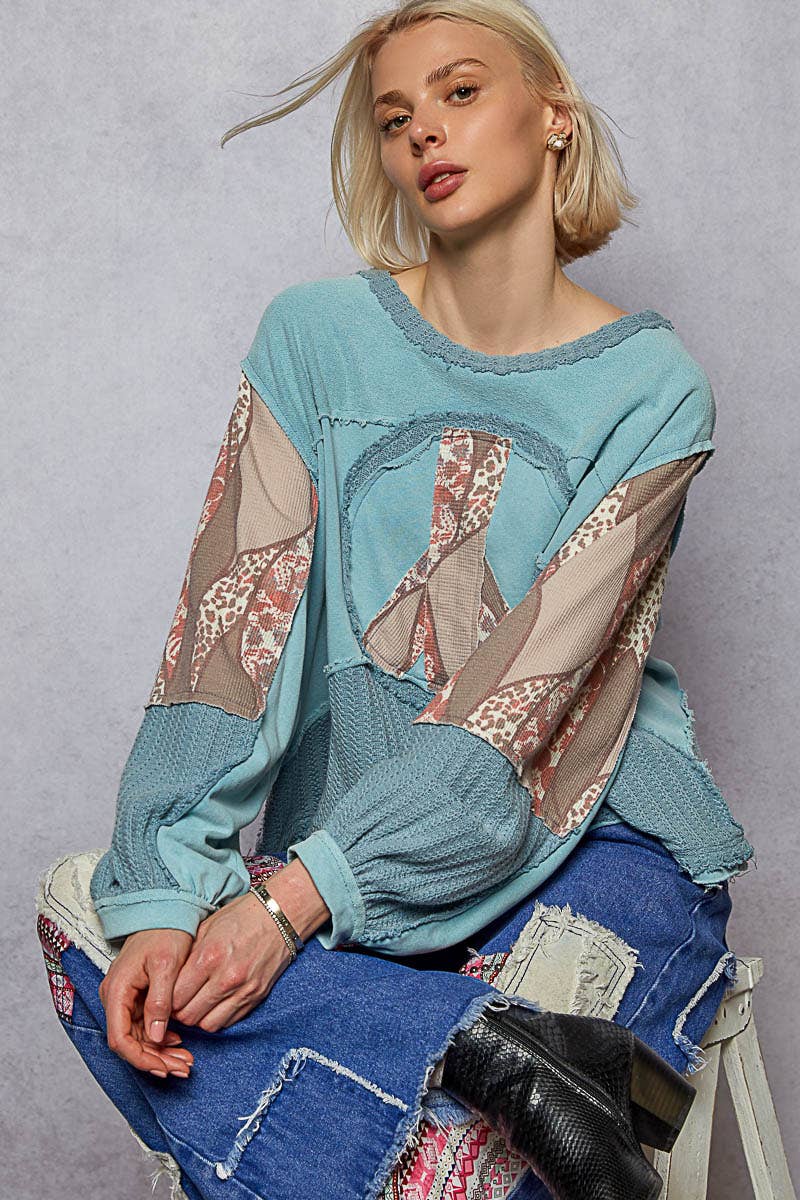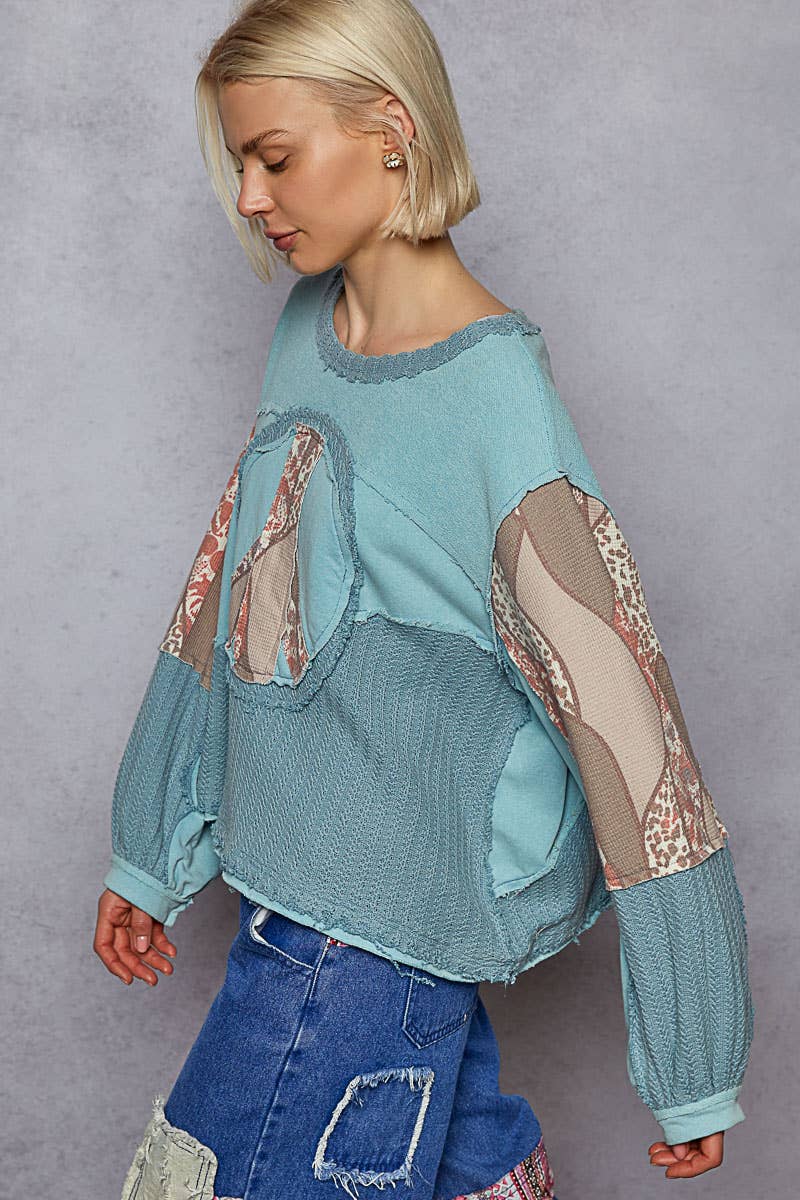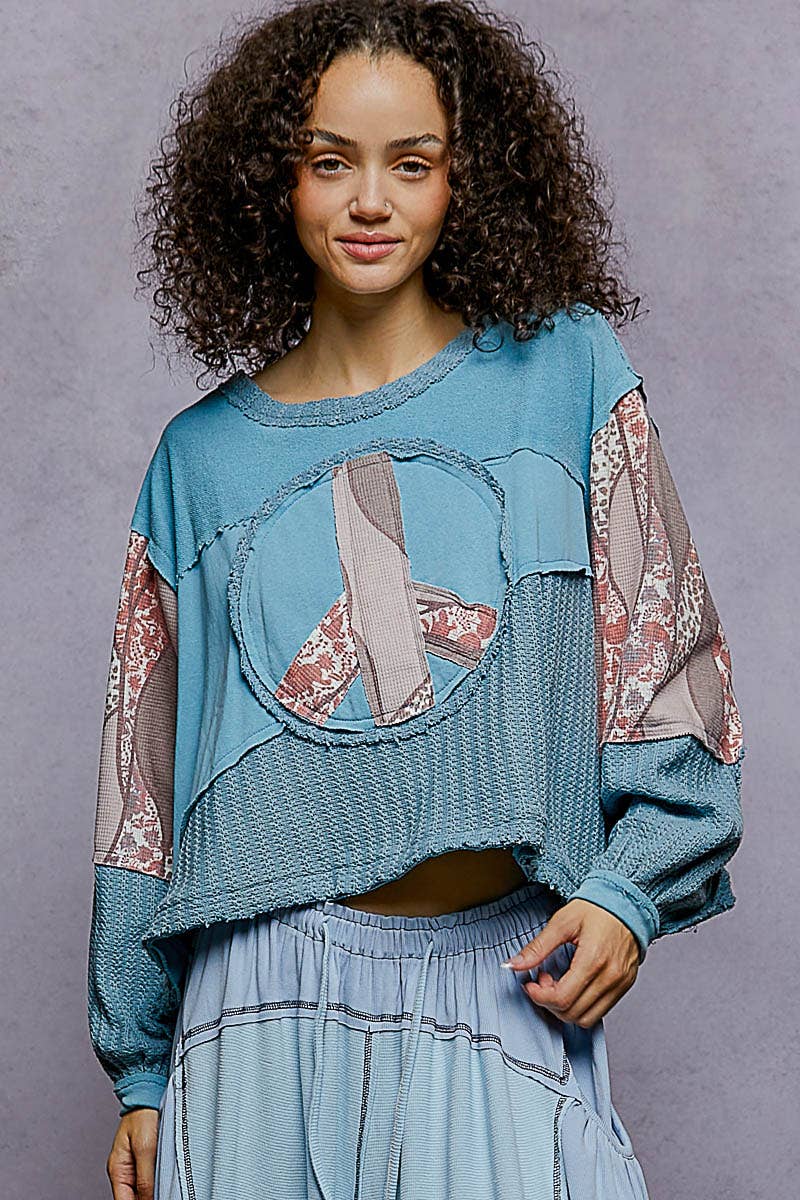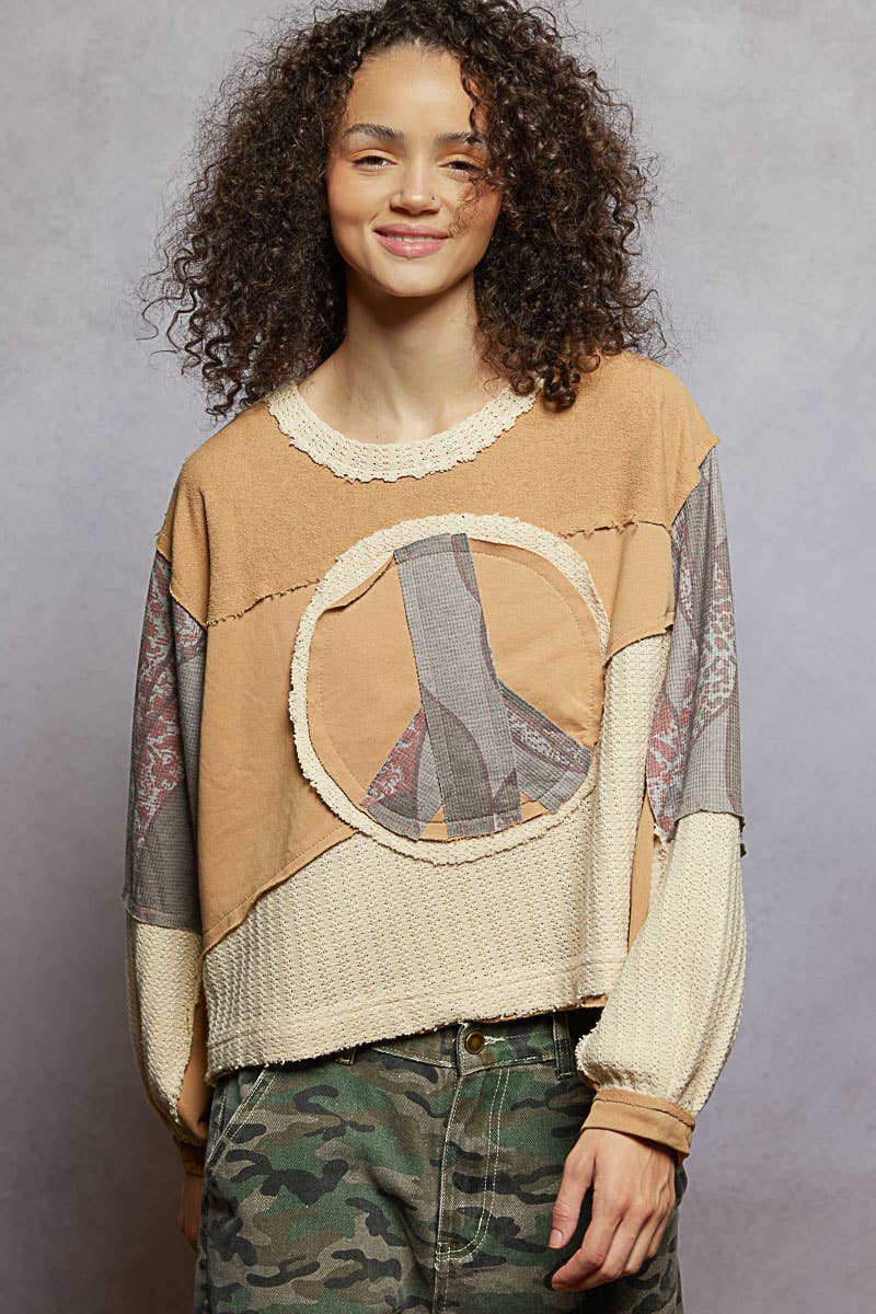 Designed in round neck long sleeve oversized fit French terry top, printed thermal, cut and sew pullover sweater with peace emblem patch work and frayed edge details.