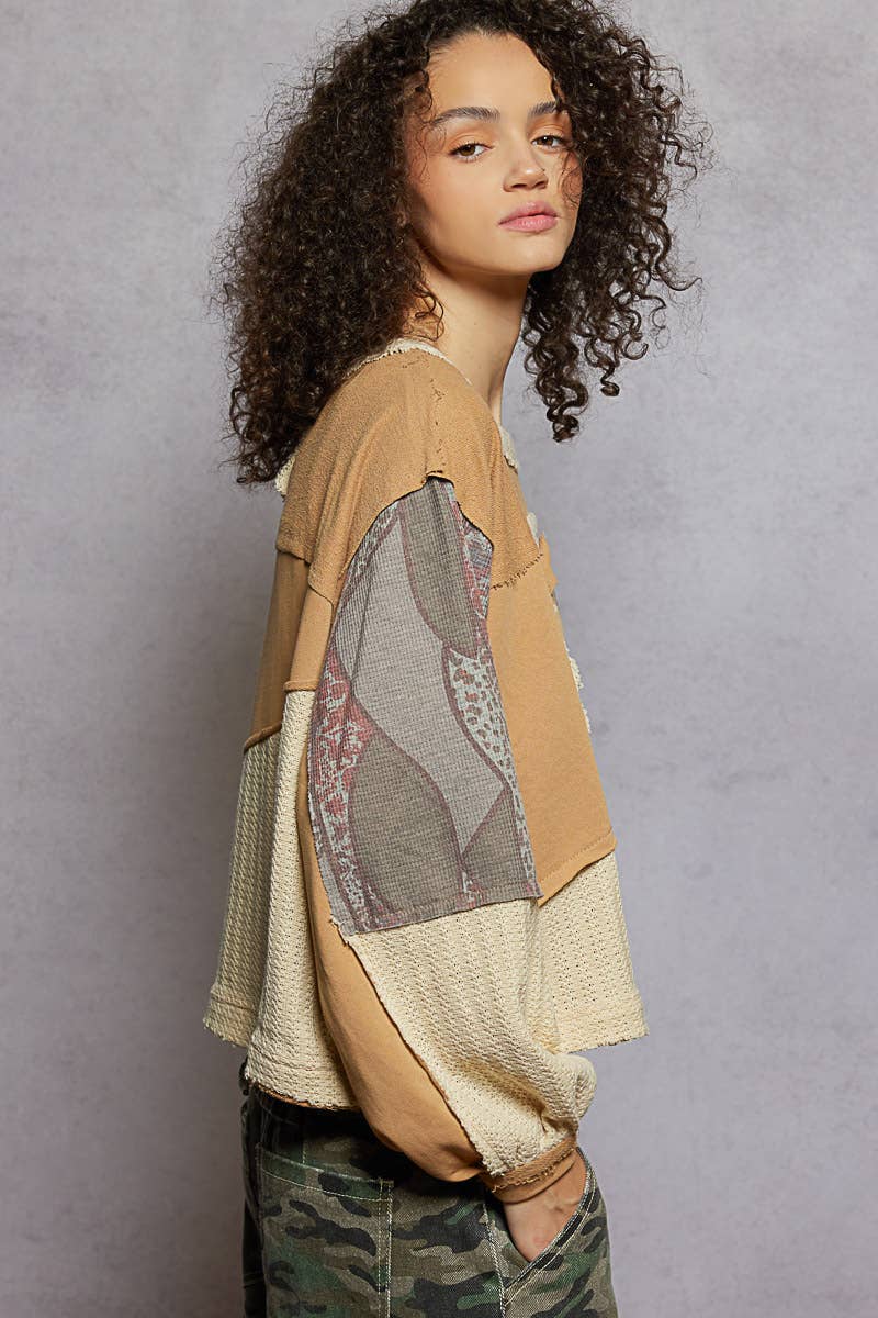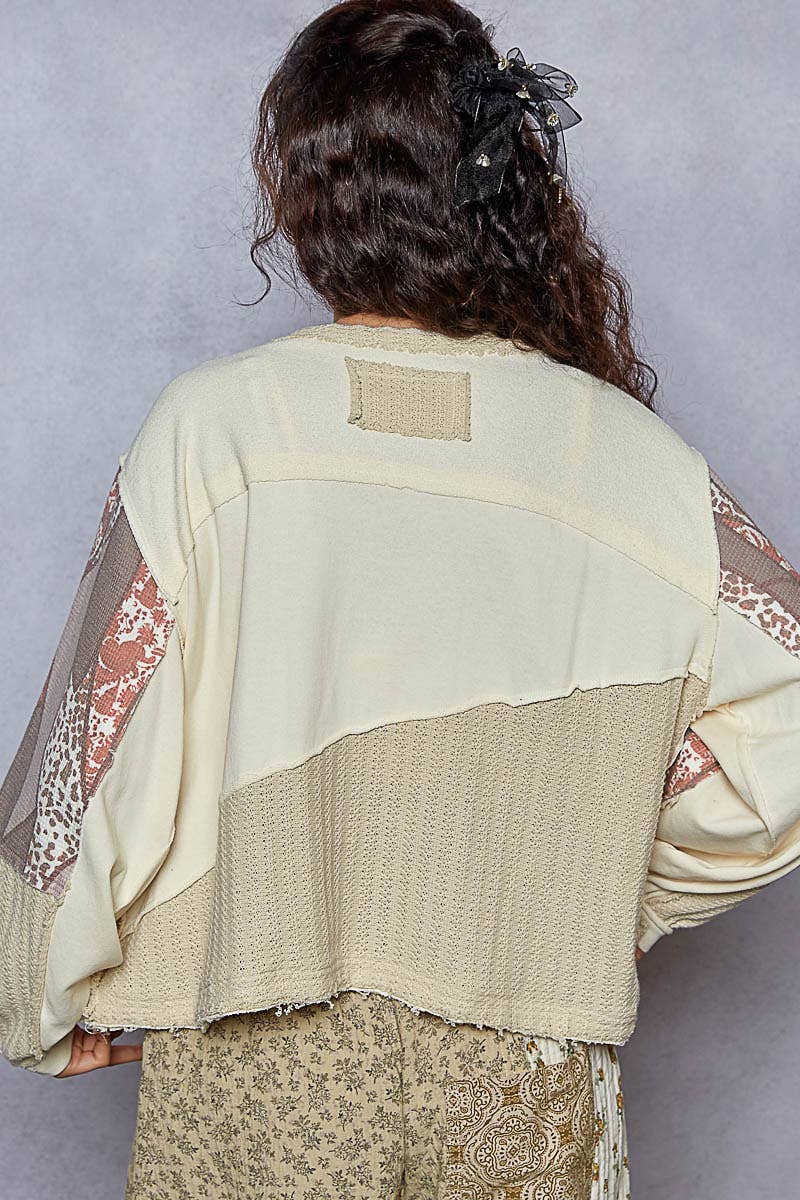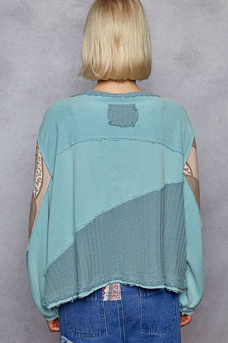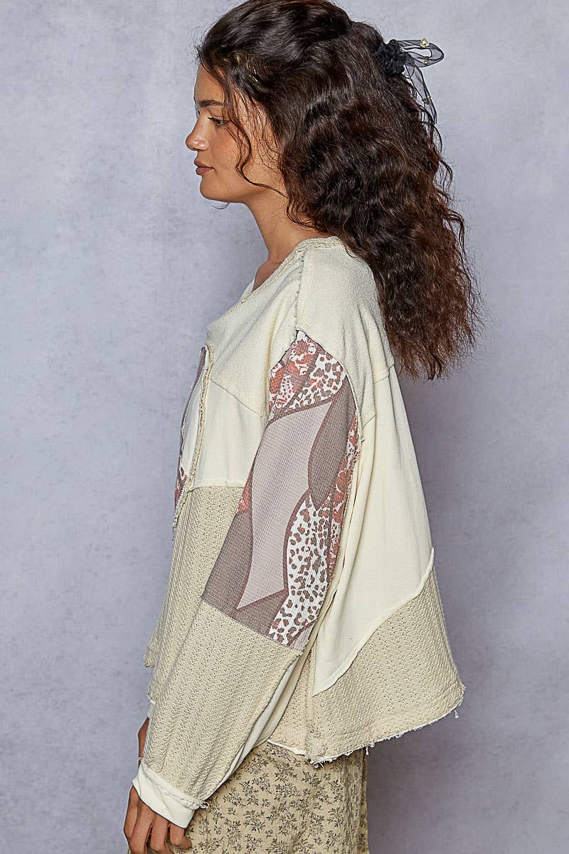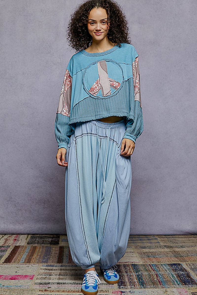 Designed in round neck long sleeve oversized fit French terry top, printed thermal, cut and sew pullover sweater with peace emblem patch work and frayed edge details.