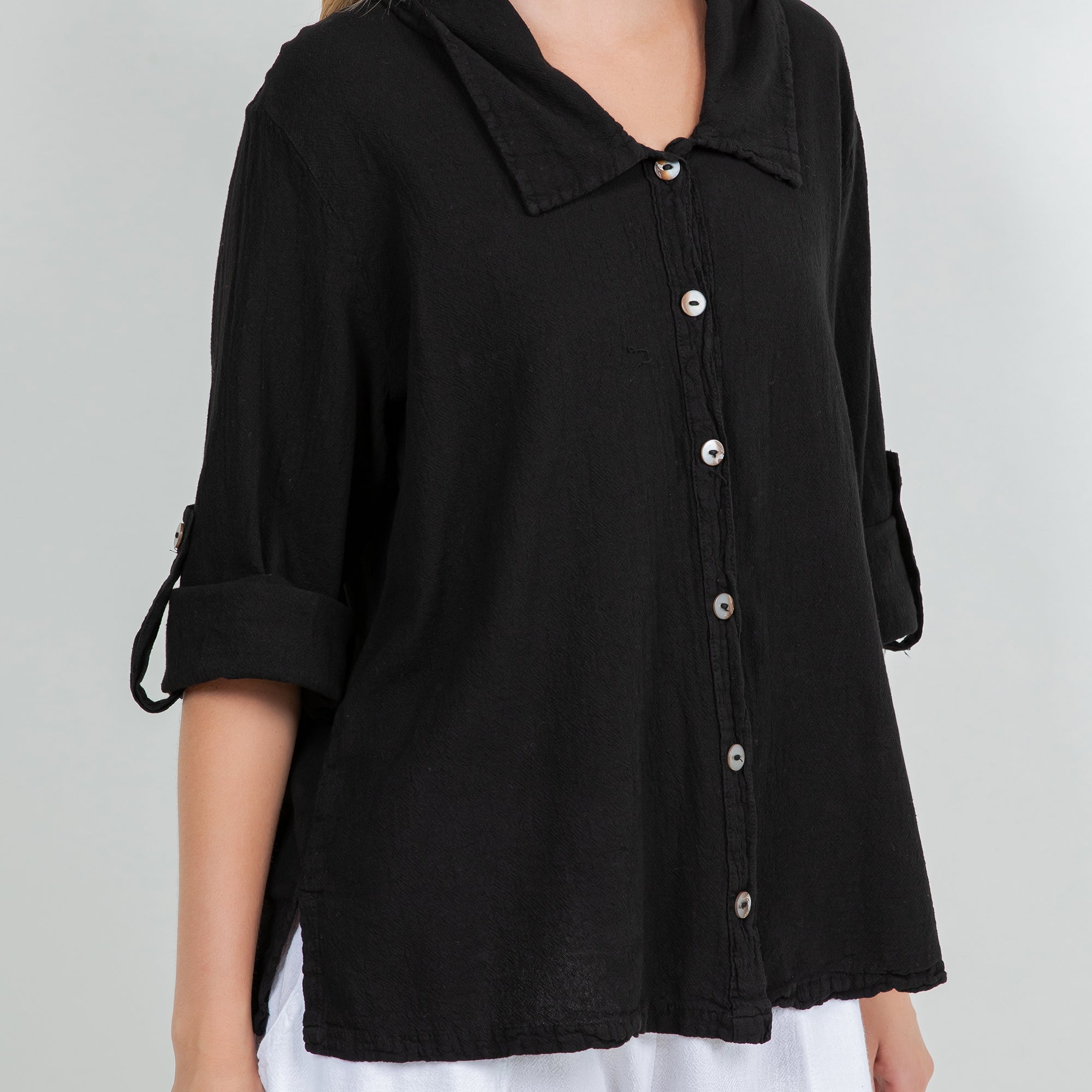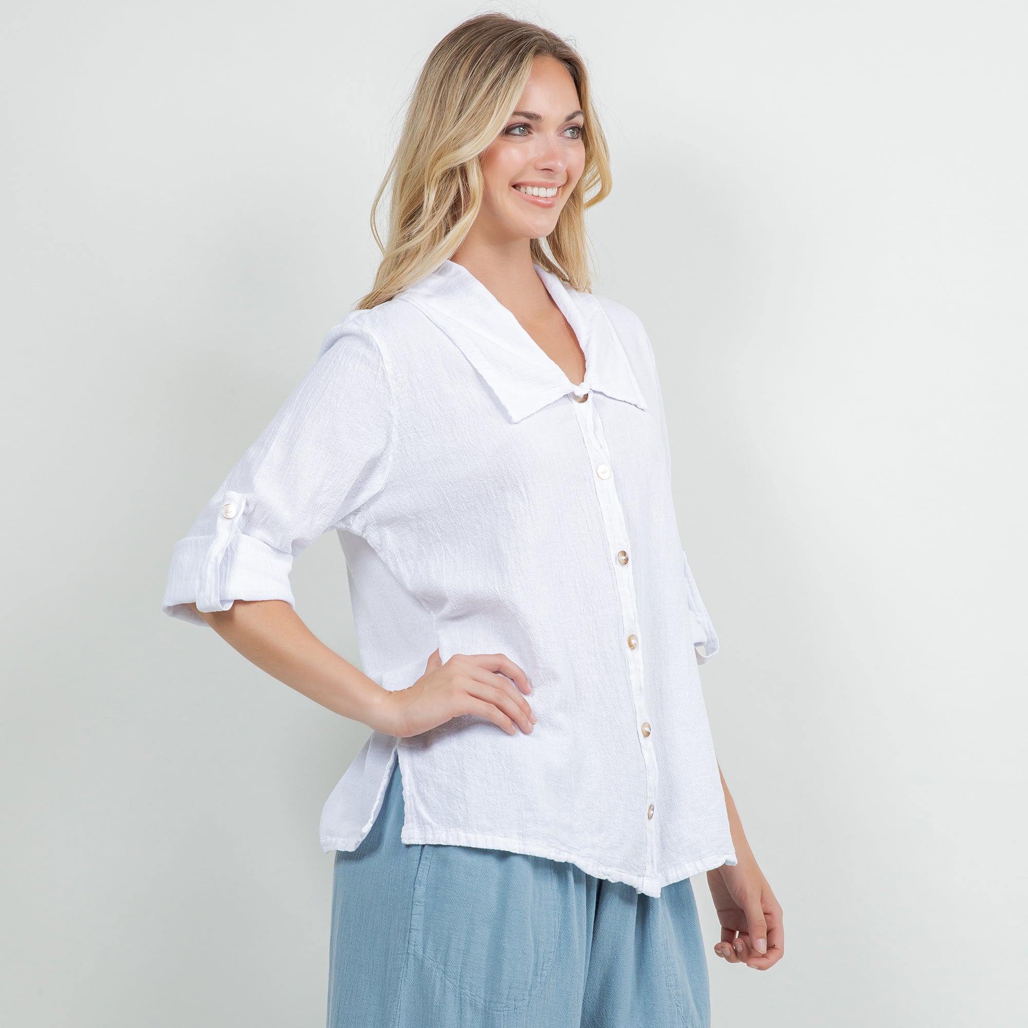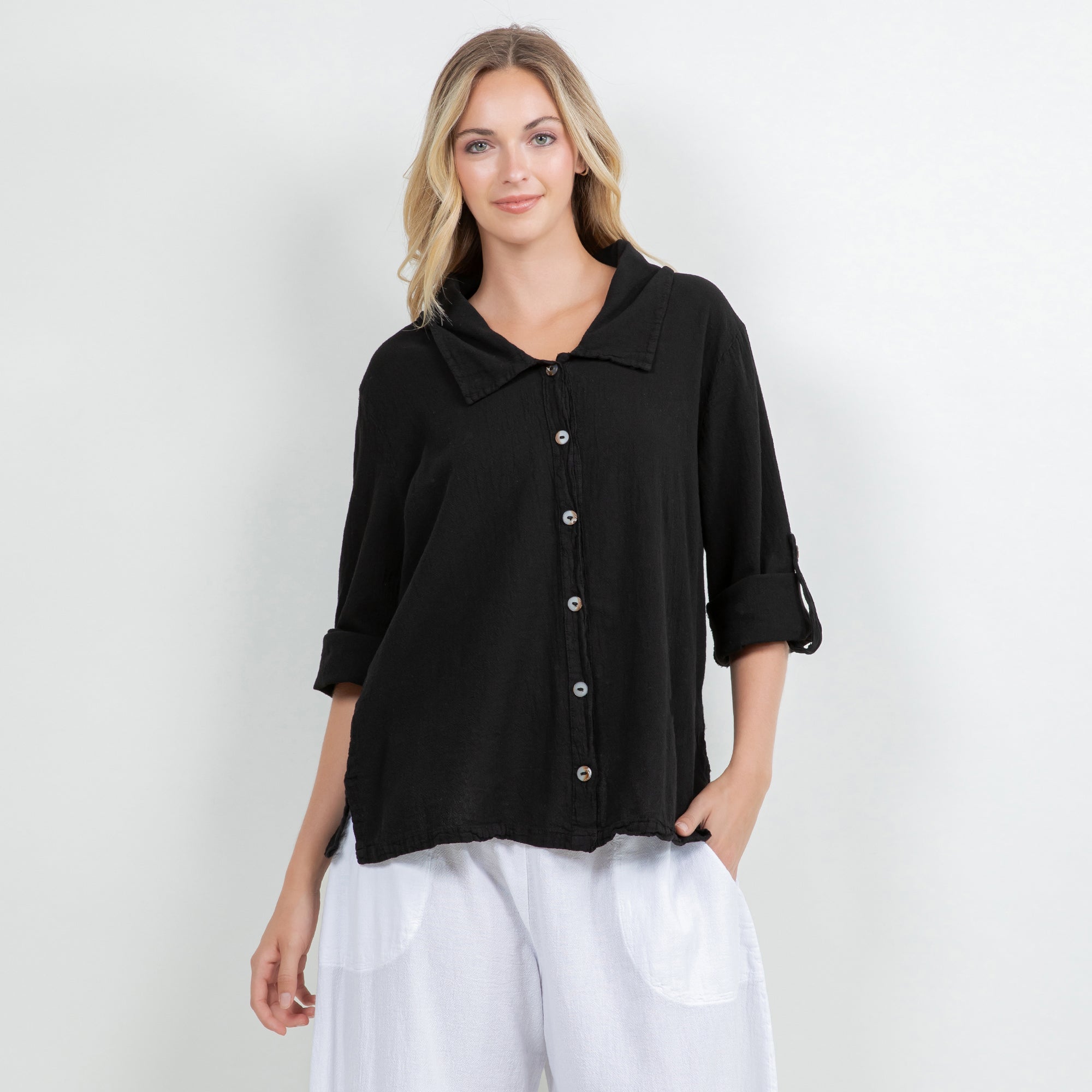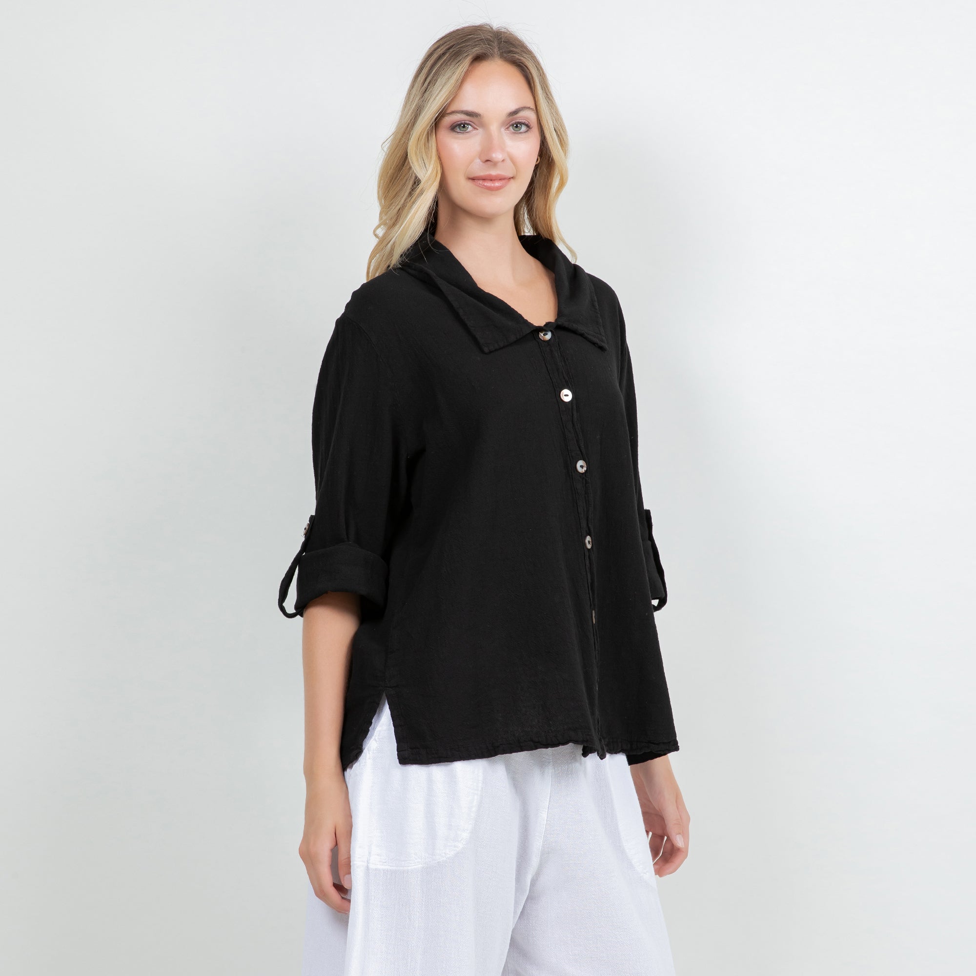 Sloanne Button-Up is detailed with a Chelsea collar and 3" slits on the side. The sleeves have a button tab; you can choose if you want the sleeves full length button it up. This top can be styles buttoned up or open with a tank!