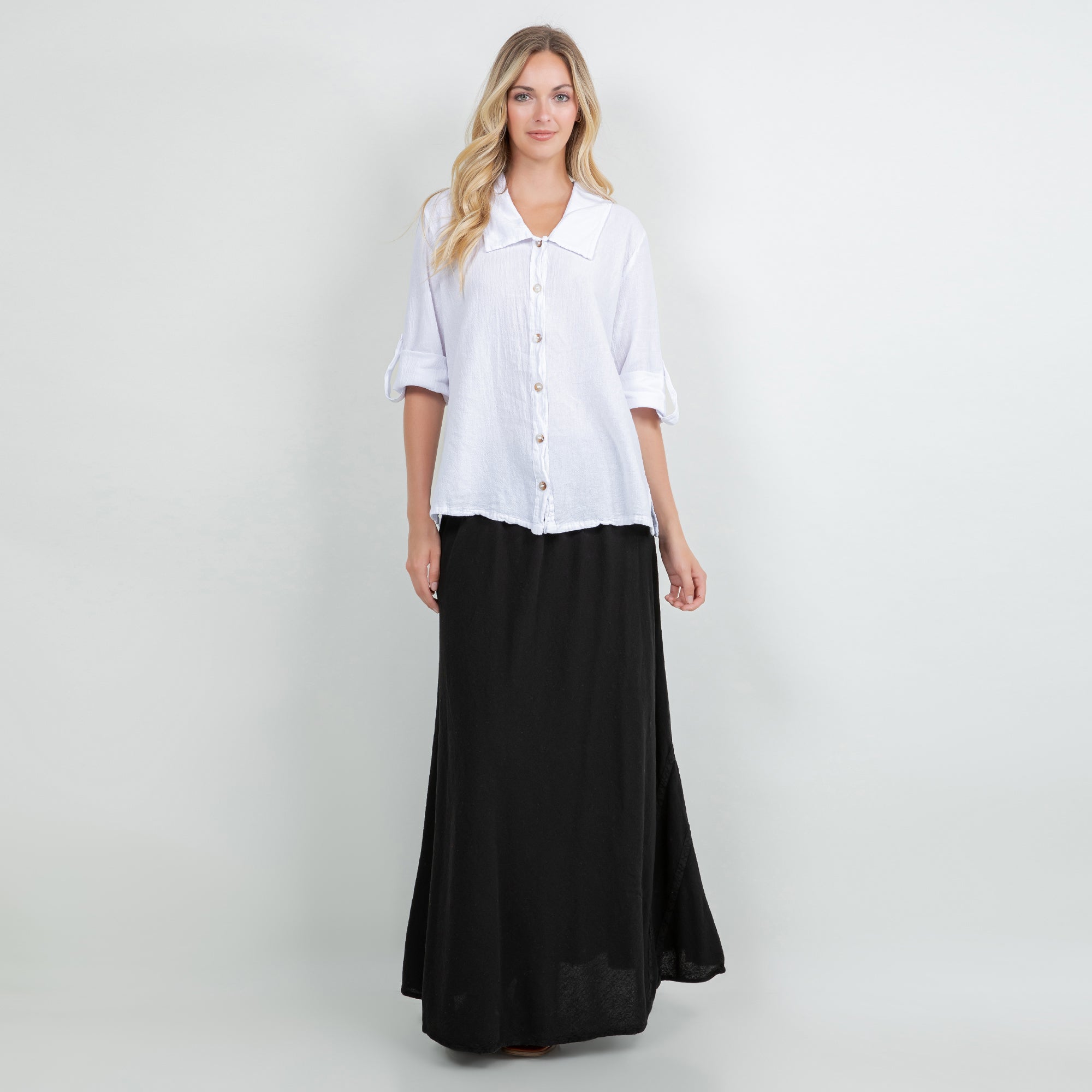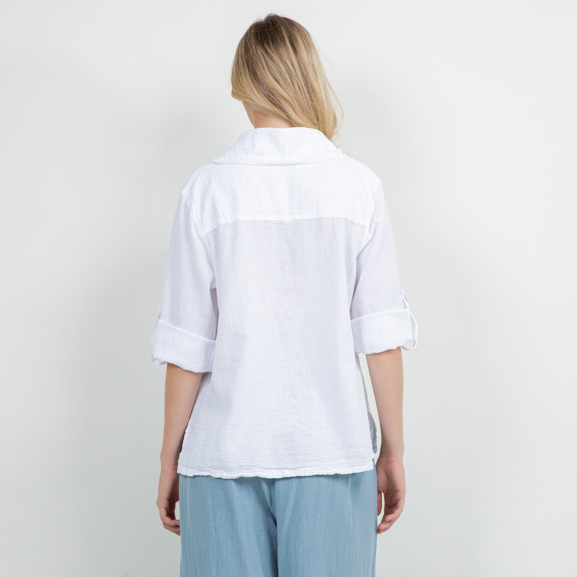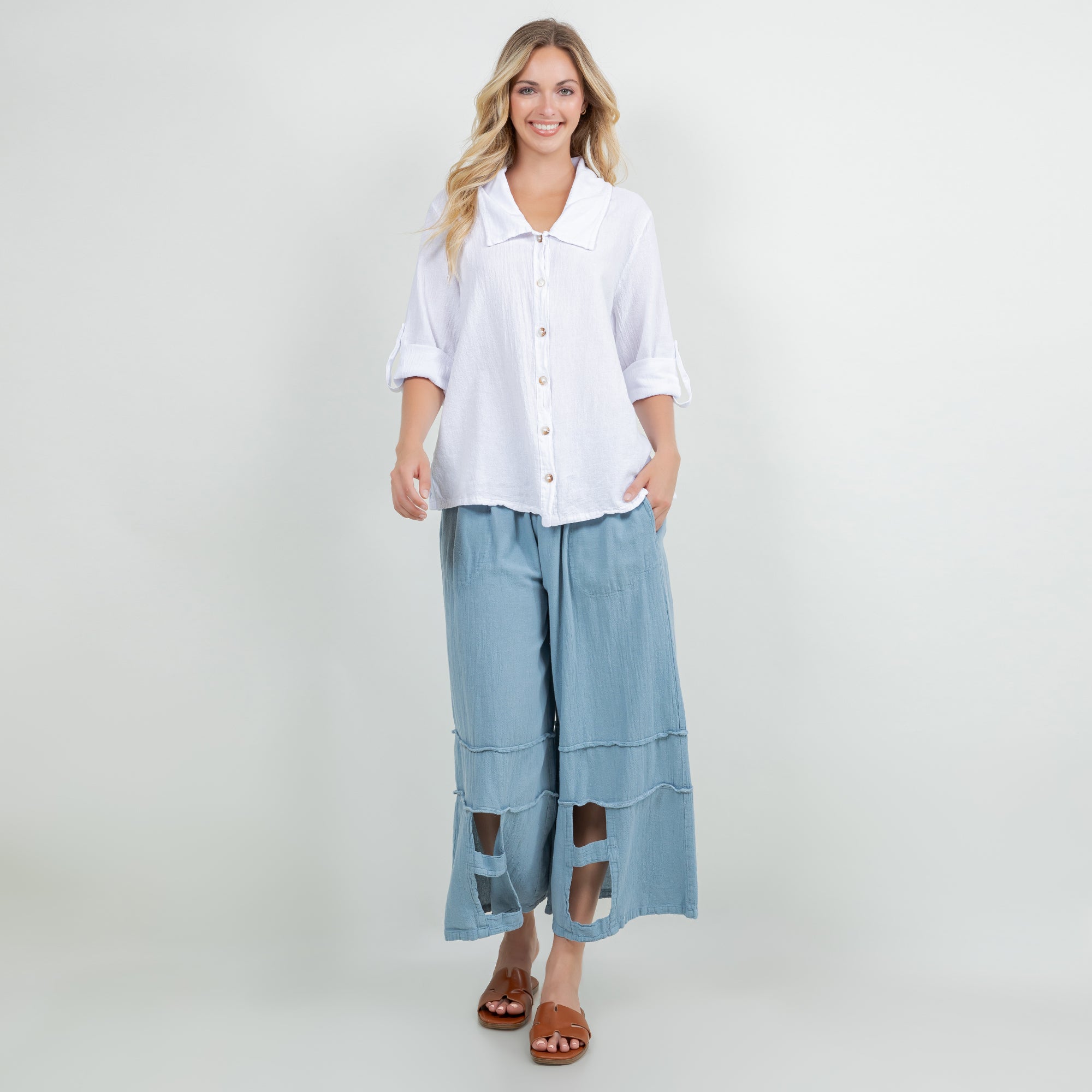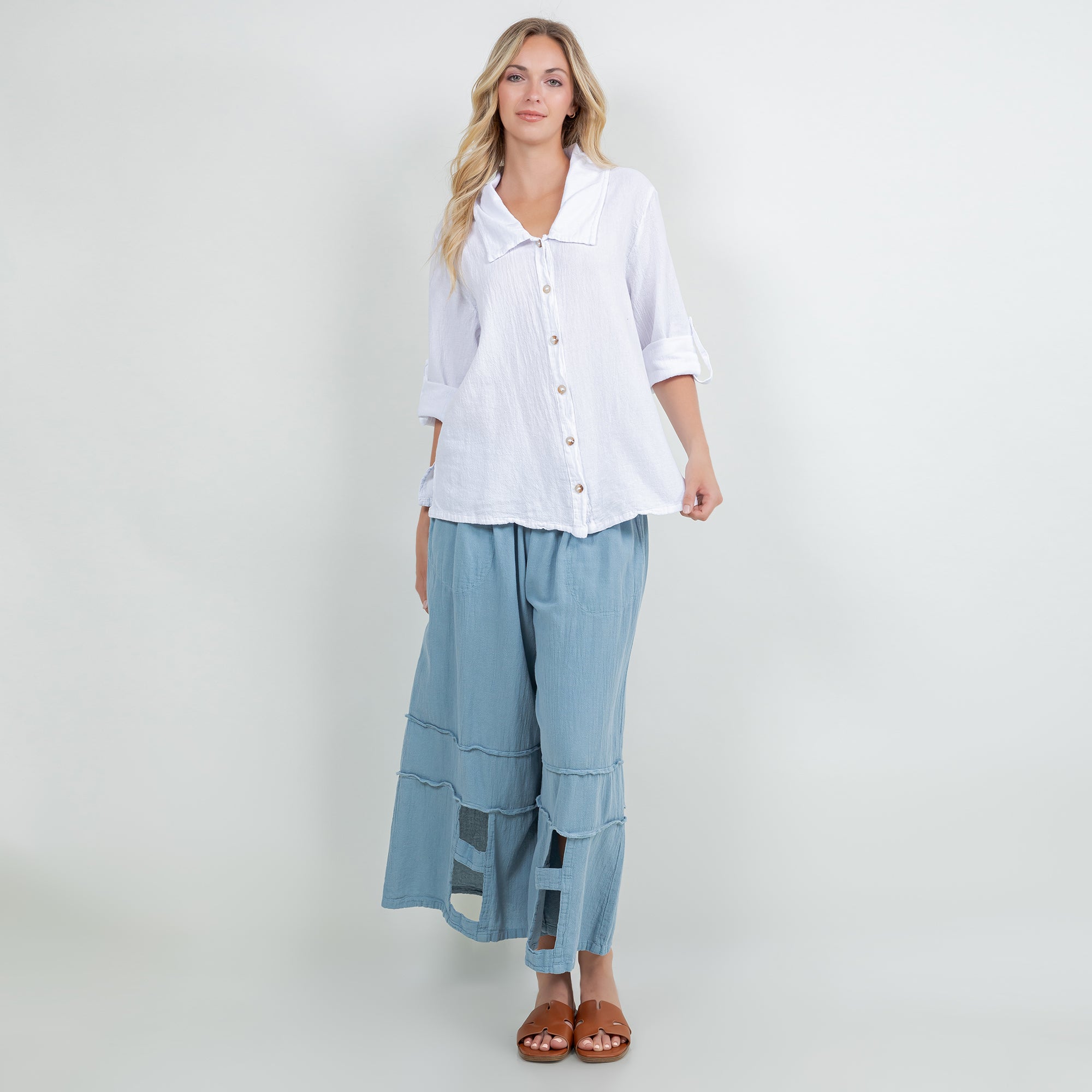 Sloanne Button-Up is detailed with a Chelsea collar and 3" slits on the side. The sleeves have a button tab; you can choose if you want the sleeves full length button it up. This top can be styles buttoned up or open with a tank!