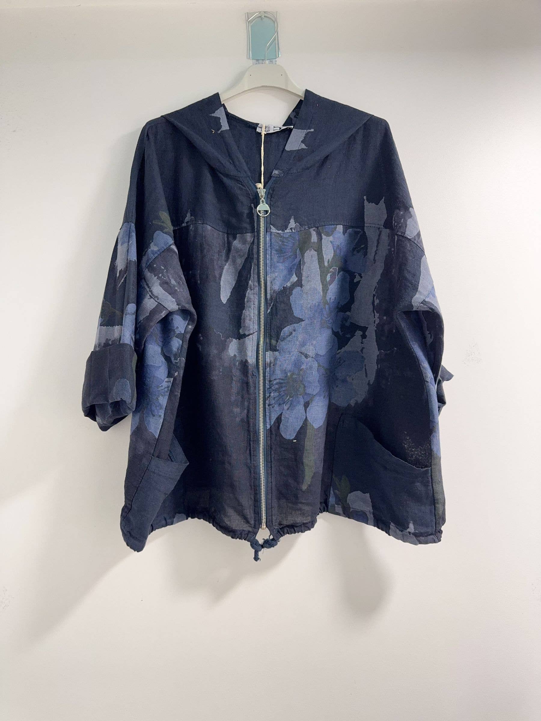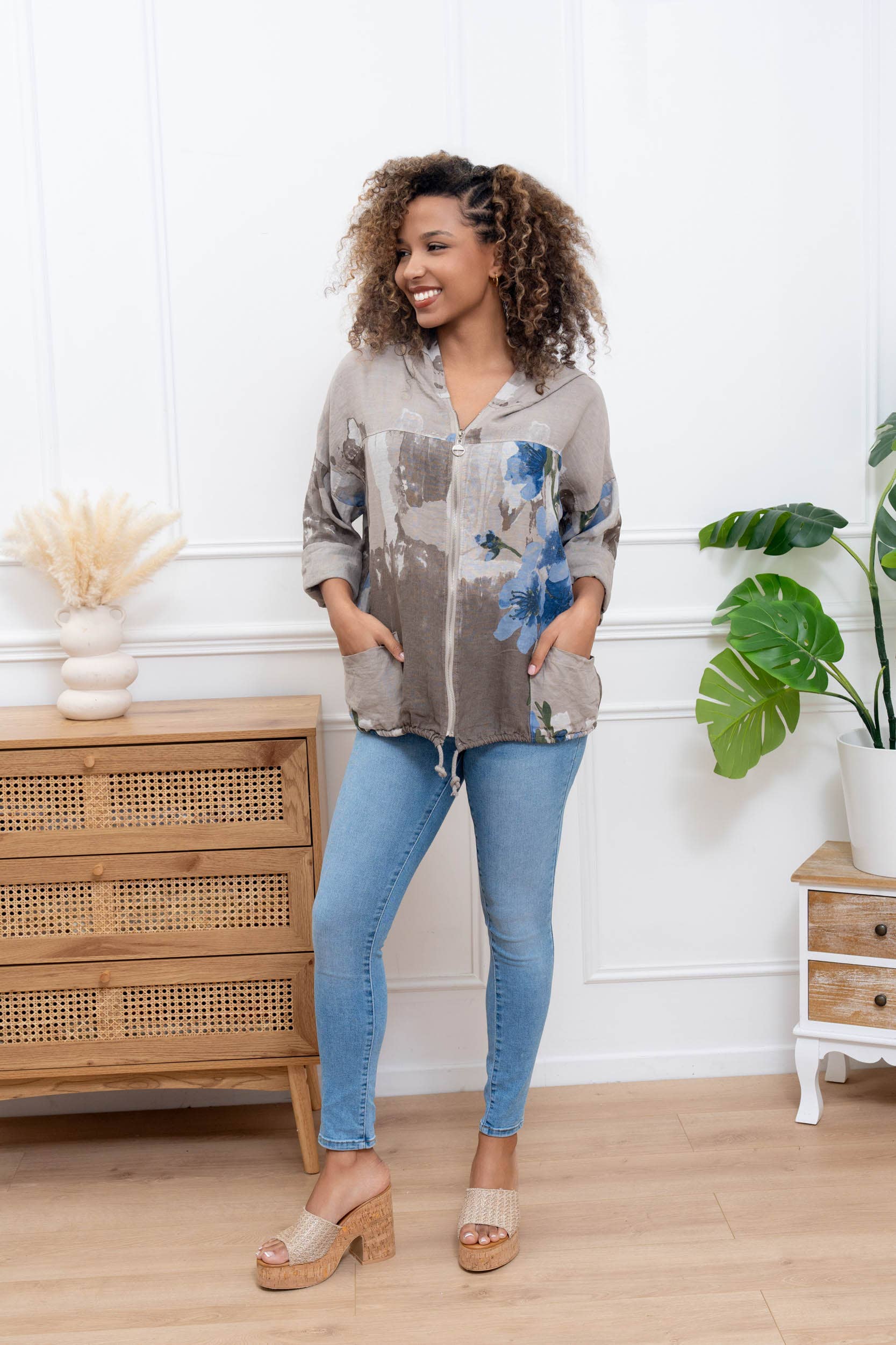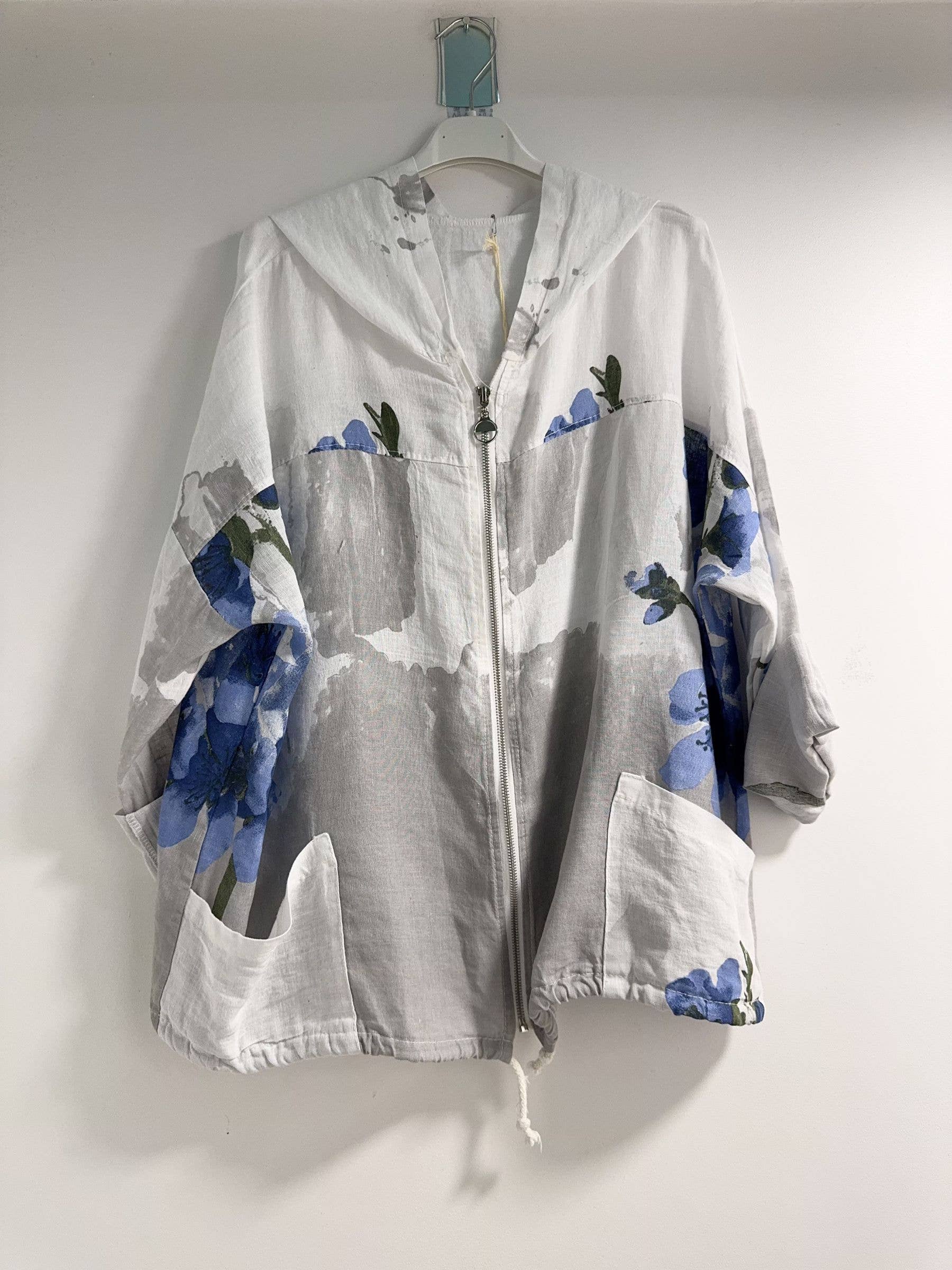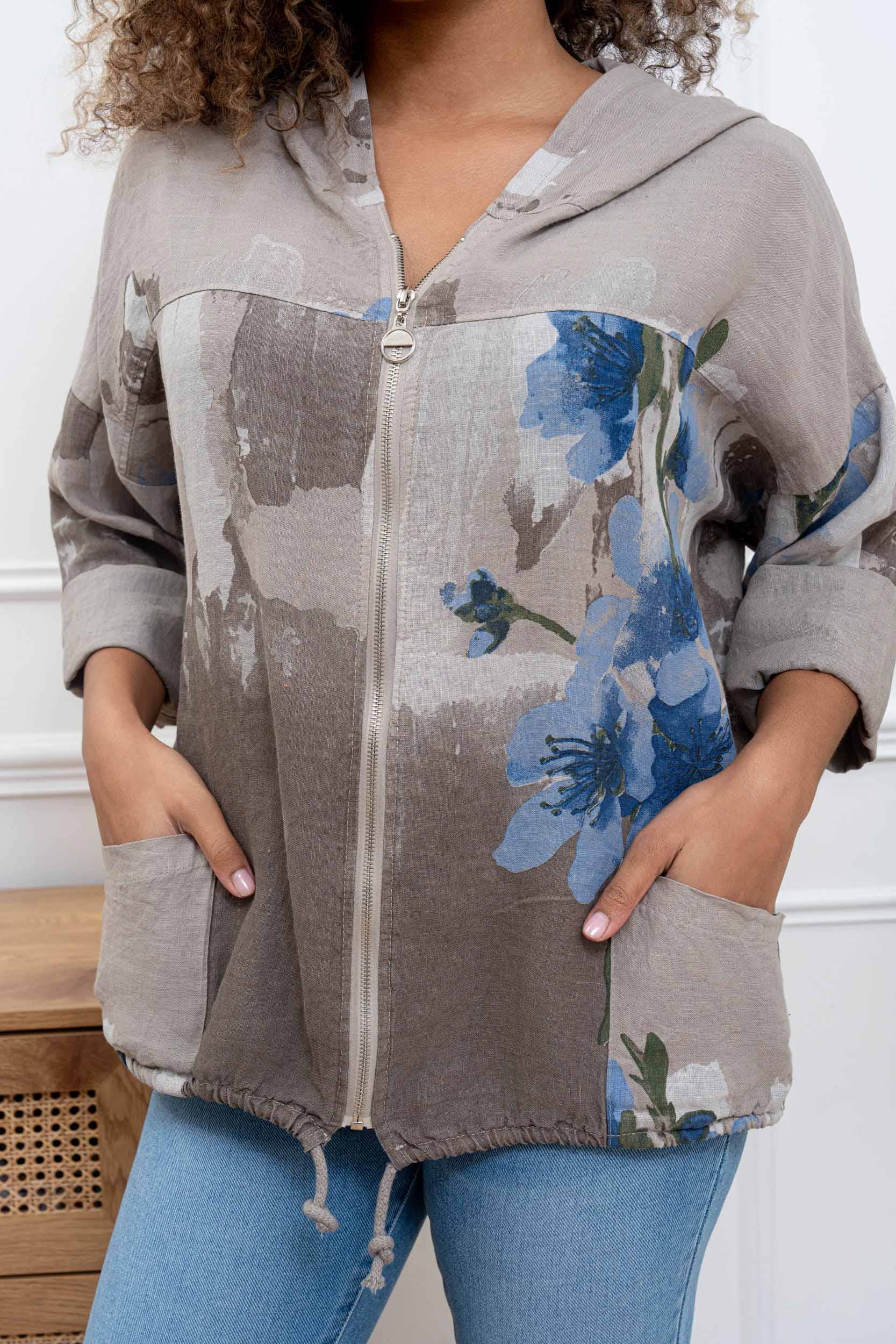 Long-sleeve jacket with hood, zipper, and floral printed linen pockets. One size 38-44 (M-XXL)