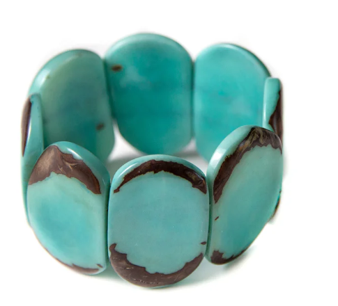 This oval-shaped bracelet made from the tagua nut with leftover grain comes in playful and fun colors!