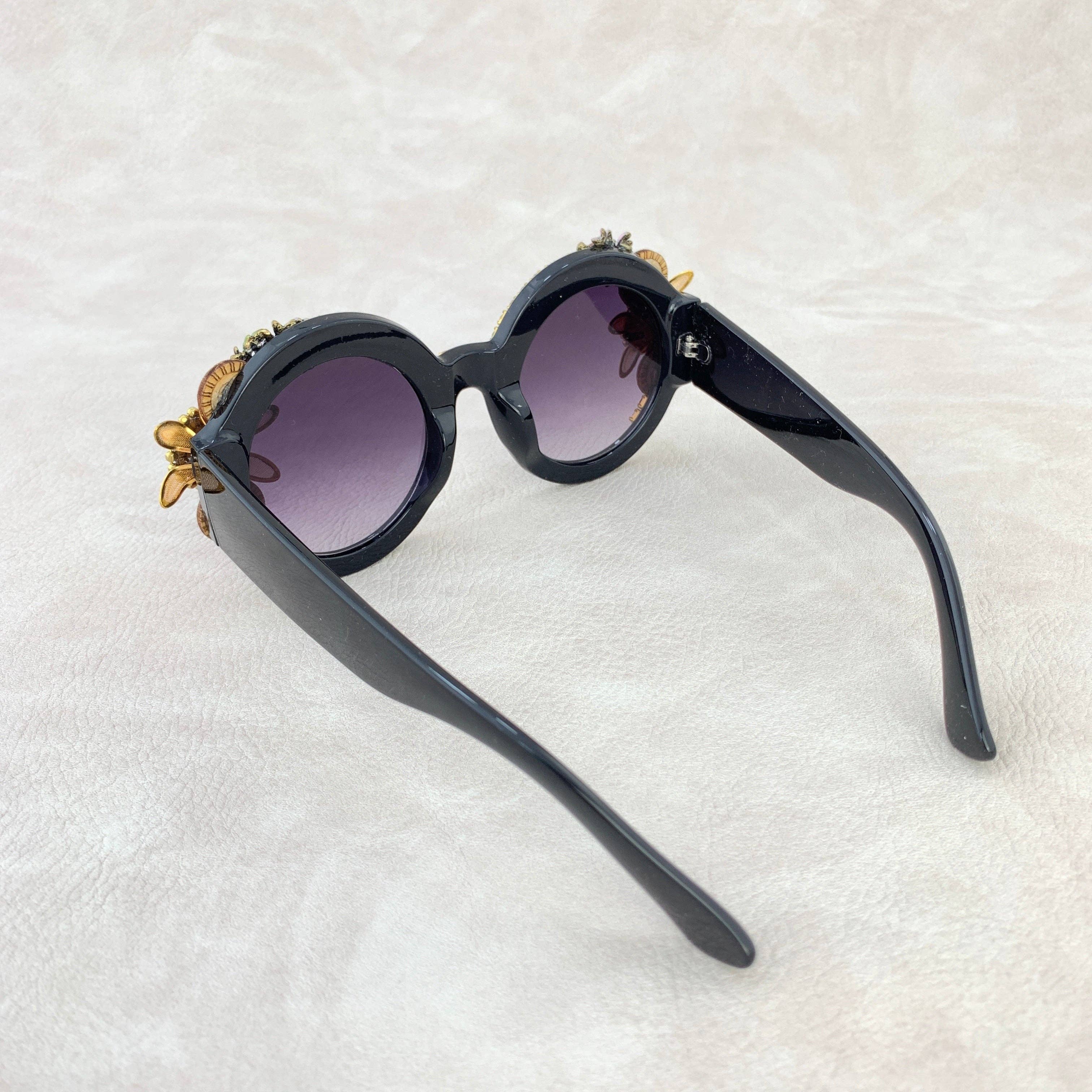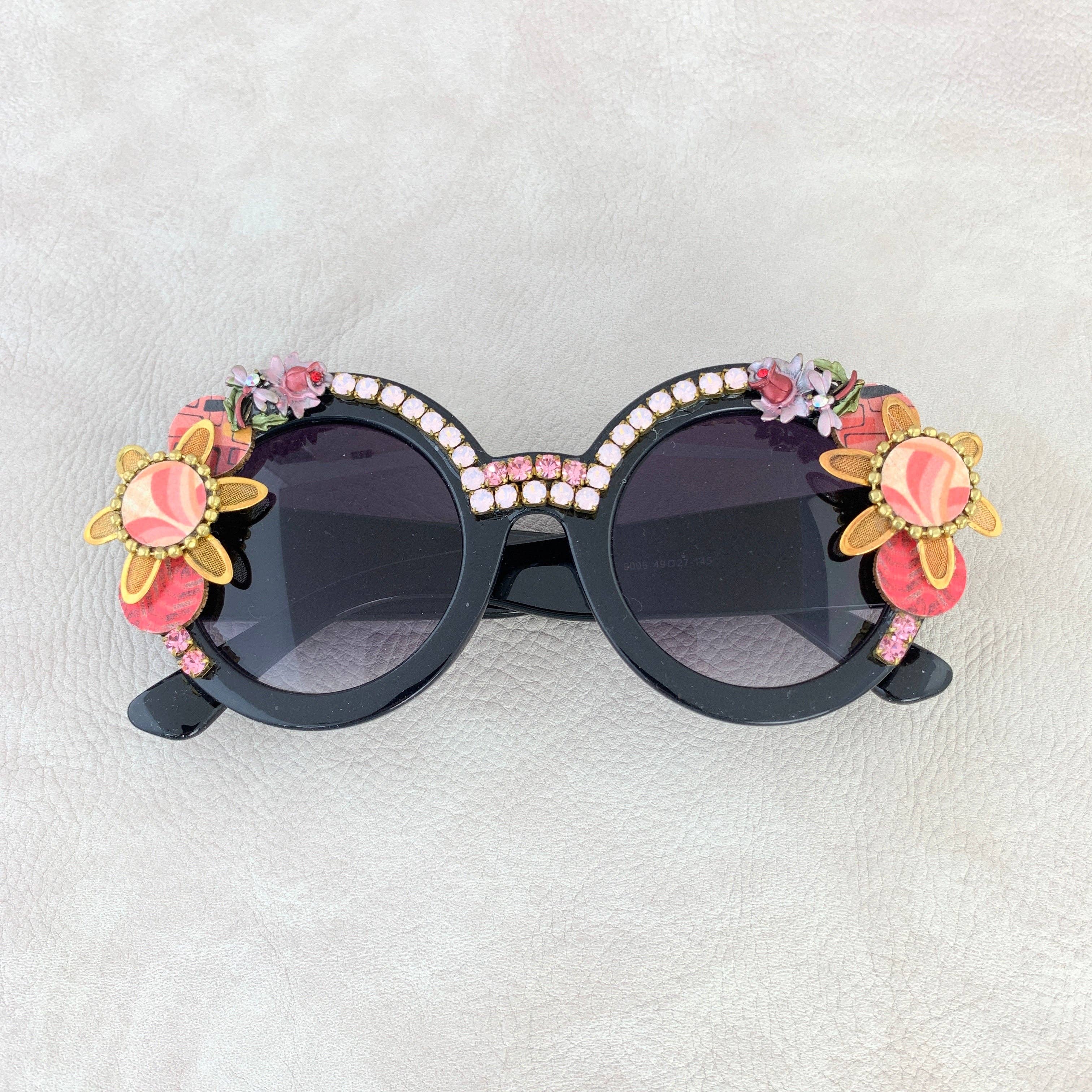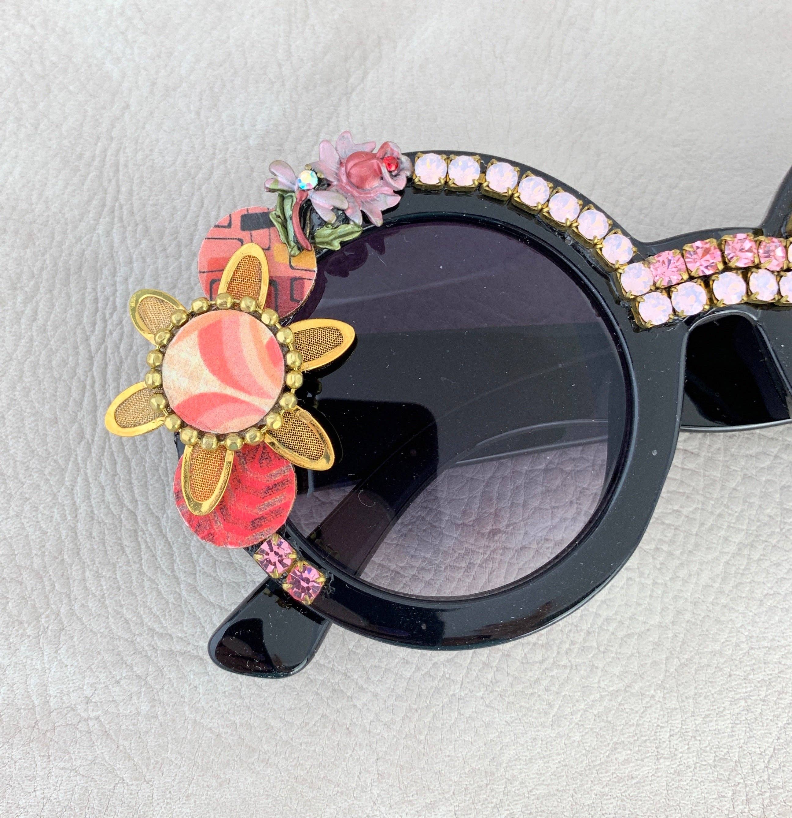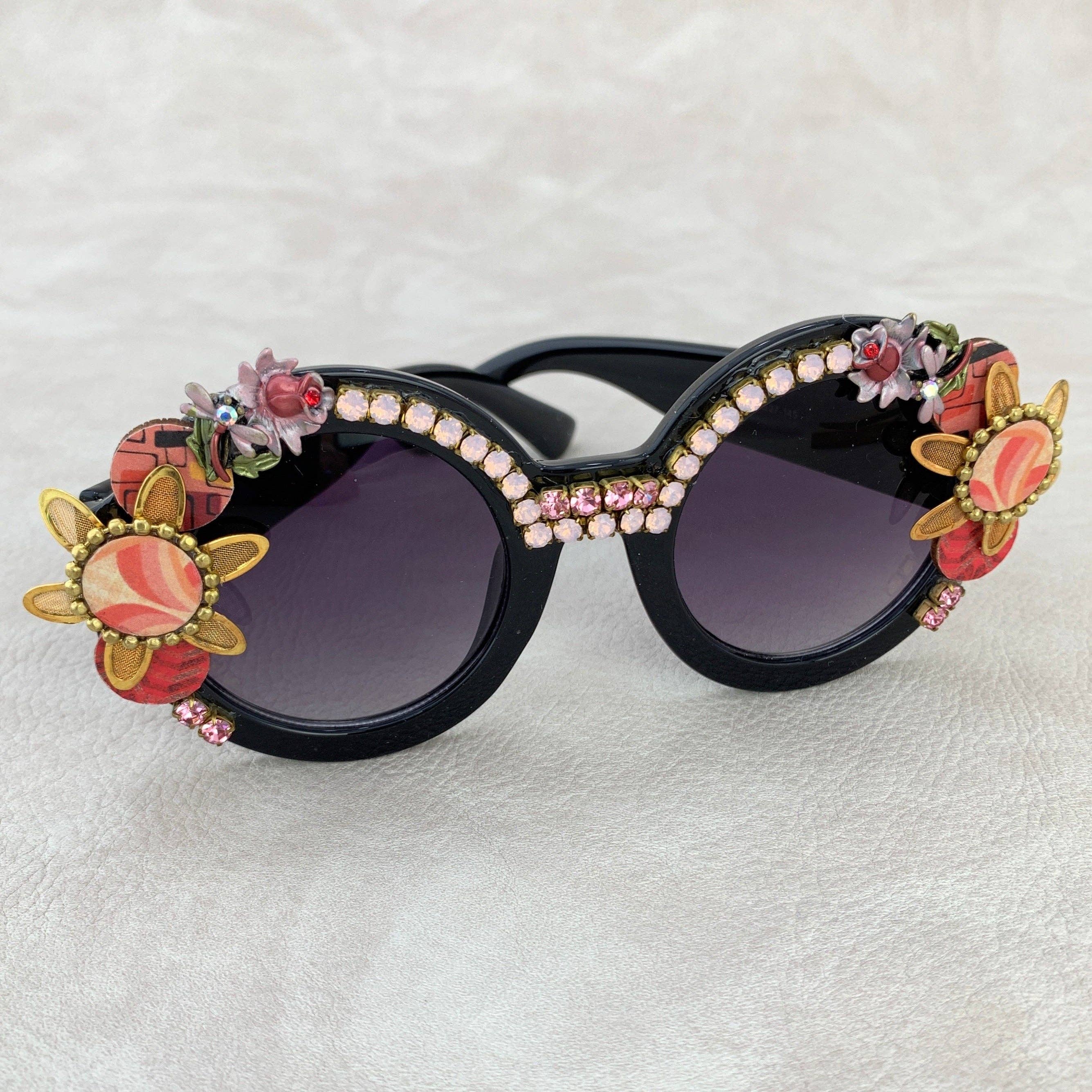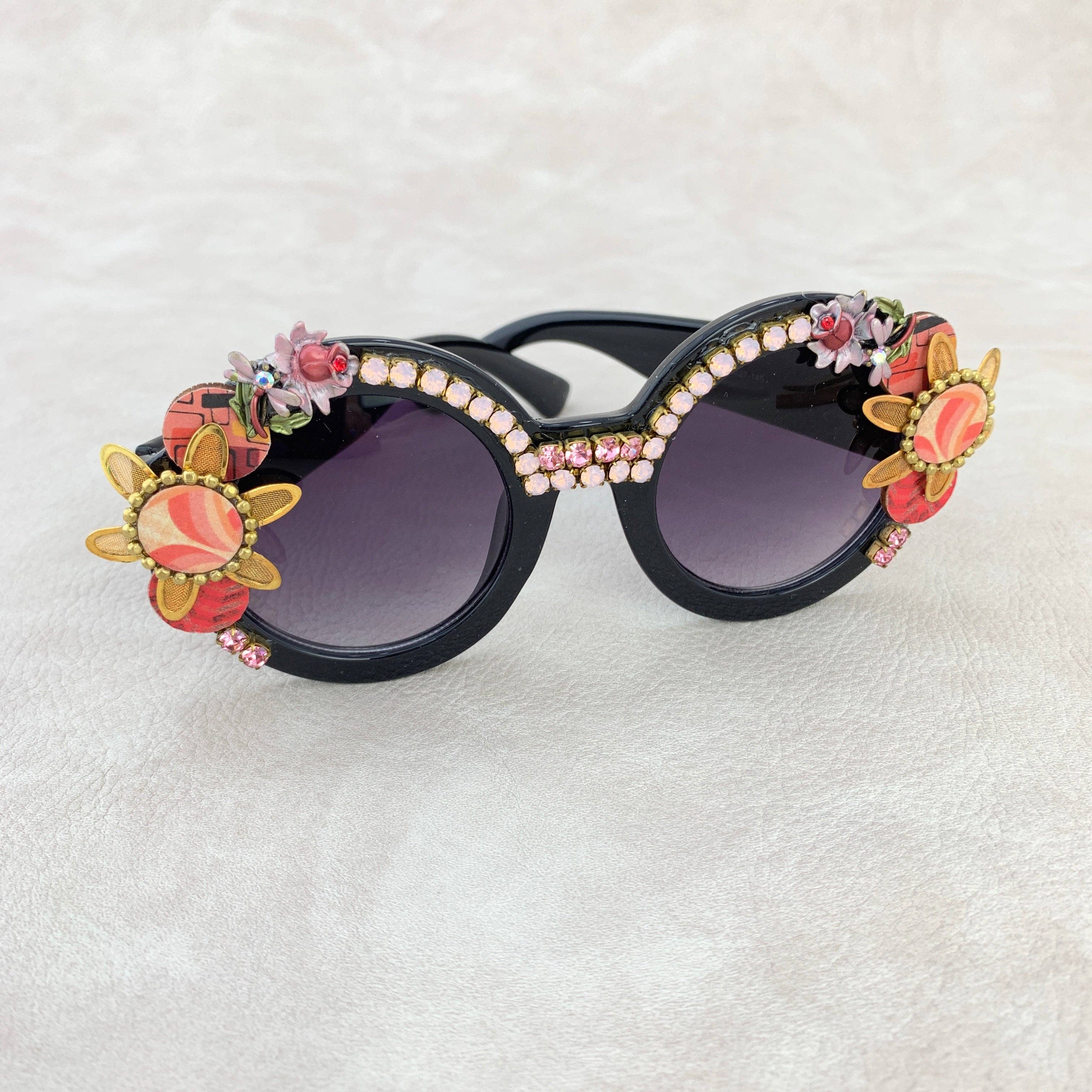 Another fabulously unique pair of embellished sunglasses from the Lenora Dame Sunnies collection! Make a statement in these round shiny black sunglass frames with black lenses. Inspired by Iris Apfel and her signature round black frames, these full of bling sunglasses are embellished with a mix of design elements. Wooden discs decoupaged in mid-century textile prints, floral metal components and Swarovski rhinestones that bring the bling making these a truly unique pair of festival sunglasses! Visit our sunglass section for other Lenora Dame Studio original sunglasses in creative designs incorporating fruits, bees, ladybugs, fabric buttons, lots of bling of course and so many other unexpected designs. Handmade in USA.