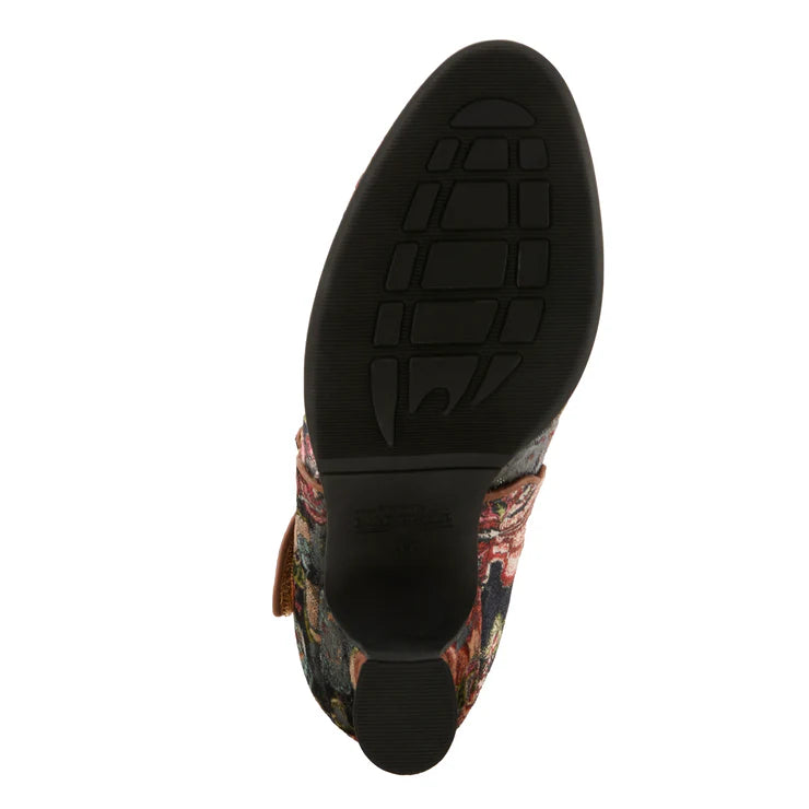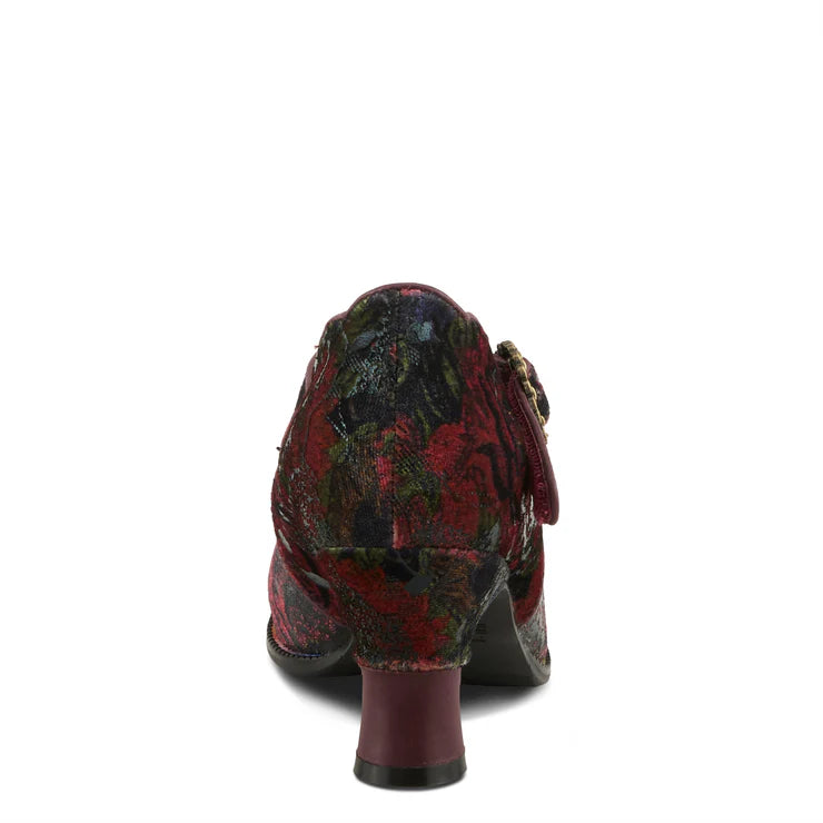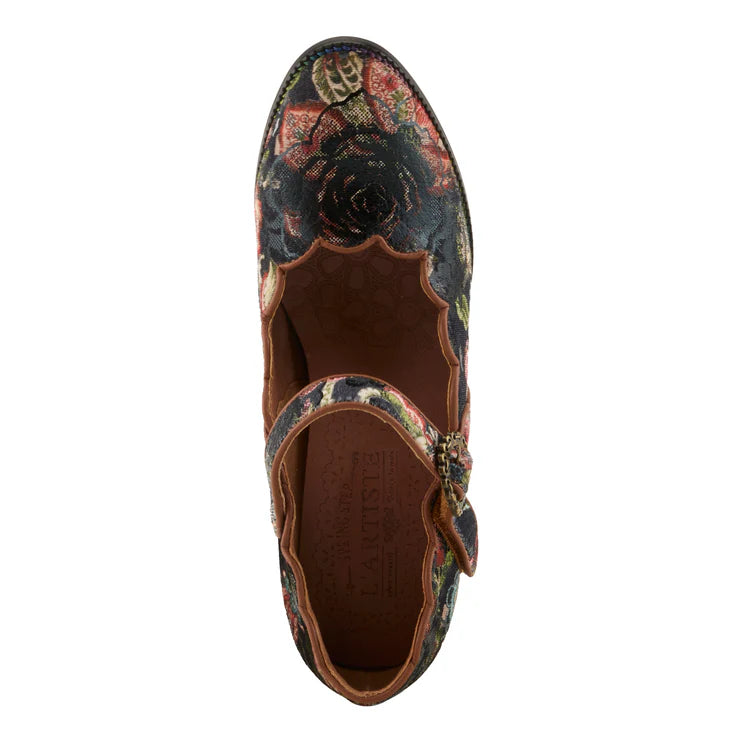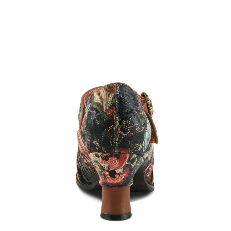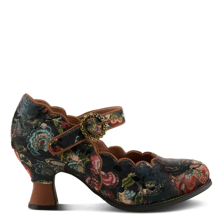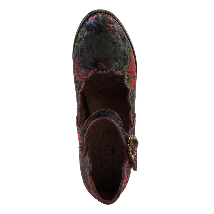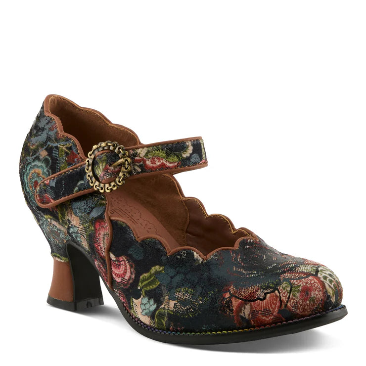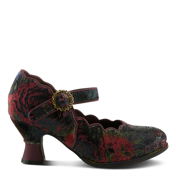 Indulge in vintage-inspired elegance with this stunning baroque-style Mary Jane. Crafted with a luxurious velvet and leather combo upper, this shoe features an artistic blend of colors, textures, and scalloped edges for a truly unique look. The ornate, antique-style buckle complements the adjustable hook-and-loop closure, offering both style and convenience. A modest, sculpted heel provides a graceful lift while ensuring comfort throughout the day. Perfect for adding a whimsical yet sophisticated touch to any outfit, this shoe is a wearable piece of art designed for the modern, trend-forward woman.