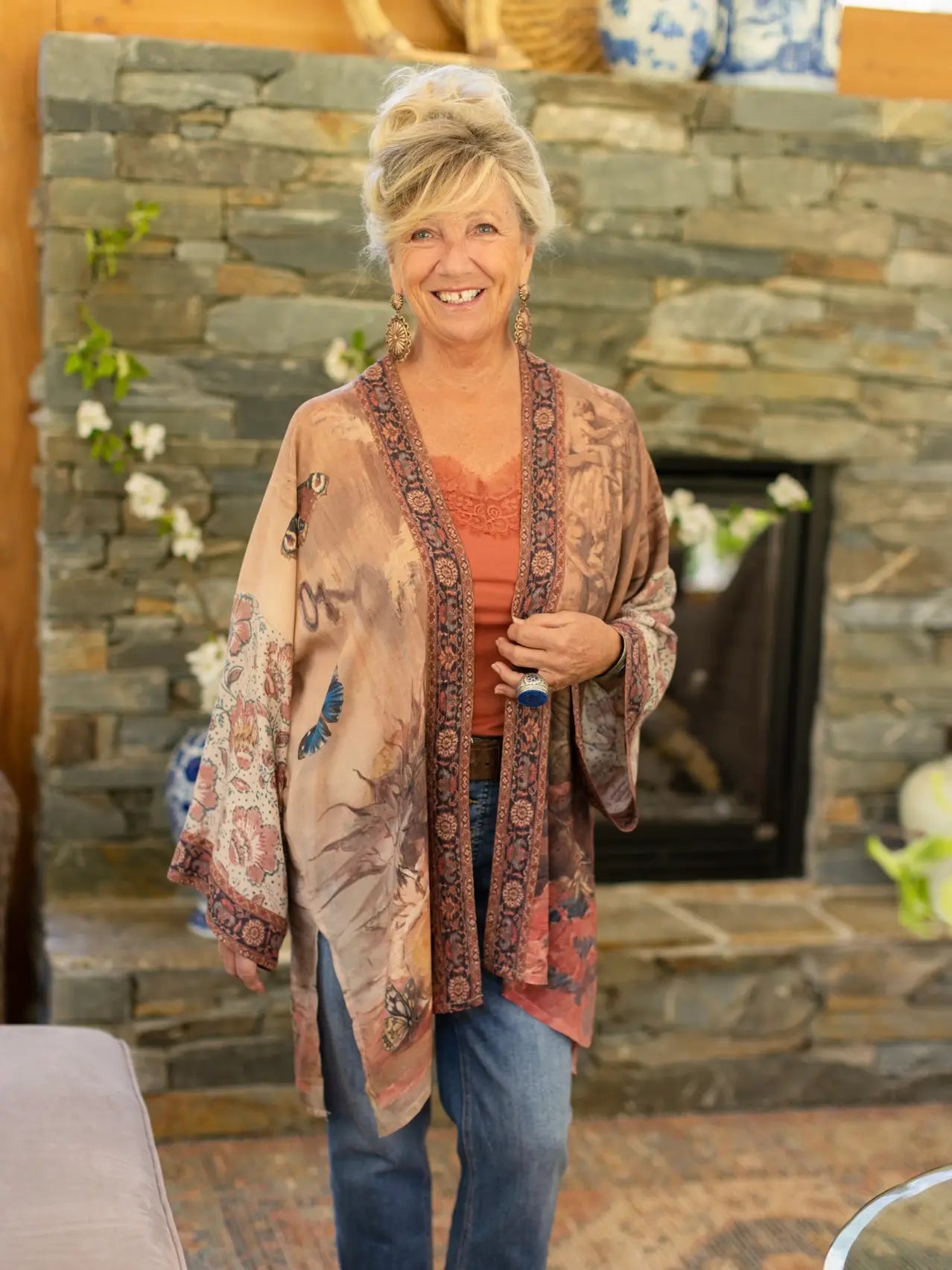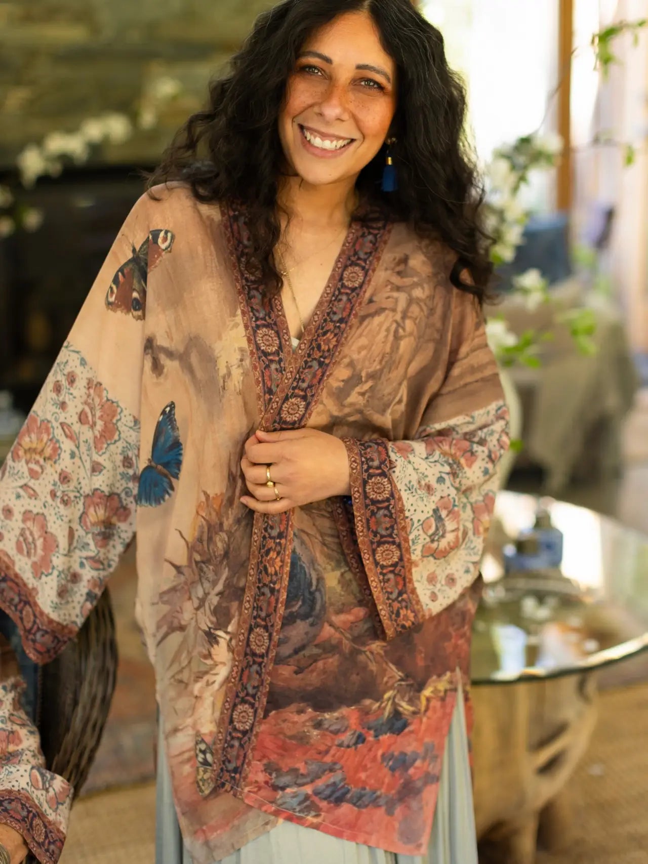 Exotic, painterly, and chic — this piece is for the travellers and dreamers who love to collect stories wherever they roam. We brought together a beautiful mix of prints that evoke the rich texture of a tapestry. The watercolour painting with its elegant vase and dried sunflowers was done by Dutch artist Maria Vos in 1879. We mixed Vos’s work with several other art pieces, including a late 1700’s paper block-print, a Turkish carpet, and the design from a French antique Chinoiserie plate. PS — this design was inspired by the timeless style of Danielle’s forever muse, her mom, Diana — who models with her in these pics :) 100% viscose (derived from plant fibres such as wood and bamboo). Machine wash gentle or handwash and hang to dry. Kimono meaurements: length 78cm, width (across back, underarm to underarm) 74cm. Diana our radiant blonde is 5'3 & Danielle our beautiful brunette is 5'2 for reference.