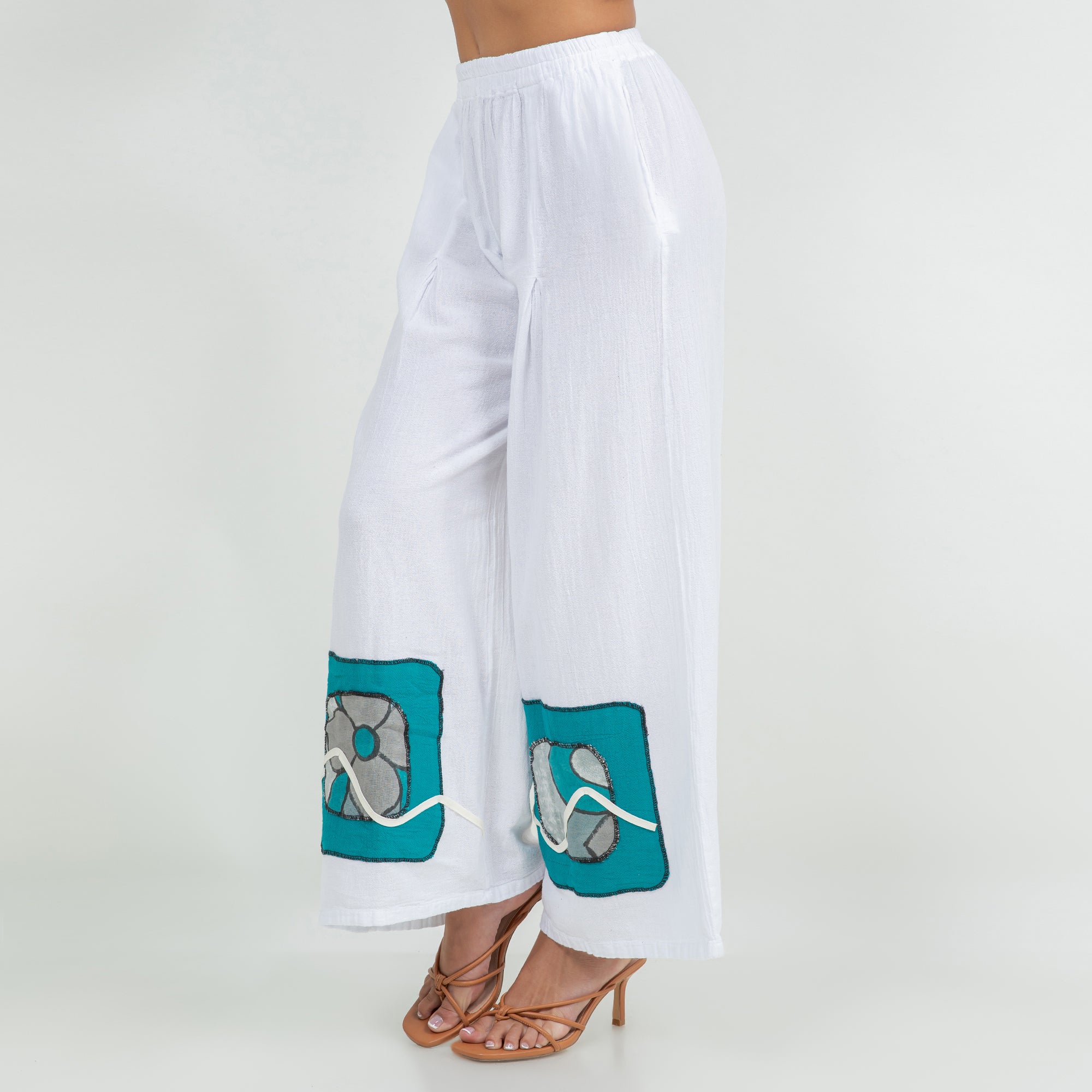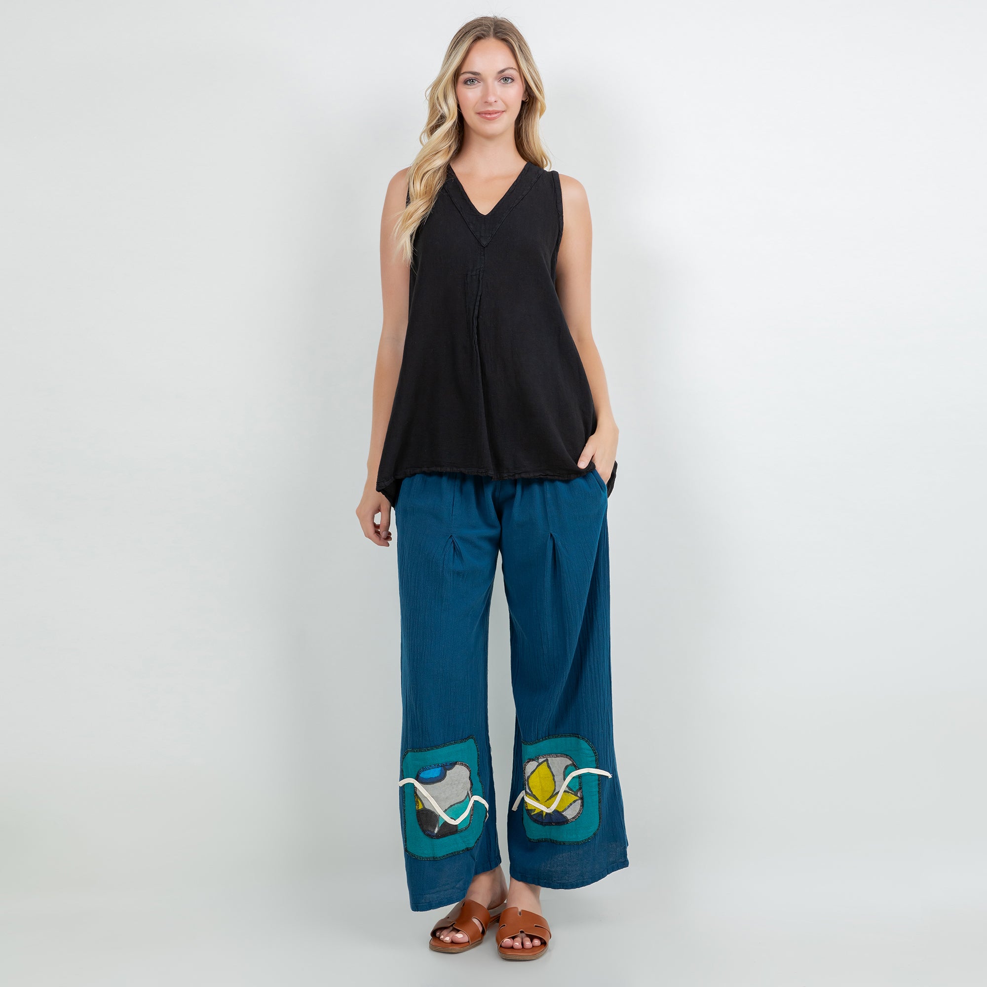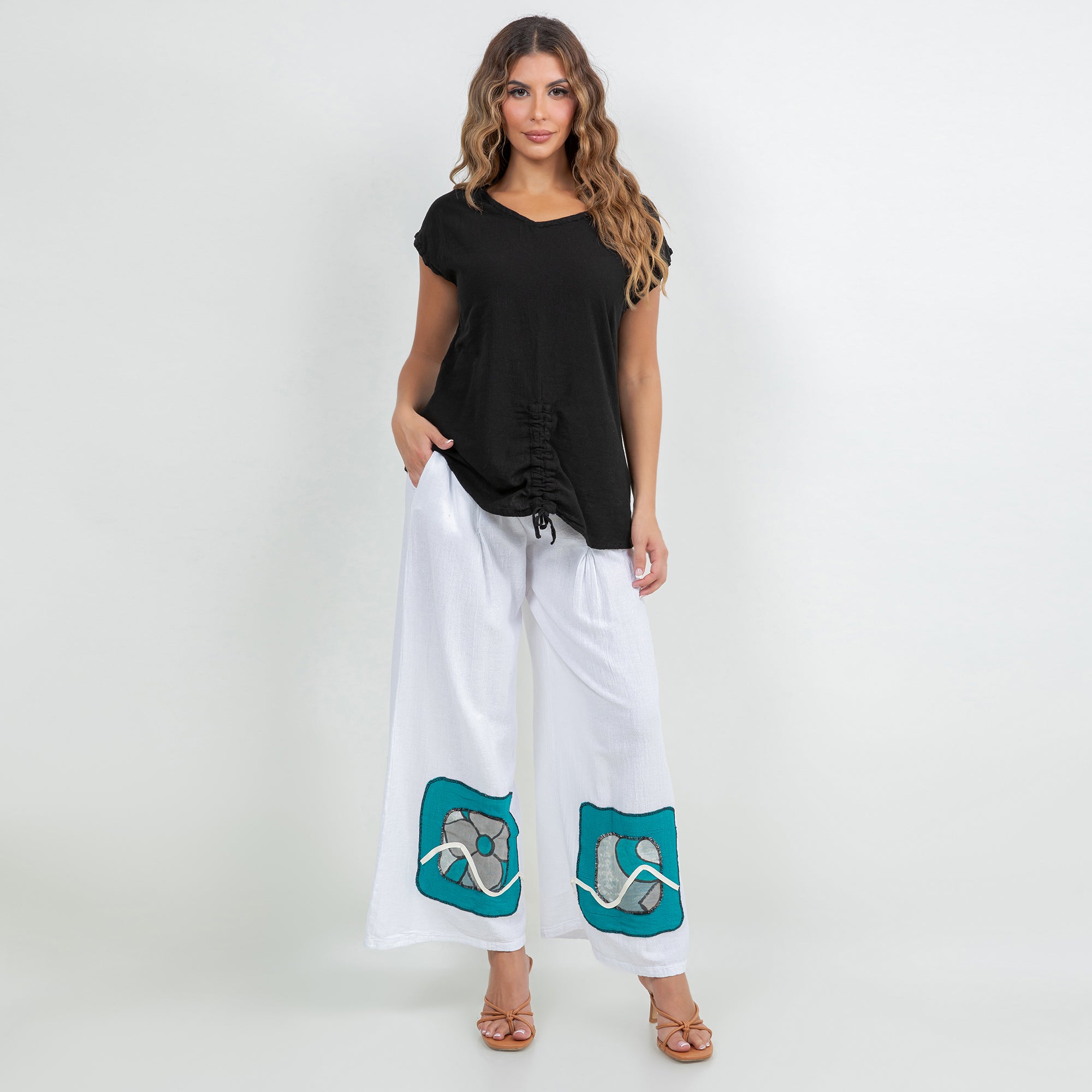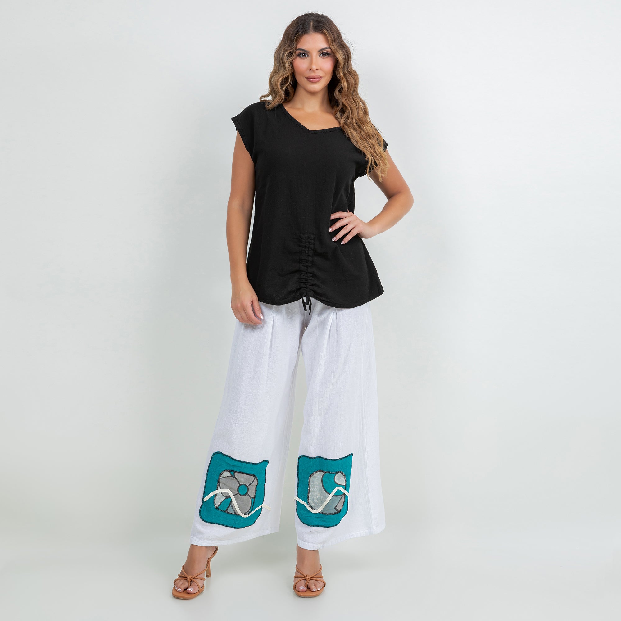 Chelle features a pleated thigh, and hand painted embellishments at the pant bottom. The colors added enhance the beauty of the product and allow the mixing and matching of additional colors.