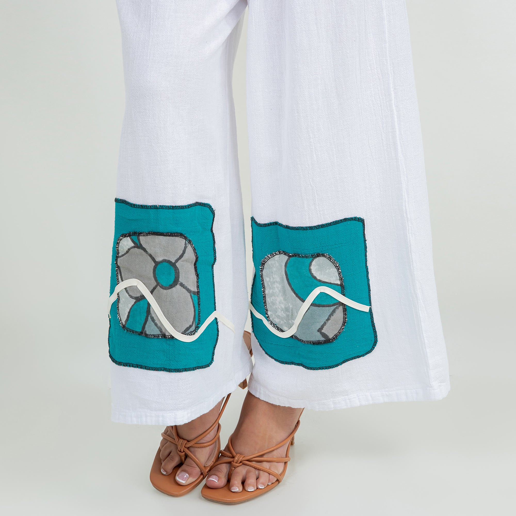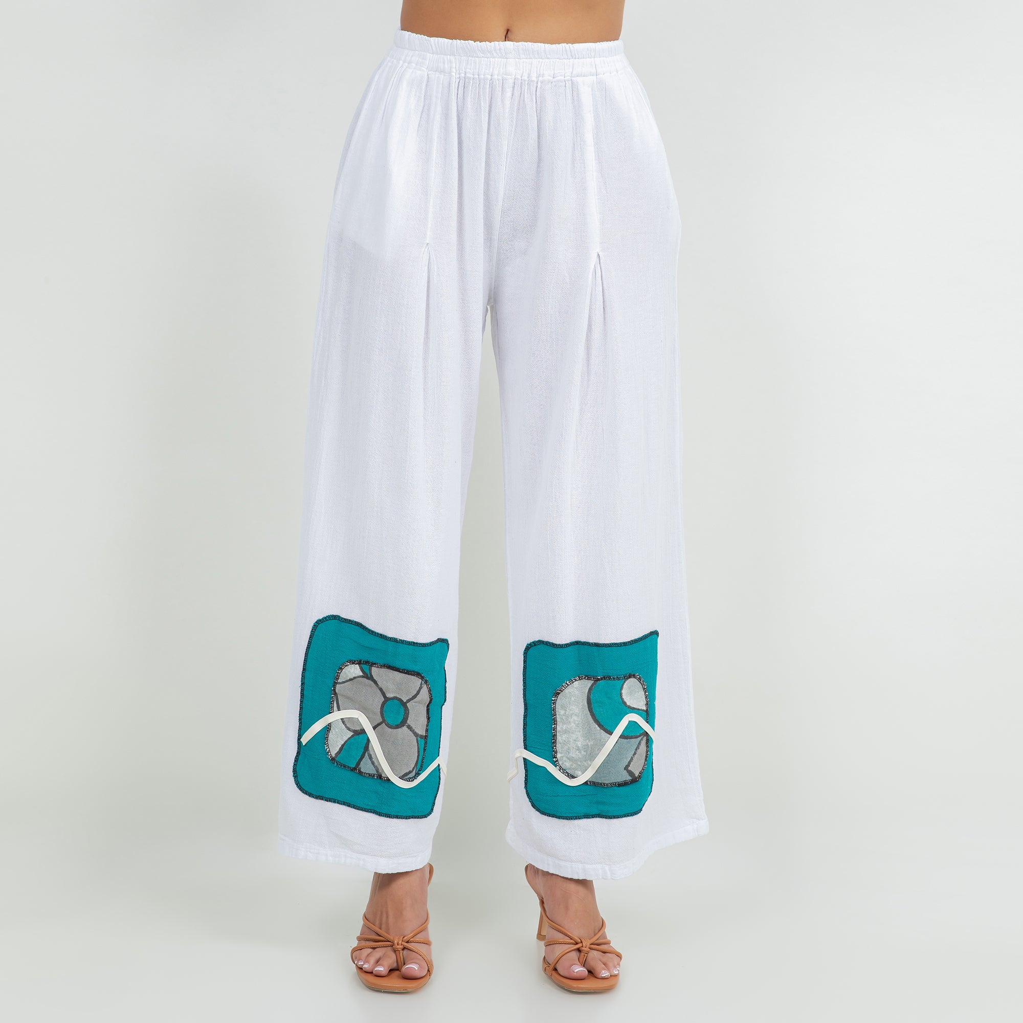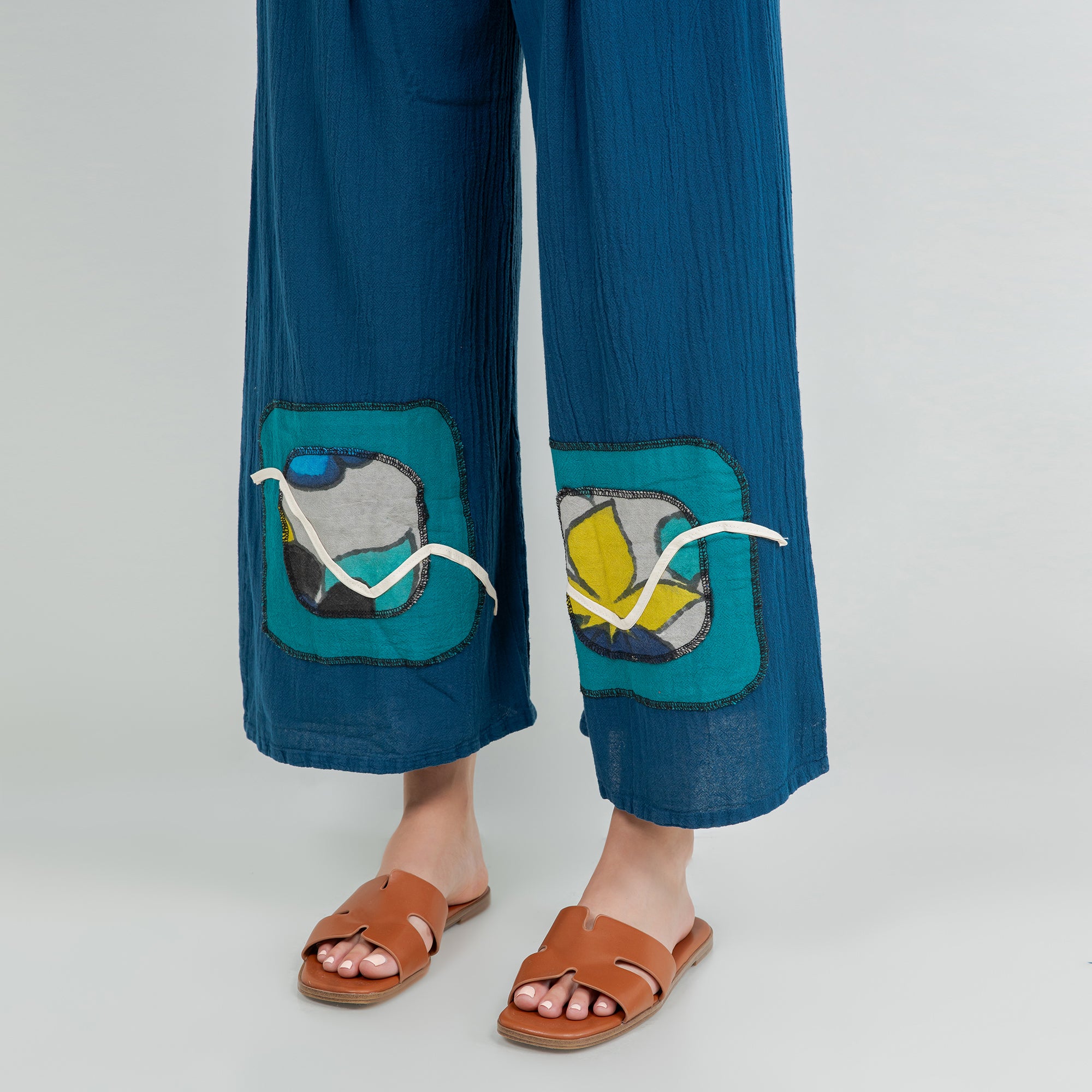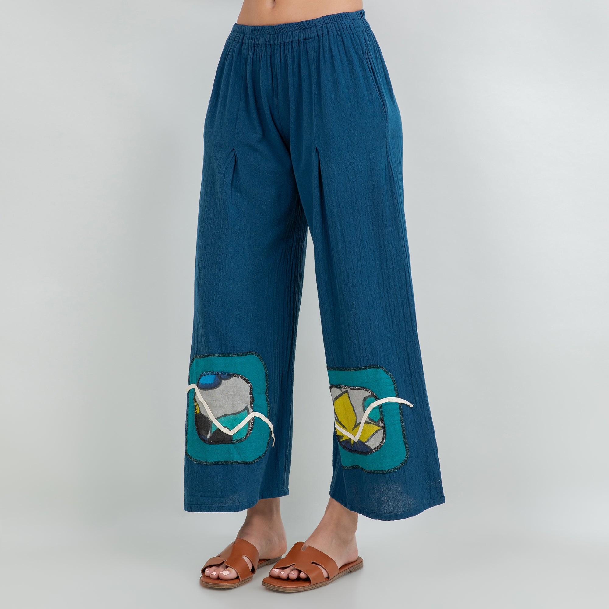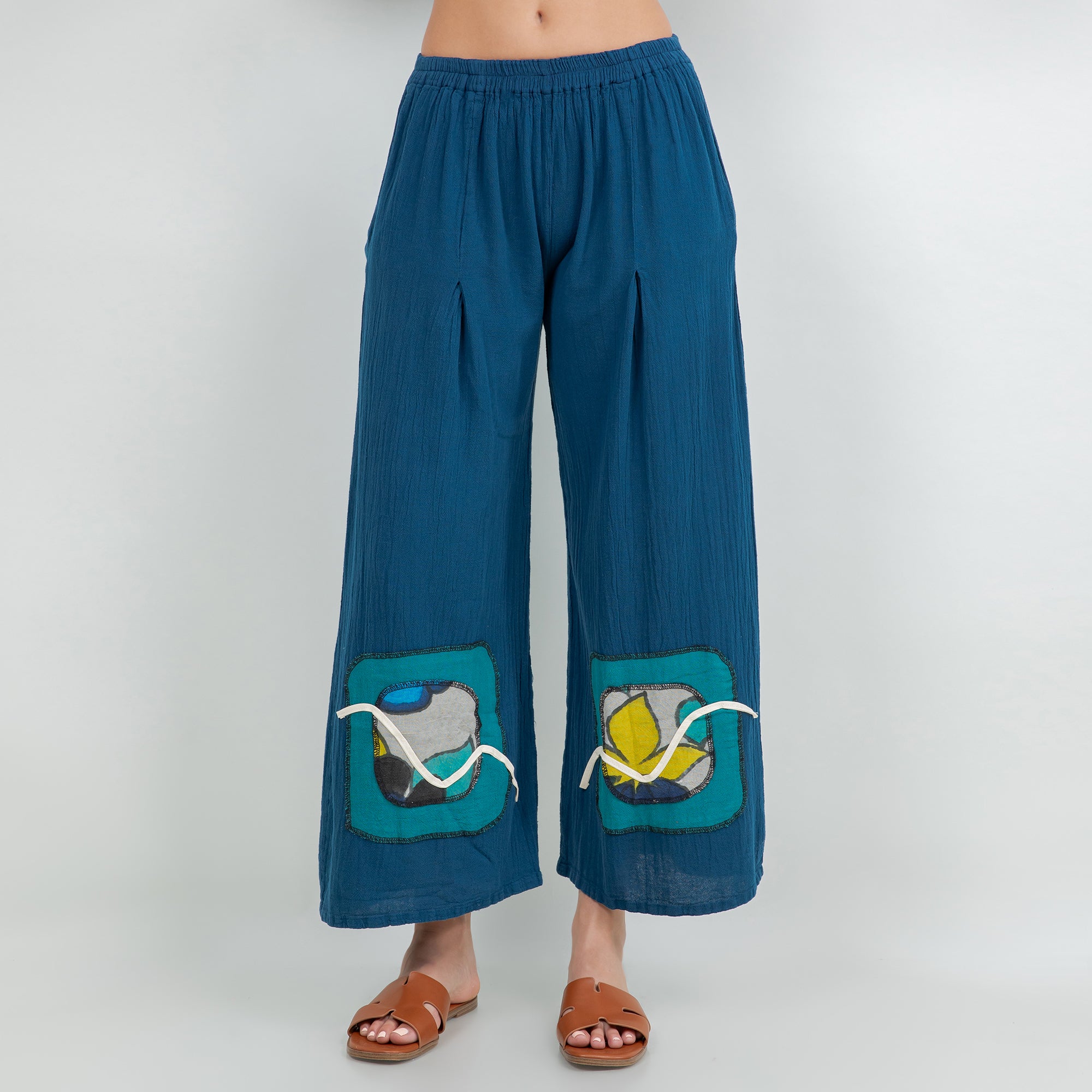 Chelle features a pleated thigh, and hand painted embellishments at the pant bottom. The colors added enhance the beauty of the product and allow the mixing and matching of additional colors.