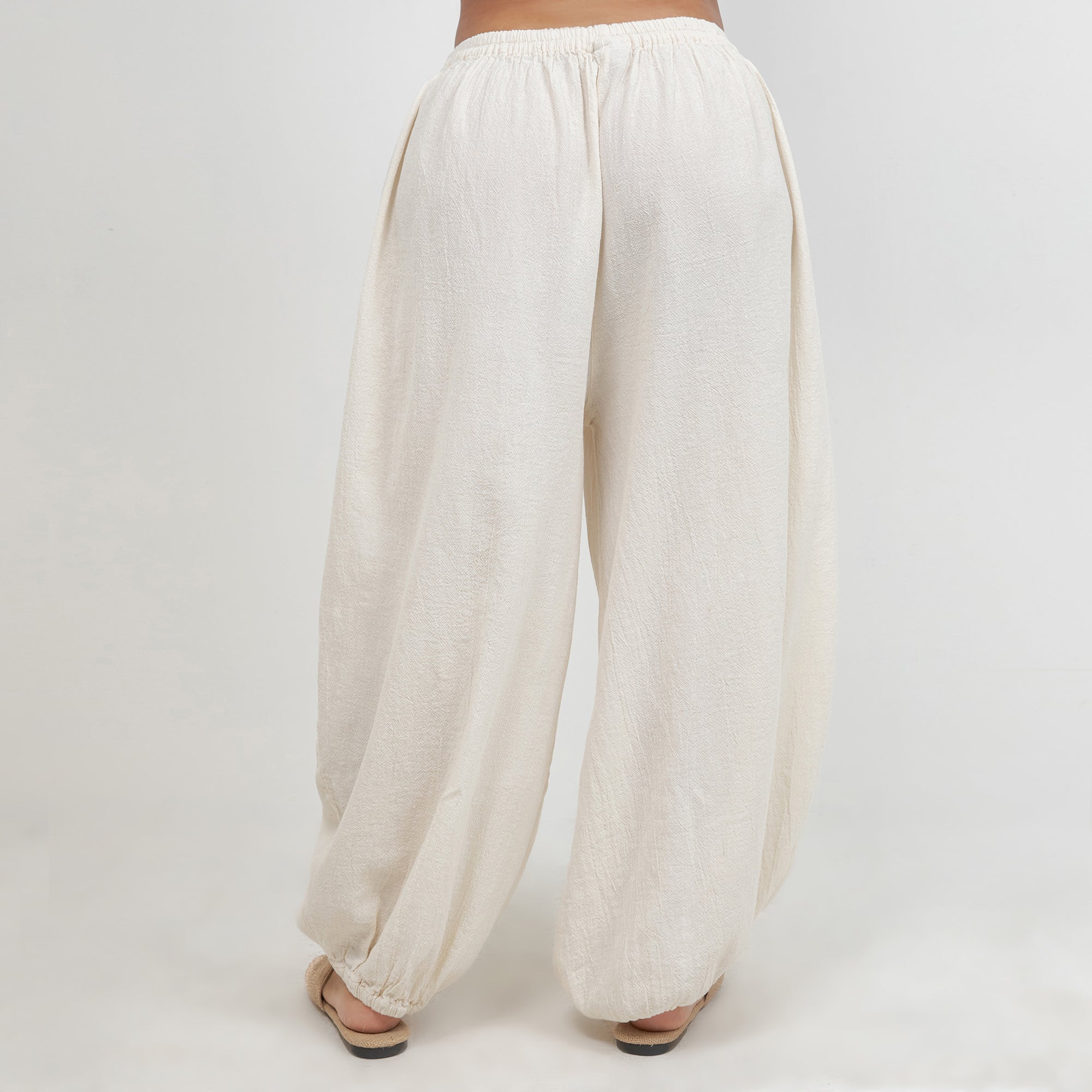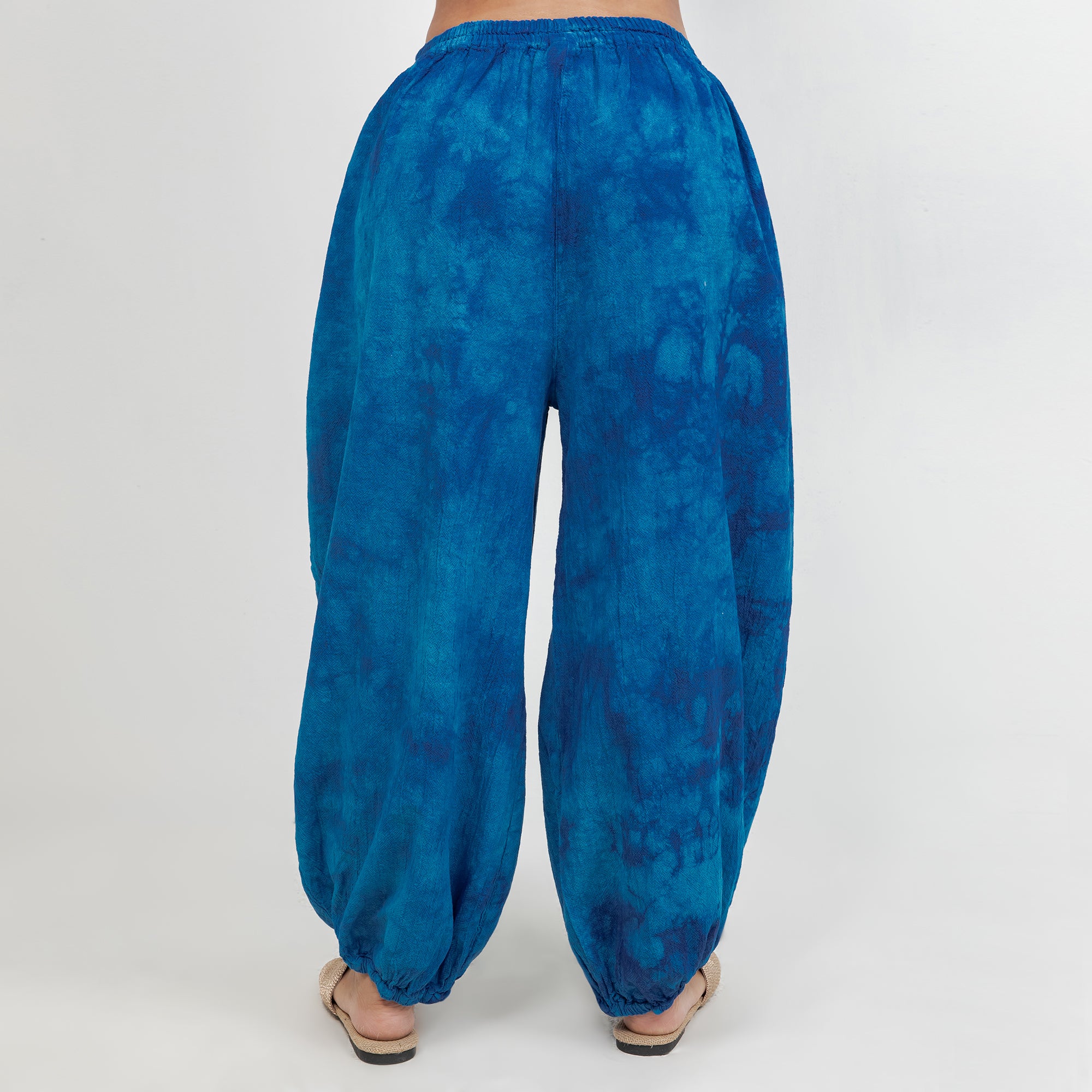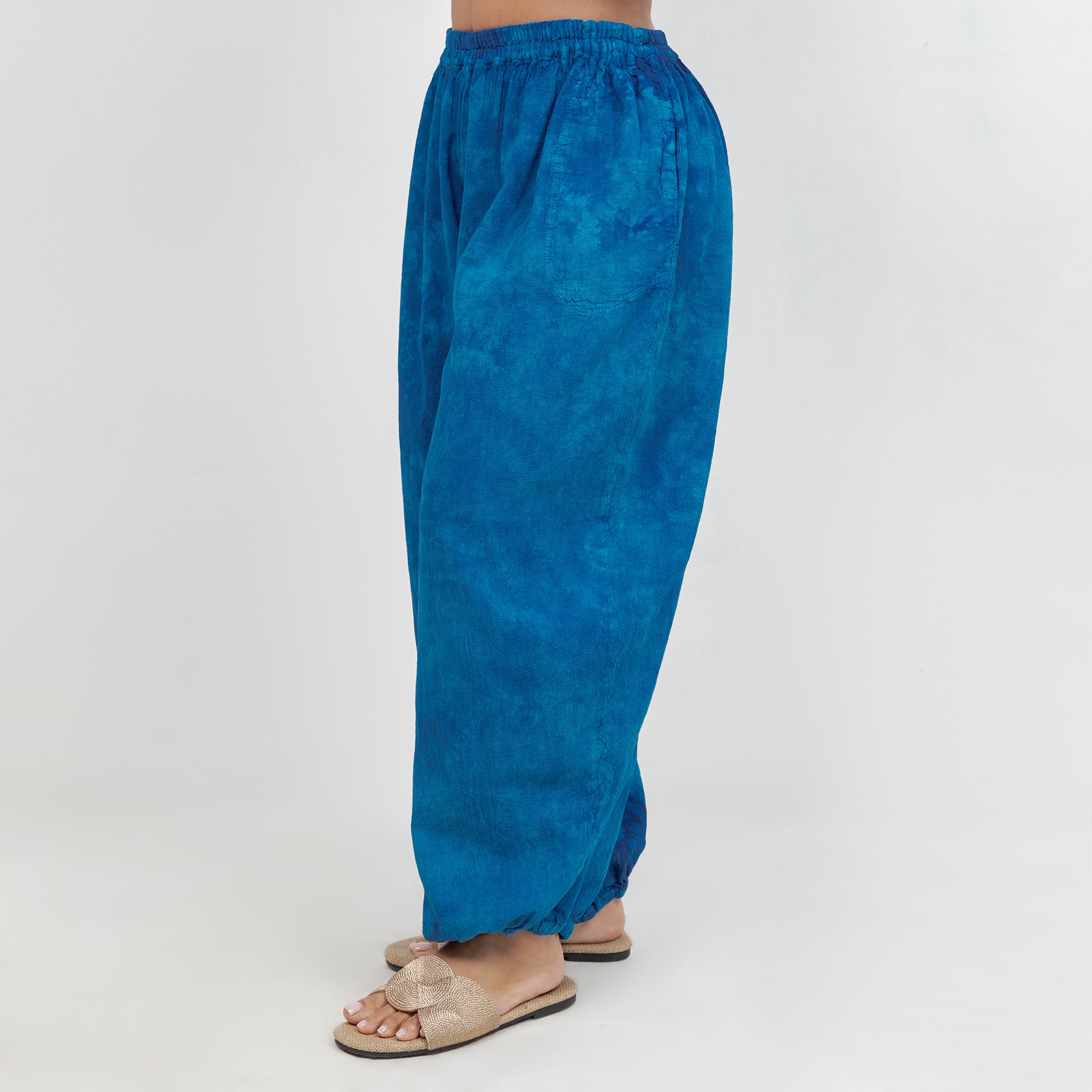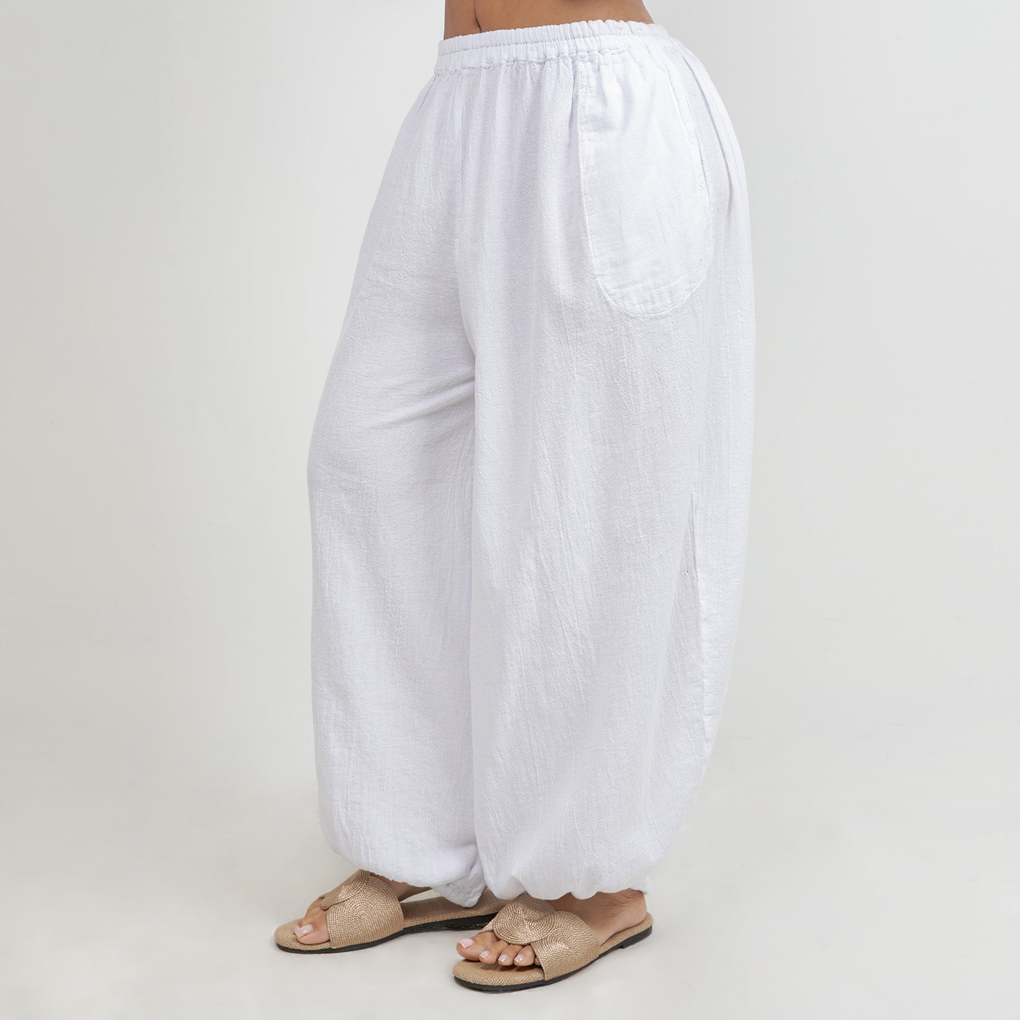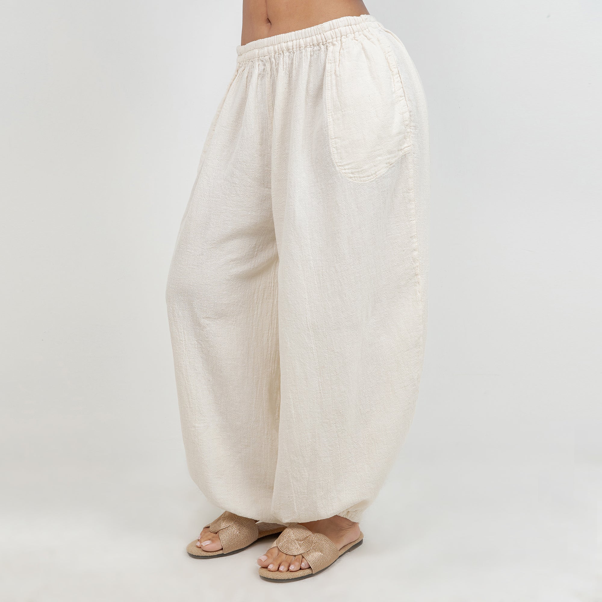 Maybrie is a one size fits most pant with an elastic waist and a fun elastic detail at the bottom giving it a harem pant feel.