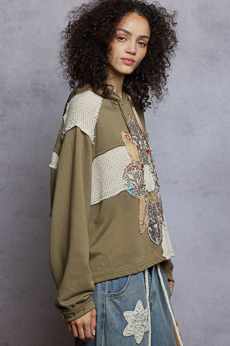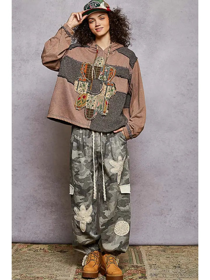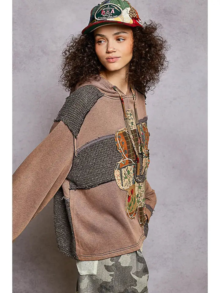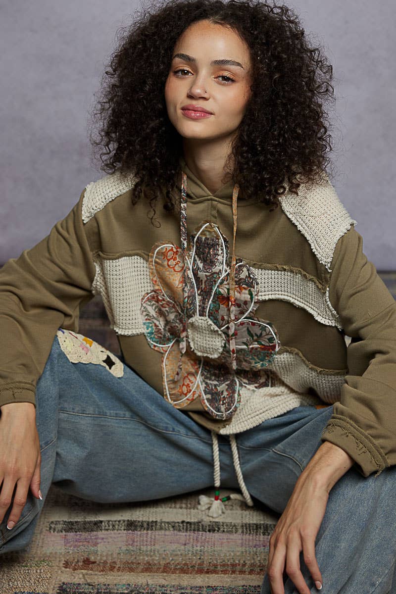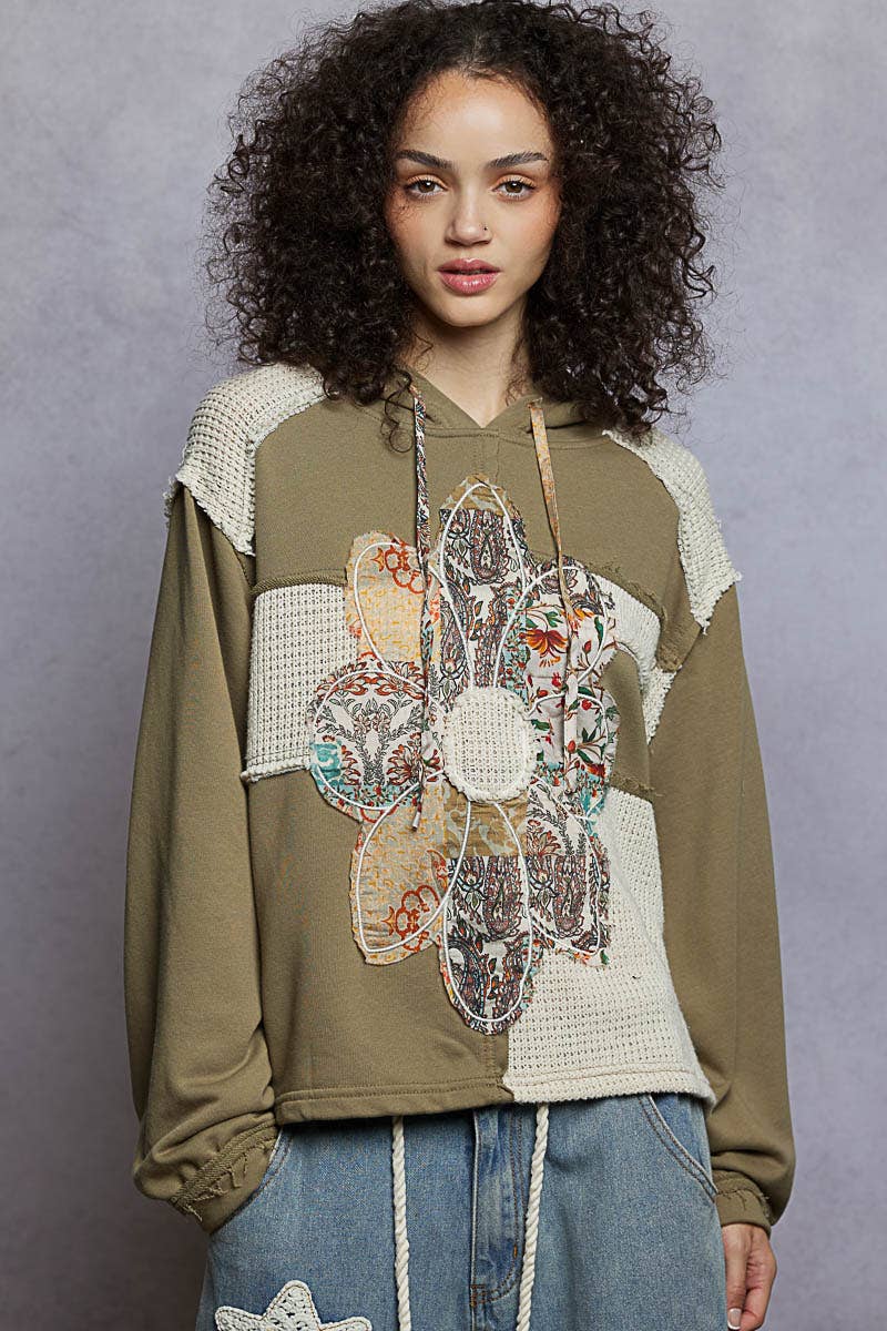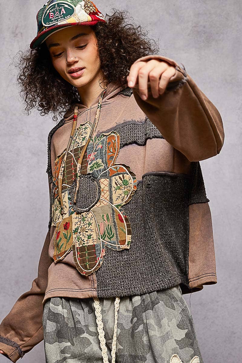 Designed in long sleeve regular fit hoodie top in French terry with cut and sew sweater knit patch, print flower patch, outseam, vintage washing, solid color.