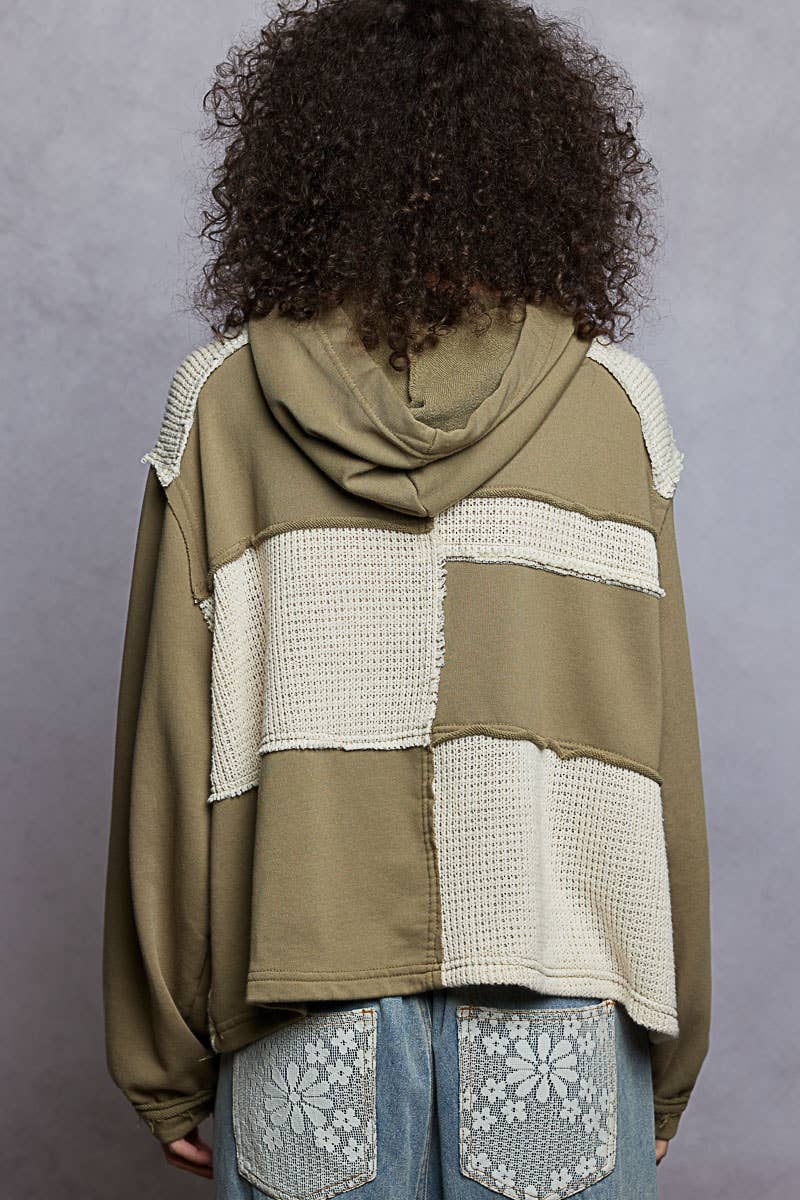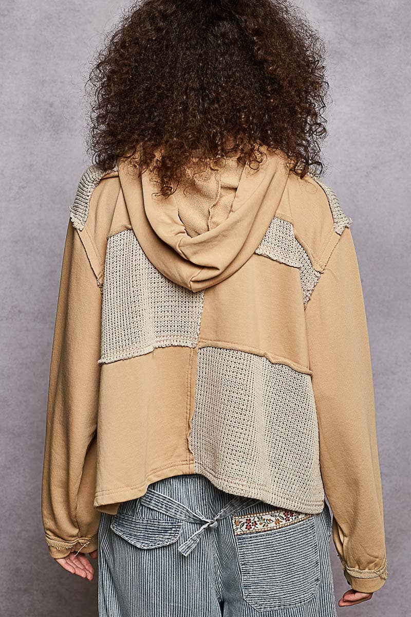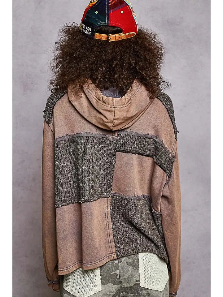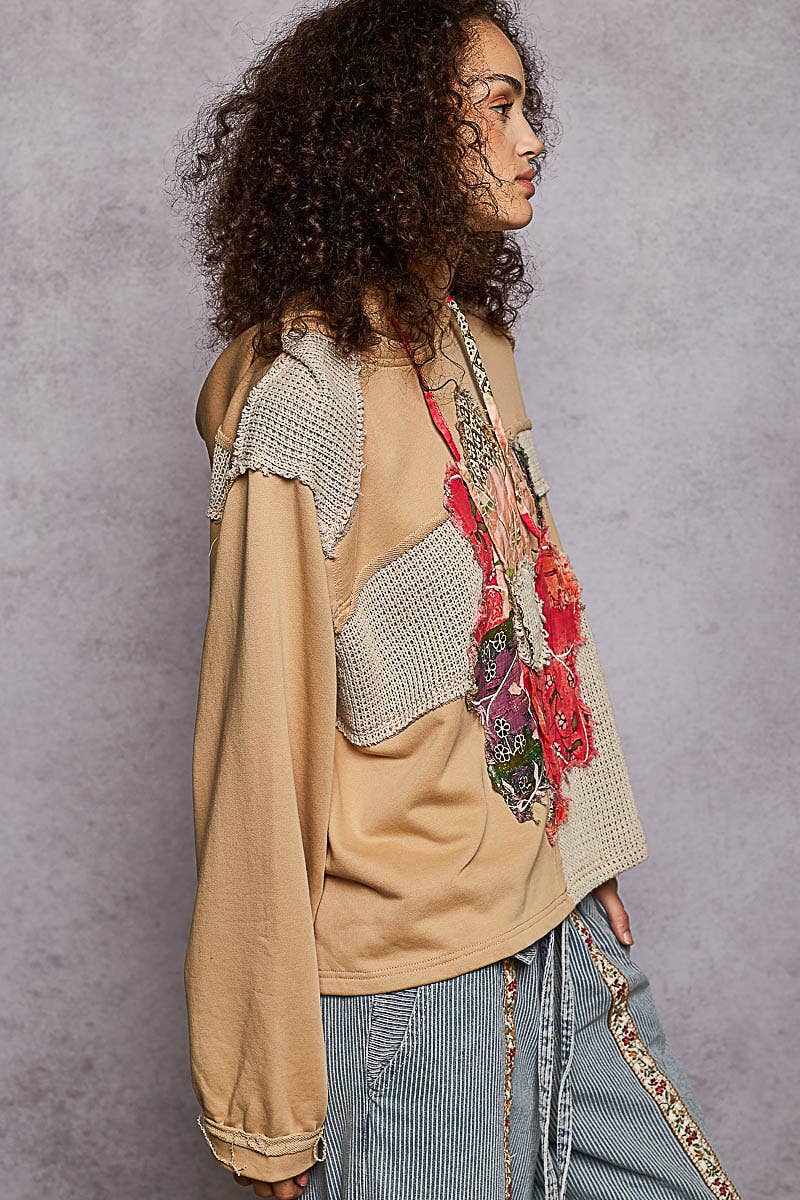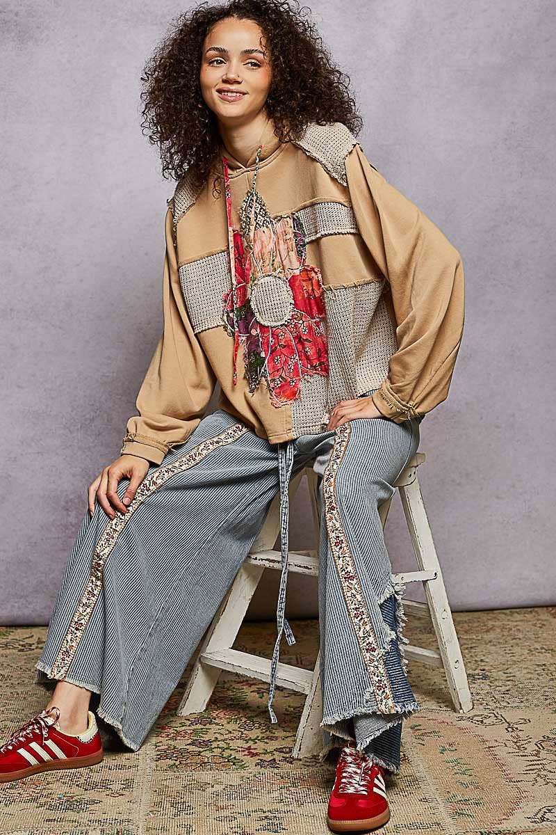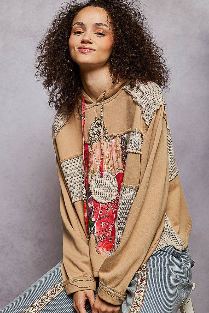 Designed in long sleeve regular fit hoodie top in French terry with cut and sew sweater knit patch, print flower patch, outseam, vintage washing, solid color.
