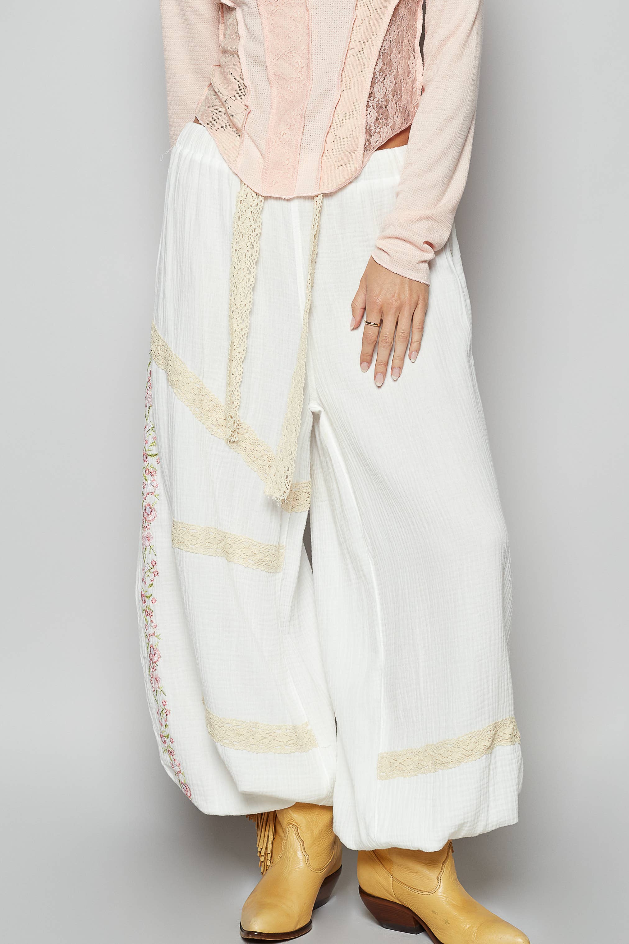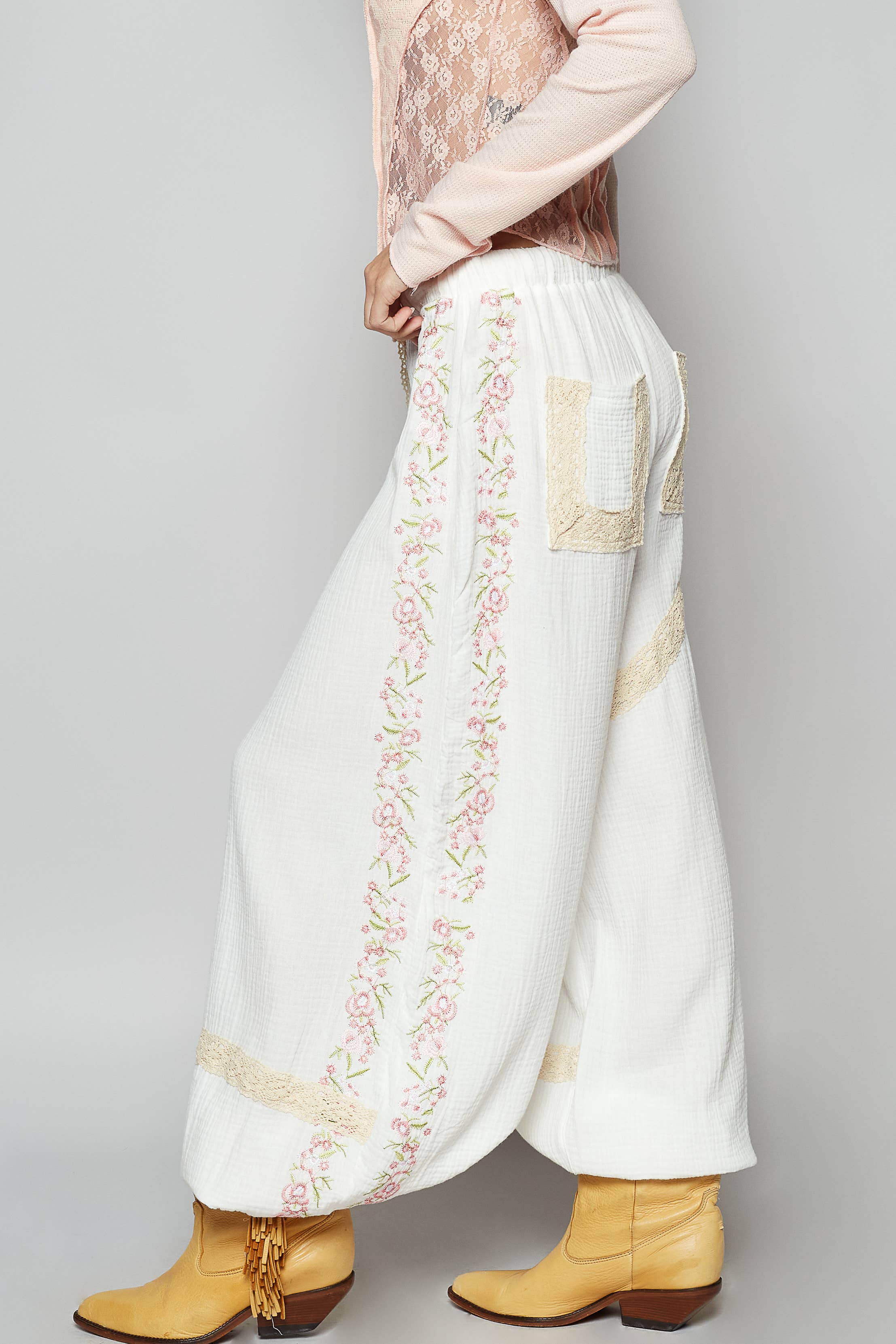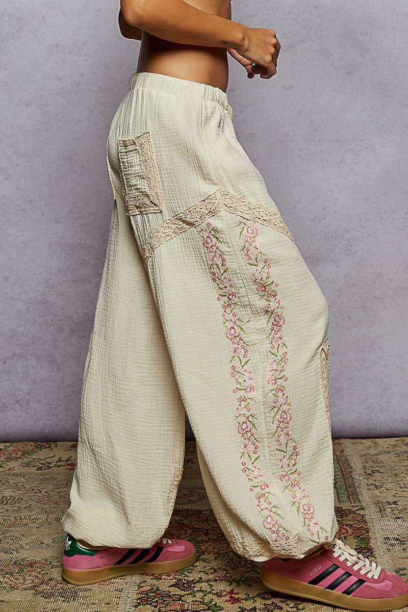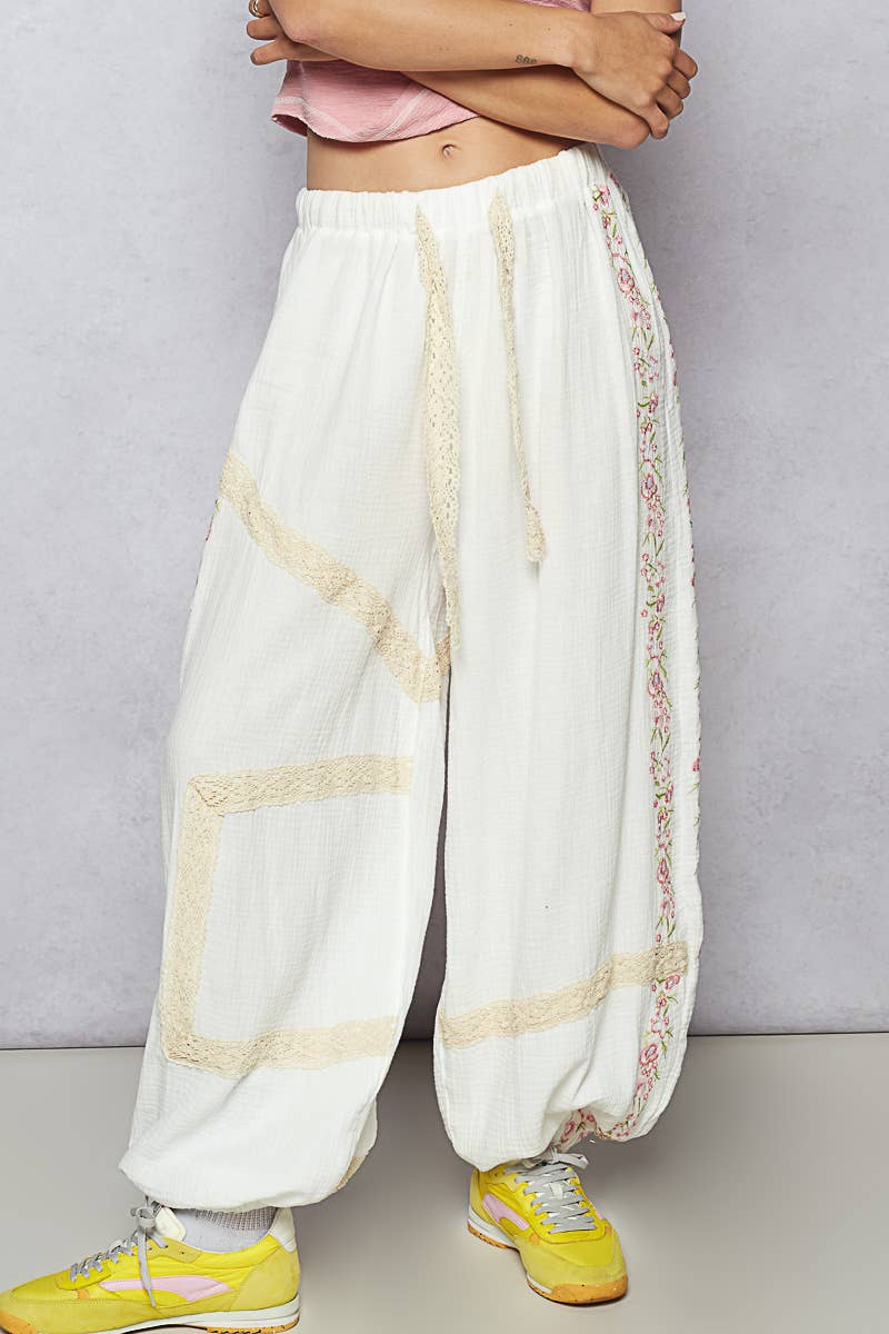 Bring a touch of vintage charm to your look with our Vintage Washed Embroidery Trim Point Jogger Pants. Crafted from breathable double gauze fabric, these joggers feature lace trim accents and delicate embroidery details for a handcrafted finish. The normal washing treatment adds a soft, lived-in feel, while the elastic waistband and cuffs provide effortless comfort and a relaxed silhouette.
