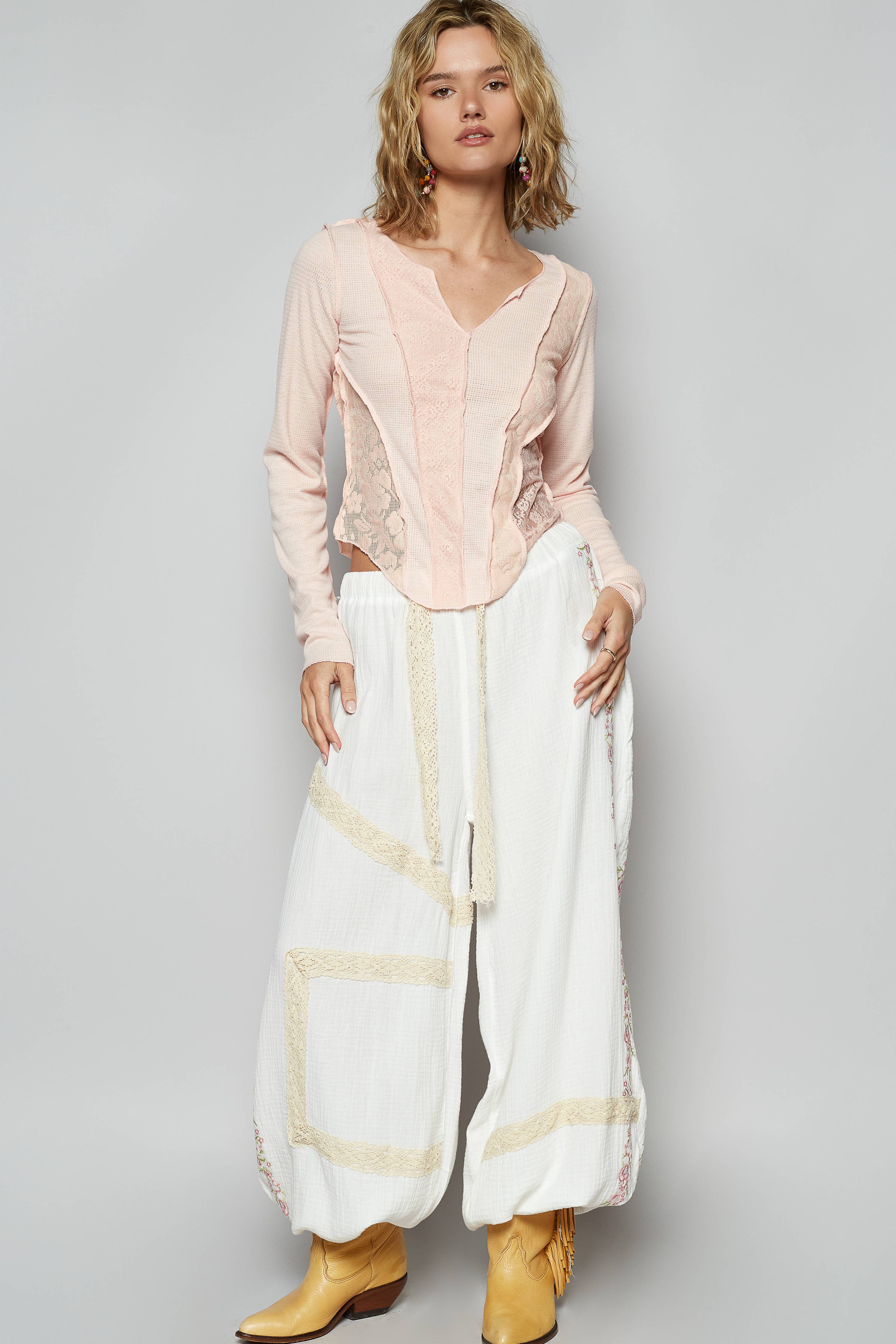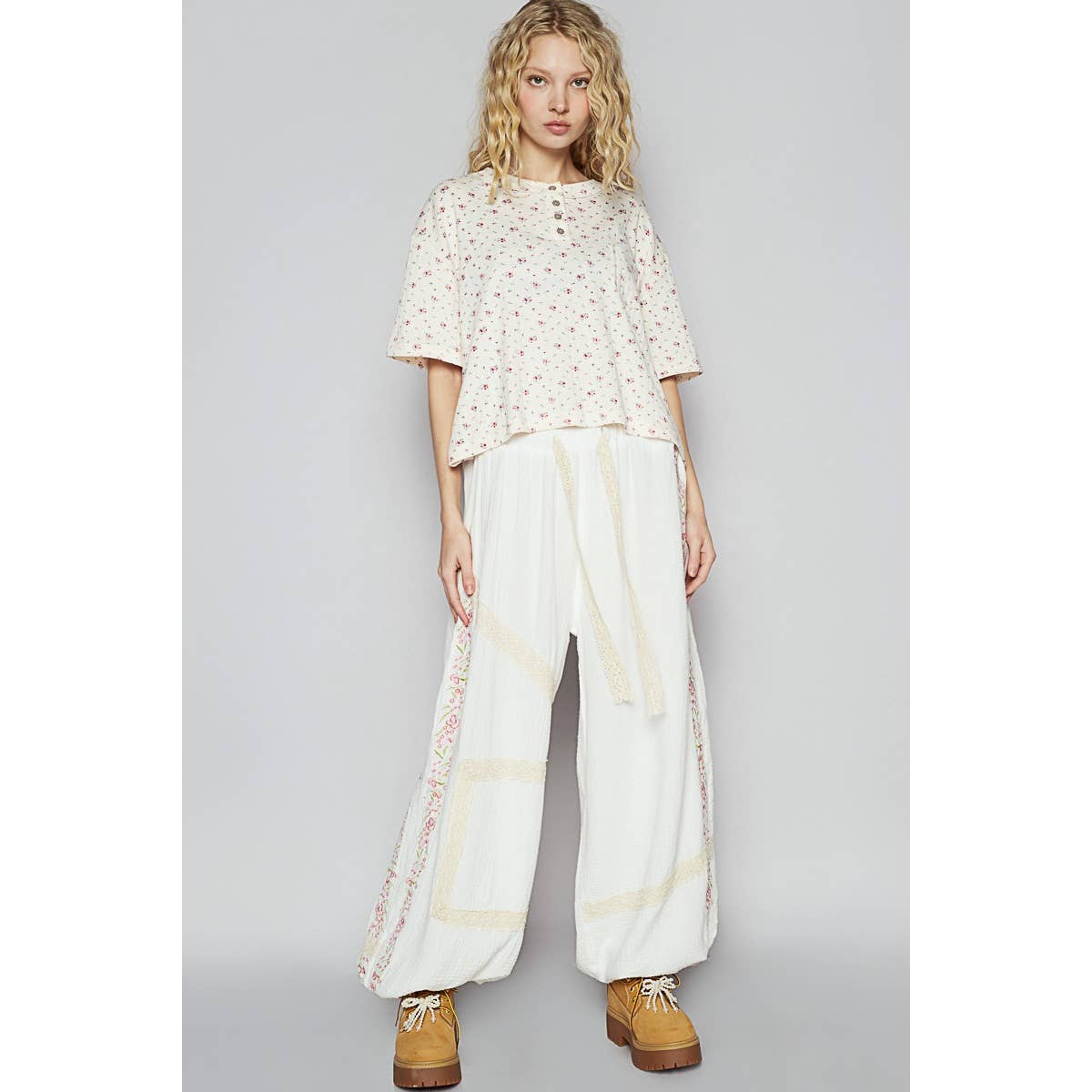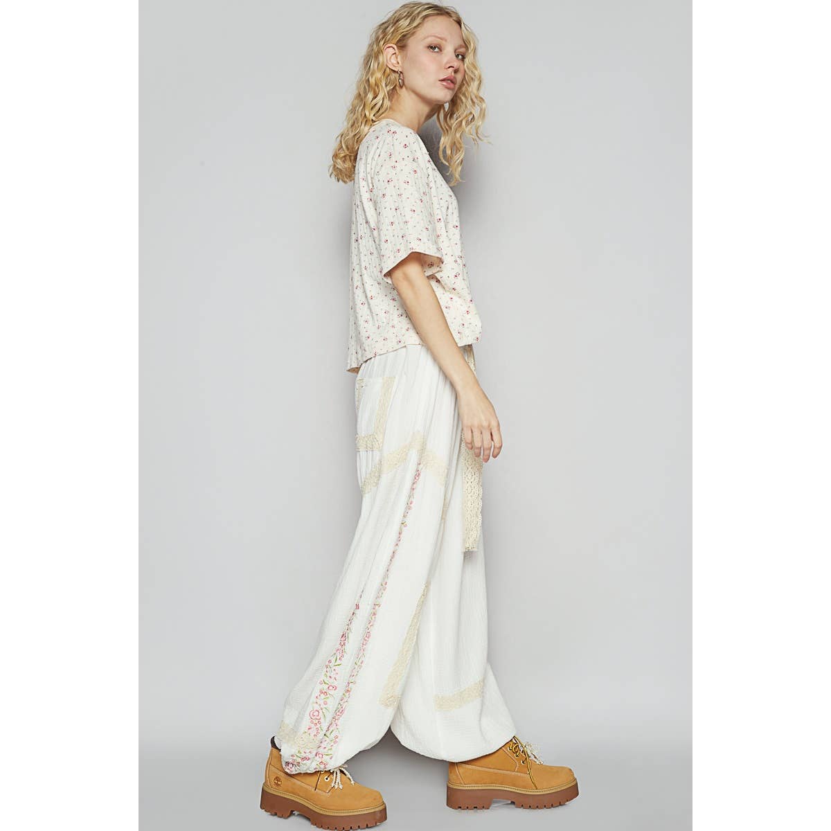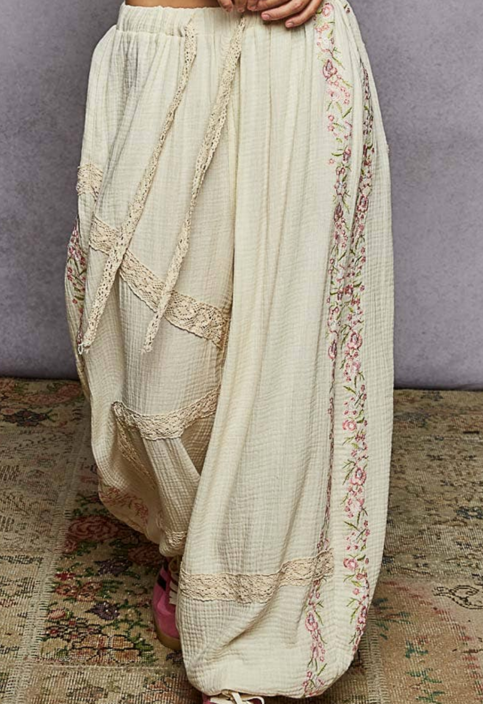 Bring a touch of vintage charm to your look with our Vintage Washed Embroidery Trim Point Jogger Pants. Crafted from breathable double gauze fabric, these joggers feature lace trim accents and delicate embroidery details for a handcrafted finish. The normal washing treatment adds a soft, lived-in feel, while the elastic waistband and cuffs provide effortless comfort and a relaxed silhouette.