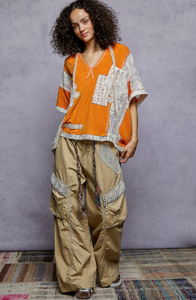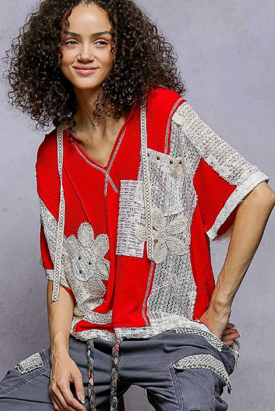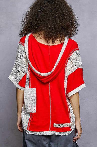 Designed in V-neck hoodie, relaxed fit top in rib with lace detail pointed solid pattern.