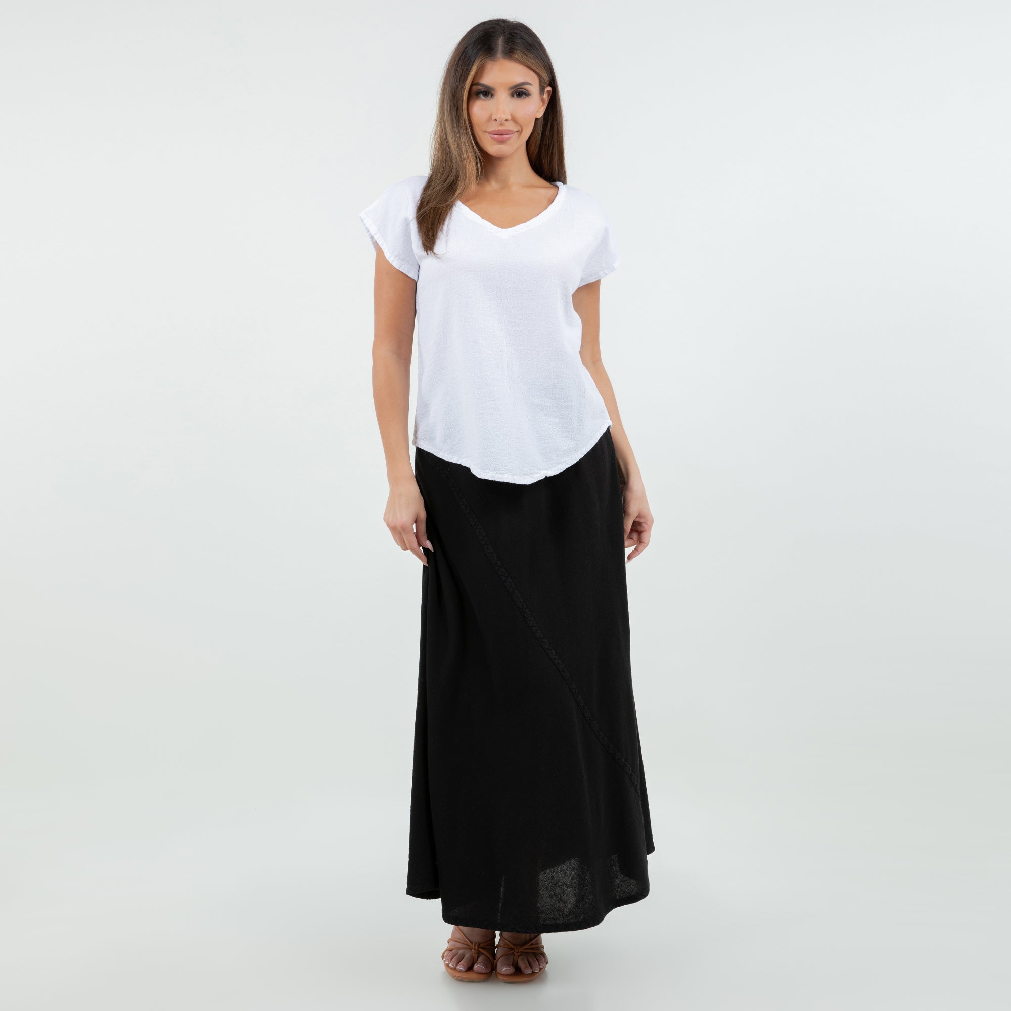 100% Cotton Gauze! A short cap-sleeve, scoop bottom, and slightly v-neck makes the Meagan top a classic style to pair with any bottom of your choice.