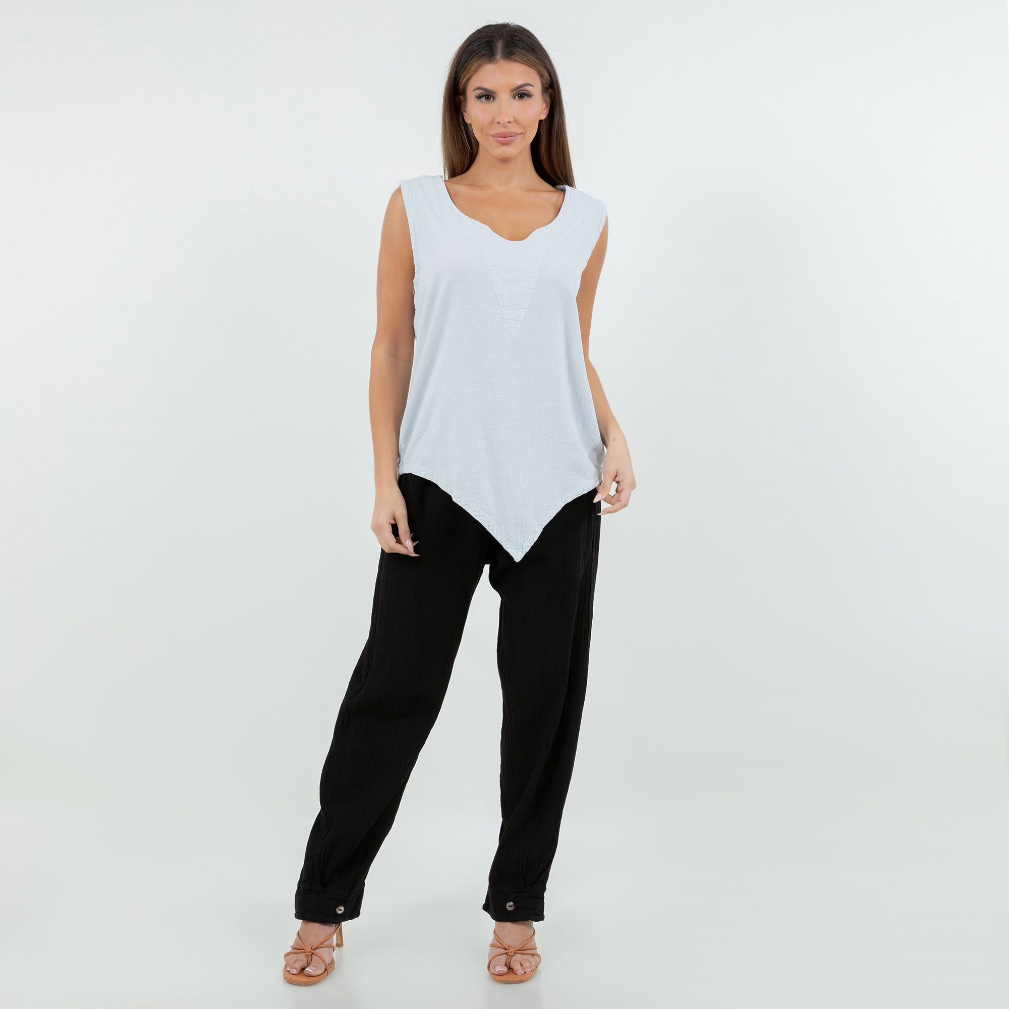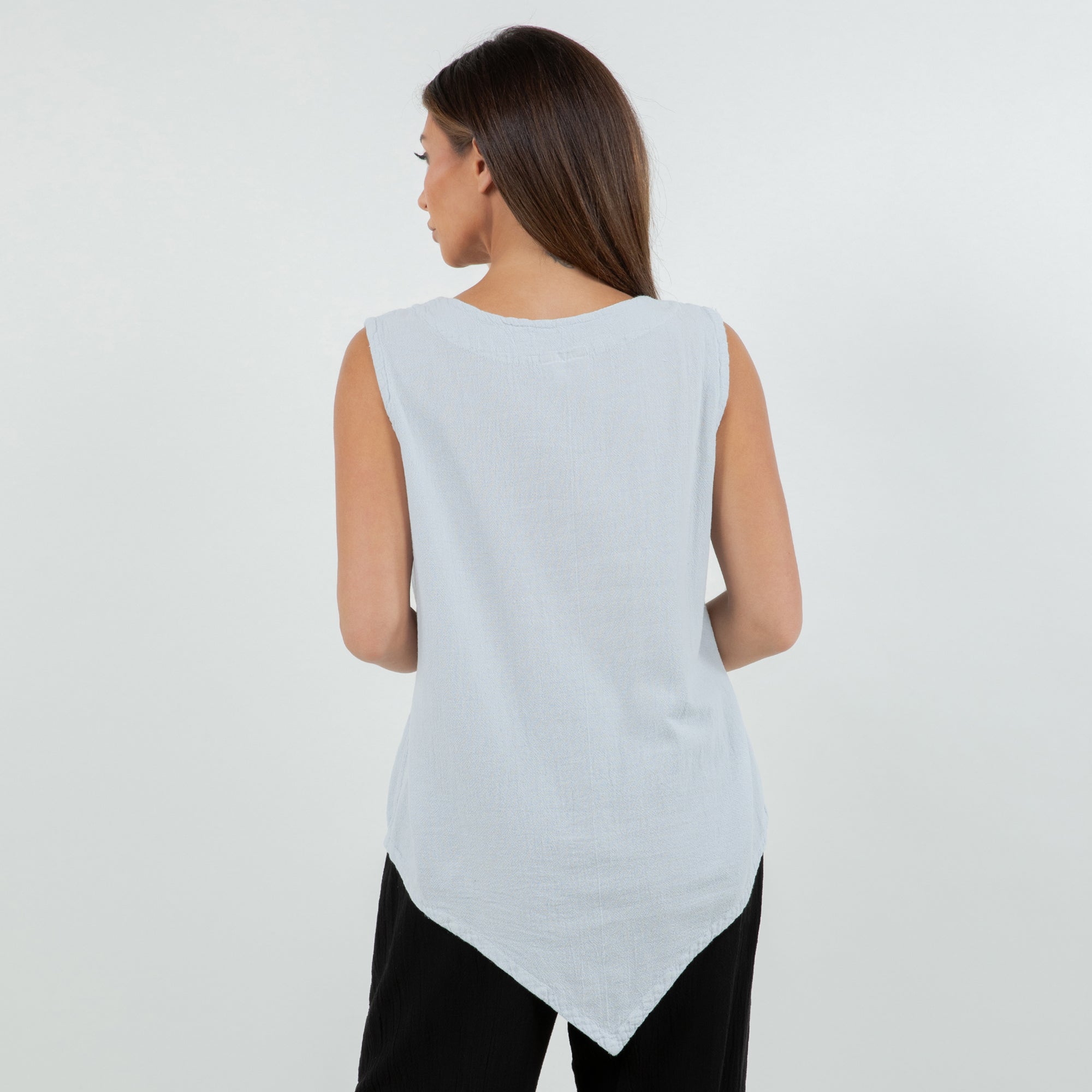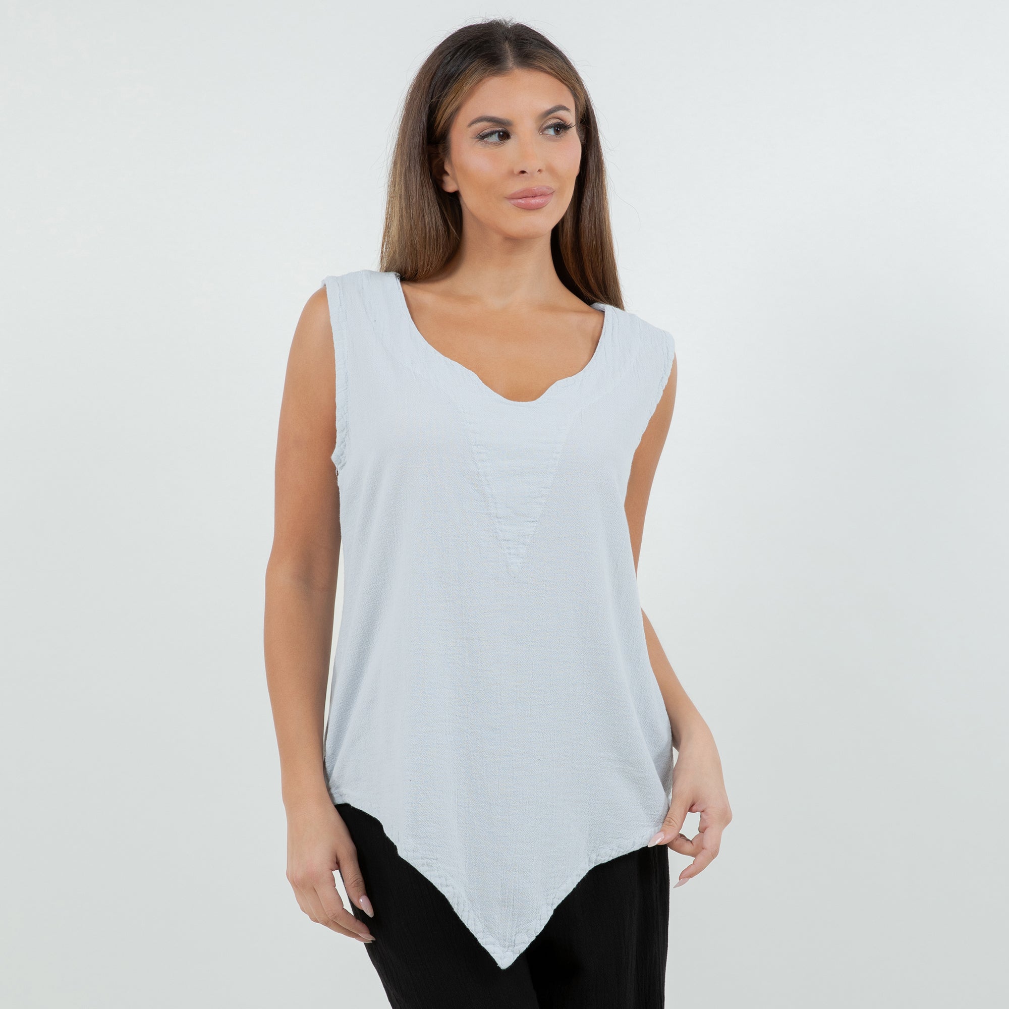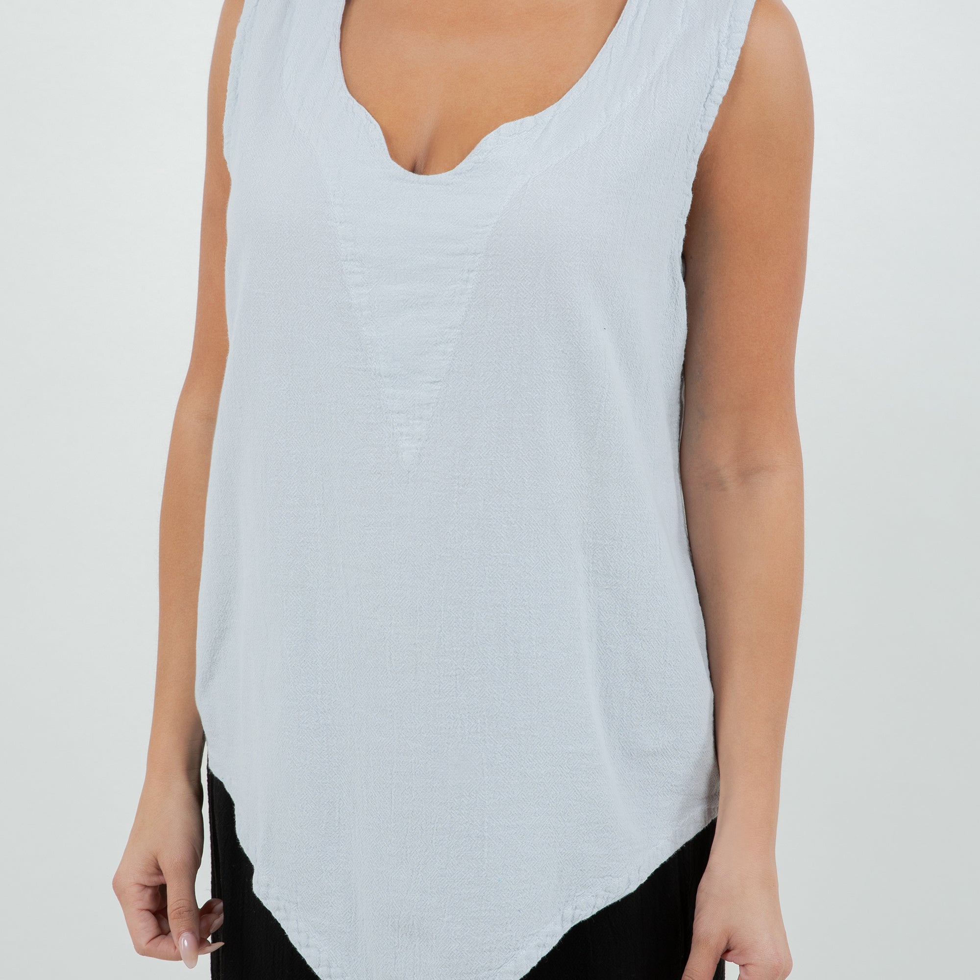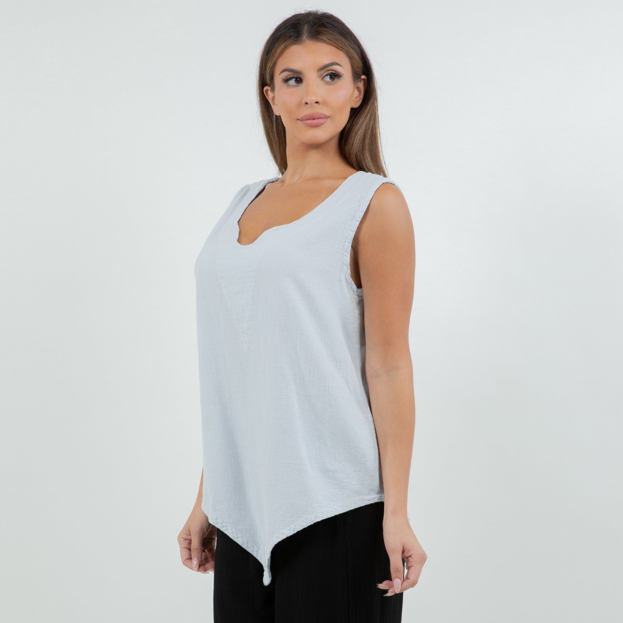 The Nancy tank top features a border accented sweetheart neckline with a v-shaped bottom cut in the front and back.