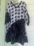 Truly a wearable piece of art; this one-of-a-kind blouse features a hand painted black, white, and purple design. Made of rayon, the loose fitting short sleeves, a wide neckline, and a relaxed fit for all year round.