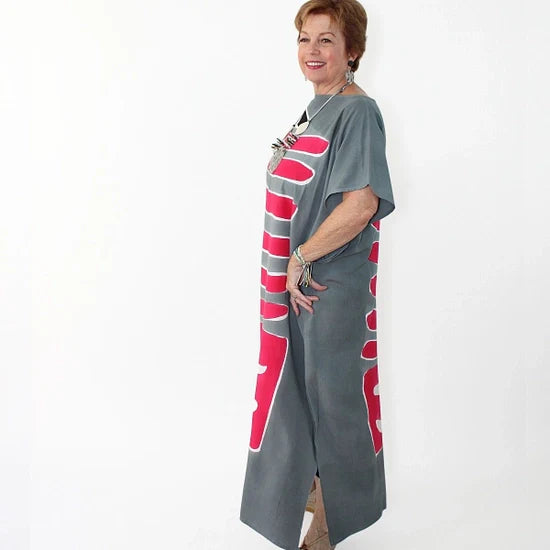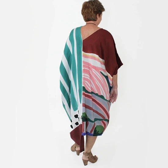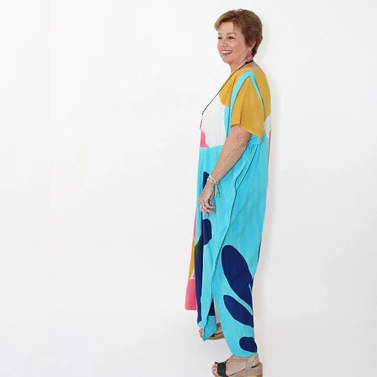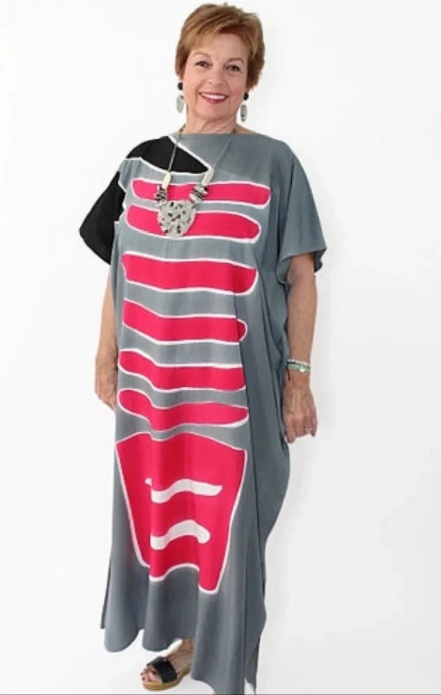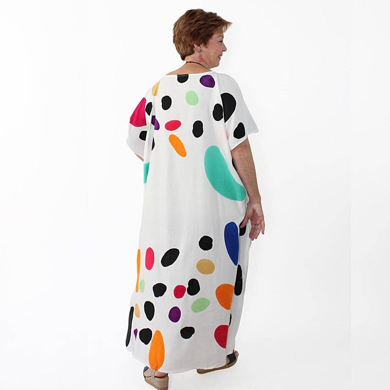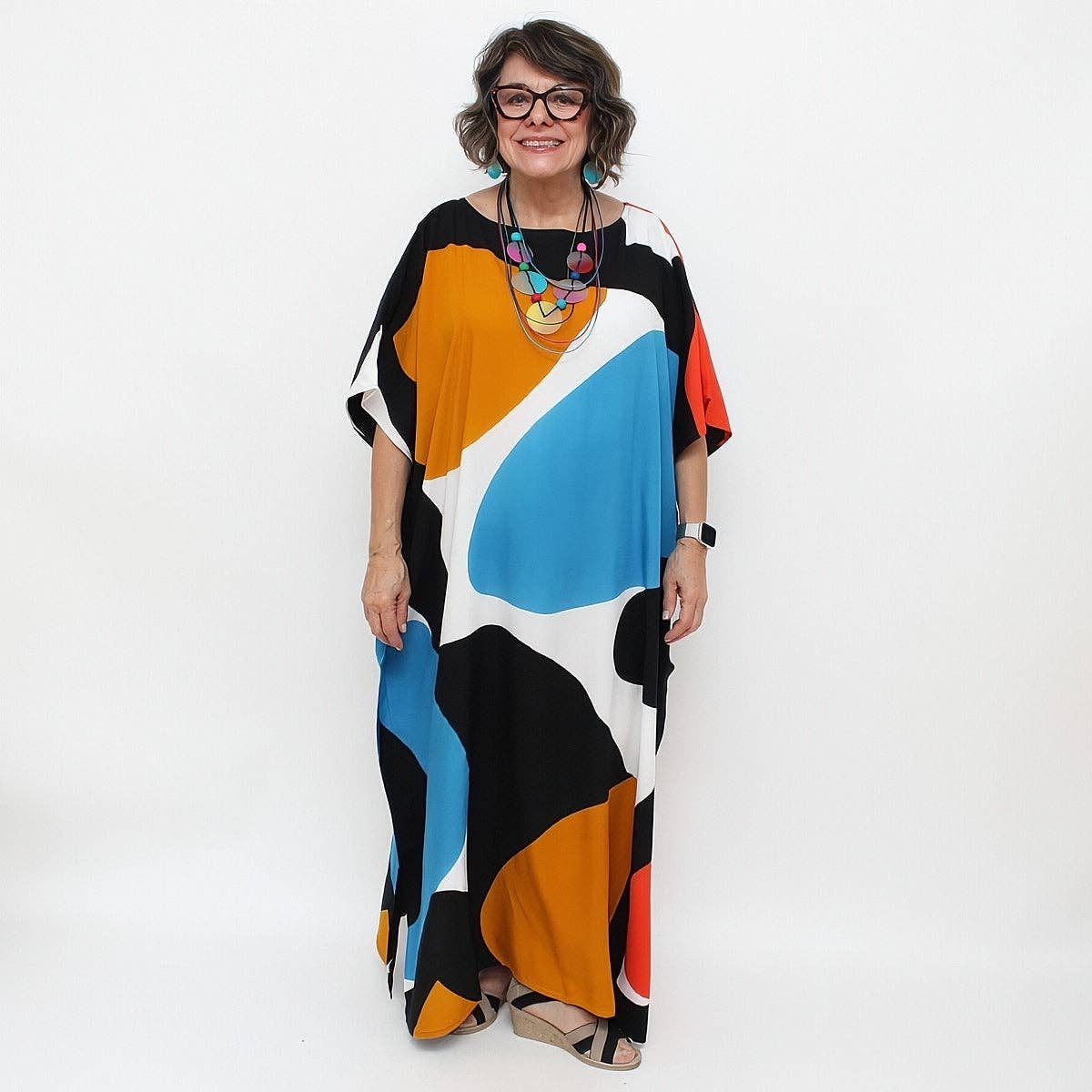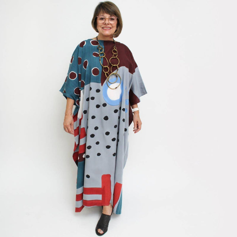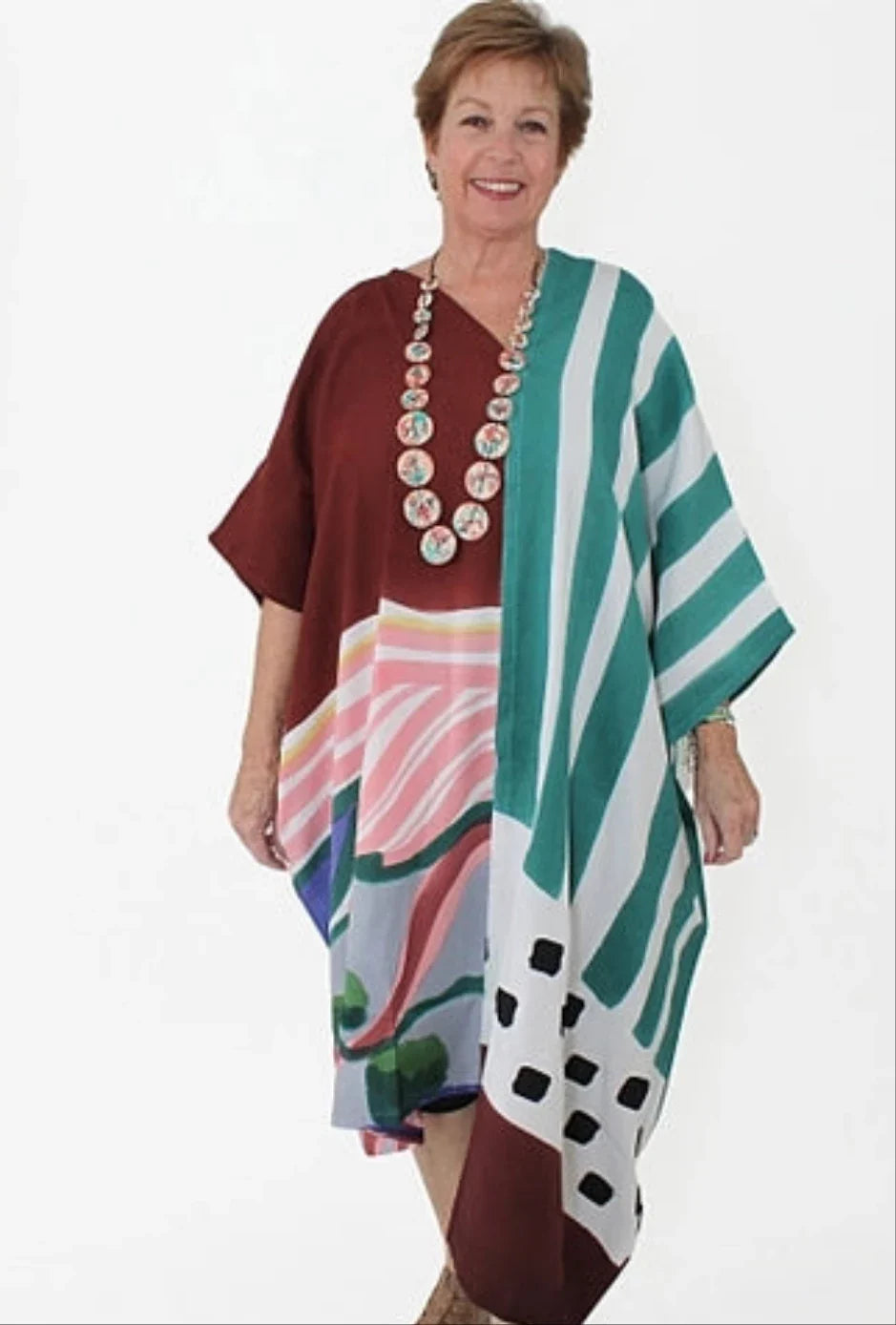 OSFM The fabric of this Kaftan was hand painted one-at-a-time. This Kaftan is a beautiful example of wearable art. Make of Rayon, it features loose fitting short sleeves, a wide neckline, and a relaxed fit