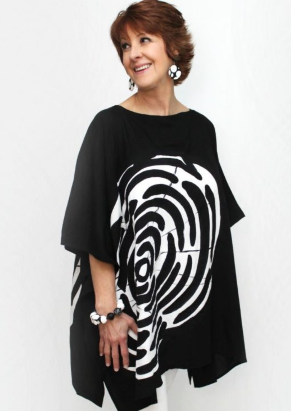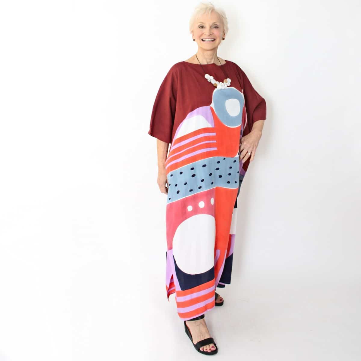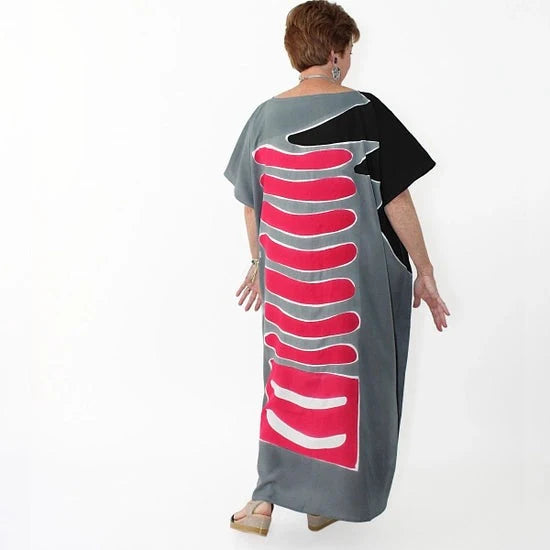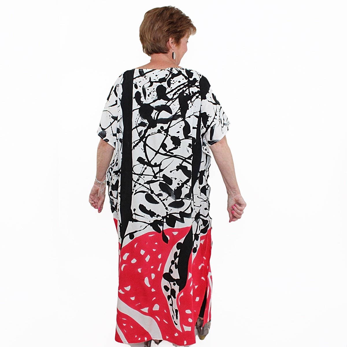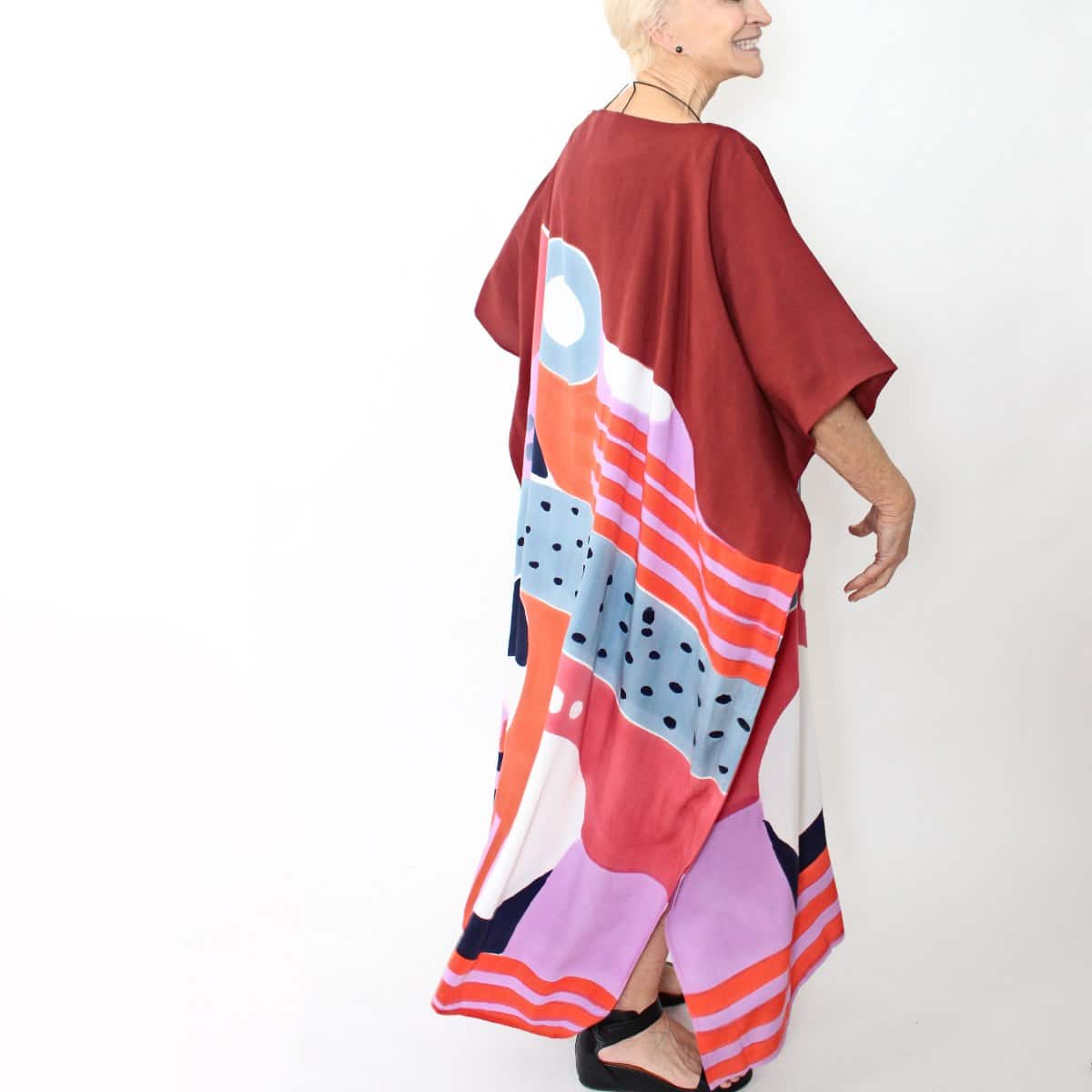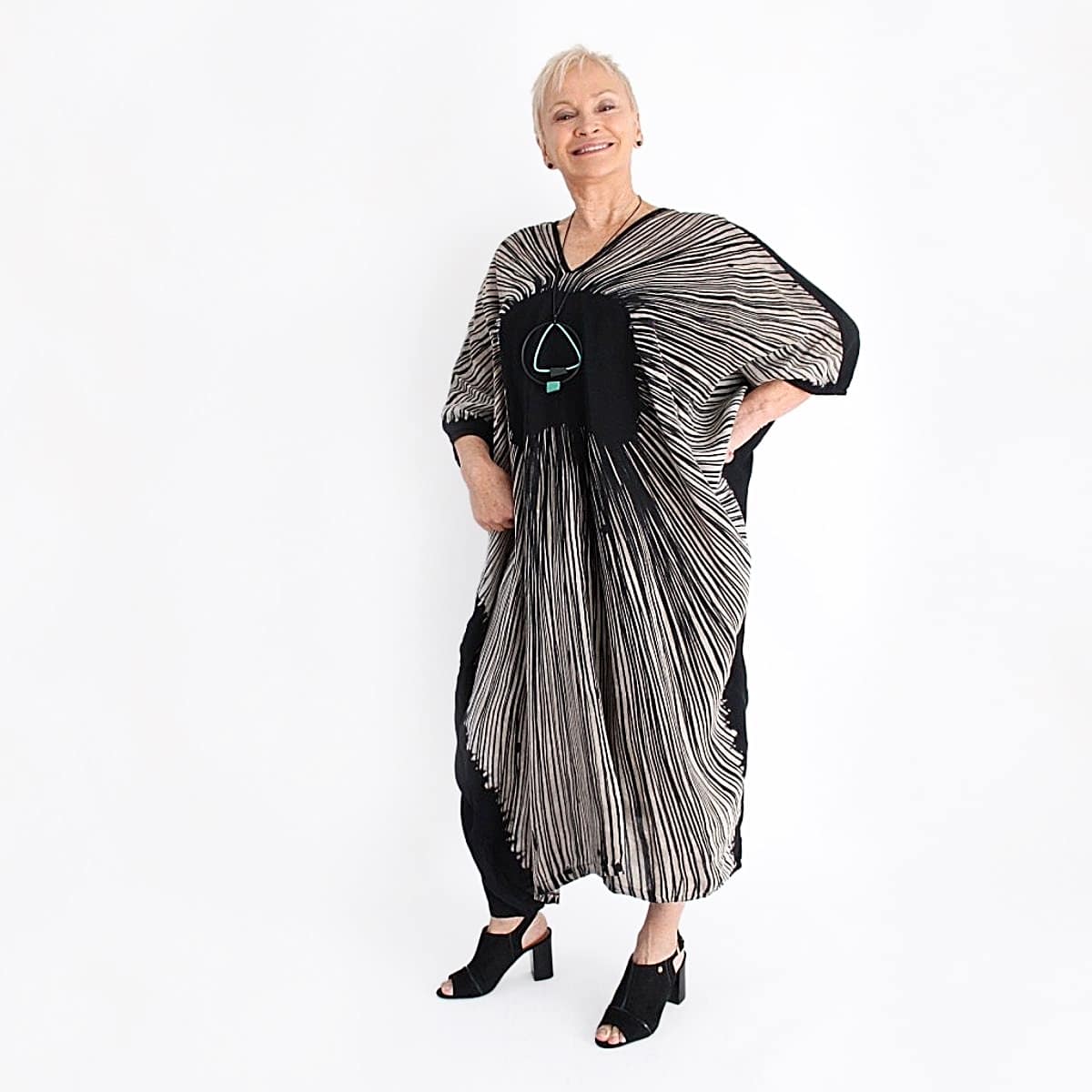 OSFM The fabric of this Kaftan was hand painted one-at-a-time. This Kaftan is a beautiful example of wearable art. Make of Rayon, it features loose fitting short sleeves, a wide neckline, and a relaxed fit