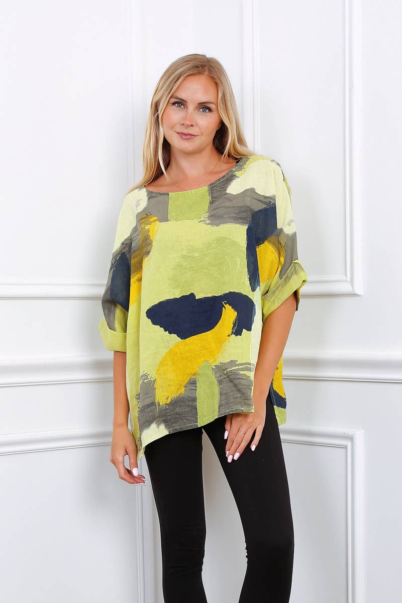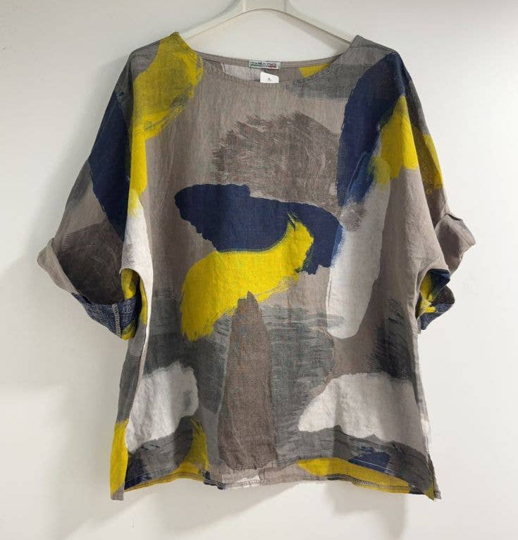 Linen brushstroke top with fold over batwing sleeves. 100% linen. Made in Italy. One Size only.