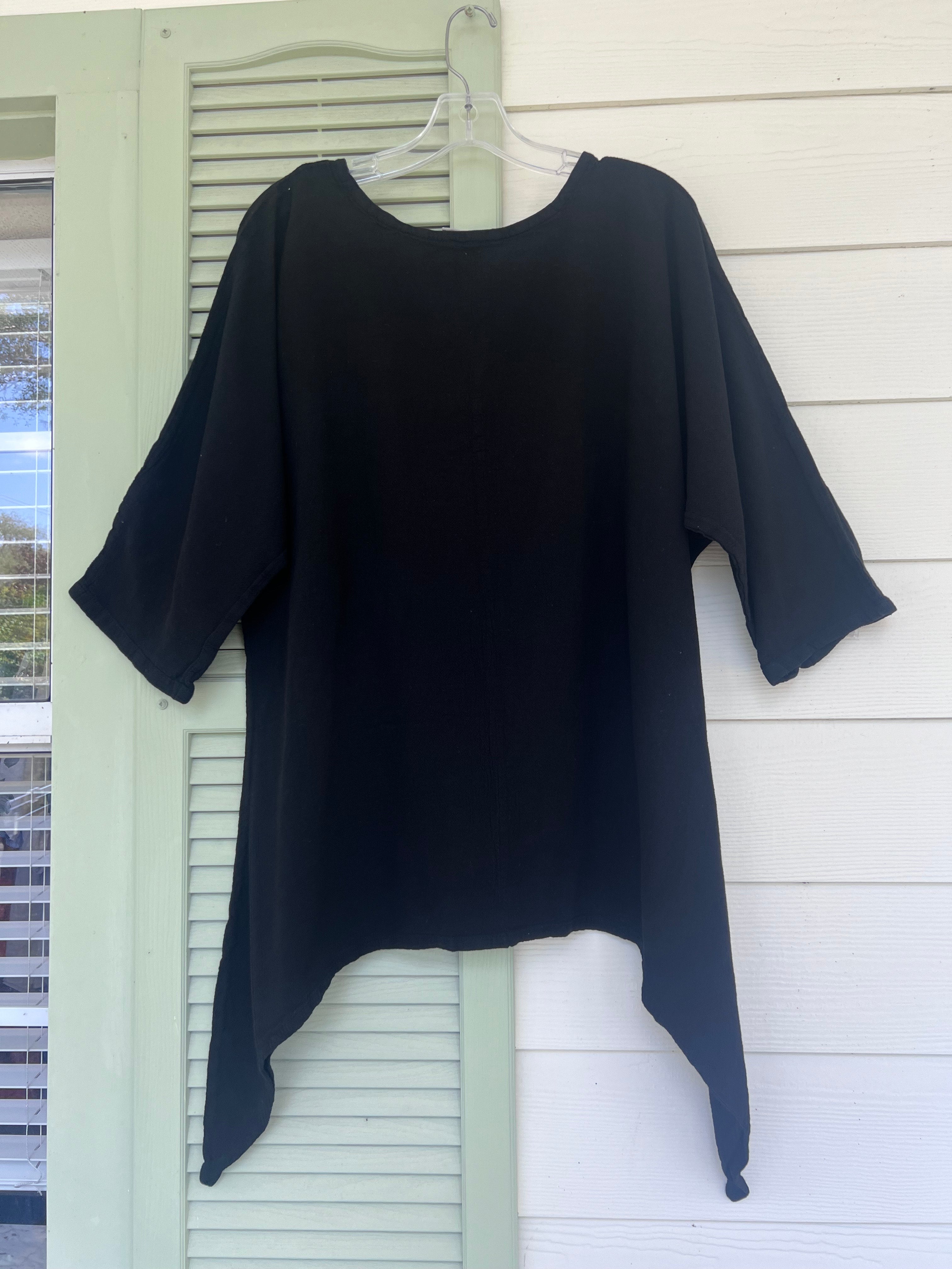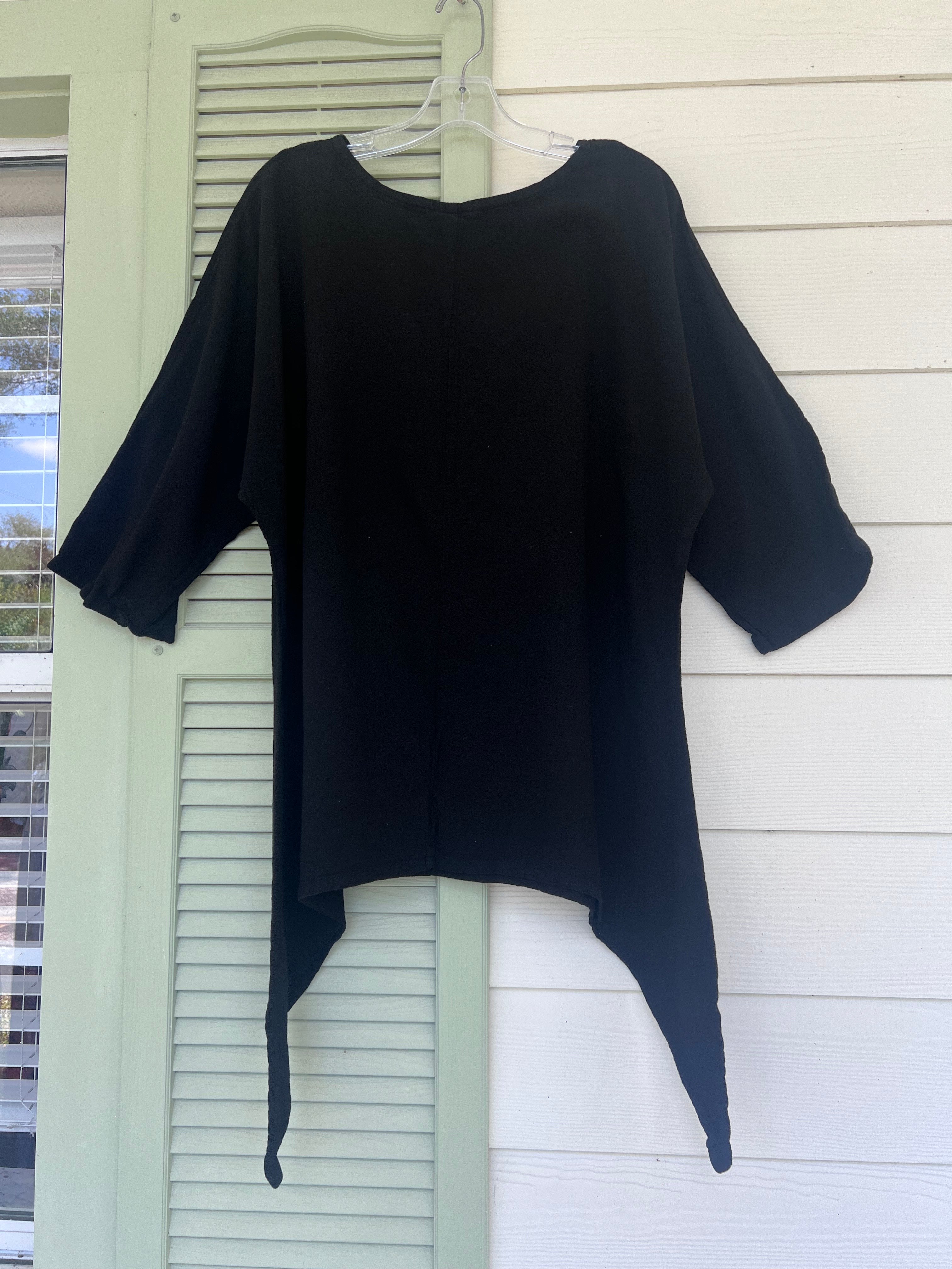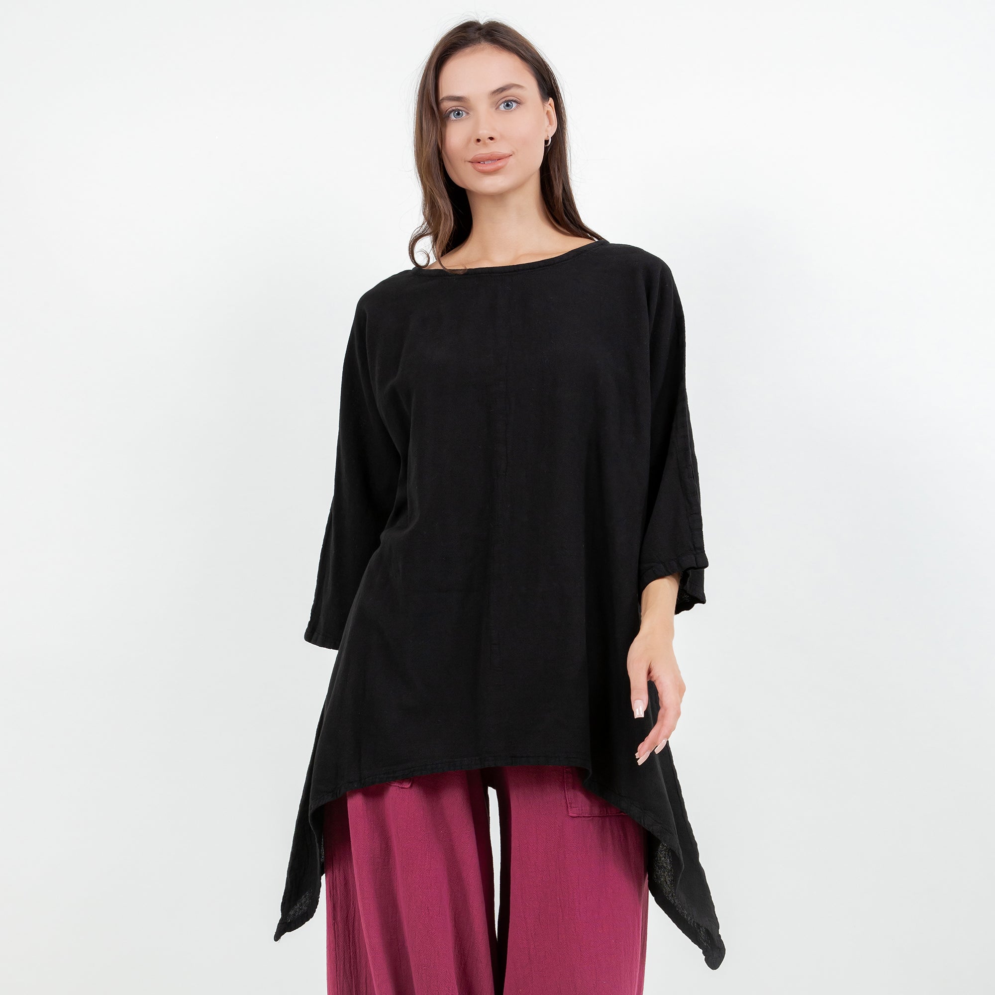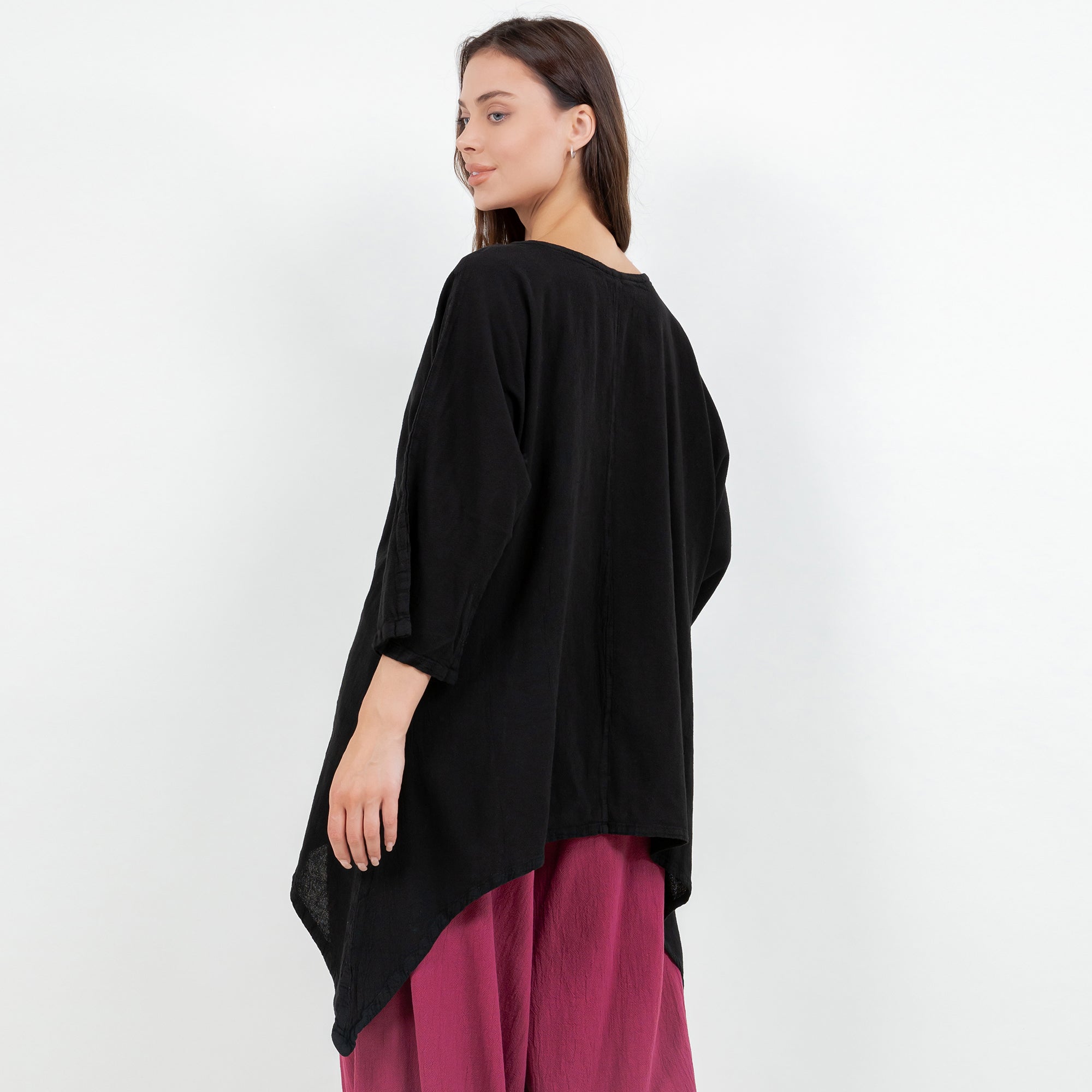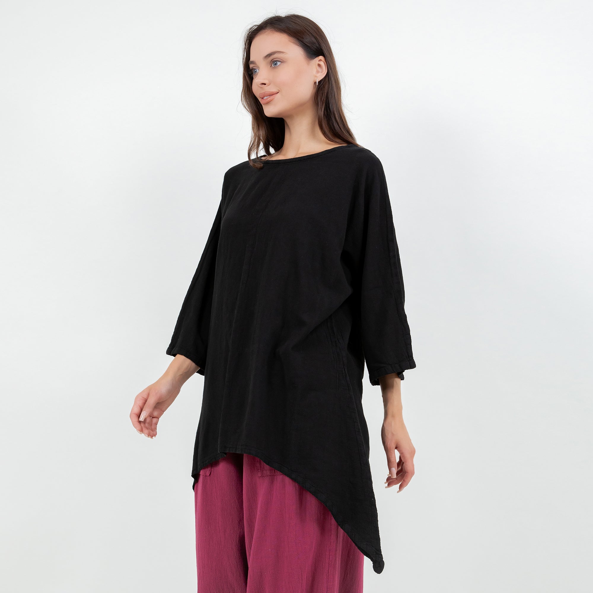 Angela is a wide scoop neck top with 3/4 sleeves. Detailed with a whimsical asymmetrical hem! A perfect top to dress up or down!