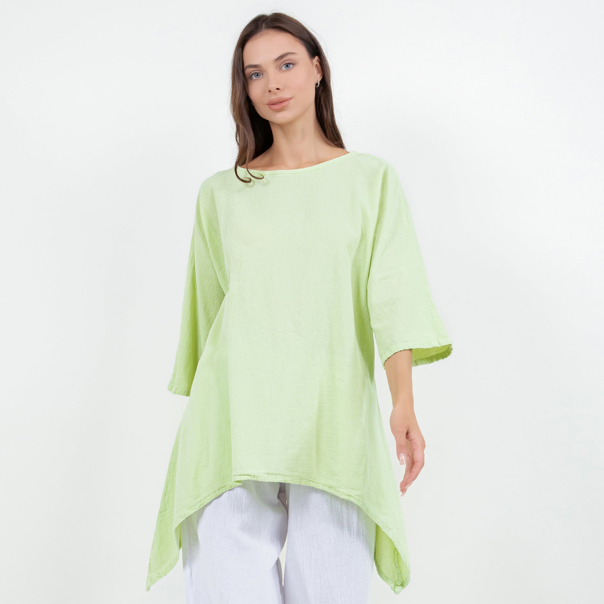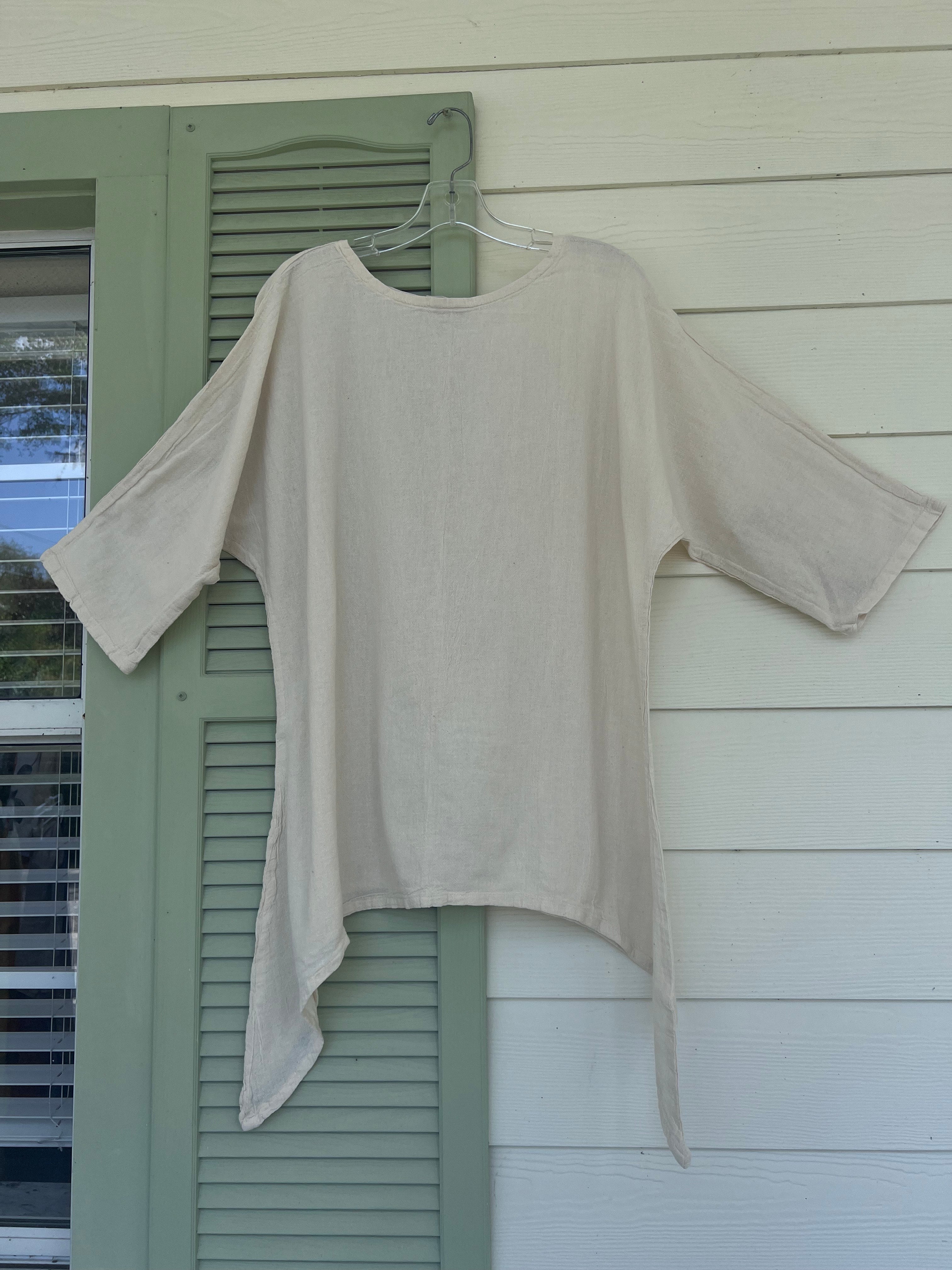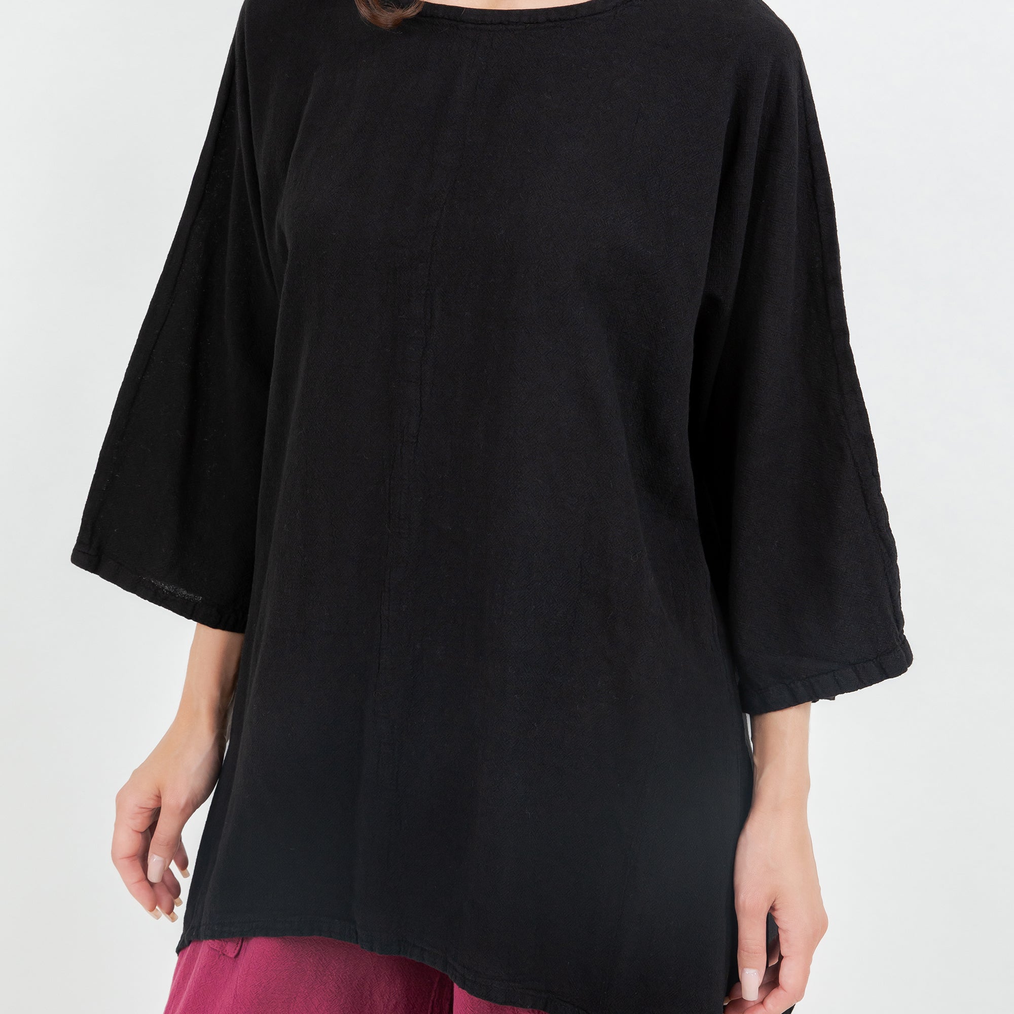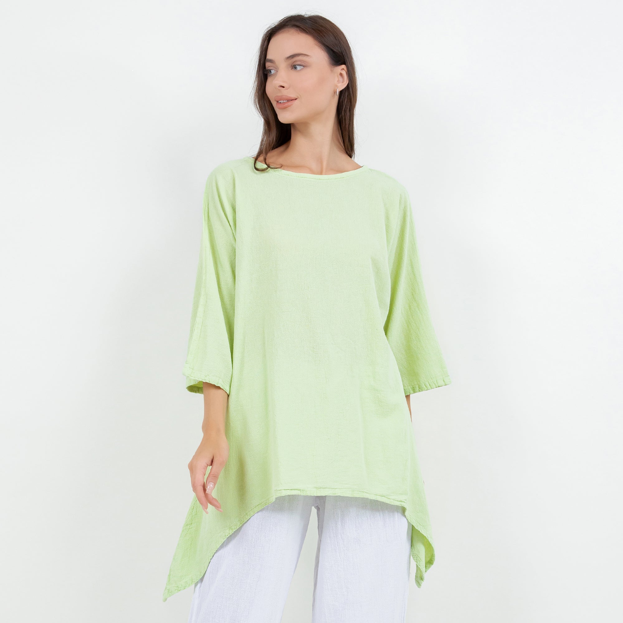 Angela is a wide scoop neck top with 3/4 sleeves. Detailed with a whimsical asymmetrical hem! A perfect top to dress up or down!