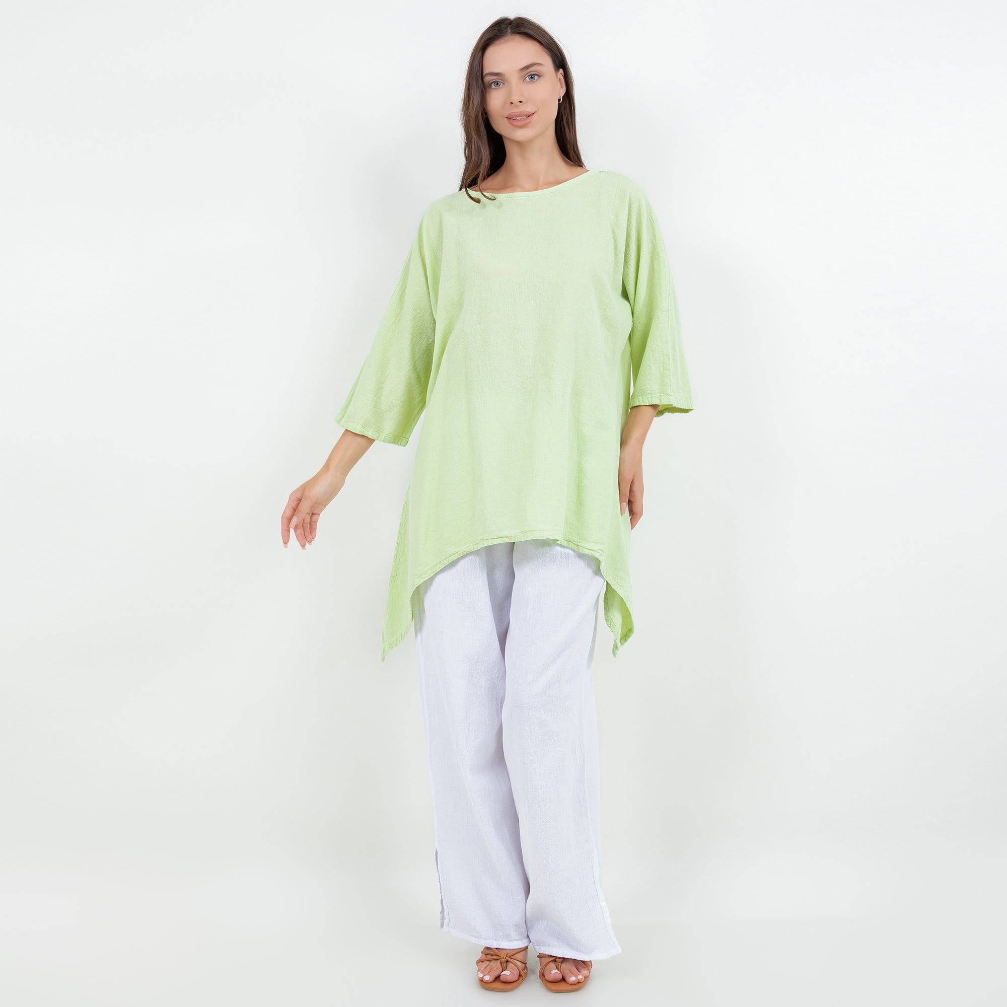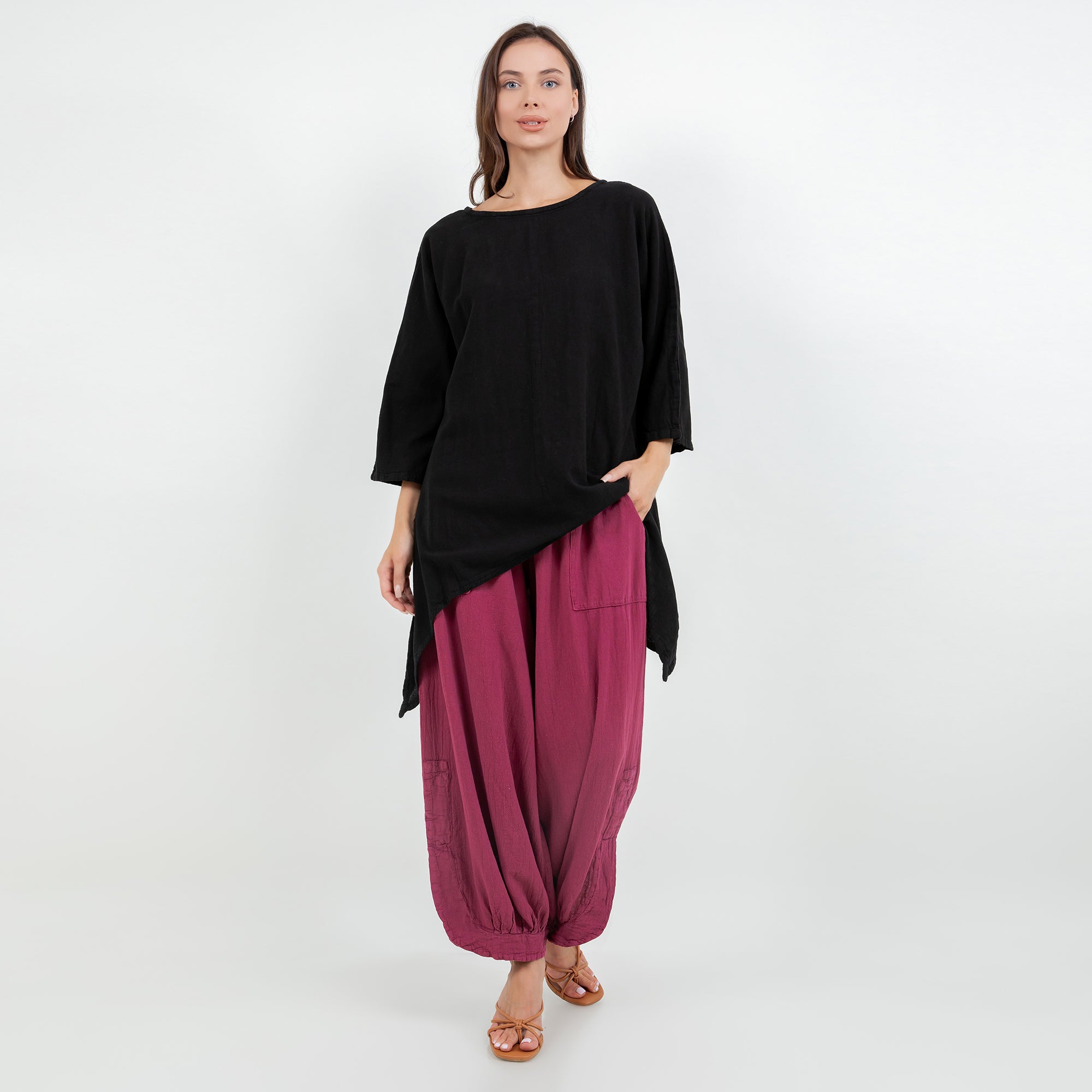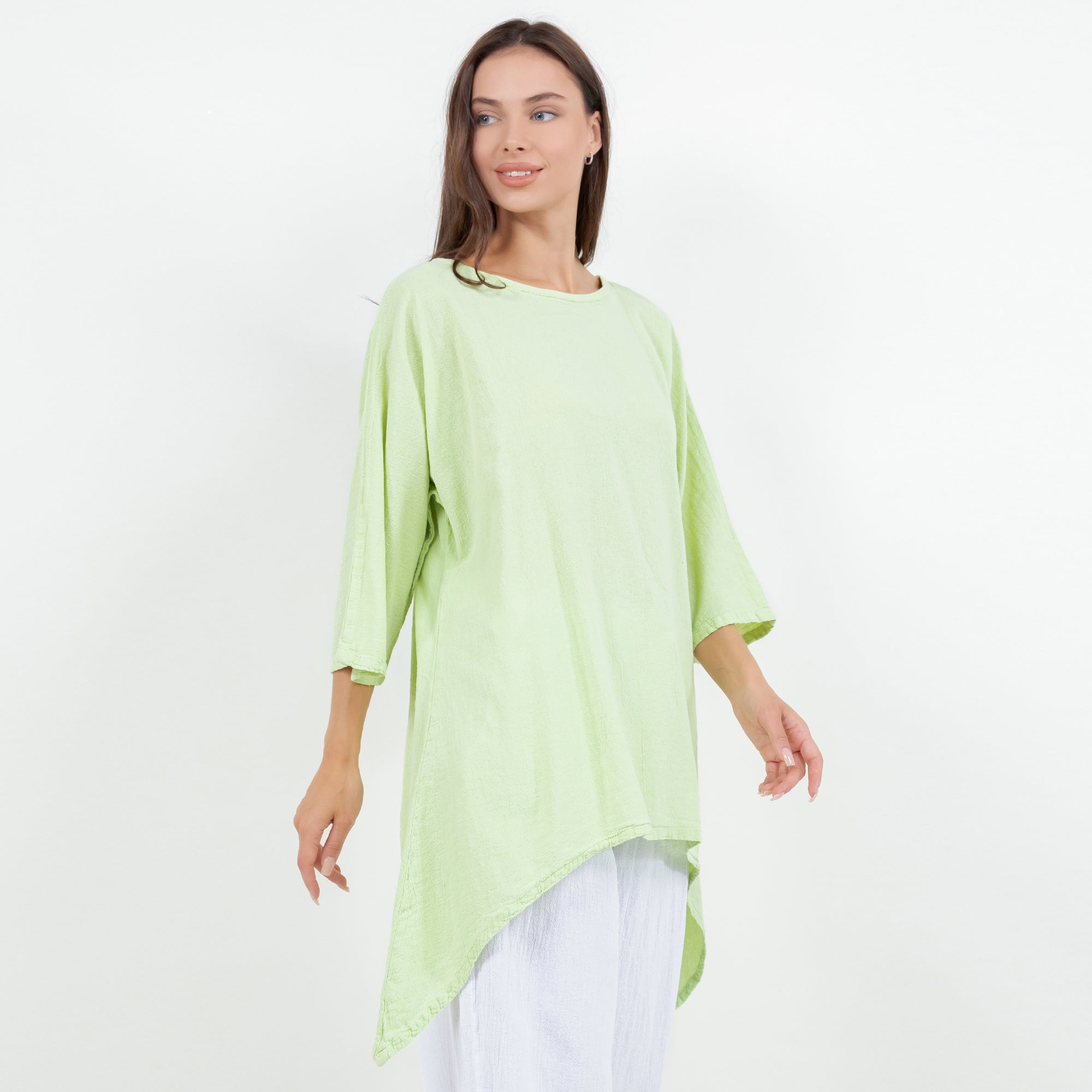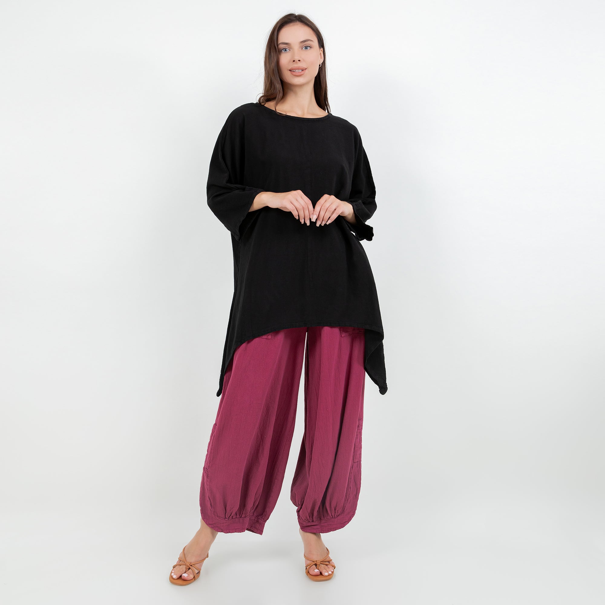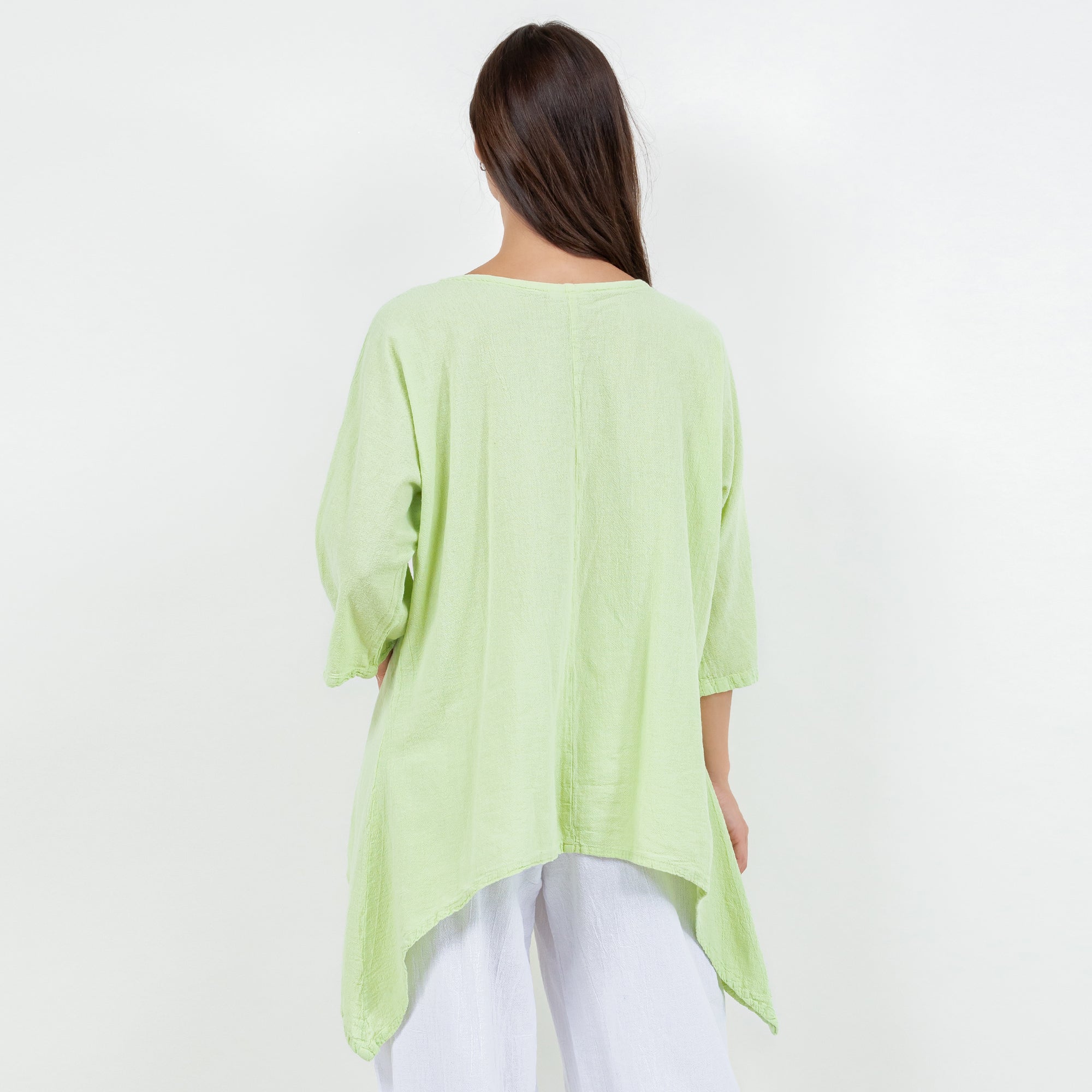 Angela is a wide scoop neck top with 3/4 sleeves. Detailed with a whimsical asymmetrical hem! A perfect top to dress up or down!