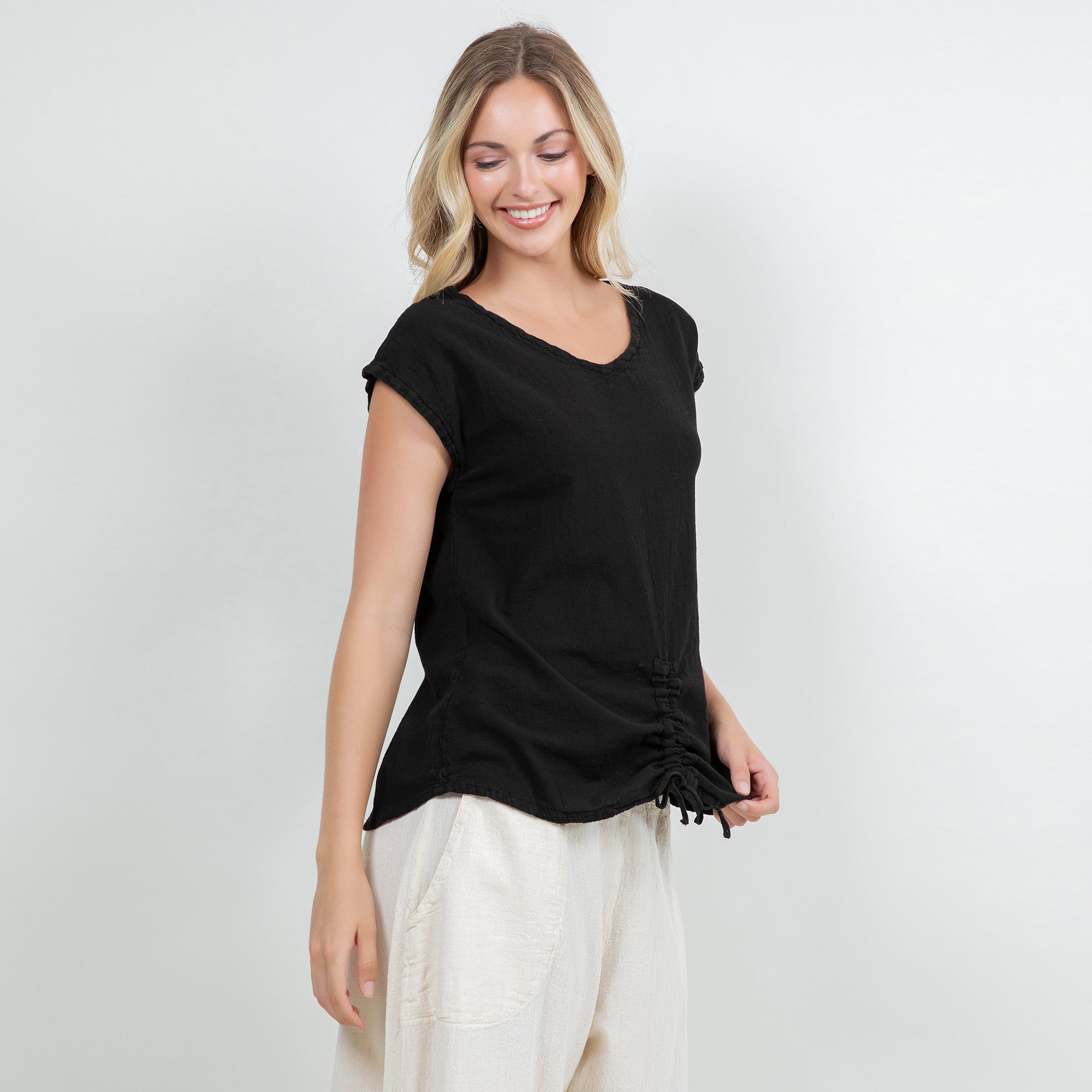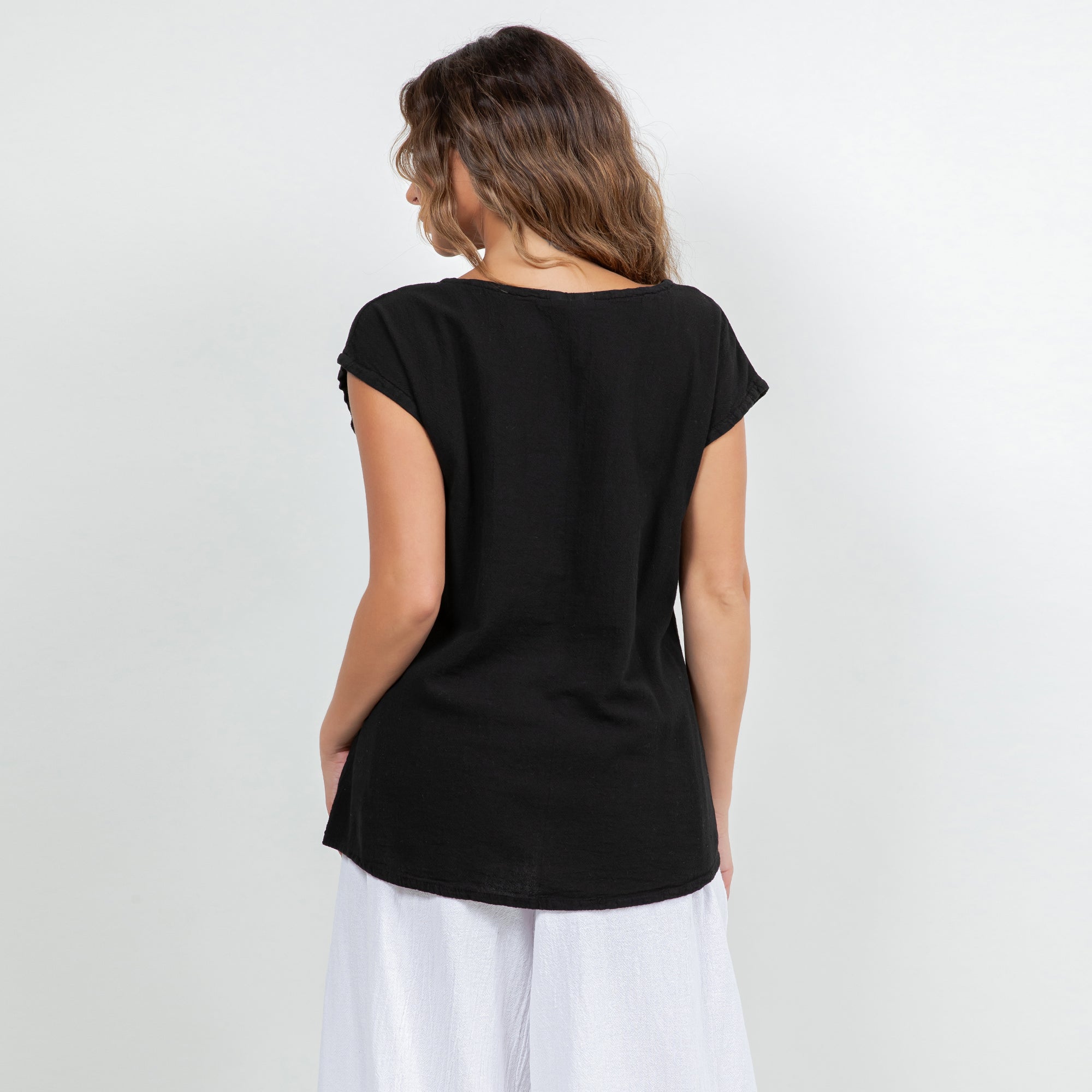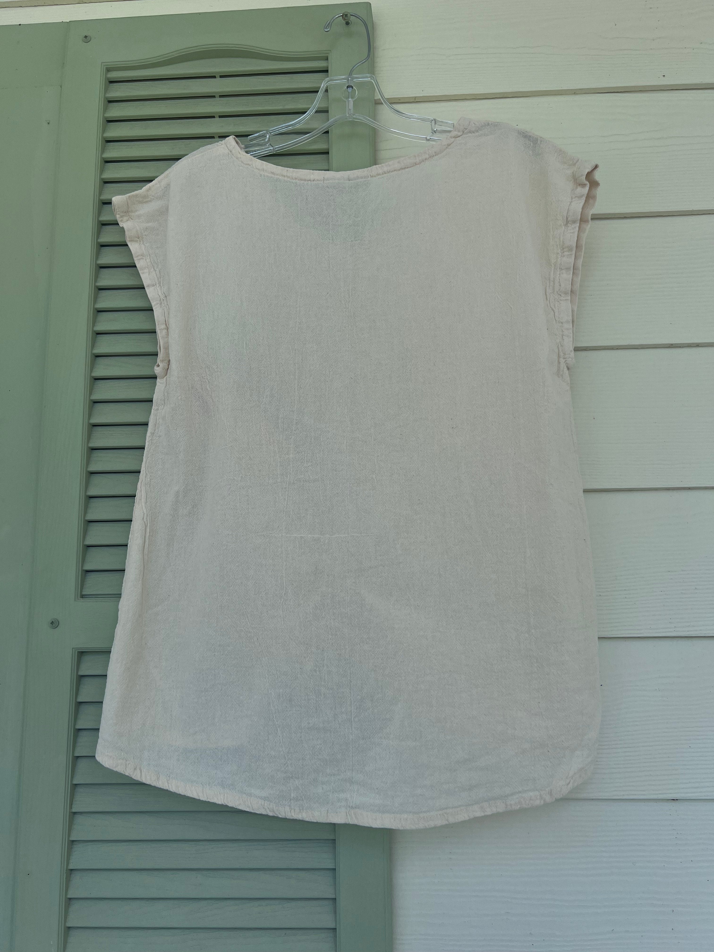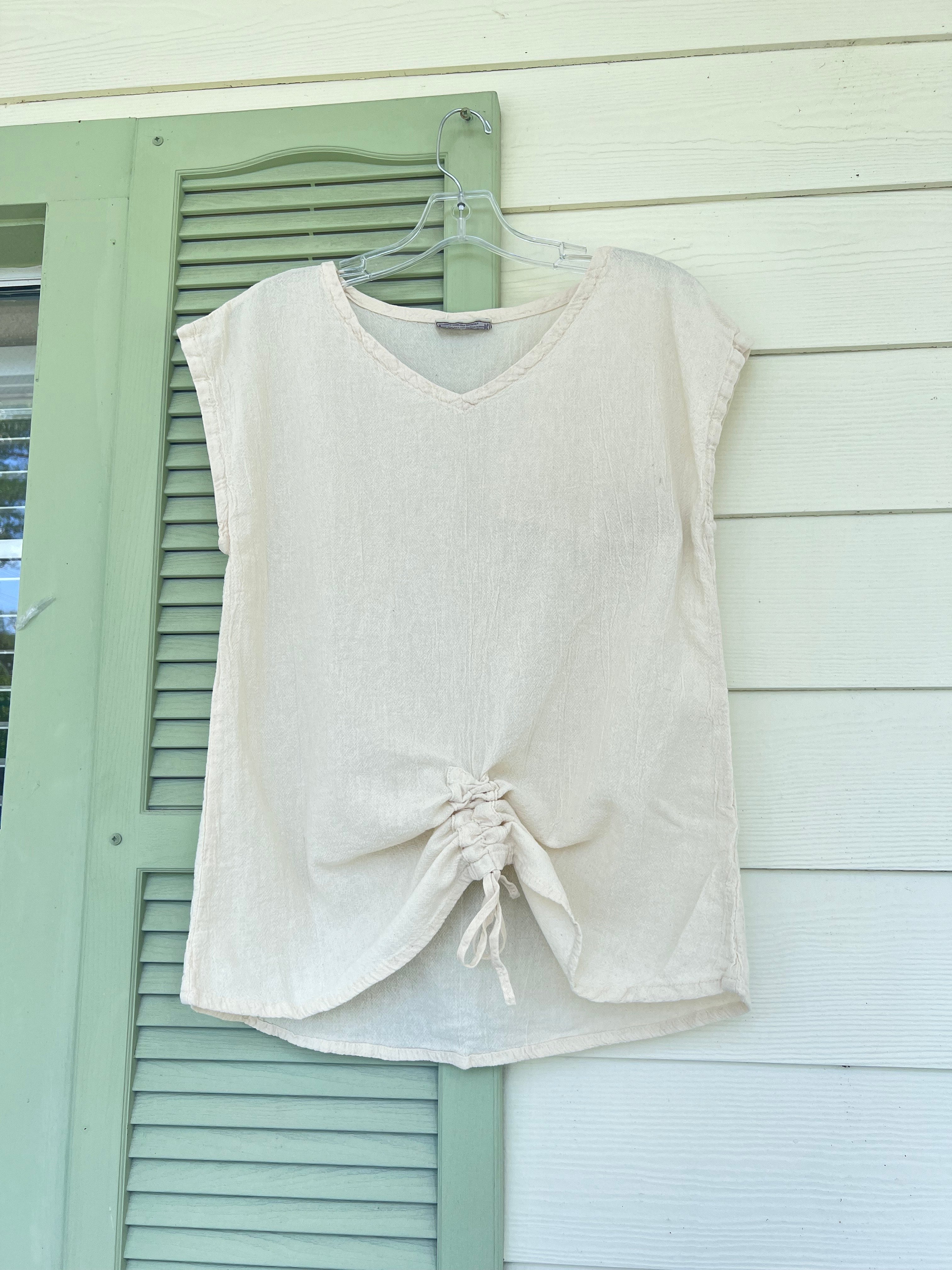 This versatile cotton gauze top features an easy one-size fit and pairs beautifully with linen pants, skirts, or denim for a relaxed boutique look.