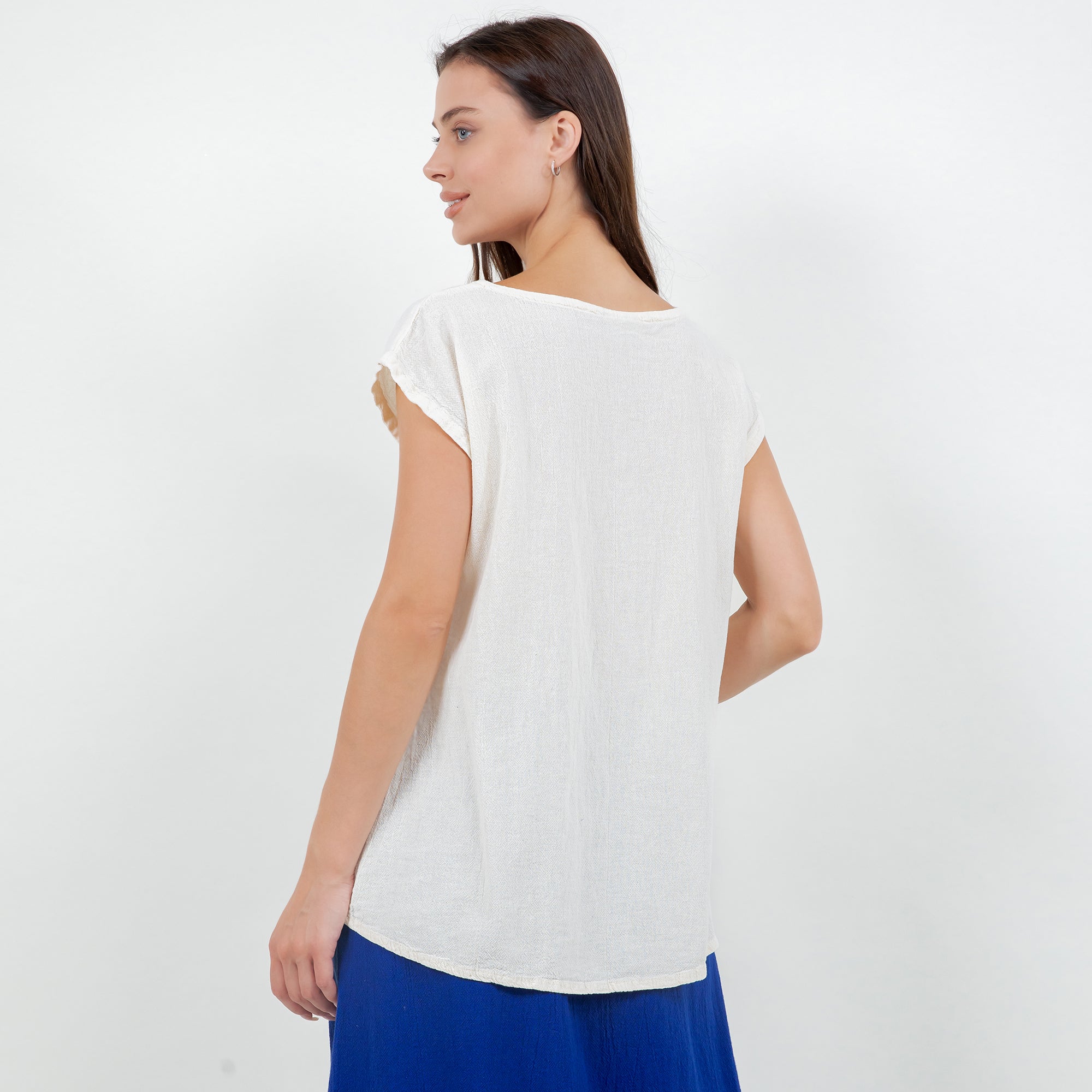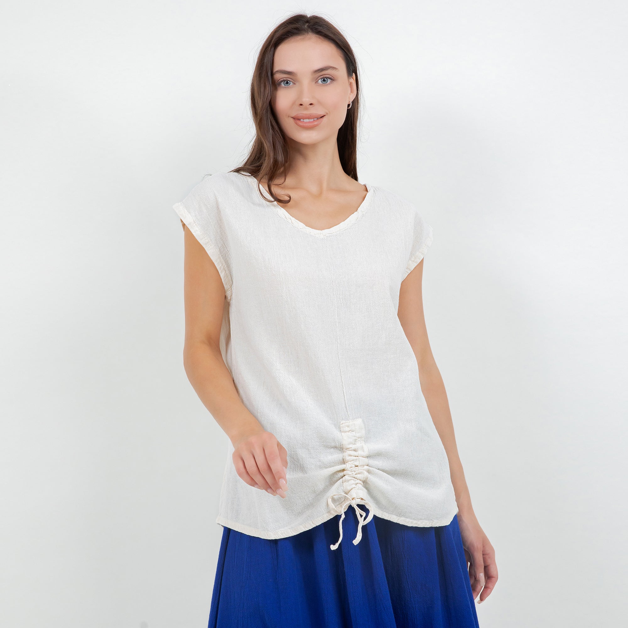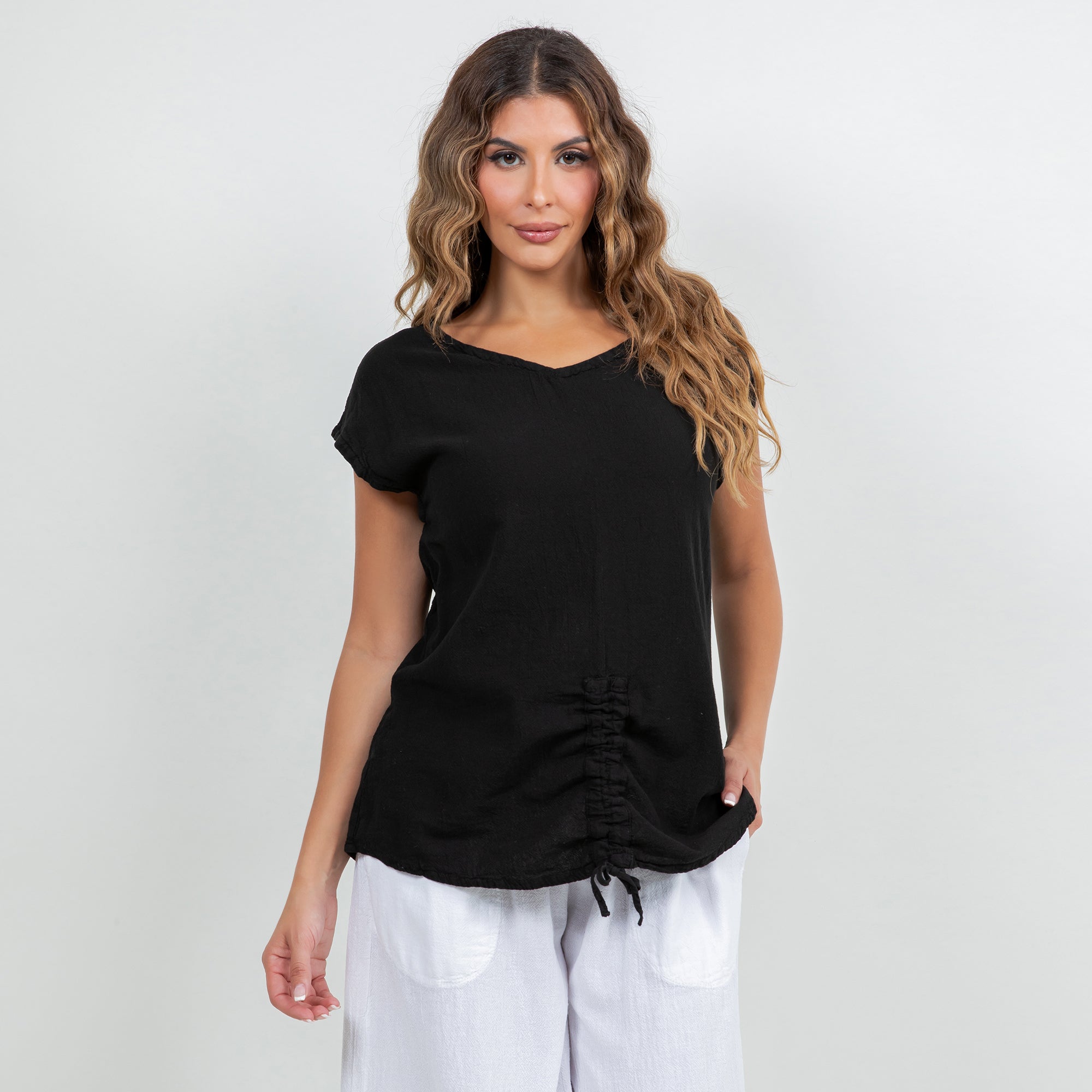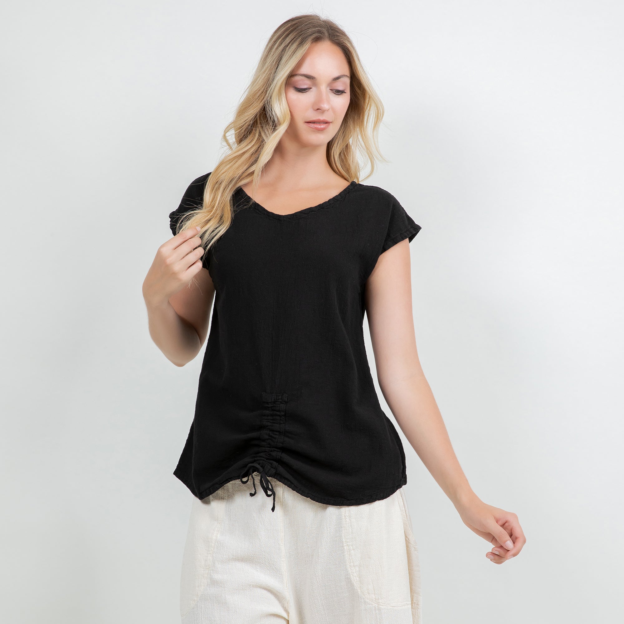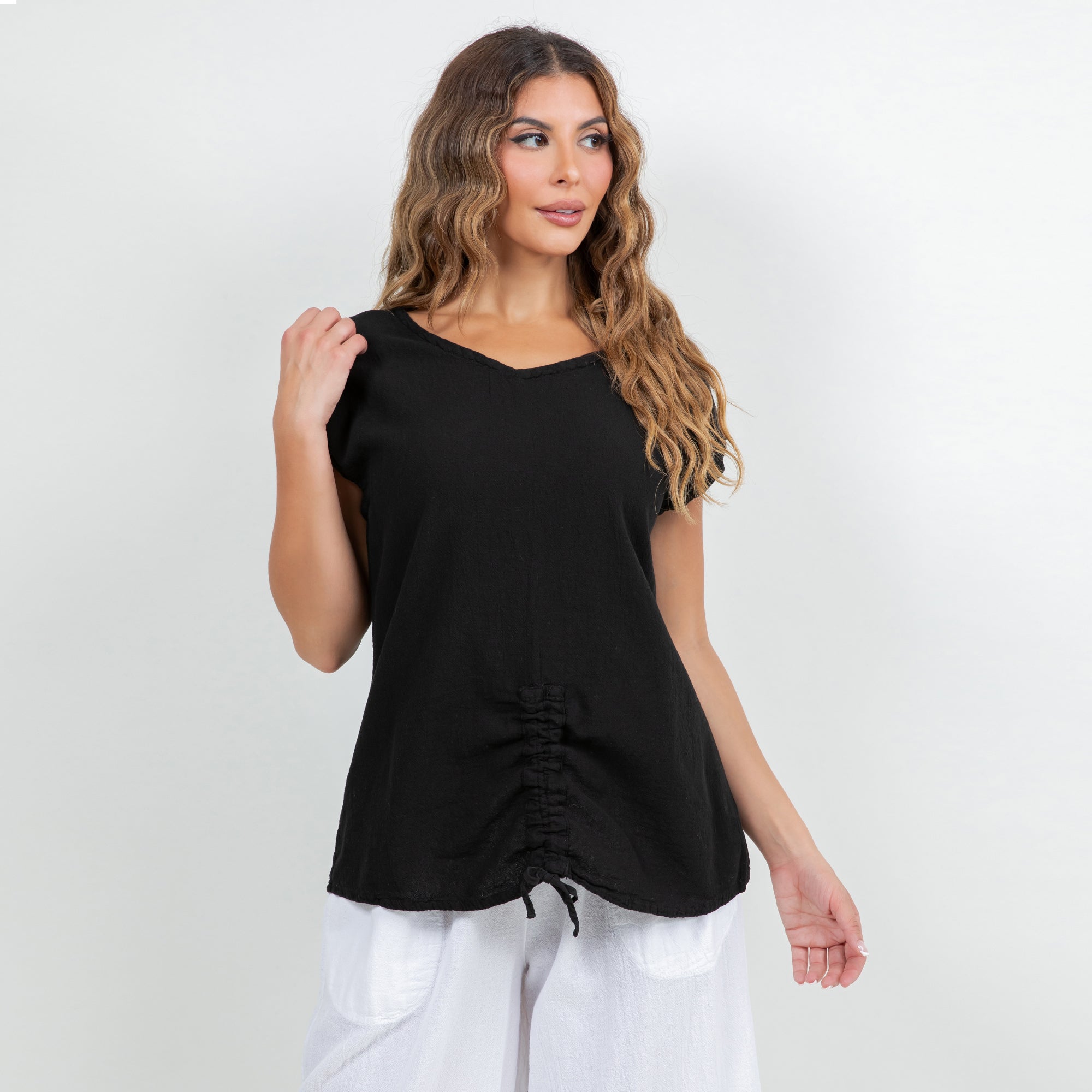 This versatile cotton gauze top features an easy one-size fit and pairs beautifully with linen pants, skirts, or denim for a relaxed boutique look.
