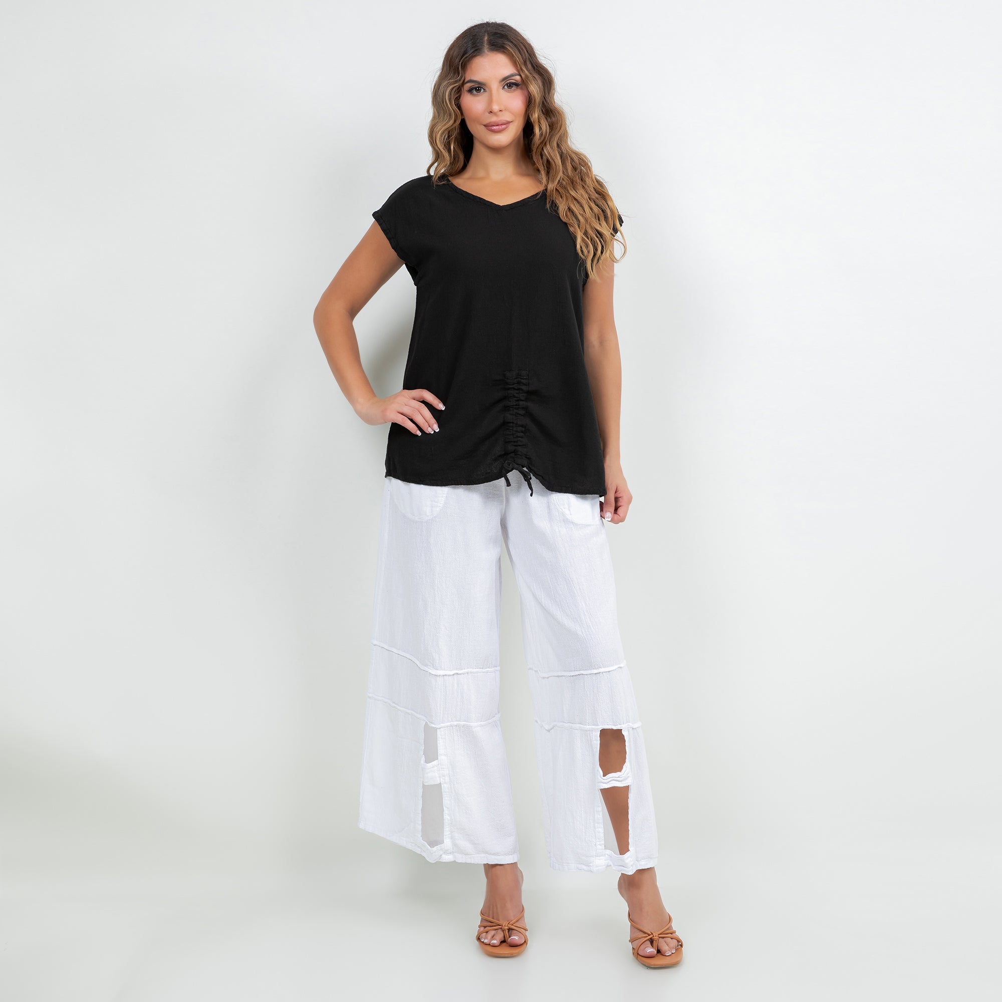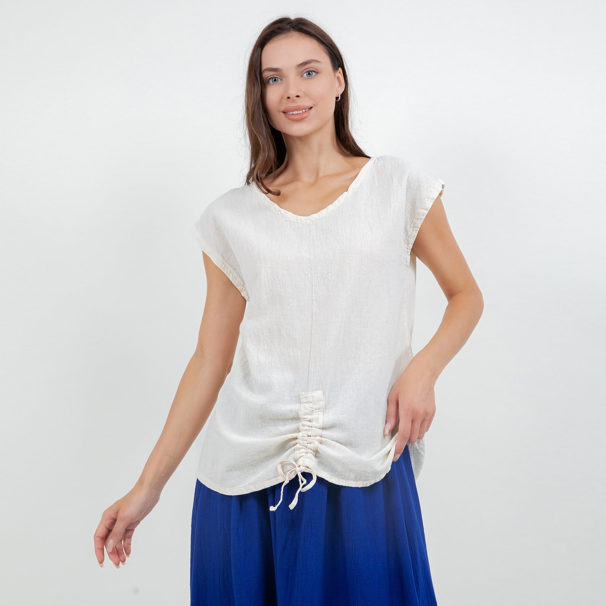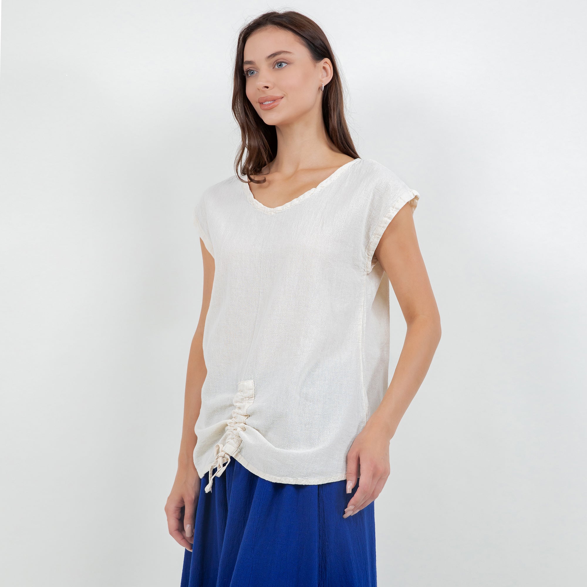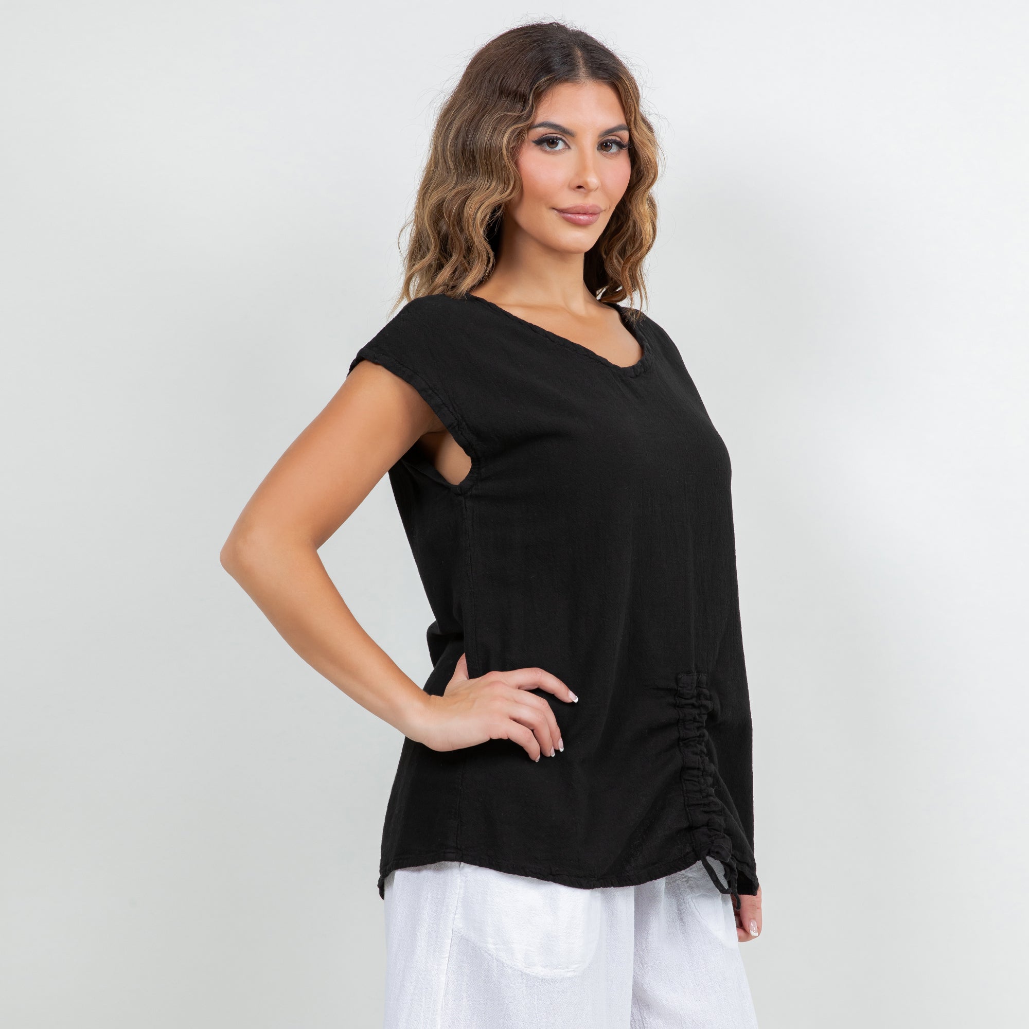 This versatile cotton gauze top features an easy one-size fit and pairs beautifully with linen pants, skirts, or denim for a relaxed boutique look.