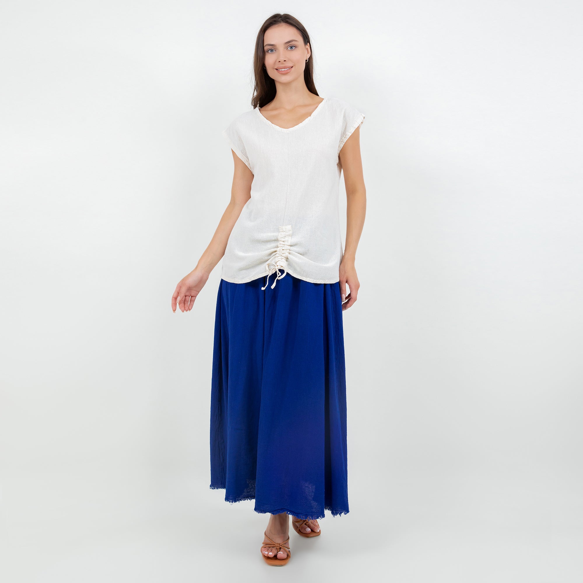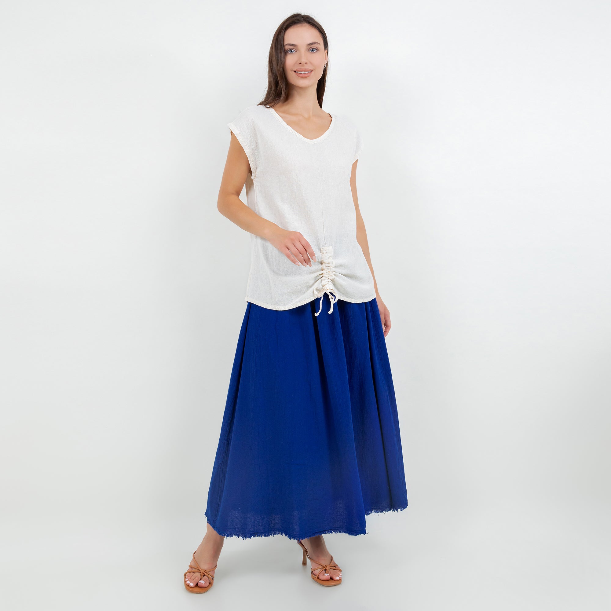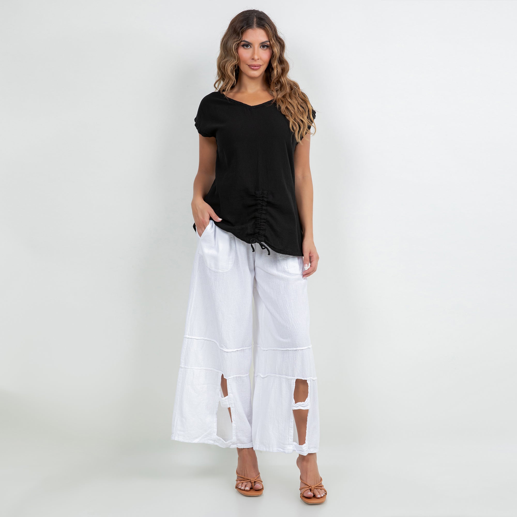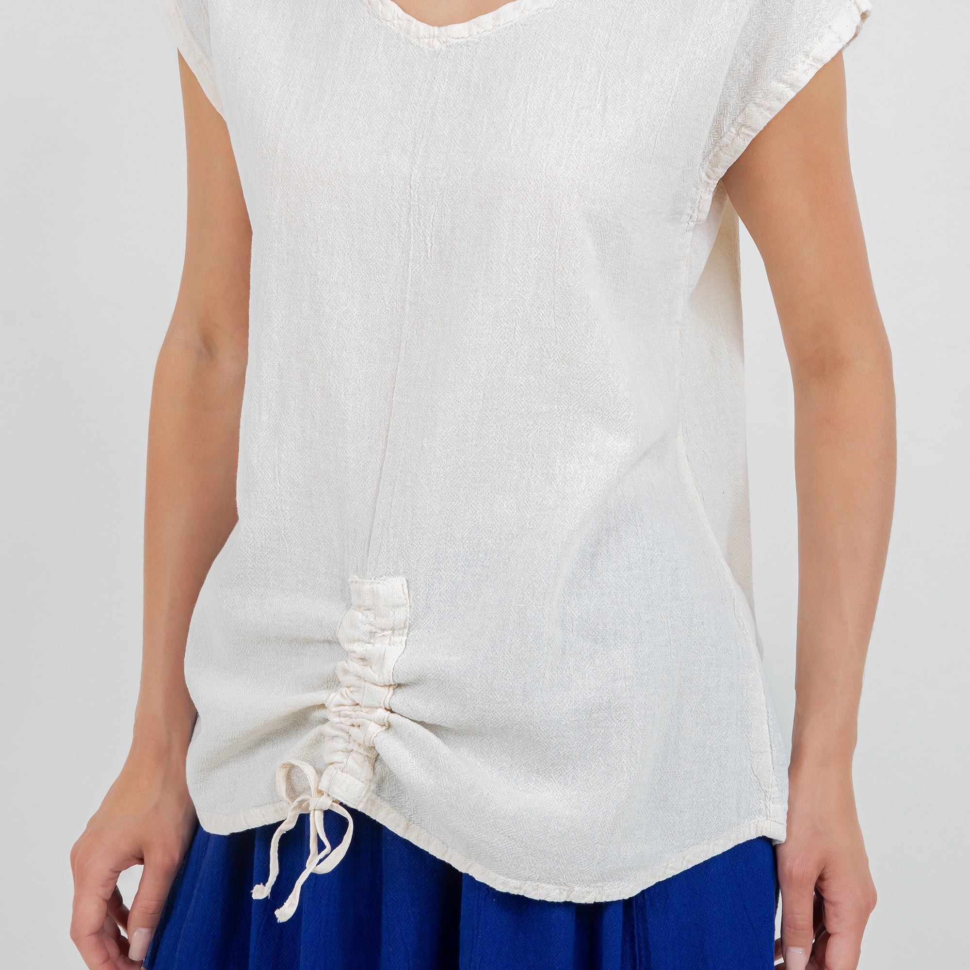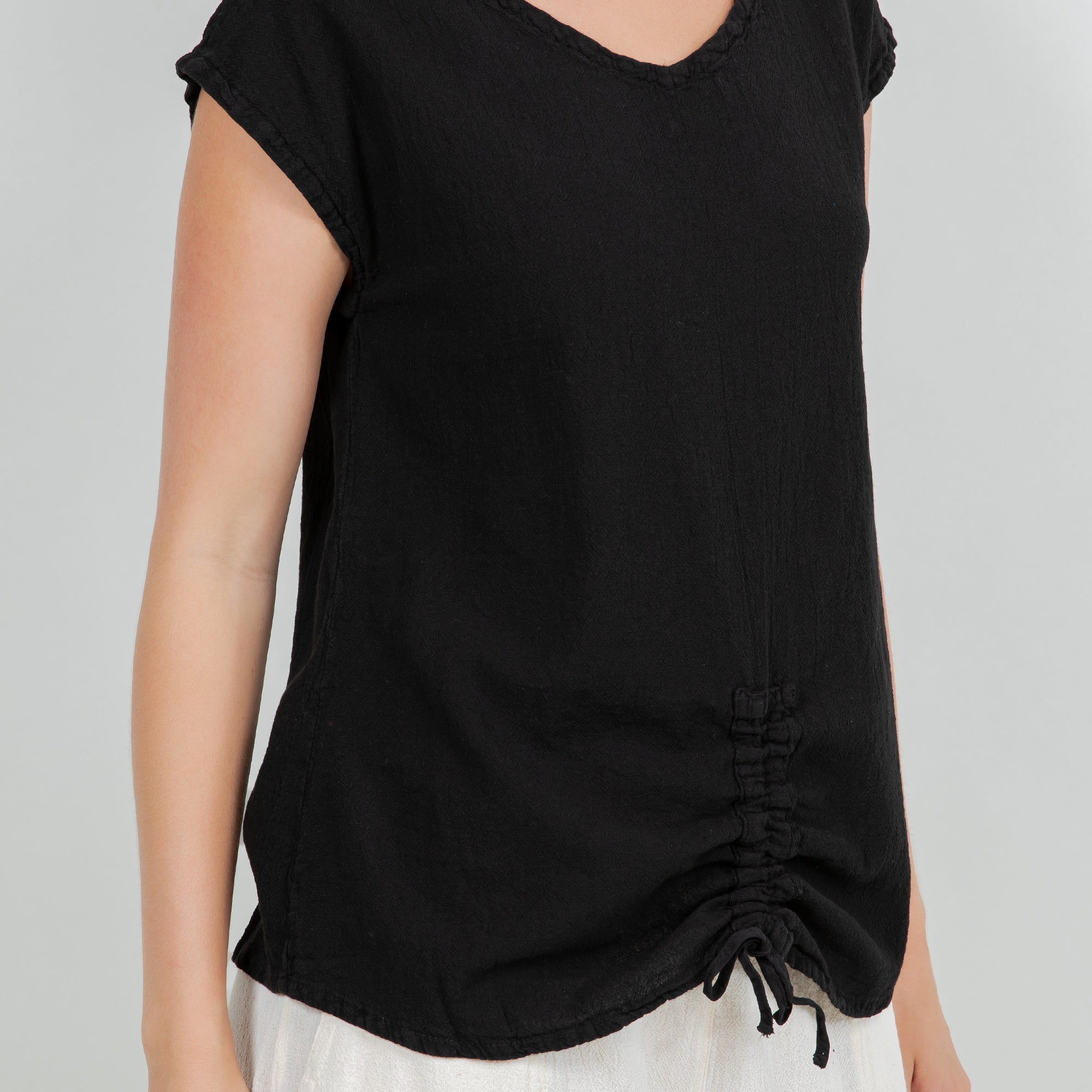 This versatile cotton gauze top features an easy one-size fit and pairs beautifully with linen pants, skirts, or denim for a relaxed boutique look.