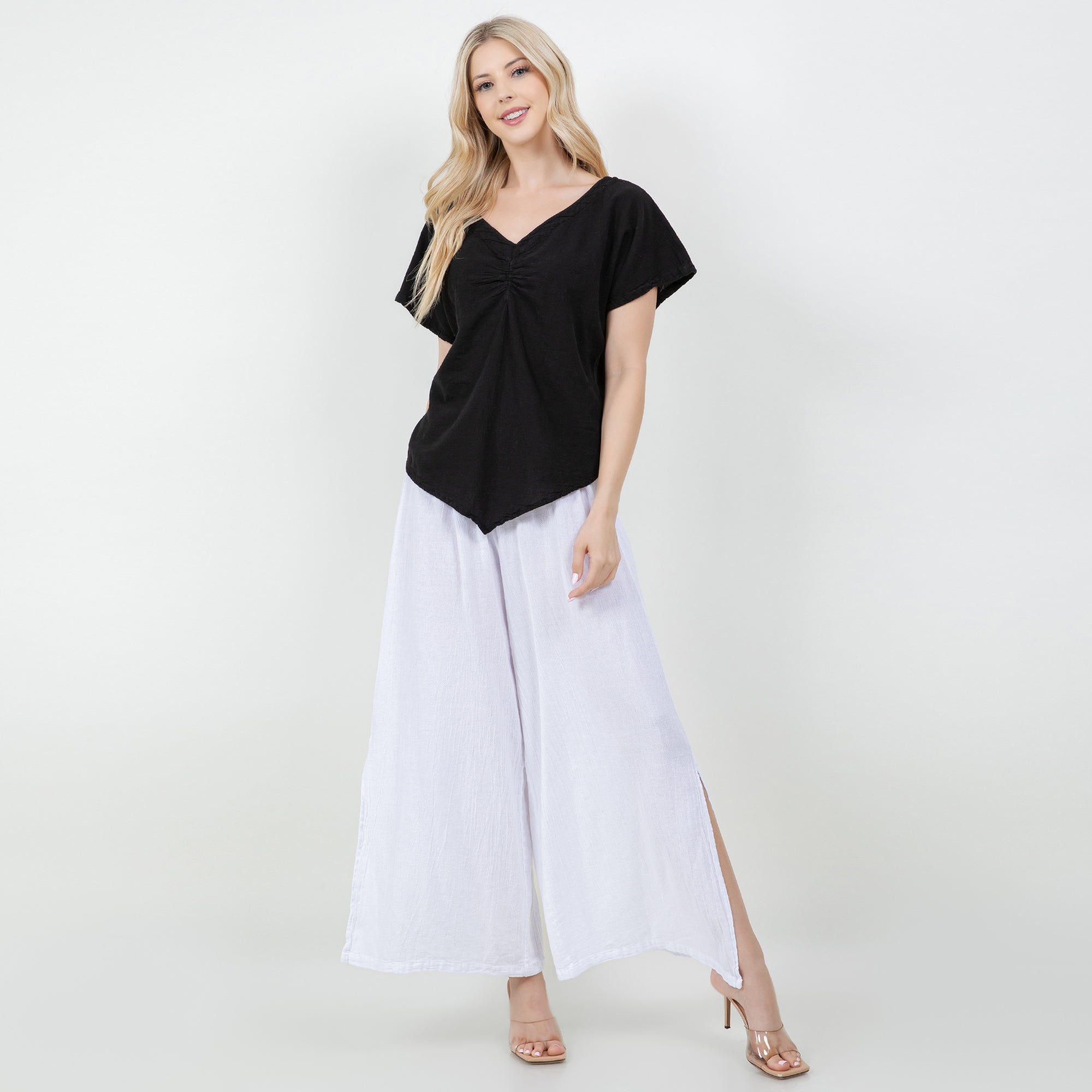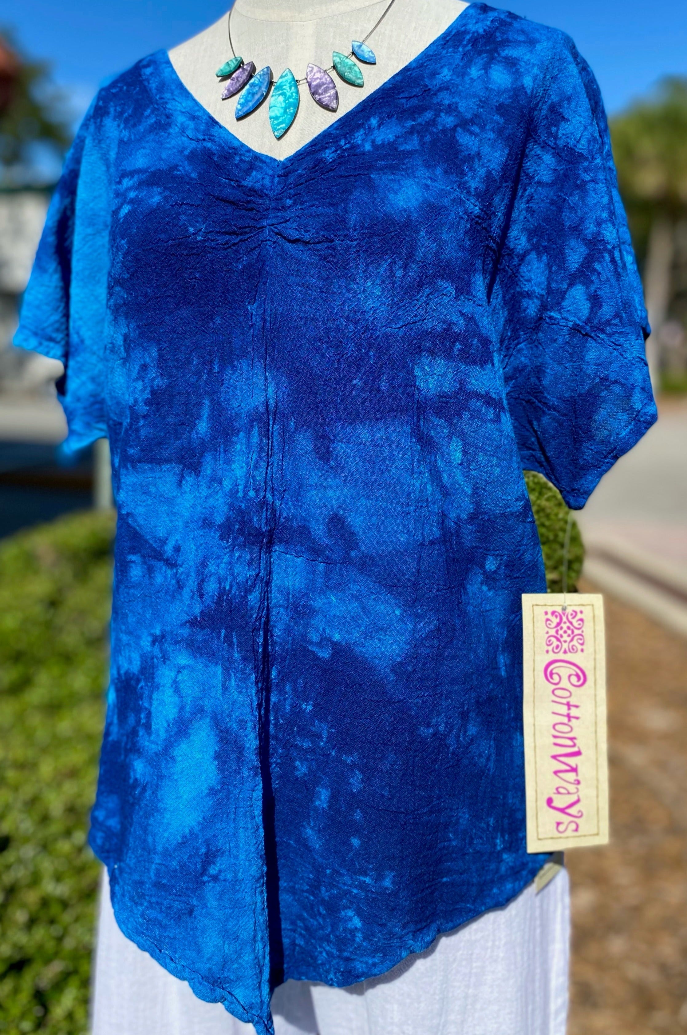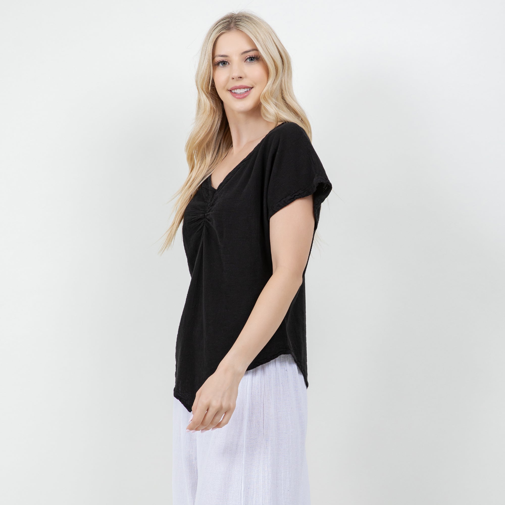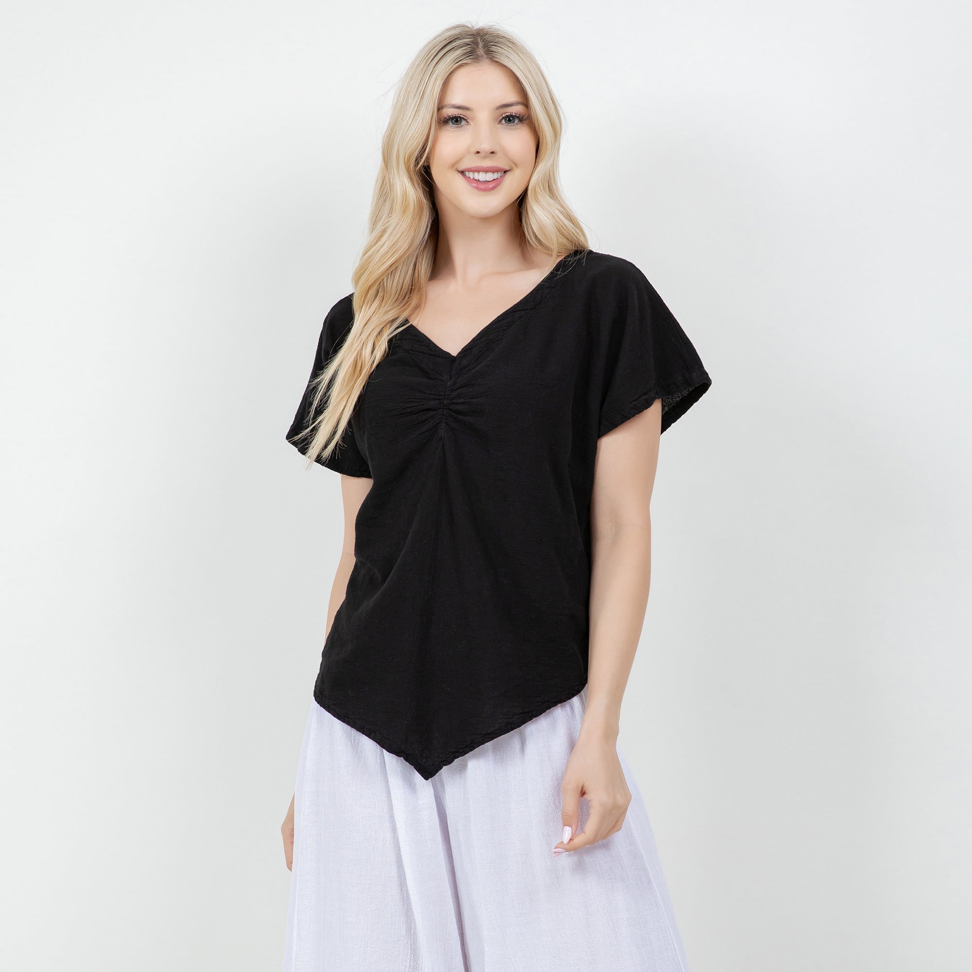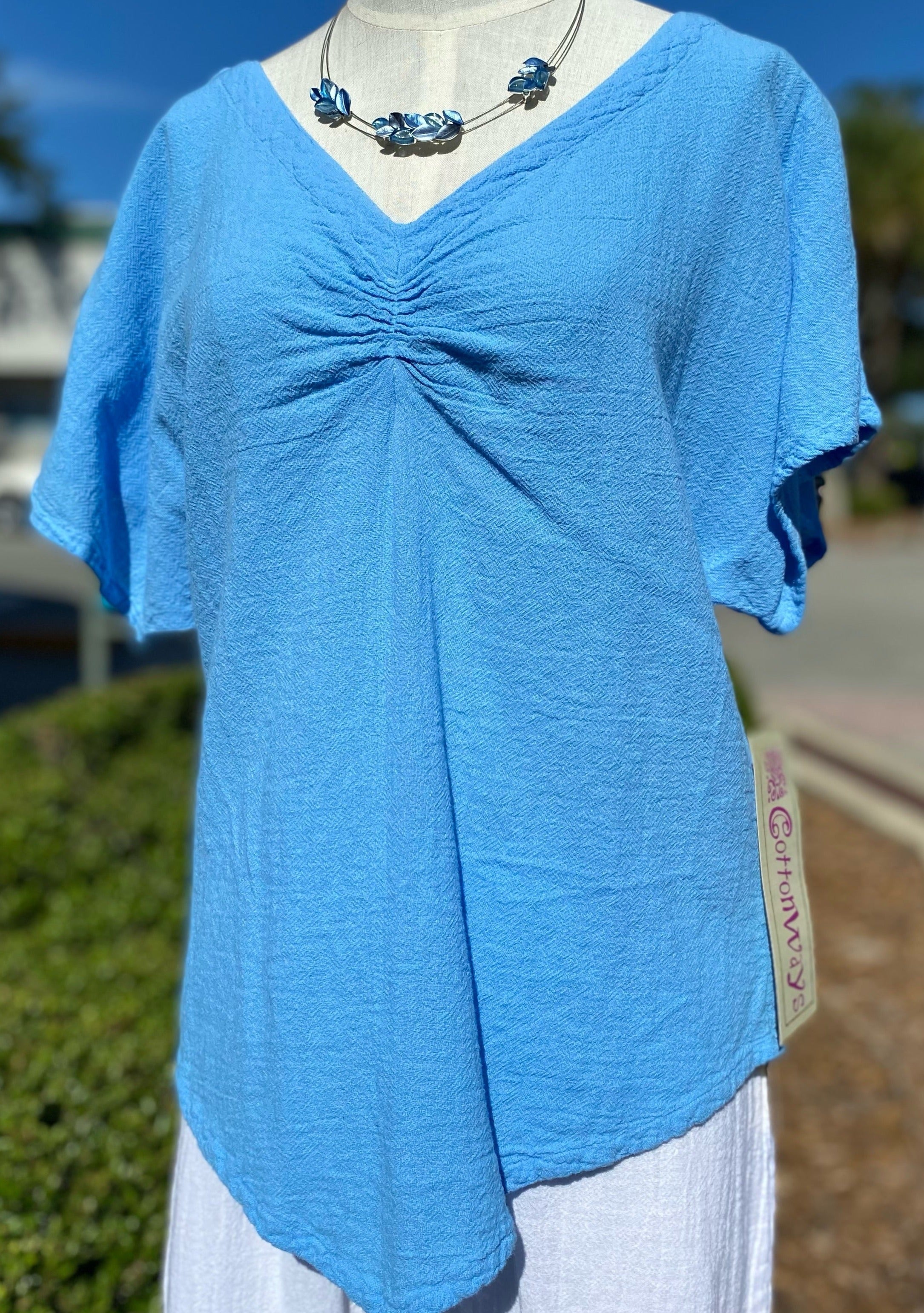 The Linda is a ruched Cottonways Classic. Linda means "Beautiful" and this top is just that. With it's feminine neckline and slimming points, this top is perfect paired with any of your favorite Cottonways bottoms.